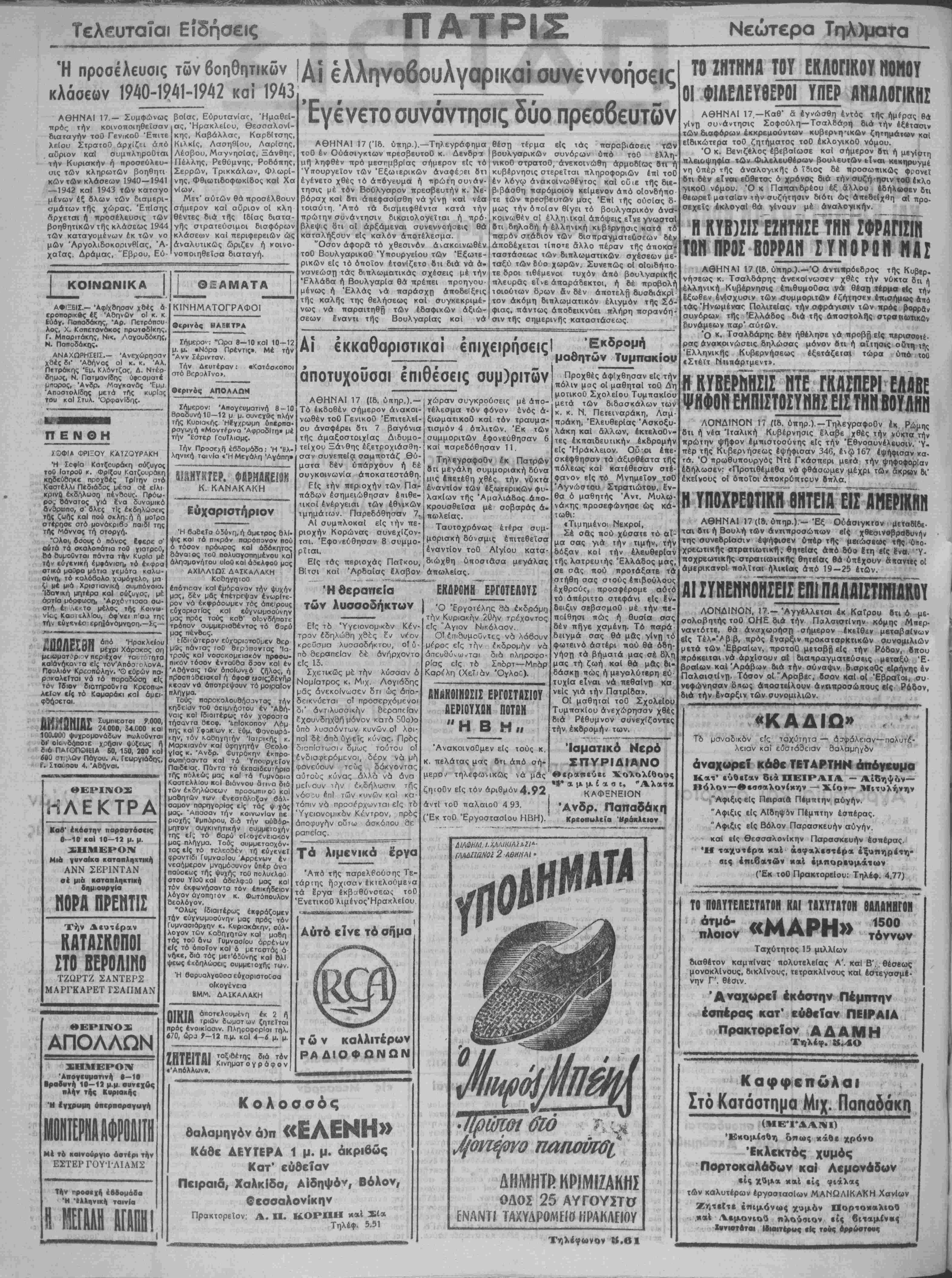 παύσεως τή; ψυχής τοθ πολυ<λαύ ότου ΥΙοΰ καί όοελφς.0 μος καί τόν έκφωνήσαντα τόν επικήδειον λόγον αγαπητόν κ. Φωτόπουλον θεοΛόγον. "Ολως ιδιαιτέρως έκφράζομεν την ευγνωμοσύνην μας πρός τόν Γυμνασιάρχην κ. Κυριακάκην, σύλ¬ λογον των Καθηγητήν καί μο&η τάς τοθ ανω ΓυμναοΙου αρρενων είς τό οποίον καί ό ■,ετοστάς ά νήκε, διά τος μβτ'όδύνης καί βλί ψεως έκδηλώσεις ουμμετοχής των. Ή βορυαλγοθσα εύχοριοτοθσα οίκογένεια ΒΜΜ. ΔΑΙΚΑΛΑΚΗ ΠΙΗΙΟ οτοτελουμένη έκ 2 ή υΐΙΙΙΗ τριών δωμοτων ζητείται πρός ενοικίασιν. Πληροφορίαι τηλ. «70, ά^ ?-12 π.μ. κοΙ 4-6 μ. μ. 7ΗΤΡΙΤΔΙ ■νΐΙΐΜΐΙΗΙ «Απόλλων», Κινημοτ ο γράφον Ήθεραπεία των λυσσοδήκτων Είς τό Ύγειονομικδν Κέν¬ τρον εδηλώθη χδες εν νέον κροθσμα λυοσοδήκιου, θΐδ- πδ θεραπείαν δέ ανήρχοντο είς 13. Σχετικώς μ£ την λύσσαν ό Νομίατρος κ. Μιχ Λογιόδης μάς ανεκοίνωσεν δτι ώς άπο- δεικνύεται ο! προσερχόμενοι δι' άντιλυσσικ?ιν θεραπείαν εχουνδηχθή μόνον κατό 50ο)ο υπό λυσσόντων κυνών οί λοι¬ ποί δέ άπδ ΰγιεϊς κύνας. Πρός δισπίοτωσι^ δμως τούτου οί ένδιαφερόμενοι, δέον νά μ^ι φονεύουν τούς δάκνοντας αιοτους κύνας άλλά νά άνα μείνουν ιτδ,ν εκδήλωσιν τής νόσ;υ επί των κυνών κα! κα¬ τόπιν νά προσέρχωνται είς τδ 'Υγειονομικδν Κέντρον, πρός αποφυγήν οίίτω άσκόπου θε ραπεΐας. Τα λιμενικά έργα Άπό τής παρελθούσης Τε- τάρτης ήοχισαν έκτελοιόμενα τα έργα έκβαθύνσεως τοθ ΕνετικοΟ λιμένος'ΗρακλεΙου Δύτό είνε τό σήμα των καλλιτέρων ΡΑΔΙΟΦΩΝΩΝ Κολοσσός θαλαμηγόν ά)π «ΕΛΕΝΗ» Κάθε ΔΕΥΤΕΡΑ 1 μ. μ. ακριβώς Κατ' ευθείαν Πειραια, ΧαλκΙδσ, Αίδηψόν, Βόλον, θεσσαλονίκην Πρακτορείον: Α. Π. ΚΟΡΠΗ καί Σία Τηλέφ. 5,51 χώραν συγκρούσεις μέ άπο¬ τέλεσμα τόν φόνον ενός ά ξιωματικοθ κσΐ τόν τραυμα- τισμόν 4 όπλιτων. Έκ των συμμοριτών εφονεύθησαν 6 καί παρεδόθησαν 11 Τηλεγραψοθν έκ Πατρών β π μεγάλη συμμοριακή δόνα μις επετέθη χθές την νύκτα εναντίον των εξωτερικών φυ- λακίων τής Άμαλιάδος άπο- κρουσθεΐσα μέ σοβαράς α¬ πωλείας. Ταυτοχρόνως ετέρα συμ¬ μοριακή δύναμις επιτεθείσα εναντίον τοθ ΑίγΙου κατα- διώχθη ύποσιάσα μεγάλας απωλείας. ΕΗΔΡΟΗΗ' ΕΡΓΟΤΕΑ3ΥΣ Ό Έργοτέλης θά έκδράμΓ) την Κυριακήν 20ήν τρέχοντος είς "Αγιον Νικόλαον. ΟΙ επιθυμούντες νά λάβσυν μέρος είς την έκδρομήν νά άαευθύνω-Ίαι διά πληροφο¬ ρίας είς τό Σπδρτ—Μπάρ Καρέλη (ΧεΤΐάν Όγλου). ΑΝΑΚΟΙΝΩΣΙΣ ΕΡΓΟΣΤΑΣΙΟΥ ΑΕΡ1ΟΥΧΩΝ ΠΟΤΩΝ "Η Β Η II Άνακοινοθμεν είς τούς κ. κ. πελάτας μας βτι άπό σή¬ μερον τηλεφίονικώς νά μας ζηιοθν είς τόν αριθμόν 4.92 άντΙ τοθ τιαλαιοθ 4 93. (Έκ τοθ Έργοστασίου ΗΒΗ). Έκδρομή μαδητών Τυμπακίου Προχθές αφίχθησαν είς την πόλιν μος οί μαθηταί τοθ Δή μοτικοθ ΣχολεΙου Τυμπακίου μετά των διδασκαλιών των κ. κ. Ν. Πετειναράκη, Λσμ πράκη, Ελευθερίας Άσκοζυ- λάκη καί άλλων, έκτελοθν- τες εκπαιδευτικήν έκδρομήν είς Ηράκλειον. Ου οί επε¬ σκέφθησαν τα άξιοθέατα τής πόλεως καί κατέθεσαν στέ φανον είς τό Μνημεΐον τοθ Αγνώστου Στρατιώτου, έν¬ θα ό μαθητής Άντ. Μυλω¬ νάκης προσεφώνησε ώς κά¬ τωθι: «Τψημένοι ΝεκροΙ, Σέ σβς πού χύσατε τό αΐ- μα σας γιά την τιμήν, την δόξαν κοί την ελευθερίαν τής λατρευτής Ελλάδος μας, σε σάς πού προτάξστε τ< στήθη σας σιούς έπιβούλου έχθρούς, προσφέρομε αΰΐό τό άπέριττο στεφάνι είς εν δειξιν σεβασμοθ μέ την πε¬ ποίθησι πώς ή θυσία σας δέν πήγε χαμένη. Τό παρά δίΐγμά σας θά μάς γίνη τό φωτεινό άστέρι πού θά όδη γήση τα βήαατά μας σέ δλη μας τή ζωή καί θά μάς δι¬ δάσκη πώς ή μεγολύτερη εύ τυχΐα είναι νά πεθαΐντ) κα νείς γιά την ΠατρΙδα». ΟΙ μαθηταί τοθ ΣχολεΙου ΤυμπσκΙου ανεχώρησαν χ