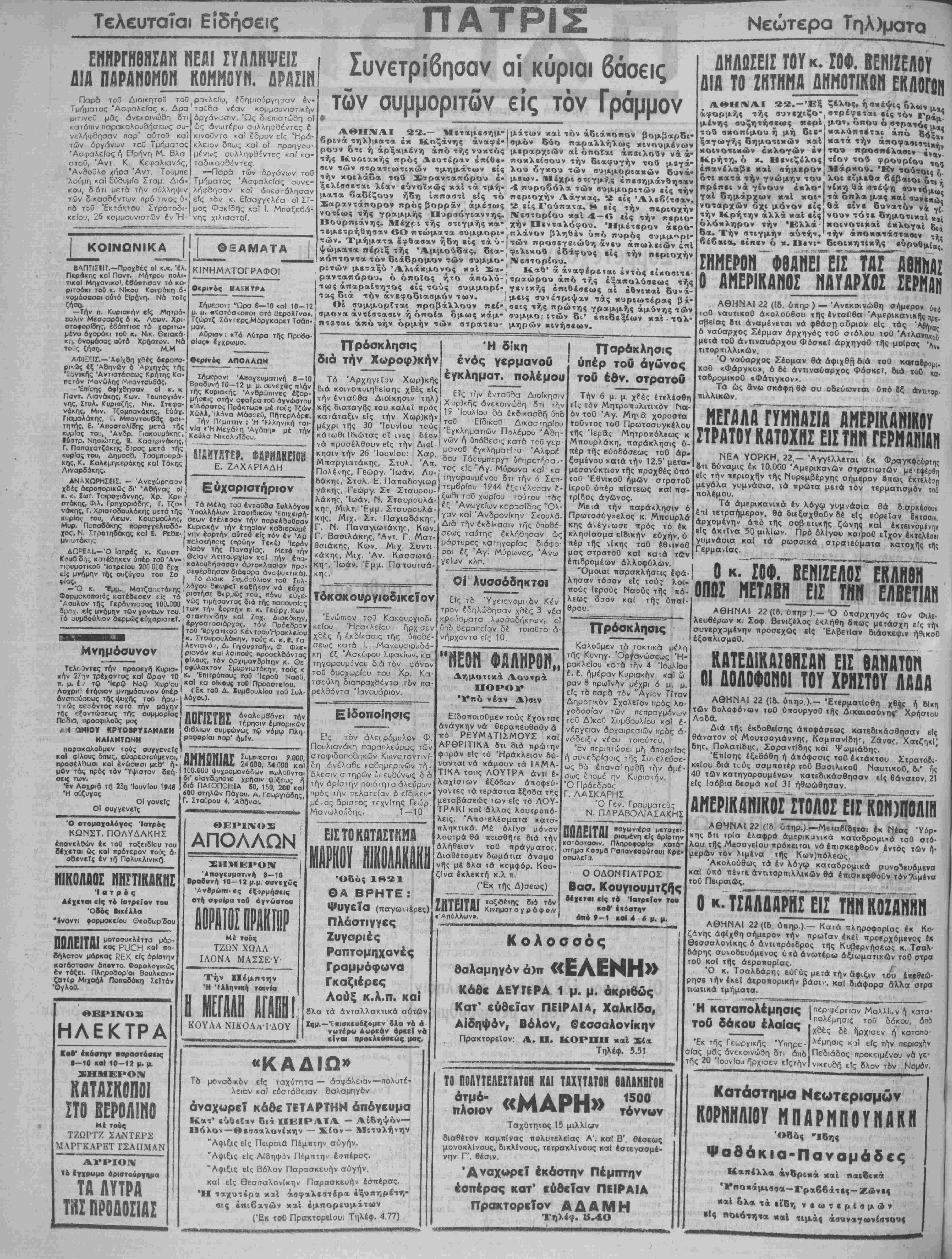 σως έπομέ ην Κυρια<ήν. Ό Πρόεδρος *. ΛΑΣΚΑΡΗΣ Ό Γεν. Γραυματεύ; Ν. ΠΔΡΑΒΟΛΙΑΣΑΚΗΣ ΠΟΛΕΙΤΑΙ πσγωνιέρα μκτσχο· ρισμενη είς αρίστην καιόοτασιν. Πληροφορίαι κατά* στημα Κοσρα ΠαιανεοφύΓουι Κρε< οπωλείχ Ο ΟΔΟΝΤΙΑΤΡΟΣ Βασ. Κουνιουμτζής βέχκται είς το Ιατρείον τού κοβ' έ«οοτην άπό 9-ί καΐ 4 6 μ. μ. Κολοσσός θαλαμηγόν ά)π «ΕΛΕΝΗ» Κάθε ΔΕΥΤΕΡΑ 1 μ. μ. ακριβώς Κατ' ευθείαν ΠΕΙΡΑΙΑ, Χαλκίδσ, Αΐδηφόν, Βόλον, θεσσαλονίκην Πρακτορείον: Α. Π. ΚΟΡΠΗ χ αί Σία Τηλέφ. 5.51 ή ης φς θησαν είς θάνατον οί Μουτσογιάννης, ΚσμτισνΙδη'·, Ζδνος, ΧατζηκΙ' Βης, ΠολαιΙδης, ΣσραντΙδης καί Ψωμιάδης. 'ΕηΙσης εξεδόθη ή απόφασις τοθ έ<τάκτου Στρατοδι· ΚΕΐου διά Τίύς σαμποτέρ τοθ ΒασιλικοΟ Ναυτικοθ, δι' ής 40 των κατηγορουμένων κατεδικάσθησαν είς θάνατον, 21 είς Ισόβια δεσμά καί 31 ήθωώθησαν. /1ΗΕΡΙΚ ΑΚΙΚΟΙΙΤΟΛΟΓ Είΐ ΚΟΗ)ΠΟΛΙΗ ΑΘΗΝΑΙ 22 (ίδ ύαηρ.).—ΜβταβίΒετσι έκ Νεας Υόρ¬ κης βτι τρΐα έλαφρά άμερικανικά καταδρομικά τοθ οτό- λου τής Μεσογείου πρόκειται νά έτιισκεφθοθν έντός των ή· μερΛν τόν λιμένα της Κων)πόλεως. Άκολούθωΐ, τα έν λόγω καταδρομικά ρυνο^ευόμενα καΐ υπό πέντε άντιτορπιλλικών θά έπισκεφθοθν τόν "λιμένα τοθ Πειραιώς. Ο κ. ΤΣΑΉΙρΙσΊιΣ ΤΗΝ ΚΟΖΑΝΗΝ ΑΘΗΝΑΙ 22 ((δ ύπηρ.).—Κατά πληροφορίας έκ Κο¬ ζάνης άφΐχθη σήμερον την πρωίαν έκεΐ ττροίρχόμενος έκ θεσσαλονίκης ό άντιπρόεδρος τής Κυβερνήσεως κ. Τσαλ- δάρης συνοδευόμενος υπό ανωτέρω αξιωματικών τοθ στρα τοθ κσί τής άεροπορΐσς. ^ Ό κ. Τσαλδάρης εύΓύς μετά την Αφιξιν ιθυ έα«θίώ· ρησε την έκεΐ άεροηορικήν βάσιν, καΐ διάφορσ άλλα στρα τιωτικά τμήματα. ΤΟ ΠΟΛΥΤΕΛΕΣΤΑΤΟΝ ΧΑ! ΤΑΧΥΤΑΤΟΗ ΘΑΑΑΜΒΓΟΗ ότμό- ##ΜΑΟΙ>Ι%% 1500