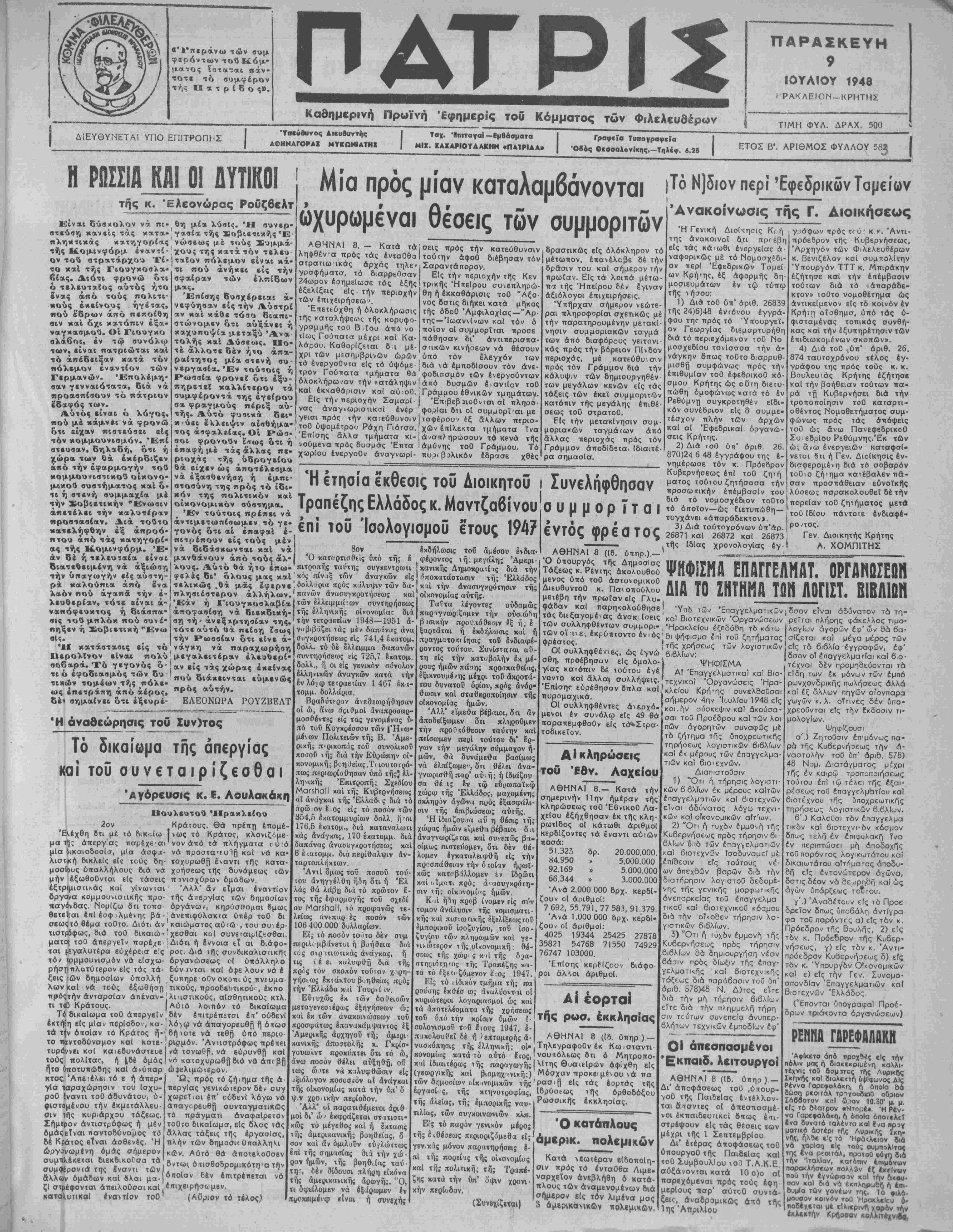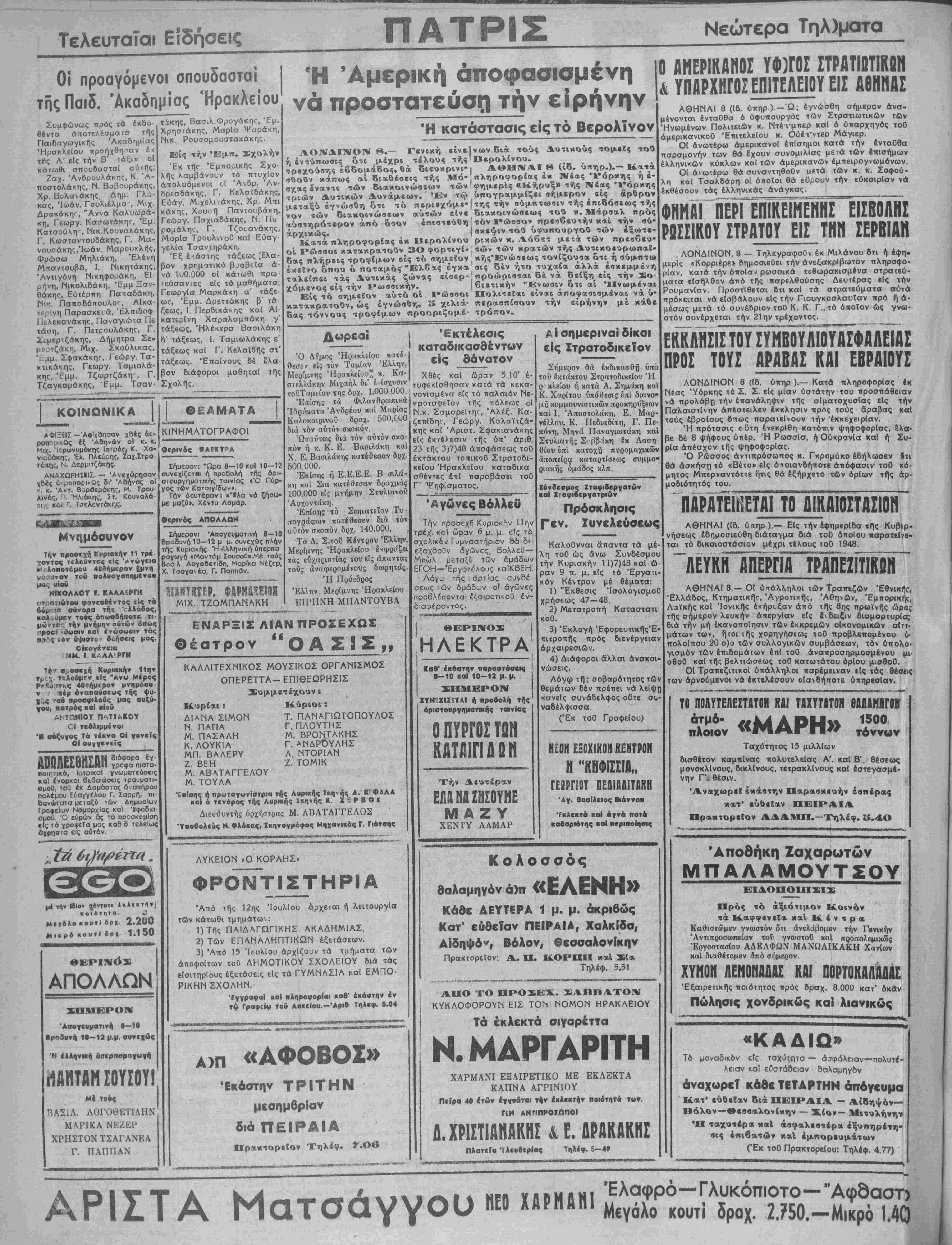 Ηρακλείου προήχθησαν έ< τΡς Α' είς την Β' τάξιν οί κάτωθι σπουδασταί αυτής: Ζαχ. Άνδρουλάκης, Κ. Ά- τιοστολάκης, Ν. Βαβουράκης, Χρ. Βολανάκης, Δημ. Γλιό- κσς, Ιωάν. Γουλιέλμου Μιχ. Δρακάκης, "Άννα Καλυωρά- κη, Γεωργ. ΚασωτάκηΓ, Έμ. Κατσούλη-, Νικ.Κουναλάκης, Γ. Κωσταντουδάκης, Γ. Μα- νουοάκης,Ίωάν. Μαρουκλης, Φρώσω Μηλιάκη, Ελένη Μπαντουβά, Ι. Νικητάκης, Άνΐιγόνη Νικηφοράκη, ΕΙ ρήνη, Νικολιδάκη, Έμμ Ξαν- θάκης, Εύτέρπη Παπαδάκη, Νικ. Παπαδόπ-ουλθΓ, Αίκα¬ τερίνη Παρασκειά, Έλπιδοφ ΠελεκανάκηΓ, Παναγιώΐα Πε τάση, Γ. Πετρουλάκης, Γ. Σ.μερχζάκης, Δήμητρα Σε- μερτζάκη, Μιχ. Σκοΰλικας, Έμμ. Σψσκάκηο, Γεώργ. Τα- κτικάκης, Γεωργ. Τσμιολά- κης, Τμμ. Τζωρτζάκη-, Γ. Τσαγκαράκης, Έμμ. Τσαν- Ι ΚΟΙΝΩΝΙΚΑ Ι Α ΦΙΞξΙΣ— Αφίχθησαν χθές άε- ροτκιριχθς έξ Άθηνϋν οί κ. κ. Μιχ. Ίεροινυμόκης Ιατρός, Κ. Χα· νιαοάκης, Έλ. Πλεύρης, Ζαχ.Στρα το«(Κ« Ν· Δερμιτζάκος. ΑΝΑΧΩΡΗΣΙΣ. — Ανεχώρησαν Κ&ές άίροπορικώς δι" "Αθήνας ο! ", κ. Άντ. Βορβεράκης, Μ. Τρου Αινός, Π. Ηλιάκης, Στ. Κουναλά κης κοι Γ. Τοελεντόκης. Μνημόσυνον Τί(ν προοιχή Κυριακήν 11 τρέ γοντος νβλουντες <|ς Άνώγεια Μυλοποτάμου 40βήμερον |μνη νβΐΐυνον τού πολυαγαπημένου μας υΐοΰ ΝΙΚΟΑΑΟΥ Ι. ΚΑΑΑΕΡΓΗ οτρητιώτου φονευθέντος είς τα ό ούνορα τής 'ιτλλάδος, ν τοΰς όπωσδήποτε τι : την μνήμην αυτών δπ»ς -όυοιν κα*ι ενωθώσιν τάς ϋψιστο- δεήοος μας. γ ΜΜ. Ι. Κ-ΛΛ ΡΓΗ Τΐ[γ προσέχη Κυριακην η ν·:χ τ»λούμΓν «Ις *Άν« Μβρος Ρ^6*ΐ!ΐγι,ς 40#ημερον μνημόσυ- ν / ηέρ αναπαύσεως τής ψυ- χ.,ς νοΰ προοφιλοϋς μας ουςύ· γου, πατρός κοΙ υιού Αί1 ΤΛΝΙΟΥ ΠΑΤΤΑΚΟΥ ΟΙ τεοΑιμμένοι Ή ούζυγος Τα τέκνα ΟΙ γονΐΐς Οί συ,γενείς ποιιτικό, ΊοτρικαΙ γνωμοτεύοεις κ α! ένορκοι βιβαιώσεις τραυματι- σμοθ, τοθ έκ Δαμάστας αναπήρου πολέμου Εύα/γελου Γ. Σαρρή, πι· Θανώτατα μεταξύ των Δημοσΐων Γραφείων ΝομαρχΙας κα) 'ϊφοδια- σμοθ Ό ευρών δς τα προσκομίοη «Ις τα γροφεΤα μας καθ δ τελείως δχρηστα εις αυτόν. μέ την Ιδίαν £βντοτε εκλ«ιιτΐιν| ποιότητα. Ο *4«γβλο«οοτί δρχ. 2.200 κουτΙ 6ρχ. 1.150 ΘΕΡΙΝΟΣ ΑΠΟΛΛΩΝ ΣΗΜΕΡΟΝ Απογευματιναί β—10 Βραδύνη 10—12 μ.μ. βυνεχύς Ή έλληνική ύπΐρπσραγογή ΓΐΑίΙΙΔΗ ΣΟΥΣΟΥ! Μέ τους ΛΟΓΟΘΕΤΙΔΗΝ ΜΑΡΙΚΑ ΝΕΖΕΡ ΧΡΗΣΤΟΝ ΤΣΑΓΑΝΕΑ Γ. ΠΑΠΠΑΝ τίικης, Βασιλ.Φρογάκηο, Έμ. Χρηστάκης, Μαρία Ψαράκη, Νικ. Ρουσομουστακάκης. Είς την Έμπ. Σχολήν Έκ τήΓ Εμπορικάς Σχο λής λαμβάνουν τό πτυχίον άπολυόμενοι οί Ανδρ. Άν- Βρεαδάκης, Γ. Κελαΐδάκης, Εύαγ. Μιχέλη άκης, Χρ. Μπι κάκης, Χουοή Παντουβάκη, Γεώργ. Παχιαδάκης, Ν. Πυ ρομάλης, Γ. Τζουανάκης, Μαρία ΤρουλινοΟ καΐ Εύαγ- γελΐα Τσαντηράκη. Έξ έ-(άστης τάξεως [έλα¬ βον χρημτττικά β ;αβεΐα ά- νά 100.000 οί κάτωθι πρω- τεύσανΐες είς τα μαβήματα: ΓεωργΙα Μαρκάκη α' τάξε¬ ως, Έμμ. Δρεττάκης β' τα ξεως, Ι. Περδικάκης καί Αί¬ κατερίνη Χαραλσμτΐάκη γ' τάξεως, Ήλέκτρα Βασιλάκη δ' τάξεως, Ι. Ταμιωλάκης ε' τάξεως καί Γ. Κελαϊδής στ' τάξεως. Έπαίνους δέ έλα¬ βον διάφοροι μαθηταί τής Σχολής. ΘΕΑΜΑΤΑ ΚΙΝΗΜΑΤΟΓΡΑΦΟ1 Οκρινός Σήμεοον: "Ωρα 8—10 κοΐ 10-12 ουνεχΐζεται ή προβολή τής άρι· στουρνηματικής ταινΐος <Ό Πυρ¬ γος των Καταιγίδων». Την Δευτέραν: «"§λα νά ζήσω- με μαζύ». Χέντυ Λομάρ. •αρινός ΑΠΟΛΛΩΝ Σήμερον: Άπογευματινή 8—10 Βραδύνη 10—12 μ υ. συνεχδς πλήν τής Κυριακής Ή έλληνική ΰπερπα ραγιογή «Μαντόμ Σουσο0».Μέ τούς Βοο λ ΛογοθετΙδη, Μαρίκα Νέζερ, Χ. Τσαγανέσ, Γ. Παππαν. ΜΙΧ. ΤΖΟΜΠΑΝΑΚΗ Ή 'Αμερική άποφασισμένη νά προστατεύση την εΐρήν,ην βΗ κατάστασις εις τό Βερολίνον ΛΟΝΔΙΝΟΝ 8.— Γενική είνεΐνων διά τούς Αυτικούς τομεϊς τού ή εντύπωσις ότι μέχρι τέλους τής" Βερολίνου. τρεχούσης εβδομάδος, θά διευκρινι-ι ΑΘ