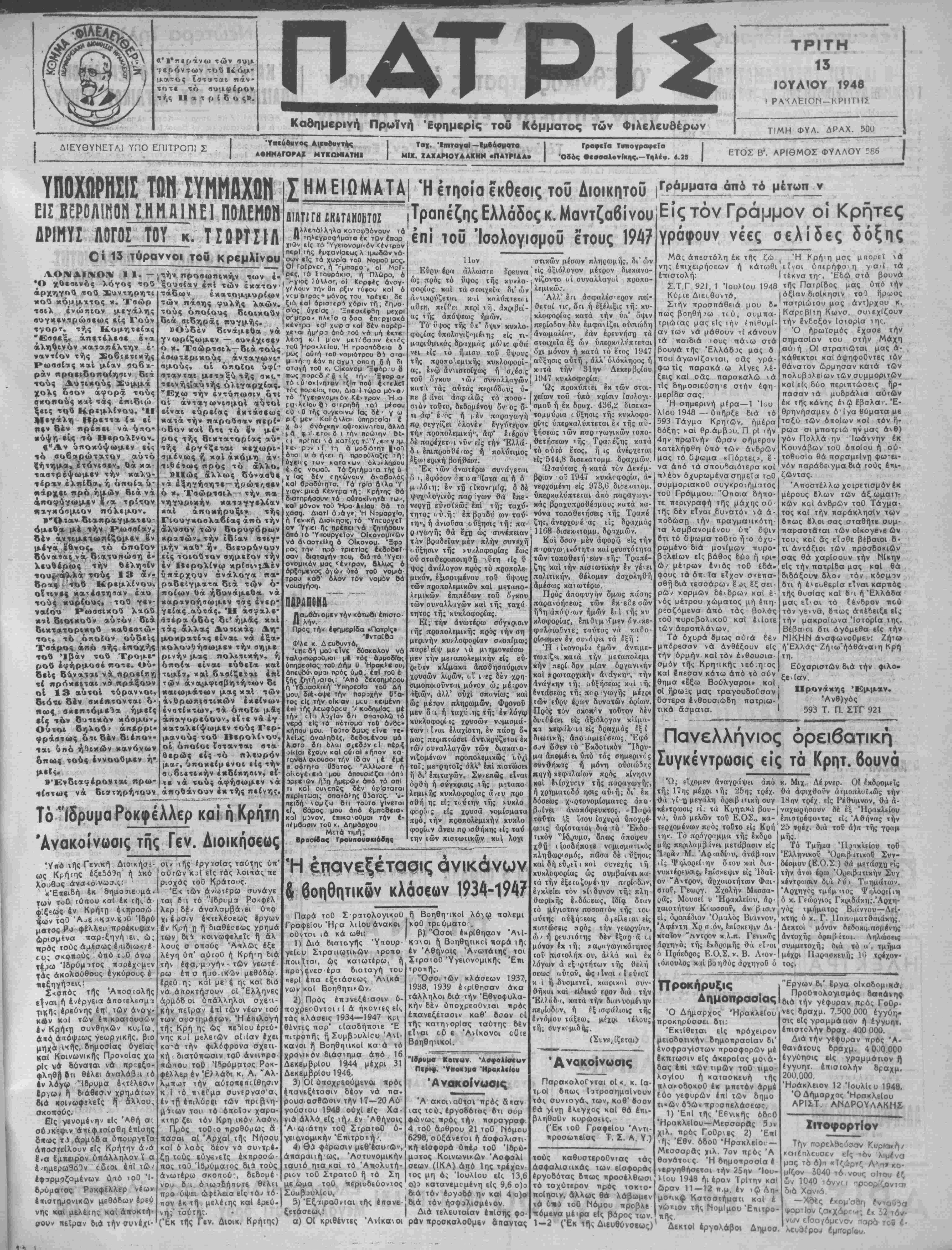 ΡΑ'<ΛΕΙΟΝ-ΚΡΗΤΗΣ ΤΙΜΗ ΦΥΛ. ΔΡΑΧ. 500 ΔΙΕΥΘΥΝΕΤΑ1 ΥΠΟ ΕΠ1ΤΡΟΠΙ Σ 'Υπεύουνος Αρυονντης ΑΦΗΝΑΓΟΡΑΖ ΜΥΚΩΝΙΑΤΗ1 Ταχ. Ίπιταγαΐ —Εμβάοματα ΜΙΧ. ΖΑΧΑΝΟΥΔΑΚΗΝ «ΠΑιΡΙΑΑ» Γραφεϊα Τιιηογραφεΐα Όδος •««οαλογ'κης.—Τηλέ*. 4.29 ΕΤΟΣ Β". ΑΡΙΘΜΟΣ ΦΥΛΛΟΥ 586 1 ΥΠΟΧΩΡΗΣΙΣ Μ ΣΥΜΜΑΧΟΝ ΕΙΣ ΒΕΡ0Λ1Ϊ10ΪΙΣΗΜΑΙΜΕΙ ΠΟΛΕΜΟΗ ΔΡΙΜΥΣ ΛΟΓΟΣ_ΤΟΥ_κ. ΤΣΩΡΤΣΙΛ Οί 13 τύραννοι τού κρεμλίνου ΛΟΝΔΙΝΟΝ 11. - •Ο χθεσινός λόγος τού άρχηγοθ *θΰ Συντηρητι κου κόμματος κ. Τσώρ τβιλ ενώπιον μεγάλης συγκεντρώσεως είς Γούν τγορτ, τίΊς Κομητείας "Εσ?εξ, απετέλεσε έ'ν-α άληθινόν καταπέλτην έ* ναντίον τής Σοβιετικήν Ρωσσίας καί μίαν σοβα¬ ράν προειδοποίησιν διά τούς Δυτικούς Συμμά χολς όσον άφορά τούς βκοπούς κ»1 τάς έπιδιώ ξεις τού Κρεμλίνου. Ή %|·γάλη Βρεττα ί* εί «εν Βέν πρεπει νά ύηο* κύψη είς τό Βερολίνον. βνΑν ύποκύψωμεν είς τό σοβαρώτατον αύτό ζήτημα, ετόνισεν, θά κα- ταατρέψωμεν την καλυ- τίραν έλαίδο, ή όποία ύ* «ιάρχει πρό ημών βιά νά αποφύγωμεν $'<* τρίτον παγκόσμιον πόλεμον. ν*Ό«αν διαπραγματευ- όμεθα μέ την Ρωσσίαν* βέν άντΐμειωηίζομεν 8ν μέγα έ&νος, τό οποίον δύνατά^νά δ'-ατυπώοη έ» λευϋέρως την Θέλησίν *ου|«β|λ*α τοίς 13 άν¬ δρας τού Κρεμλίνου, Οΐτινες κατέστησαν έ*υ τούς κυρίους» τού γεν- ναίθΛ> Ρώσσικου λαοΰ