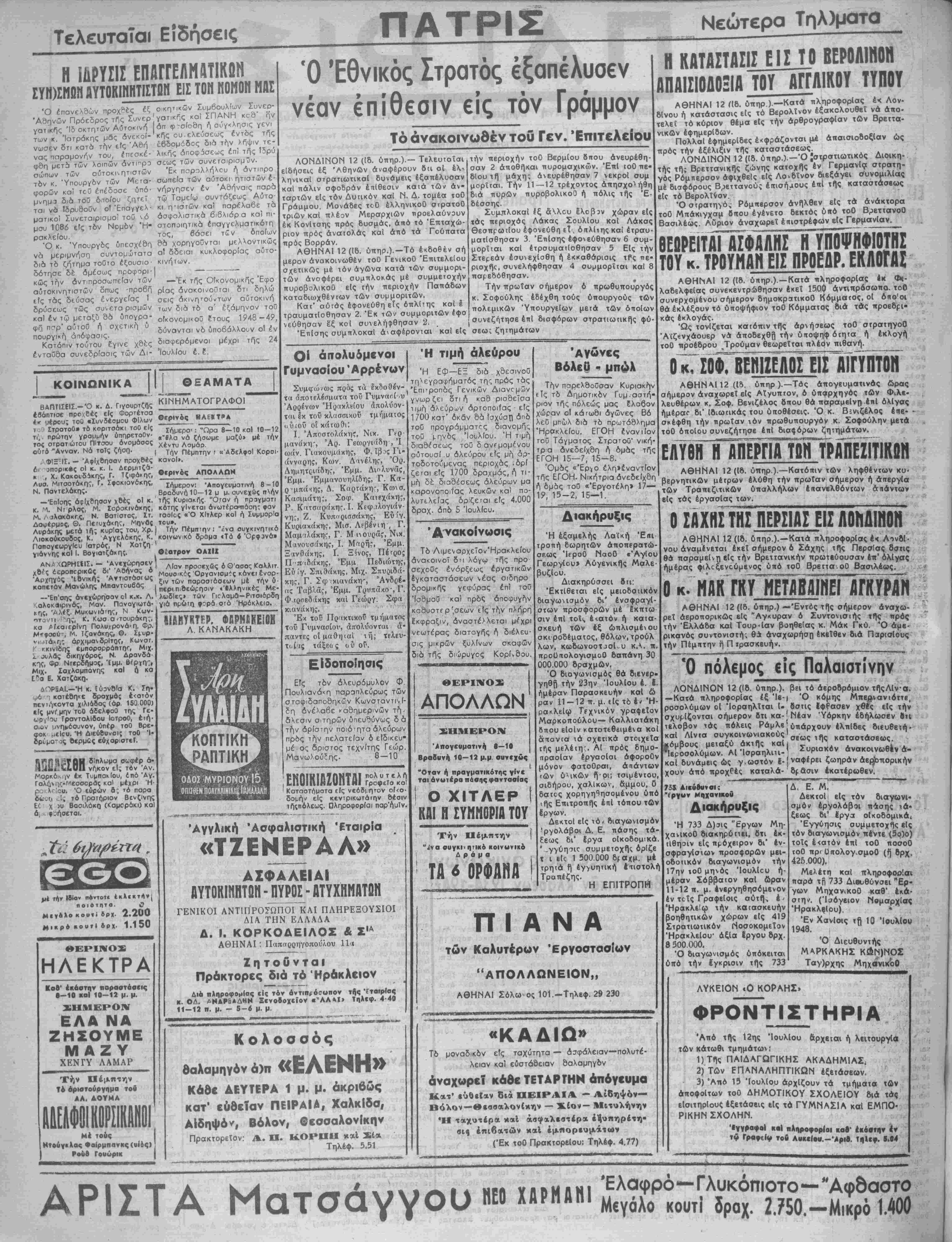 ΑΘΗΝΑΙ 12 (Ιδ. ύΐτηρ.).—Καιά πληροφορίας ε< Λ-)νδΙ· νού άναμένεται έκεΐ σήμερον 6 -όχης τής Περσίας δοτις θά παραμείνη είς την Βρεττανικήν πρωτεύουσαν έττ' ολίγας ημέρας φιλεξενούμενος υπό τοθ Βρεπα.οΟ Βασιλέως. Ο κ- ΜΑΚ ΓΚΥ ΜΕΤΛΒΑΙΗΕΙ ΛΓΚΫρΙΪΙ ΑΘΗΝΑΙ 12 (18. ύπηρ.) —-Έντός τής σήμερον αναχω¬ ρεί άεροπορικώς είς "Αγκυραν ό Συντονισΐής τΓ)ς πρός την Έλλάβα καί ΤουρΊαν βοηθείας κ. Μάκ Γκύ. Ό άμε- ρικανός συντονιστή; θά αναχωρήση εκείθεν διά Παρισίους την Πέμπτην ή Π ΐρασκβυήν. 1 Π Ι Α Ν Α χον Καλύτερον Έργοστασίων > ϊ ν "ΑΠΟΛΛΩΝΕΙΟΝ,,