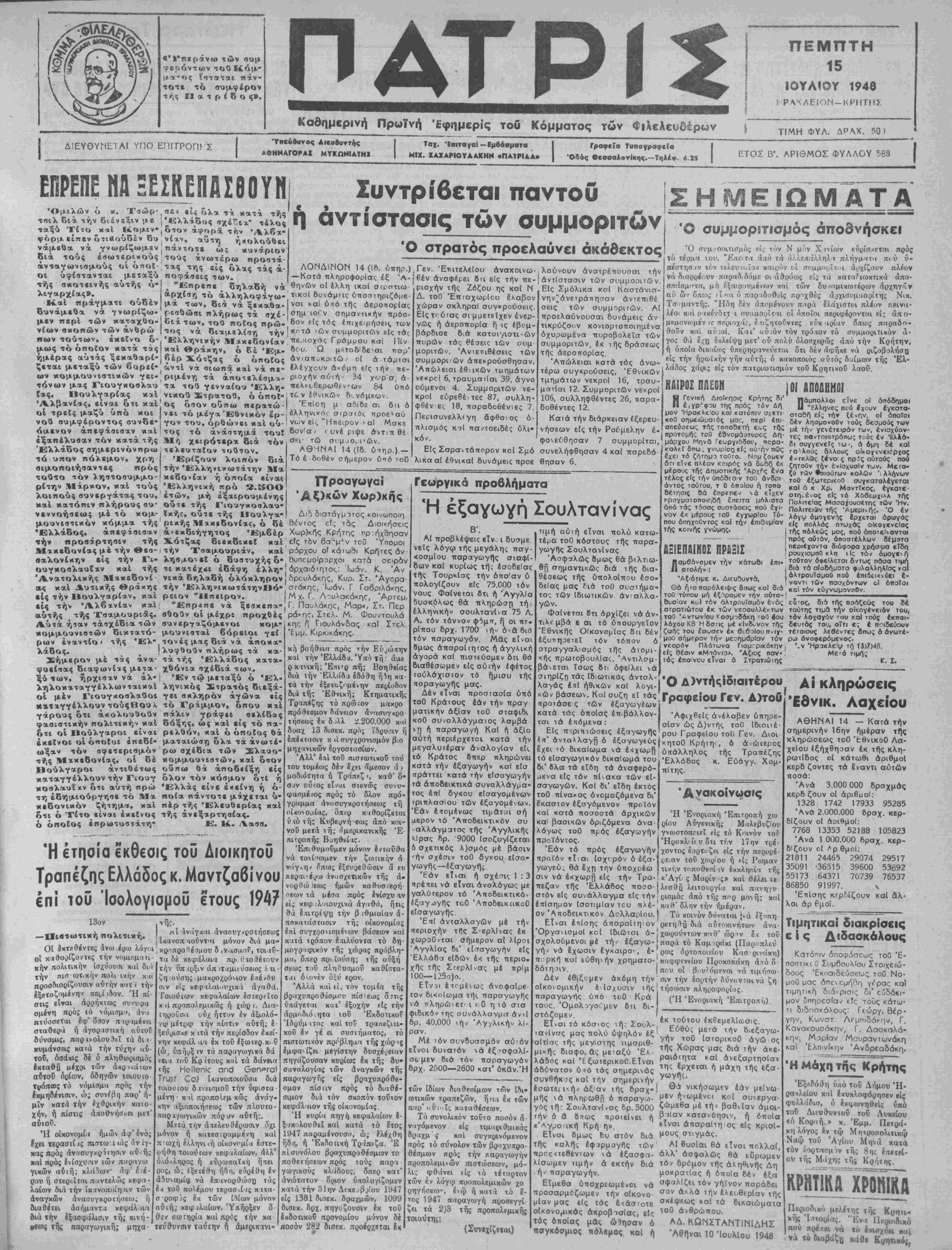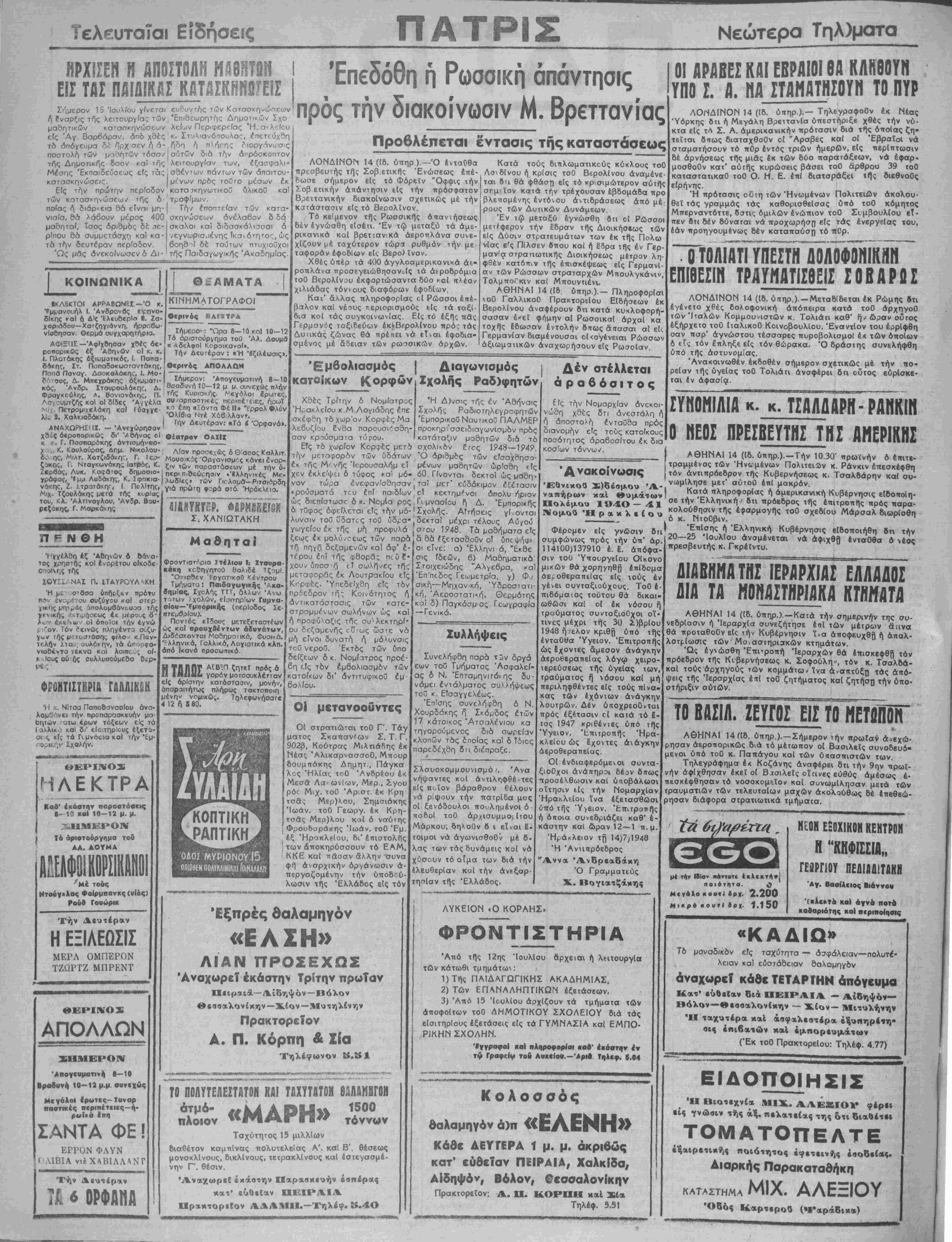 τοχής εδωσαν εντολήν Βττος άαασαι αί εί< Γερμανίαν διαμένουσαι οί<ογένειαι Ρώσσων αξιωματικών άναχωρήσουν είς Ρωσσίαν. Χθές Τρίτην δ Νομίατρος Ηρακλείου κ Μ Λονιάδης έπε τδχωρ'ον Κορφες Μα λεβυζίου Ινθα σαν κρούσματα τύ^ου. Έμβολιασμός | Διαγωνΐομός κάτοικον Κορφών, Σχολης Ραδ)φητών Ή Δ)νσις τής έν Αθήναις Σχολης Ραδιοτηλεγρσφητών Έμπορικοΰ Ναυτικοΰ ΠΑΛΜΕΡ προκηρχ'σσειδιαγωνΐσμδν πρδς κατάταξιν μαθητών διά τδ Είς τδ χωρίον Κορφές μετά σχολκδν ίτος 1948—1949. την μεταφοράν των υδάτων 'Ο άριθμδς των είσαχθησο- έκ τής Μ< νής Ίερουσαλήμ εί μένων μαθητών ώρ'σδη είς χεν έκλε^ψει ό τύφος καί μό- 60 Γίνονται δεκτοί ώς μαδη νον^ τώρα ενεφανίσθησαν | το? μετ" εΰδόκιμον εξέτασιν ρούσματά τού επί παιδ(ων(οί κεκτημ^νοι άπολυ ήριον ώς διεπίστωσε ό κ. ΝομΙα ρος , Γυμνασίου ή Δ. 'Εμπορικής ό τϋφος όφεΐλεται είς τι^ν μό-} Σχολης. Αίτήσεις νί^ονται λυνσιν τού ύδατος τού ύδρα*!δεκτα! μέχρι τέλους Αύ,-ού γωγείου έκ τής μή προφυλά ,στου 1948. Τα μαδήματσ είς ΗΤΑ.1ΩΣ ΑΕΒ.Π ζητεί πρός ά γοράν μοτοσυκλέτταν είς αρίστην κατάστασιν, μονήν, 6ή λή ς ρη 6πορ3ΐτήτως μένπ^ νομ 4 12 η1 5 80. πλήρως τακτοποιη Τολεφωνήσατε ΚΟΠΤΙΚΗ ΡΑΠΤΙΚΗ ξεως έκ μολύν'οεως των παρό τή πηγή δεξαμενών καϊ άφ* έ τέρου επί τής φδοράς ποΰ?- χουν ύποσ'Γί ^ί σωλήνες τής μεταφορδς έκ Λουτρακίου είς Κορφές. 'Υπεδείχδη είς τδν πρόεδρον τή; Κοινότητος ή αντικατάστασις των κατε- στραμμέν,ων σωλήνων ώς κα προφύλαξις τής συ^λεκτηρΙ- ου δεξαμενης ου·ως ωστε ' μή εΤνοι δυνατή ή μόλυνσις τού νεροό. 'Εκτδς των υπο δείξεων 6 κ. Νομίατρος προέ¬ βη είς τδν εμβολιασμόν των κατοίκων δι' άντιτυφικοθ έμ βολίου. ΟΙ μετανοοΰντες ΟΙ στρατιώται τοθ Γ'. Τάγ ματος Σκαπανίων Σ. Τ. Γ. 902ρ Κούτρας Μιλτΐάδης έκ Νέας ΆλικαρνασσοΟ, Μπουρ δουμπάκης Δημητ., Πάγκα λος Ηλίας τοθ 'Ανδρέου έκ Μεσα Λα* ωνίων, Μερ., Σγου ρόο Μιχ. τοθ Άριστ. έκ Κρη τσθς Μερ)ου, Σημσιάκης Ιωάν. τοθ Γεωργ, έκ Κρη- τσάς Μερ)λου κοί ό νσύΐης Φρουδοράκης Ιωάν, τοθ Έμ. έξ Ηρακλείου, δι' έπιστολής [ των άποκηρύσσουν τό ΕΑΜ, ' ΚΚΕ καί πασάν άλλην -συνσ φή άνσρχικήν οργάνωσιν ά- περγαζομένην την υποδού¬ λωσιν τής "Ελλάδος είς τόν Εξπρές θαλαμηγόν «ΕΛΙΗ» ΛΙΑΝ ΠΡΟΣΕΧΩΣ Αναχωρεί εκάστην Τρίτην πρωϊαν Πειραια—Λίδηψόν—Βόλον Θεσσαλονίκην— Χ,ίον—Μυτηλίνην Πρακτορείον Α. Π. Κόρπη & Σία Τηλέφωνον ΤΟ ΠΟΑΥΤΕΛΕΣΤΑΤΟΝ ΧΑΙ ΤΔΧΥΤΔΤΟΜ βϋΛΑΜΒΓΟΙ. ότμό- «Μ ΑΡΗ** 1500 πλοιον ^ΜέΑιΓΠ^ τόννων Ταχύτητος 15 μιλλίων διαθέτον καμπΐνας πολυτελείας Α'. καί Β'. θέσεως μονοκλΐνους, δικλΐνους, τετρακλΐνους καί έστεγασμέ- νην Γ'. θέσιν. Αναχωρεί εκάστην Παρασκευήν εσπέρας κατ' ευθείαν ΠΕΙΡΑΙΑ Πρακτορείον ΑΔΑΜΗ.—Τηλέφ. 5.40 μήμ α θά ίξετασδοΰν οί ύποψήφι οί είνε: α) 'Ελληνι ά, "Εκθε σις ίδεών, 6) Μαθηματικά' Στοιχειώδης "Αλνε6ρα, κα'ι Έπ'πεδος Γεωμετρία, γ) Φο σική·—Μηχανική, 'Υδροσιατι- κή, Άεροστατκή, Θερμότης κο! δ) Παγκόσμιος Γεωγραφία —Γενικά. Συλλήψεις Συνελήφθη παρά τ2ν όργά εων τού Τμήματος Ασφαλεί¬ ας 6 Ν. 'Επταμηνιτά'ής δυ¬ νάμει έντάλματος συλλήψεως τοθ κ. Εισαγγελέως. 'Επίσης συνελήφθη ό Ν. Χουρδόκης ^ Σκόμδος έτών 17 κάτοικος 'Ατσαλένιου κα τηνορούμενος διά σωρείαν κλοπών τάς οποίας καί δ ΐδιος παρεδέχθη 5π διέπραξε. Σλαυοκομμουνισμό ·. Άνα νήψαντες καΐ αντιληφθέντες είς ποίον βάραθρον θέλουν νά ρίψουν την πατρίδα μσς οί ξενόδουλοι πουλημένοι ά τιαδοί τοθ άρχΐσυμμο; Ιτου Μάρκου, δηλοθν δ ι εΐ^αι ε· τοιμοι νά άγωνισθοθν μέ 8· λσς των τάς δυνάμεις κσί νά χύσουν τό αΐμα των διά την ελευθερίαν καί την ανεξαρ¬ τησίαν τής Ελλάδος. Ι στέλλε