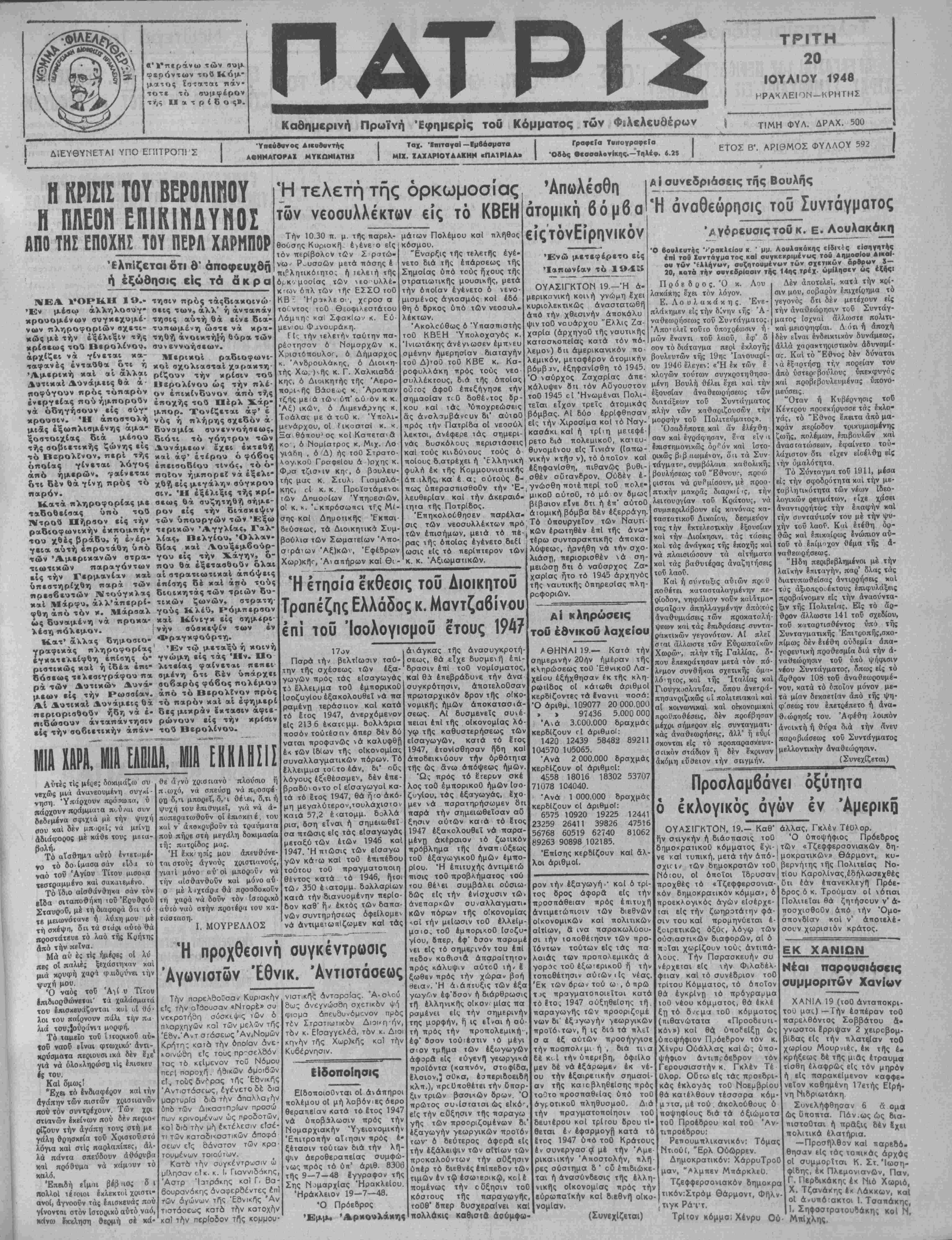 Ν<οΰ «Εύαγγε/.ισιρίας». Κ«- λοίνται όθεν άταντες οί φιλέορ τοι δπως προσέλθουν καί τιμή σουν ιήν ϊεράν ταύτην τελετήν. Μελέσσες 15 — 7—48 Ή Ένοριακή Έπιτροπή Παπά Μ. Άρχαύλης, Μύ ρων Σφακιανάκης, Χρ. Χανιω- τάκης κ ά Ί. Ίερομοναχάκης. 3-5 Ανακοίνωσις Άτιό τής 21ης "Ιουλίου έ. 'έ. άρχεται ή διανομή γάλα¬ κτος διά τού; εύπόρους δι- καιοόχους τής πόλεως Ή ρακλεΐου. Λεπτομερείας διανομής ό- ρΐζει σχετ κόν πρόγριμμα τοιχοκολληθέ; τόπον διανο- μής, καί Γραφείον Παιδικής Διατροφής. (Έκ τοθΓραφεΙου Παιδ Δι¬ ατροφής ΠΙΚΠΑ Ηρακλείου). ΣΦΡΑΠΔΕσΓ~ΕΜΤΥΠΑ "σΙΟΑΙΚΑ ΕΙΔΗ ΣΤΟΤ Μ. ΦΟΥΝΤΟΥΛΑΚΗ στοη βριπ. ΤΗΛΦ. 8.86 Τρ είς τόν νομόν μας ' Ε π· Διαφωτίσεως Τό παρελθόν Σάββατον ό Νομάρχης Ηρακλείου κ. Σκοθφος ώς πρόεδρος τής Έπιτροπής Διαφωτίσεως συ¬ ν οδευόμενος κσί υπό των έκ των μελών τής Έπιτροπής κ.κ. Παπανωάννου προέδρου Πρωτοδικών, Γιαννακοπού- λου Εισαγγελέως, Γ. Χαλ¬ κιαδάκη Δ)τοΟ Χωρ)κής, Γ. Καρούζου κσί Κ. Βαρβερά- κη δικηγόρων, μετέβησαν είς Μοΐρες δπου ωμίλησαν πρός τα συγκεντρωμένα κατά την εμποροπανηγυριν πλήθη σχε τικώς μέ τούς έπιδιωκομέ- νους σκοπούς υπό τοθ κομ- μουνισμοθ έργαζ^μένου διά ιήν καταστρεφήν τής "Ελλά¬ δος καΐ τα κοθήκοντα των πολιτών έναντι τής άνταρ- σΐσς. Τα έπιδόματα Έκ τής Κεντρικής Έπιτρο- γ ής περιθάλψεως των οίκογε· νειών των μοχομένων όνακοι νοθται δτι όπδ σήμερον δρχε- ται γ*| πληρωμή τού έπιδόμα τος τού μηνδς Μαίου. Ή .τλή ρωμη 9ά γίνη καπίι την εξής σειράν: Την 21, 22 καΐ 23 Ι¬ ουλίου 86 πληρωδοϋν οί δι- καιοΰχοι πεζικοΰ, τή>/ 24 καΐ