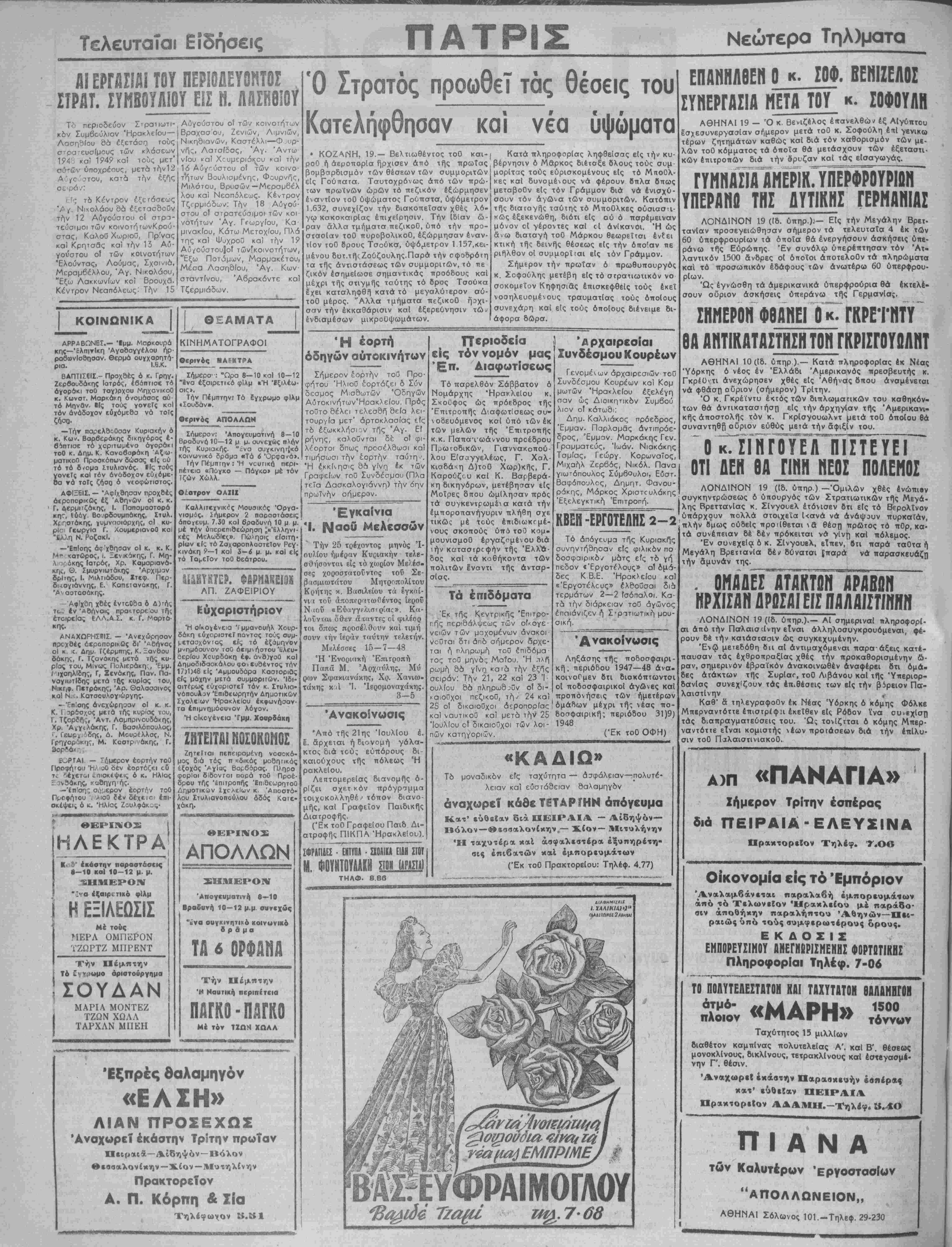 όπάρχουν τιολλά στοιχεΐα 1<ανά νά άνάψουν πυρκαΐάν, πλήν Βμως ουδείς προ τίθεται ν ά θέση ττρώτος τό πθρ, κα¬ τά συνέπειαν δέ δέν πρόκειται νά γΐνϊι καί πόλεμος. Έν συνεχεΐα ό κ. ΣΙνγουβλ, είπεν,'βτι παρά ταθτα ή Μεγάλη Βρεττανία δέν δύναται Ιτιαρά νά παρασκευάζη την άμυναν της. . ΟΜΑΔΕΣ ΑΤΑΚΤΟΝ ΑΡΑΒΩΝ ΗΡΧΙΣΑΝ ΛΡΩΣΑΙΕΙΣΠίΑΑΙΣΤΙΗΗΗ ΛΟΝΔΙΝΟΝ 19 ((δ. ύπηρ.).— Αί σημεριναί πληροφορί¬ αι άπό την Παλαισ τί νην είναι άλληλοσυγκρουόμεναι, φέ¬ ρουν δέ την κατάστασιν ώς συγκεχυμένην. Ένώ μετεδόθη βιΐ αί άντιμαχόμεναι παραάζεις κατέ- παυσαν τάς έχθροπραξίας χθές την προκαθορισμένην ώ¬ ραν, σημερινόν έβραΐκόν ανακοινωθέν άναφέρει ότι όμά- 8ες άτάκτων τής ΣυρΙαΓ, τοθ Λιβάνου καΐ τής Ύτιεριορ- δανΐσς συνεχΐζουν τάς έπιθέσεις των είς την βορειον Πα- λαιστίνην , Καθ" ά τηλεγραφοθν έκ Νέας Υόρκης ό κόμης Φόλκβ Μπερναντόττε έπιστρίφη εκείθεν είς Ρόβον ϊνα συνβχίση τάς διαπραγματεύσεις τού. Ώς τονΐζτται ό κόμης Μπβρ- ναντόττε είναι κομιστής νέων προτάσεων διά την επίλυ¬ σιν τοθ ΠαλαιστινιακοΟ. Α)π «ΠΑΝΑΓΙΑ» Σήμερον Τρίτην εσπέρας διά ΠΕΙΡΑΙΑ-ΕΛΕΥΣΙΝ Α Πρακτορείον Τηλέφ. Τ.Οβ Οικονομία είς τό Εμπόριον 'Αναλαμβάνεται παραλάβη έμπορευμάτων «πό τό Τελωνείον Ηρακλείου μέ παράδο¬ σιν αποθήκην παραλήπτου Αθηνών—Πει¬ ραιώς υπό τούς συμφερωτέρους όρους. Ε Κ ΔΟ ΣΙΣ ΕΜΠΟΡΕΥΣΙΜΟΥ ΑΗΕΓΗ6ΡΙΣΗΕΗΒΣ ΦΟΡΤΩΤΙΚΗΣ Πληροφορίαι Τηλέφ. 7-06 ΤΟ ΠΟΛΥΤΕΑΕΣΤΑΤΟΜ ΚΔΙ ΤΑΧΥΤΑΤΟΜ 6ΑΛΑΜΙΙΓ0Η ά7μο" **δΜΛΟ11%% 1500 πλοιον ^^Ι~1έΡ%ΐ~Γΐ## τόννων Ταχύτητος 15 μιλλΐων διαθέτον καμπΐνας πολυτελείας Α'. καΐ Β' θέσεως μονοκλίνους, δικλίνους, τβτρακλΐνους «αί έστβγασμέ- νην Γ'. θέσιν. Αναχωρεί εκάστην Παρασκευήν ««V ευθείαν ΠΕΙΡΑΙΑ Πρακτορείον ΑΔΑΜΗ.-Τηλεφ. ».. πι α ν α των Καλυτέρων Έργοστασίων "απολλωνειον,, „; ΑΘΗΝΑΙ Σόλωνος 101.-Τηλεφ. 29-230