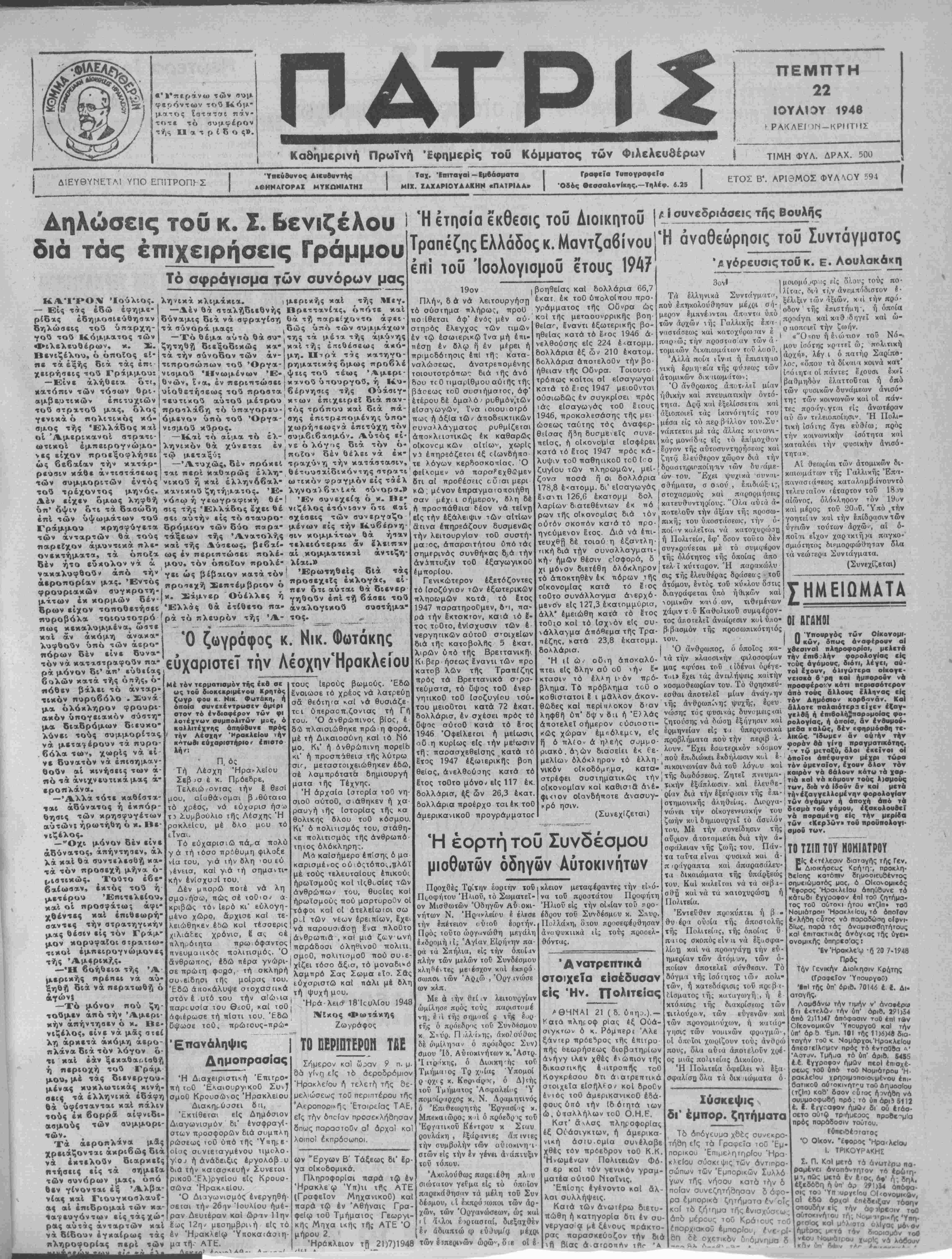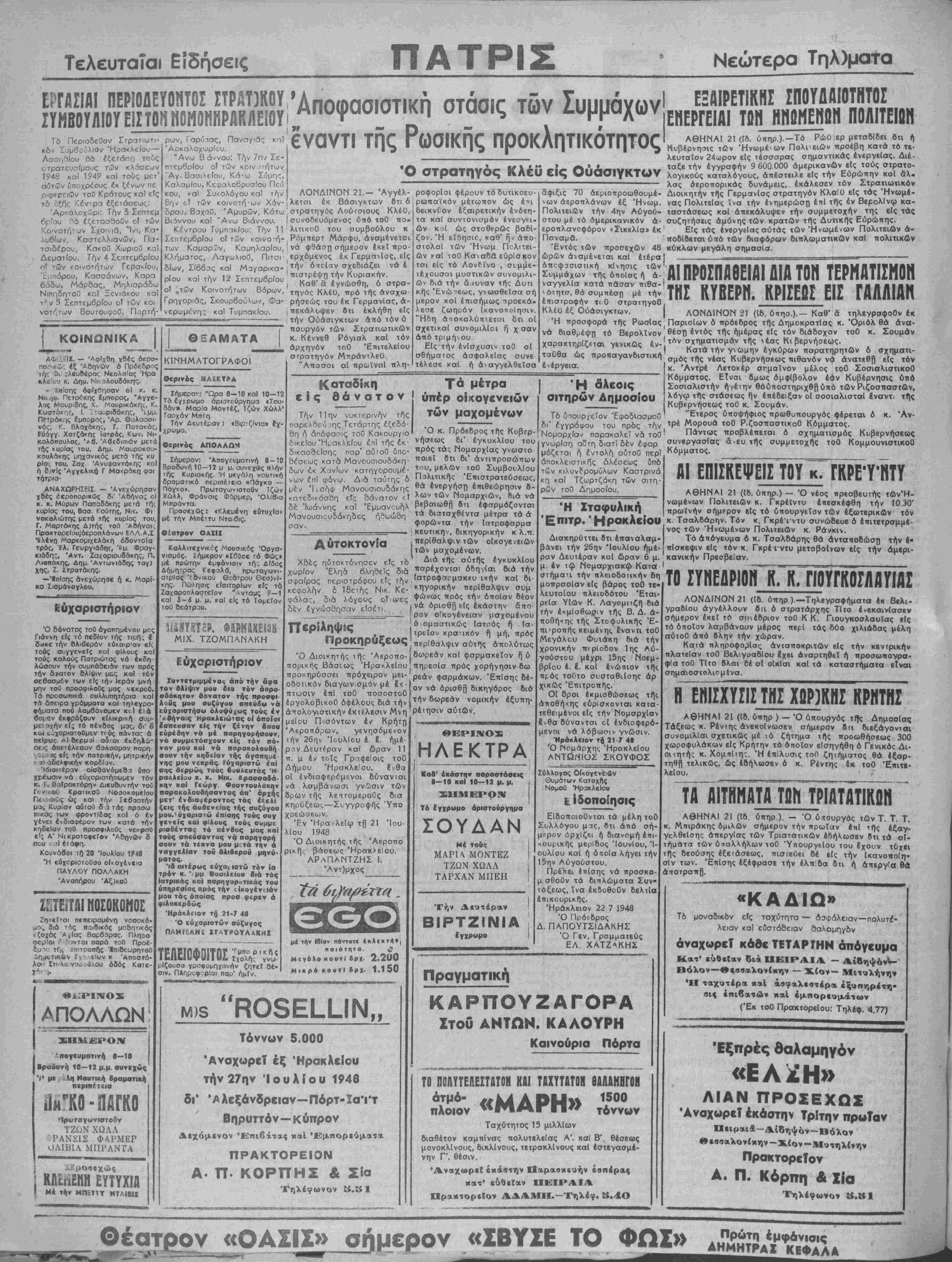 άτιοθή<ης ευρίσκονται κατα τεθειμένοι είς την Νομαρχίαν ένθα δύνανται οί ένοιαφερό- μενοι νά λάβωσιν γνώσιν. Ηράκλειον Τή 21-7 48 Ό Νομάρχης "Ηρακλείου ΑΝΤΩΓ4ΙΟΣ ΣΚΟΥΦΟΣ Σύλλογος ΟΙκογενειών ©υμάτων Κατοχής ΝομοΟ "Ηρακλείου Ε ίδοποίηοις Είδοποιοθνται τα μέλη τοθ Συλλόγου μας, ότι άτιό σή· μί-ρον όρχΐζει ή διανομή έπι- κουρικής μερίδος ΊουνΙου, Ι¬ ουλίου καΐ ή ό ποία λήγει την 15ην Αύγούστου. Πρέπει έπΐσης νά προσκο μ σθοθν τα διπλώματα Συν· τάξεως, ίνα έκδοθοθν δελτΐα έπικουρικής. Ηράκλειον 22 7 1948 Ό Πρόεδρος Δ. ΠΑΠΟΥΤΣΙΔΑΚΗΣ Ό Γεν. Γραμματεύς ΕΛ. ΧΑΤΖΑΚΗΣ Προγματική ΚΑΡΠΟΥΖΑΓΟΡΑ ΣτοΟ ΛΝΤΩΝ. ΚΔΛΟΥΡΗ Καινουρια Πόρτα ΤΟ ΠΟΛΥΤΕΑΕΣΤΑΤΟΗ ΚΑΙ ΤΑΧΥΤΑΤΟΗ ΘΑΛΑΜΗΓΟΝ άτμό- α^Α Α Ο14\ ^^ πλοιον »ΠΜΓΠ^ τόννων Ταχύτητος 15 μιλλίων διαθέτον καμπΐνας πολυτελείας Α'. καί Β'. θέσεως μονοκλΐνους, δικλίνους, τβτρακλΐνους καΐ έστεγασμέ- νην Γ'. θέσιν. Αναχωρεί εκάστην Παρασκευήν εσπέρας κατ' ευθείαν ΠΕΙΡΑΙΑ Πρακτορείον ΑΔΑΜΗ.—Τηλέφ* Κ.4Ο ΑΙ ΠΡΟΣΠΑΘΕΙΑΙ ΔΙΑ ΤΟΝ ΤΕΡΜΑΤΙΣΜΟΝ ΤΗΣ ΚΥΒΕΡΗ. ΚΡΙΣΕΩΣ ΕΙΣ ΓΑΛΛΙΑΝ ΛΟΝΔΙΝΟΝ 21 (16. ΰηηο.).— Καθ' ά τηλβγραφοθν έκ Παρισίων ό πρόεδρος τής Δημοκρατίας κ. Όριόλ θά ανα¬ θέση έντός τής ημέρας είς τόν διάδοχον τοθ κ. Σούμαν Ι τΑν σχηματισμόν τής νέας Κιβερνήσεως. | Κατά την γνώμην έγκύρων πσρατηρητών ό σχηματι- σμός τής νέας Κυβερνήσεως πιθανόν νά ανατεθή είς τόν κ. Άντρέ Αετοκέρ θΓμσΐνον μέλος τοθ ΣοσιαλιστικοΟ Κόμματος. Είναι δμως αμφίβολον εάν Κυβέρνησις υπό Σοσιαλιστήν ήγέτην θόύτιοστηριχθήύπό των Ριζοσπαστών, λόγω τής στάσίως ήν επέδειξαν οί σοσιαλισταί έναντι τής Κυβερνήσεως τοθ κ. Σούμαν. Έτερος ύποψήφιος πρωθυπουργόν φέρεται ό κ. Άν¬ τρέ Μορουά τοθ Ρ.ζοσπαστικοΟ Κόμματος. ! Πάντως προβλέπβται ό σχηματισμός Κυβερνήσεως συνεργασΐας ά^ευ τής συμμετοχής τοθ ΚομμουνιστικοΟ Κόμματος. ΑΙ ΕΠΙΣΚΕΨΕΙΣ ΤΟΥ ΓΊΤΡΕΤΗΤΎ ΑΘΗΝΑΙ 21 (18. ύπηρ.) — Ό νέος πρεσβευτής των'Η- νωμένων Πολιτειών κ. Γκρέϊντυ επεσκέφθη την 10.30' πρωϊνήν σήμερον είς τό υπουργείον των εξωτερικών τόν κ Τσαλδάρην. Τόν κ. Γκρέιντυ συνώδευε δ επιτετραμμέ¬ νος των Ήνωμένων Πολιτειών κ. Ράνκιν. Τό άπόγευμα ό κ. Τσαλδάρης θά άνταποδώση την ί· πΕσκεψιν είς τόν κ. Γκρέτντυ μετοβοΐνων είς την άμερι- κανικήν Πρεσβείαν. ΤΟ ΣΥΝΕΔΡΙΟΝ!. Κ. ΓΙΟΥΓΚΟΣΑΑΥΙΑΣ ΛΟΝΔΙΝΟΝ 21 ((Β. ύπηρ ).—-Τηλεγραφήματα «κ Βελι¬ γραδίου άγγέλλουν Οτι ό στρατάρχης Τ(το ενεκαινίασεν σήμερον έκεΐ τό συνέδριον τοθ Κ Κ. Γιουγκοσλαυΐας είς τό οποίον λαμβάνουν μέρος περί τάς δύο χιλιάδας μέλη αύτοθ άπό 6λην την χώραν. Κατά πληροφορίας ανταποκριτήν είς την κεντρικήν πλατείαν τοθ Βελιγραδίου 6χει άναρτηθεΐ ή προσωτιογρα- φ!α τοθ ΤΙτο όλαι δέ οί οικίαι καΐ τα καταστήματα εΤναι σημαιοστολιομένα. Η ΕΠΙΣΧΥΠΣ ΤΗΣ ΧΩΡ3ΚΗΣ ΚΡΗΤΗΣ ΑΘΗΝΑΙ 21 ((δ. ύπηρ ) — Ό ύπουργός τή Δημοσίας Τάξεως κ. Ρέντης ανεκοίνωσεν σήμερον δτι διεξάγονιαι συνομιλΐαι σχετικώς μέ ι ό ζήτημα τής προωθήσεως 300 χωροφυλάκων είς Κρήτην τό οποίον εΐσηγήθη ό Γενικάς Δι- οκητής κ. ΧομπΙτη-;. Ή έπΐλυσις τοΓ) ζητήματος θά εξαρ¬ τηθή τελικώς, ώς εδήλωσεν ό κ. Ρέντης έκ τοθ Έπιτι- λεΐου. ' · ΪΑΐΐΤΗΜΑΤΑ ΤΩΝ ΤΡΪΙτΤτΙκωΙ "" ΑΘΗΝΑΙ 21 ((δ. ύπηρ.). — Ό ύιχουργός των Τ. Τ. Τ. κ. Μπιράκης ομιλών σήμερον την πρωΐαν επί τής έξαγ- γελθεΐσης άπεργΐας των Τριατατικών εδήλωσεν βτι τα οΐ- τήματα των ΰπαλλήλων τοθ ΎπουργεΙου τού Εχουν τύχεΐ τής δεούσης έζετάσεως, πισίεύει δέ είς την Ικανοποίη¬ σιν των. ΈπΙσης εξέφρασε την έλπιβα βτι ή άηεργΐα θά άποτραι»{|. «Κ Α Δ ΙΩ» Τδ μοναδικόν είς ταχύτητα — ασφάλειαν-— πολυ