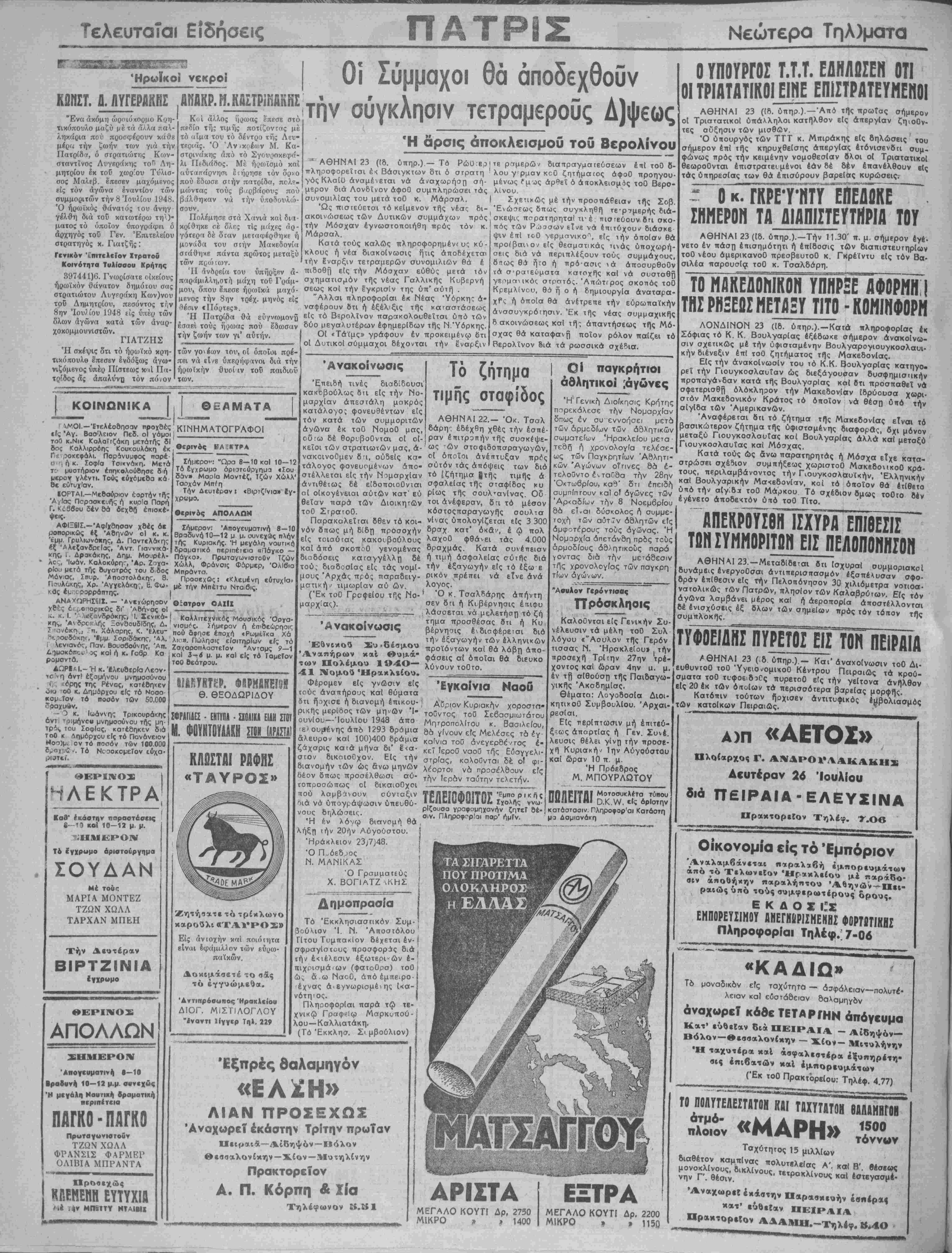 πληροφορεΐται έ< Βάσιγκτων δτι ό στρατη ' γός ΚλαΙϋ άναμένεται νά αναχωρήση σή¬ μερον διά Λονδίνον άφοθ συμττληρώσει τάς συνομιλίας τού μετά τοθ κ. Μαρσάλ. Ι Ώς πισΐεύεται τό κείμενον τής νέας δι-, ακοινώσεως των Δυτικών συμμάχων πρός την Μόσχαν εγνωστοποιήθη πρός τόν κ Μαρσάλ. Κατά τούς καλώς πληροφορημένί υς κύ- κλους ή νέα διακοίνωσις ήτις άποδέχεται την έναρξιν τετραμερών συνομιλιβν θά έ πιδοθή είς την Μόσχαν ευθύς μετά τόν σχηματισμόν τής νέας Γαλλικής Κυβερνή σεως κσί την έγκρισΐν της ύπ' αύιί] . "Αλλαι πληροφορίαι έκ Νέας "Υόρκην ά- ναφέρουν δτι ή εξέλιξις τής καταστάσεως είς τό Βερολίνον παρακολουθεΐται υπό των δύο μεγαλύτερον εφημερίδων τής Ν Υόρκης. Οί «Τάϊμς» γράφουν έν προκειμένω ότι οί Δυτικοί σύμμαχοι δέχονται την έναρξιν τε ραμερών διατιραγματεύσεων έηΐ τοθ δ- λου γ ρμαν κγΟ ζητήματος άψοθ προηγου¬ μένως ί"μ ^ς άρ^εΐ ό άηοκλεισμός τοθ Βερο- λινου Σχετικώς μέ χήν προσπάθειαι τής Σοβ. Ενώσεως δπως συγκληθή τε·ρ7μερής διά¬ σκεψις πορατηρηταί τι-έ τίΐστεύουν δτι σκο- πός των Ρωασων εΐνε νά έτιιτύχουν Βιάσκε ψιν έττί τοθ νερμανικο"1, είς την ότιοΐσν θά προέβαινον είς θεσματικάς τινάς ύποχωρή- σεις διά νά περιπλέξουν τούς συμμάχους, δτως θά ήτο ή πρό ασις ν ά άποσυρθοθν τα σ'ρατεοματα κατοχής καί νά συσταθή γερμαχικός στρστό;. Άπώτ.ρος σκοπός τοθ ΚρεμλΙνου, θό ή ο ή δημιουργία άναταρα- χΡν. ή όποία θά άνέτρεπε την εύρωπαίκήν άνσσυγκρότησιν. Έκ της νέας συμμσχικής δ ακοινώσεως καί τής απαντήσεως τής Μό σχας θά καταφανή ποίον ρόλον παΐζει τό Βερολίνον διά τα ρωσσικά σχέδια. Τδ ζήτημα τιμης σταφίδος ΑΘΗΝΑΙ 22.- Όκ. Τσαλ 6άρη- εδέχθη χθές την εσπέ¬ ραν έιτιτραπήν τής συσκέψε¬ ως -ών στοφιδοπσραγωγών, οί όποΐοι άνέπτυξαν πρίς σύτόν τάς άπόψεις των διά στέλλεται' είς την Νομαρχίαν τό (ζήτημα ίτής τιμης ά αντιθέτως δέ είδοποιοθνται σφαλείας τής σταφίδος κυ οί οικογένειαι αυτών κατ εύ Ρ1ω? τής σουλ»ανίνας Οδ θείαν παρά των Διοικητών τοι άνέφεραν, 8η τό μέσον τοθ ΣτρατοΟ. κόστοςπαραγωγής σουλτα Παρακαλεΐται όθεν τό κοι- νίνας ύπολογΐζεται είς 3 300 δ ' οά έ ώ λ Ανακοίνωσις 'Επειδή τινές διαδίδουσι κακοβούλως ότι είς την Νο¬ μαρχίαν απεστάλη μακράς κατάλογο; φονευθέντων ε(ς τόν κατά των συμμοριτών άγώνα έκ τοϋ ΝομοΟ μας, οΰ'ω δέ θορι,βοθνται οί οί- κεΐοι των στρατιωτών μας, ά- νακοινοθμεν οί, ουδείς κσ· τάλογος φονευομένων άπο· γ νόν 8πως μή δίδη προσοχήν δρσχ κατ' οκάν είς τοιαύτας κακοι,βούλους λαχοθ φθάνει καί άπό σκοποθ γενομένας δραχμάς. Κ διαδόσεις καΓαγγέλλτ) δέ ή α τού, διαδοσίσς είς τάς νομί- γ μους Αρχάς πρός παραδειγ- Ρικ°ν πρέπει μστική^ τιμωρίαν αύ ών. λογος. (Έκ τοθ Γρσφείου τής Νο-1 μσρχίας). , έ ώ πολ τάς 4 000 χμ Κατά συνέπειαν ή τιμή ασφαλείας αυτής διά την εξαγωγήν είς τό έξω ε έ νά είνε άνά Ανακοίνωσις Έθνικού Συ«δέαμου Άναπήρων καί Θυμά- των Πολέμου Ι94Ο- Νομού Ηρακλείου. Φέρομεν είς γνώσιν είς ΐούς αναπήρους καί θύματα δτι ήΌχισε ή διανομή έπικου- ρικής μερίδος των μηνών Ί- ουνΐου—Ιουλίου 1948 άπο Ό κ Τσαλδάρης άπήντη σεν δτι ή Κυβέρνησις έπ,ΐφυ λάσσβται νά μελετήστ) τό ζή τημα προσθέσας δτι ή Κυ βέρνηαις έδιοφέρεΐαι διά την εξαγωγήν των έλληνικών προίόντων καί θά λάβη άπο- φάσεις αί οποίαι θά οιευκο λύνουν τοθτο. Έγκαίνια Ναού Αυριον Κυριακήν χοροστπ· τοΰντος τού Σεβασμιωτατου ΜητροπολΙτου κ. Βασιλείου, ε/ου(»#νης άπό 1293 δράμια θα γίνουν είς Μελέσες τα έγ άλευρον καί 100)400 δράμια καίνια τού άνεγερσέ'/τος έ- ζάχαρις κατά μήνα δι' έ<α- κεΤ |ερο0 ναο0 τ^ 