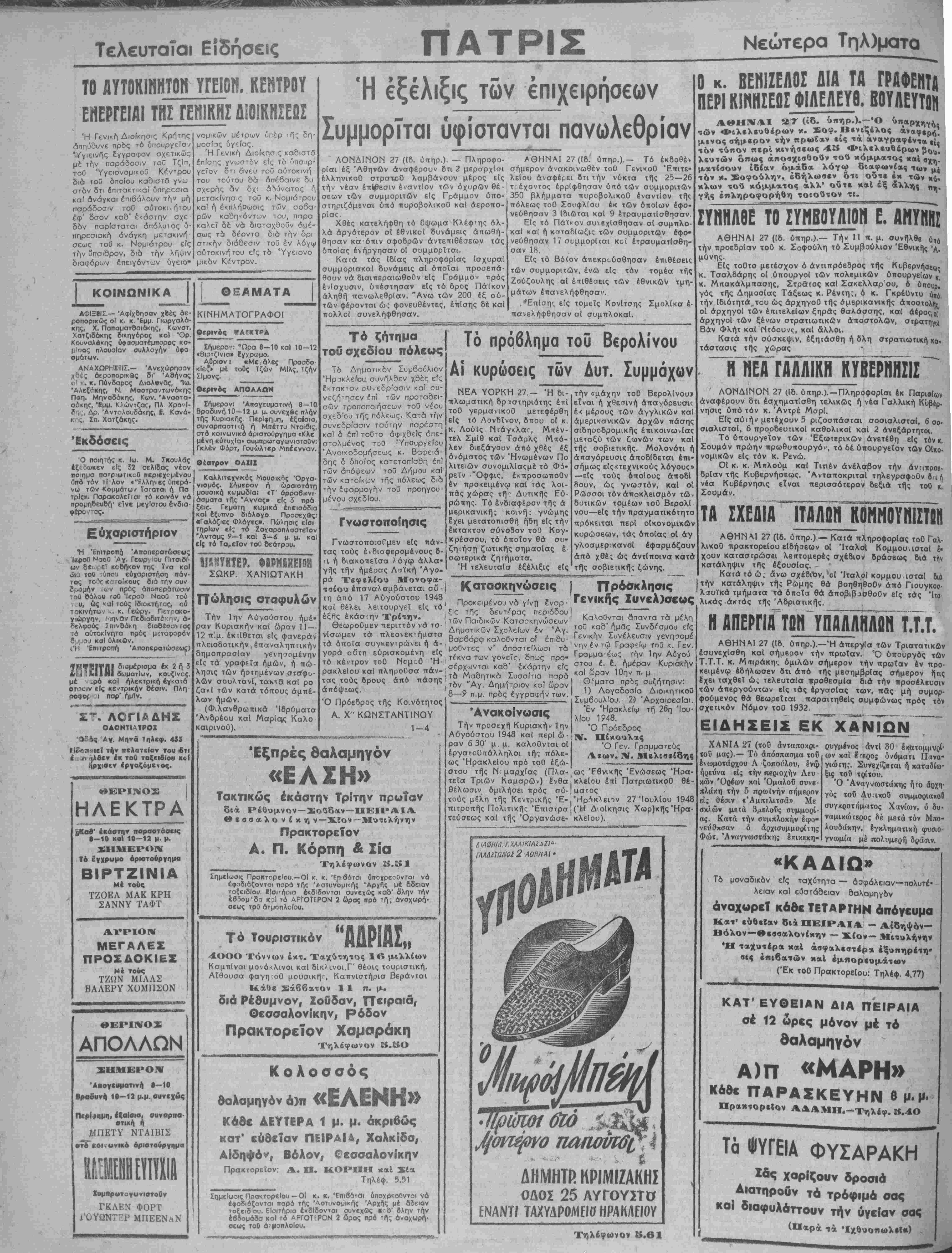 έ< μέρους των αγγλικών κα άμερικανικών άρχων πάσης σιδηοοδρομικής έπικοινωνίας μεταξύ των ζωνών των κα τής σοβιετικάς. Μολονότι ί απαγόρευσις άποδίδεται επι σήμως ε(ς«τεχνικούς λόγους» —είς τούς οποίους άποδί Βουν, ώς γνωστόν, καί οί Ρώσσοι τόν άποκλεισμόν τώ δυτικών τομέων τοθ ΒερολΙ νού—είς τήνπραγματικότητα πρόκειται περΐ οίκονομικώ κυρώσεων, τάς οποίας οί αγ γλοαμερικανοί έφαρμόζου άπό χθές ώς άντΐποινα κατά τής σοβιεπκής ζώνης. Νεώτερα Τηλ)ματα _______—^ιιιι^εΒΒΒΒΒε^ΜεΒ^επνιεΒΐει^ε^εΜενε^—§Βμμβ^^^η^^^^_^^____ ^^^^^^^^^^^^^^^^^^ββ^ρβ^ρ^εε^Ηε—εΒΒΐεΒΐεΒ^^^^^^^^^^^^^^^^^^^^^^^^^ .™~'—^^^^^^^^^^^^^^^^■^^ΠΒΠββπ^ειΗΒ^^^^^ Ο κ. ΒΕΝΙΖΕΛΟΣ ΔΙΑ ΤΑ ΓΡΑΦΕΝΤΑ ΠΕΡΙ ΚΙΝΗΣΕΩΣ Φ1ΛΕΛΕΥ8. ΒΟΥΛΕϊΤίΗ ΑΘΗΝΑΙ «^ (ίδ· υπηρ.).-Ό των Φιλελευθέρας κ. Σοφ.Βενιζέλος — ,Τ.Η μενος σήμερον την πρωίαν εις τα αναγραφέντα τόν τύπον περί κινήσεως 415 Φιλελευθέρων β( λευτών όπως άηοσχισθούν τού κομματος καί σχ». ματίσουν ιδίαν όμάδα λόγω δΐαφωνίας των μ, τόν κ. Σοφοόλην, εδήλωσεν ότι ουτε έκ των μ&· κλων τού κομματος *λλ' ουτε καί έξ άλλης „., γής έπληροφορήθη τοιούτον τι.___________ ΣΥΝΗΛΘΕ ΤθΊΥΜΒΟΥΑΙΟΗ Ε. ΑΜΥΗπΊ ΑΘΗΝΑΙ 27 ((δ. ύπηρ.).— Την 11 π. μ. συνήλθε ύηό την προεδρΐαν τοθ κ. Σοφούλη τό Συμβούλιον Έθνικής '/. μύνης. Είς τοθτο μετέσχον ό άναπρόεδρος τής Κυβέρνησις κ. Τσαλδάρης οί ύπουργοί των πολεμικών υπουργείων κ, κ. Μτιακάλμπασης, Στρατος καί Σακελλαρ'ου, 6 υπουρ· γός τής Δημοσίας Τάξεως κ. Ρέντη:, ό κ. Γκρέϋντυ υ»,) την ιδιότητος τού ώς άρχηγοθ τής όμβρικανικής αποστόλη οί άρχηγοΙ των επιτελείων ξηράς θαλάσσης, καί αέρος,ο( άρχηγοί των ξένων στρατιωτικών άποστολών, στρατηγοΐ Βάν Φλήτ καί ΓΗτόουνς, καί άλλθι. Κατά την σύσκεψιν, εξητάσθη ή δλη στρατιωτική κ.α, τάστασις τής χώρας Κατασκηνώσεις Προκειμένθυ νά γίνρ ?νσρ· ξιο τής δευτέρας περιόδου των Παιδικών Καταοκηνώσεων Δημοτικων Σχολείων έν Αγ. Βαρβάρρ καλοϋνται οί έπιδυ μθϋντες ν" αποστείλωσι τα τέκνα των γονεΐς, δπως προ¬ σέρχωνται καθ* έκόρτην είς τα Μαδητικά Συσσίτια παρά τδν "Αγ. Δημήτριον κοϊ ώραν 8—9 π.μ. πρδς έγγραψήν των. Ανακοίνωσις Την προσέχη Κυριακήν Ιην Αύγούστου 1948 καί περΐ ώ¬ ραν 6 30' μ μ καλοθνται οί έργατοϋτιάλληλοι τής πόλε¬ ως "Ηρακλείου πρό τοθ εξώ¬ στου τής Ν( μαρχίας (Πλα- τεΐα Τριών Καμάρων) ένθα θέλωσιν όμιλήσει πρός σύ- τούς μέλη τής Κεντρικής Έ- πιτροπής Πολιτικής 'Επιστρα τεύσεως καί τής Όργανώσε- Πρόσκλησις Γενίκης Ιυνελ)σε«ς ΚαΚοΰνται δπαντα τα μέλη τού καδ' ημάς ΣυνδεΌμου είς Γενικ?ιν Συνέλευσιν γενησομέ νην έν τώ Γραφείω τού κ. Γεν. Γραμμα-έως Τΐγν Ιην Αΰγού στου έ. 2. ημέραν Κυριακην καί ώραν 10ην π. μ Θ'ματα πρ^ς συζήτησιν: 1) ΛογοδοσΙα Διοικητικοΰ Συμβουλίου. 2·) Άρχαιοεσίαι Έν Ήρακλείψ τγ] 26η Ίου λίου 1948. Ό Πρόεδρος ; Ν. Πίκουλας Ό Γεν. Γραμματεύς Αεων. Ν. Μελισείδης ως 'Ρθνικής Ενώσεως Ήρα κλείου επί ΠατριωτικρΟ θέ- υατος Ηρακλειον 27 Ιουλίου 1948 (Ή Διοίκησις Χωρ)κη"ς'Ηρα κλεΐου). ΔΙΑΦΗΜ Ι ΧΑΛΙΚΙΑϋίΙ*· ΓΑΑάΠΩΝΟΙ 2 ΑΘΗΝΑΙ · βονιφνο ΔΗΜΗΤβ ΚΡΙΜΙΖΑΚΗΙ ΟΛΟΣ 25 ΑΥΓΟΥΙΤ» ΕΝΑΝΤΙ ΤΑΧΥΔΡΟΜΕΙΟ ΗΡΑΚΛΕΙΟΥ Τηλέφωνον 8.61 ΛΟΝΔΙΝΟΝ 27 (Ιδ. ύπηρ.).—Πληροφορίαι έκ Παριβίων άναφέρουν δτι εσχηματίσθη τελικώς ή νεα Γαλλική Κυβέρ¬ νησις υπό τόν κ. Άντρέ ΜσρΙ. Ε(ς αυτήν μετέχουν 5 ριζοσπάσται σοσιαλισταί, 6 σο¬ σιαλισταί, 6 προοδευτικοί καθολικοΐ καί 2 άνεξάρτητοι. Τό υπουργείον των Εξωτερικών ανετέθη είς τόνκ. Σούμαν πρώην πρωθυπουργόν, τό δέ υπουργείον τΔν Οικο¬ νομικήν είς τόν κ. Ρενώ. ΟΙ κ. κ. Μπλούμ καί Τιτιέν ανέλαβον την άνηττροε- δρΐαν τής Κυβερνήσεως. Ανταποκριταί τηλεγρσ