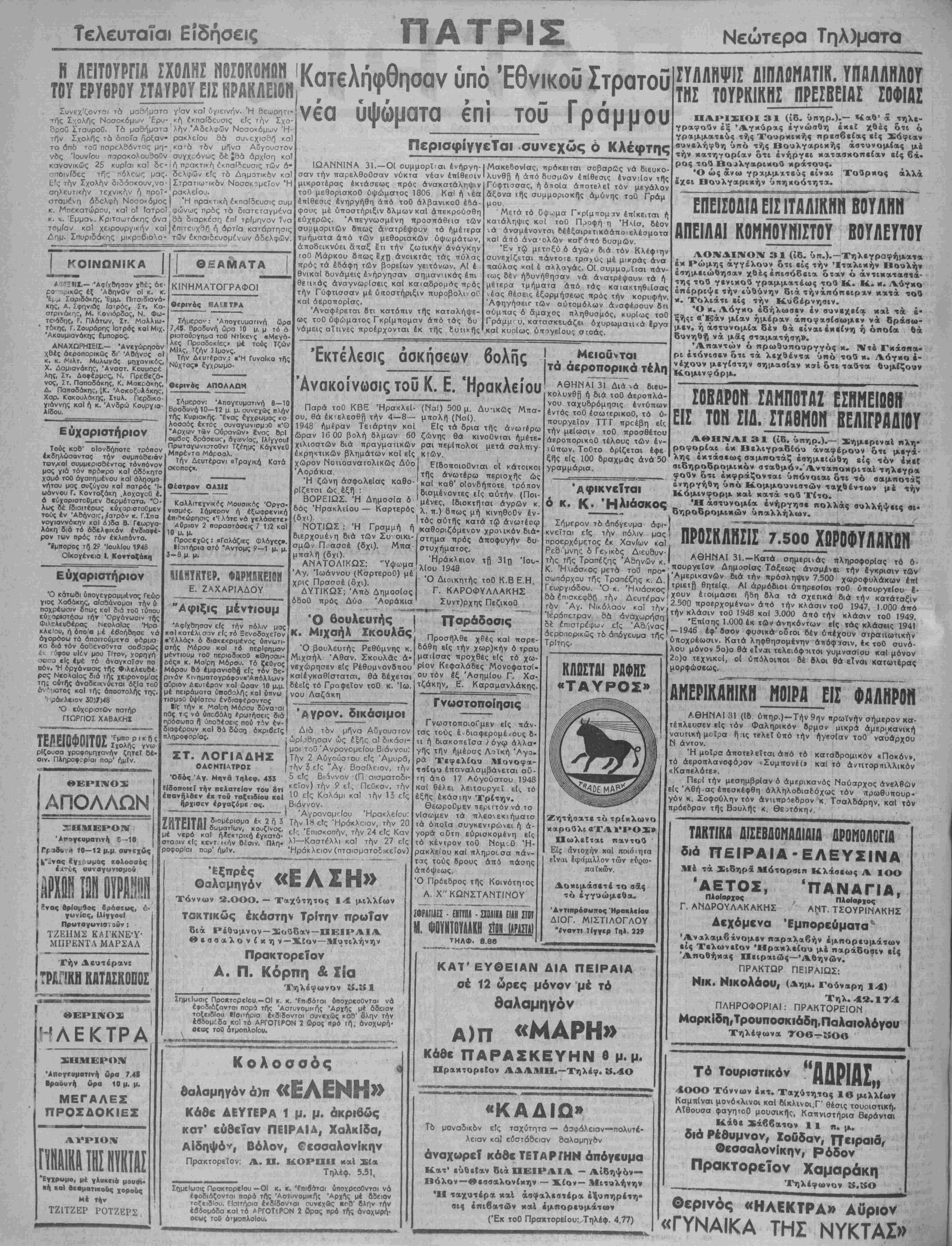 Κ. Ήιόσ<ος μετά τοθ προ- σωπόρχου τής Τραπέζης κ. Δ. Γεωργιάδου. Ό κ. Ήλΐάσκος θά έπισκεφδη τί)ν Δευτέραν τδν "Αγ. Νικόλαον καΐ την Ίερόπετραν δα όναχωρήσΓΐ δέ έπιστρέφων είς Αθήνας όεροπορικώς τδ άπόγευμα Τρίτης. Μ. ΦΟΥΝΤΟΥΛΑΚΗ ΣίθΝ ΤΗΛΦ. 8.86 ΓΥΛΛΗΨΙΣ ΔΙΠΛΟΜΑΤΙΚ. ΥΠΑΛΛΗΛΟί ΤΗΣ ΤΟΥΡΚΙΚΗΣ ΠΡΕΣΒΕΙΑΣ ΣΟΦΙΑΣ ΠΑΡΙΣΙΟΙ 31 (ίδ. ύπηρ.).— **αθ' α τηλε- γραφούν έξ Άγκυρας εγνώσθη έκεί χθές ότι ό γραμματεύς τής Τουρκεκής πρεσβείας είς Σοφίαν συνελήφθη υπό τής Βουλγαρικής αστυνομίας μέ την κατηγορίαν ότι ένήργει καταβκοπείαν είς βά- ρος τού Βο^λγαρικού κράτους. ( Ό ώς άνω γραμματεύς είναι Τούρκος αλλά έχβι Βουλγαρικήν ύηηκοοτητα. ΕΠΕ1Σ0ΔΙΑ ΕΙΣ ΙΤΑΛΙΚΗΗ ΒΟΥΑΗΪΓ ΑΠΕΙΛΑΙ ΚΟΜΜΟΥΗΙΣΤΟΥ ΒΟΥΛΕΥΤΟΥ ΛΟΝΔΙΝΟΝ 31 (ίδ. ύΐτ.).—Τηλεγραφήματα έκ Ρώμης άγγέλουν ότι είς την Ίταλικήν Βουλήν εσημειώθησαν χθέςέπισόδεια δταν ό άντικαταστά- της τού γενικού γραμματέως τού Κ. Κ. κ. Αύγκο έπέρριψε την ευθύνην διά τήνάηόπειρχν κατά τού κ. Τολιάτι είς την Κυβέρνησιν. Ό κ. Λόγκο εδήλωσεν έν αυνεχεία καί τα έ* ξής: «'Εάν μίαν ημέραν άποφασίβωμεν νά δράσω- μεν, ή άστυνομία δέν θά είναι έκείνη ή όποία θά δυνηθή νά μάς σταματήση». Απαντών ό πρωθυπουργγός κ. Ντέ Γκάσπα- ρι ετόνισεν ότι τα λεχθέντα υπό τού κ. Αόγκο έ- νέχουν μεγίστην σημασίαν κνί ότι ταύτα θυμίζουν Κομινφόρμ. ΣΟΒΑΡΟΝ ΣΑΜΠΟΤΑΖ ΕΣΗΜΕΙΩΘΗ ΕΙΣ ΤΟΝ ΣΙΛ. ΣΤΑ8ΜΟΗ ΒΕΛΙΓΡΑΔΙΟΥ ΑΘΗΝΑΙ 31 (ίδ. ύπηρ.).— Σημεριναί πλη¬ ροφορίαι εκ Βελιγραδίου άναφέρουν ότι μέγα· λης εκτάσεως σαμποτάζ εσημειώθη είς τόν έ κ εί σιδηροδρομικήν σταθμόν.Ανταποκριταί τηλεγρα φούν ότι έκφράζονται υπόνοιαι Οτι τό σαμποτάζ ένηργήθη υπό Κομμουνισταί ταχθέντων μέ την Κόμινφορμ καΐ χατά τού Τίτο. •Η άστυνομία ενήργησε πολλάς συλλήψεις «ι- δηροδρομικών ύπαλλήλων. ΚΠ1ΣΤΙΙΙ Ρ1ΦΗΣ «ΤΑΥΡΟϊ» Ζητήσατε τό τρίκλωνο καρούλι αΤΑΥΡΟΣΙ» Πωλείται παντού ' Είς άνιοχήν χαί ποιόιητα είναι Ιφάμιλλον των εύοω- παΐκών. Δοκιμάβετέ το σάς τό έγγυώμεθα. 'ΑντιπρόθΜΠος Ηρακλείου ΔΙΟΓ. ΜΙΣΤΙΛΟΓΛΟΥ "έναντι Κγγερ Τηλ. 229 ΠΡΟΣΚΛΗΣΙΣ 7.500 ΧΩΡΟΦΥΛΑΜΗ ΑΘΗΝΑΙ 31.— Κατά σημερινάς πληροφορίας τό 6· 'πουργεΐον Δημοσίας Τάξεως άναμ^νβι την έγκρισιν τΟν Ι Αμερικανόν διά την πρόσληψιν 7.500 χωροφυλάκων επί τριετ{) Θητείσ. ΑΙ άρμόβιοι ύτιηρεσίσι τοθ ύπουργεΐου 6- (χουν έτοιμάσει ήδη βλα τα σχετικά διά την κατάταξιν 2.500 προερχομένας άιό την κλάσιν τοθ 1947, 1.06Ό άπό την κλάσιν τοθ 1948 καΐ 3.000 άπό την κλάσιν τοθ 1949. 'ΕτιΙσης 1.000 έκ των ανηκόντων είς τάς κλάσβις 1941 —1946 έφ'Οσον φυσικά οδτοι βέν ύπίχουν στραΐΐωτικήν υποχρέωσιν. Καιά ληφθησομένην άπόφΐσιν, έκ τοθ συνό- λου μόνον 5ο)ο θά βΐναι τελειόφοιτοι γυμνασΐου καΐ μόνον 2ο)ο τεχνικοί, οί ύπόλοιποι δέ βλοι θά είναι κατωτέρας μορφώσβως. ΑΜΕΡΙΚΑΐίΚΗ ΜΟ1ΡΑ ΕΙΣΦΑΛΗΡΟιΊ ΑΘΗΝΑΙ 31 (16 ύπηρ.)—Την 9ην ττρωΐνήν σήμερον κα¬ τέπλευσεν είς ιόν Φαληρικόν βρμον μικρά άμερικανική ναυτική μοΐρα ήτις τβλεΐ υπό την Λγβσίαν τοθ ναύάρχθυ Ν άντον. Ή μοΐρα άποτελεΐτσι άπό τό καΓθβρομικόν «Ποκόν», τό άεροπλανοφόρον «Συμπονέί» καΐ τό άνπτορηιλλικόν «Καπελότε». ΠερΙ την μεσημβρίαν ό άμερικανός Ναόαρχος ανελθών είς "Αθήνας επεσκέφθη αλληλοδιαδόχως τόν πρωθυπουρ¬ γόν κ. Σοφούλην τόν άνηπρ-Ίεβρον κ. Τσαλδάρην, καΐ τόν πρόεδρον τής Βουλί)ς κ. θό ΚΑΤ'ΕΥΘΕΙΑΝ ΔΙΑ ΠΕΙΡΑΙΑ σέ 12 ώρες μόνον μέ τό θαλαμηγόν Α)π «ΜΑΡΗ» Κάθε ΠΑΡΑΣΚΕΥΗΝ β μ. μ* Πρακτορείον ΑΔΑΜΗ.—Τηλέφ* Η.4Ο «ΚΑΔΙΩ» Τδ μοναδικδν είς ταχύτητα — άαφάλειανττολυτέ- λειαν καΐ είστάδειαν δαλαμηγδν αναχωρεί κάδε ΤΕΤΑΡΤΗΝ άπόγευμα Κατ' ευθείαν δια ΠΕΙΡΑ