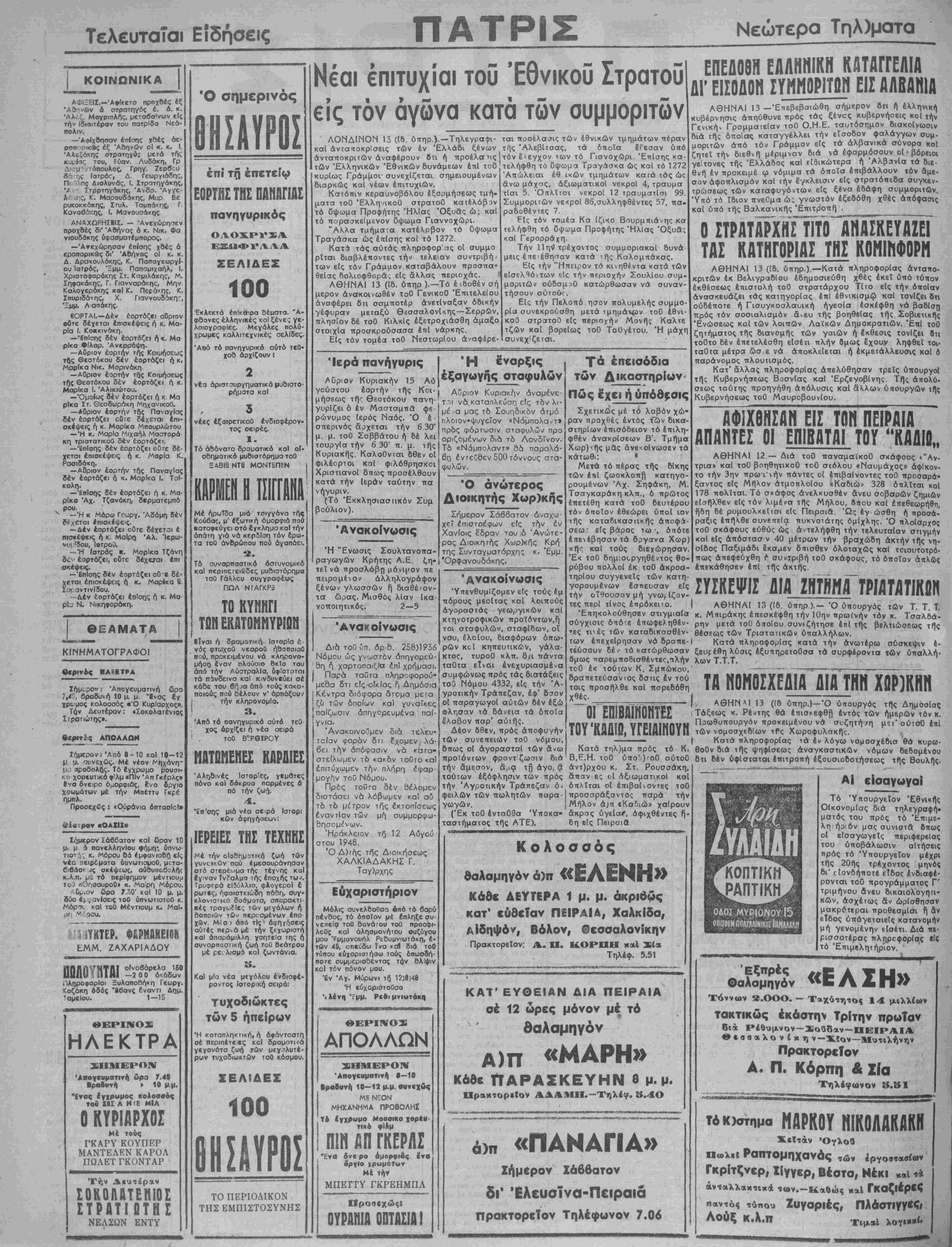 Προσεχώς : <Ουράνιο όπταοίο!» «ΟΑΧΙΖ» Σήμερον Σάββατον καΙ ώραν 10 μ. μ ό πονελληνΐου φήμη', ΰπνω- τιοπφ, κ. Μόρσυ θό εμφανισθή είς νέα πειρόματα ύπνωτιομοϋ, μ·:τα- 6·βάο' ίς σκέψεως, αύθυποθολής; κ.λ.π. μέ τό περίφημον μέντιουμ τοθ «ΘοοαυροΟ» κ. Μαίρη Μόρσυ. 'ϋμ.ον ωρα 7.30' καΙ 10 μ. μ. δύο ίμ,ςινΐοεις τοθ ύπνωτιοτοθ κ. Μάριι καί τοθ Μέντιουμ κ. Μαί- ρπ Μ' οσυ. ,ΤΗΤΕΡ. Φ&ΡΜΔΚΕΙΟΚ ΕΜΜ. ΖΑΧΑΡΙΑΔΟΥ Πληροφορίαι Ξυλαποβήκη Γεωργ. <οζάκη όδός "Ιβανς έναντι Δημ. ΤαμεΙου. 1—15 ΘΕΡΙΝΟΣ ΗΛΕΚΤΡΑ ΣΗΜΕΡΟΝ Απογευματιναί ΰρα 7.48 Βραδύνη » 10 μ.μ. "Ενός Ιγχρυμος κολοσβός τού ΙΙΣ Α ΝίΕ ΜΙΛ Ο ΚΥΡΙΑΡΧΟΣ Μέ τοΰς ΓΚΑΡΥ ΚΟΥΠΕΡ ΜΑΝΤΕΛΕΝ ΚΑΡΟΛ ΠΩΛΕΤ ΓΚΟΝΤΑΡ Την Δευτέραν ΐοκοηατΕΝΐθΣ ΣΤΡΑΤΙΟΤΗΣ ΝΕΛΣΩΝ ΕΝΤΥ Ό αημερινός ΒΗΣΑΥΡΟΣ επί τη έπετείω ΕΟΡΤΗΣ ΤΗΣ ΠΑΝΑΓΙΑΣ πανηγυρικός ΟΑΟΧΡΥΣΑ Ε&ΩΦΥΛΛΑ ΣΕΛΙΔΕΣ 100 Έκλεκτά έπΐκσ,ιρα θέματα. "Α- φθονες έλληνικές καΙ ξένες γε- λοιογραψΐες. Μεγάλες πολό- χρωμες καλλιτεχνικές σελΐδες Άπά τό πανηγυρικό αύτό τεθ« χοθ άρχΐζουν: νέα άριστ συργηματικά μυβιστο ρήματα καί νέες έξαιρετικοθ ένδιοφέρον τος σειρές. 1. Τα ά&άνατο δραματικό καΙ οί σδημοτικό μυ&ιστόρημα τοθ ΞΑΒΙΒ ΝΤΒ ΜΟΝΤ6ΠΕΝ Β Μέ ήρωΤδα μιά τσιγγάνα τής Κοϋβας, μ' έξωτική όμορφιά πού καταφεύνει οτό ίγκλημο καΙ την άπάτη γιά νά κερδίση τάν Ερω- τα τοθ άνσρώπου πού άγαπόει. Τα ουναρπαστικό άστυνομικό καΙ περιηετειαδες μυθιστόρημα τοθ Γάλλου ουγγραψέως ΠΩΛ ΝΓΑΓΚΡ3 ΤΟ ΚΥΝΗΓΙ ( ΤΩΗΕΚΑΤΟΜΝΥΡΙΩΝ ϊΐναι ή δραματκή ΙοτορΙα ε¬ νός φτωχοθ νεαροθ ήαοποιοθ πού, προκειμένου νά κληρονο- μήσο £ναν πλούσιο θκΐο τού άπό την Αύστραλία, υφίσταται τα πανδεινα καΙ κινδυνεύει σέ κόθε τού βηοα άπό τούς κακο- ποιοΰς πού σέλουν ν* άρπάξουν την κληρονομΐα. ! 3. Άπό τό πανηγυρικό αύτό τεθ· χος άρχΐζει ή νέα σειρά τοθ ΒΓΡ©!ΡΟΥ ΗΑΤΩΗΕΝΕΣ ΚΟΡΔΙΕΣ Άλησινές ίστορίες, γεμβτες πόνο καί δόκρυα ηαρμένες ό πό την ζωή. Λ.. Έπ'οης μιά νέα σβιρά Ιστορι κων άφηγήαεων: ΙΕΡΕΙΕΣ ΤΗΣ ΤΕΧΝΗΣ Μέ την οΙοδημ3τι<ή ζωή Των γυνοκων ποϋ ίμεσουράνηοαν στό οτερέι.ιμα τής τέχνης κο) βγιναν Τνίαλμα τής έποχής των. ΤρυψΓρά εϋύλλισ, φλογεροΙ & ρωτες, ήφαιοτειώδη πάθη, ουγ- κλονισ'κό δοόματσ, σπορακτι- κες τρογο:ίΙες των μεγάλων ή θοποιών των περοσμένων έπο χών. Μίοι άπό τίς άφηγήσεις αϋτέζ περ.Ο μέ την ξεχωριστή καΙ άπαράμιλλη γοητεΐα της ή συνορπασπκή ζωή τού θεάτρου μέ ρε-, λιομό κοΙ ζωντάνια. ΚαΙ μΐσ νέα μεγάλου ένδιθφέ- ροντος Ιοτορική σειρά; τυχοδιώκτες των 5 ήπεΐρων Ή κοταπλη<τικΓ|, ή άφάντοστη σέ περιπέτίΐες κοί δραματκά γεγονάτα ζωή των μεγολυτέ· ρων τυχοδιωκτών τοθ κόσμου. ΣΕΛΙΔΕΣ 100 ΒΗΣΑΥΡΟΣ ΤΟ ΠΕΡΙΟΔΙΚΟΝ ΤΗΣ ΕΜΠΙΣΤΟΣΥΝΗΣ Νέαι έπιτυχίαι τού Έθνικοΰ Στρατοϋ είς τόν άγδνα κατά τδν συμμοριτόν ΛΟΝΔΙΝΟΝ 13 (Ιδ. ύπηρ.).—Τηλεγραφι¬ καί άντατιοκρίσεις των έν "Ελλάδι ξένων άνταποκριτών άναφέρουν βτι ή προέλα τις των Ελληνικόν Έθνικών δυνάμεων επί τοθ κυρΐως Γράμμοι1 συνεχΐζεται σημειουμένων διαρκώς καί νέων έπιτυχιών. Κατόπιν κεραυνοβόλου έξορμήσεως τμή- ματα τοθ Έλληνικοό στρατοθ κατέλαβον τό Οψωμα Προφήτης Ηλίας Όξυάς ώ; καί τα πζφασκεΐμενον Οψωμα Γιαννοχώρι. "Αλλα τμήματα κατέλαβον τό ϋψωμα Τραγάσκα ώς έπίσης καΐ τό 1272. ΚατΛ τάς αύτάς πληροφορ'ας οί συμμο ρΐται διαβλέποντες την τελείαν συντριβή' των είς τόν Γράμμον καταβάλουν προσπα¬ θείας δολιοφθορα, είς άλλας περιοχάς. ι ΑΘΗΝΑΙ 13 (ίδ. ύπηρ).—Τόέίβοθένσή μερον ανακοινωθέν τοθ ΓενικοΟ ΈπιτελεΙου άναφέρει δτι σσμποτέρ άνετΐναξαν όδικήν γέφυραν μεταξύ Θεσσαλονίκης—Σερρών, πλησίον δέ τοθ Κιλκίς έξετροχιάσθη 