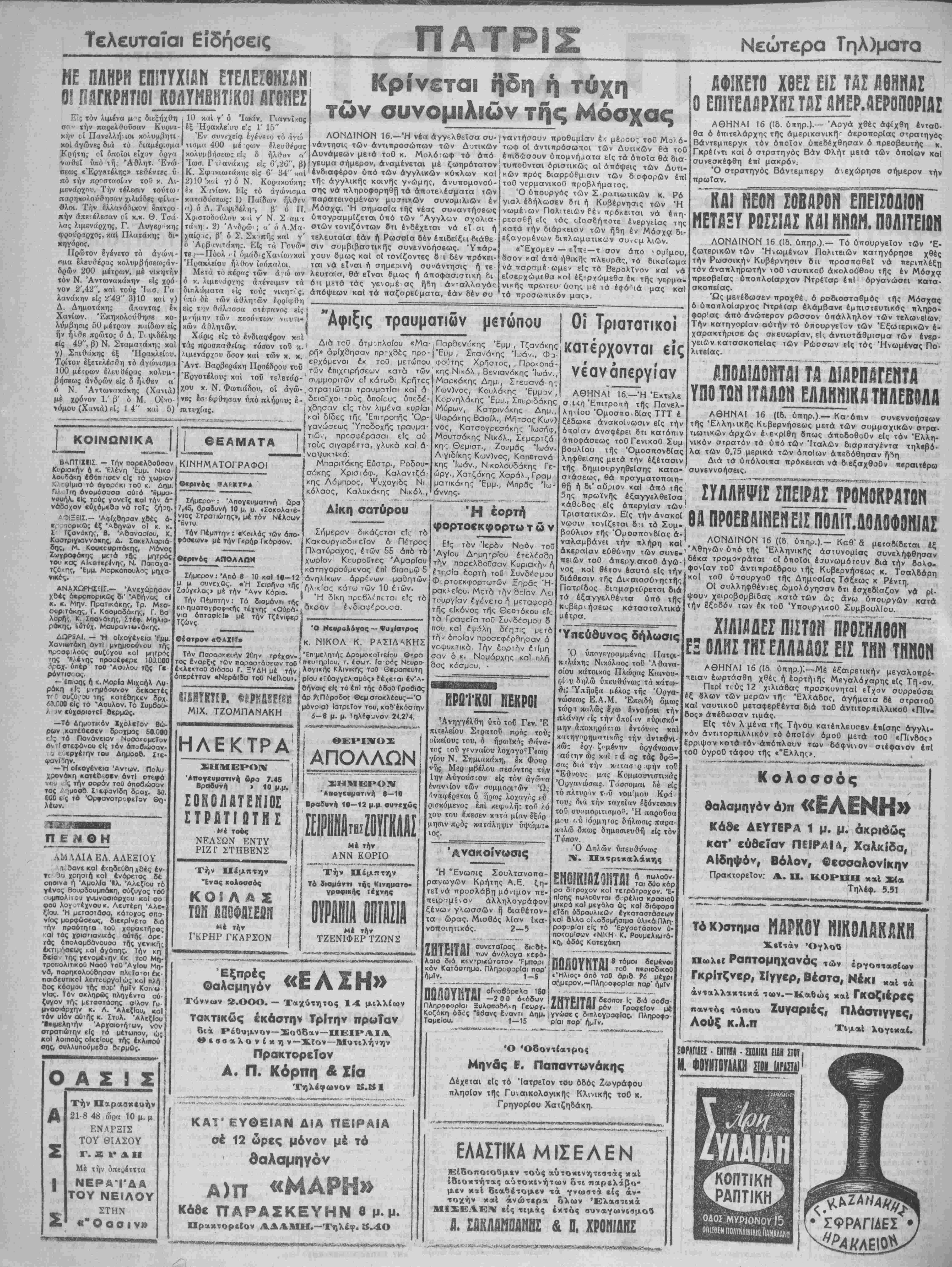 σ ι<η Έττιτροπή τής Πανελ- ληίου Όμοσπο δΐας ΤΤΤ έ ξέδωκε ανακοίνωσιν είς την όπο'αν άναφέρει ότι κατόπιν αποφάσεως τοθ ΓενικοΟ Συμ βουλίου τής Όμοσπονδίας ληφθείσης μετά την εξέτασιν τής δημιουργηθείσης κατα¬ στάσεως, θά ττρσγματοποιη- θ|) ή δι* οΰριον καί άπό τής 5ης πρωϊνής έξαγγελθεΐσα κάθοδος είς απεργίαν των Τριατατικών. Είς την όνακοί νωοιν τονίζεται 8ί τό Συμ¬ βούλιον τής Όμοσπονδίας ά- ναλαμβάνΕΐ την πλήρη καί ακεραίαν ευθύνην των συνε- πειών τοθ άτιεργ.ακοΡ αγώ¬ νος κοί θέτον έαυτό είς τή· διάθεσιν τής Δικαιοσύνην») Πατρίδος 6ημσρτύρετσι διά τα έξαγγελθέντα υπό τί) κυβερνήσεως κοταστολτικά μέτρα. ΑΦΙΚΕΤΟ ΧΘΕΣ ΕΙΣ ΤΑΣ ΑΘΗΝΑΣ Ο ΕΠΙΤΕΛ/ίΡΧΒΣ ΤΑΣ 4ΜΕΡ.ΑΕΡ0Π0ΡΙΑΣ ΑΘΗΝΑΙ 16 (ίδ. ύπηρ.).— Άργά χθές άφΐχθη έντσθ- θα ό έπιτελάρχης τής άμερικανική- άεροπορΐας στραΐηγός Βάντεμπεργκ τόν οποίον ύπεδέχθησαν ό πρεσβευτής κ. Γκρέίντι καί ό στρατηνός Βάν Φλήτ μετά των οποίων καί συνεσκέφθη επί μακρόν. Ό στρατηγδς Βάντεμπβργ ανεχώρησε σήμερον την ■ηραΧαν.____________________ "1¥ΝΕ¥1θΒίΡΟΝ ΕΠΕΙΣΟΔΙΟΝ ΜΕΤΑΞΪ ΡΡΣΣ1ΑΣ ΚΑΙ ΗΝΟΗ. ΠΟΑΙΤΕΙ.Η ΛΟΝΔΙΝΟΝ 16 (Ιδ. ύπηρ.).— Τό υπουργείον των Ε¬ ξωτερικών των Ηνωμένον Πολιτειών κατηγορήση χθές την Ρωσσικήν Κυβέρνησιν 8 α τιροσπσθεΐ νά περιπλέξτι τόν άναπληρωτήν τοθ ναυτικοθ άκολοόθου τής έν Μόσχα πρεσβείας ύποπλοΐσρχον Ντρέΐσρ έτιΐ όργανώσει κατα- σκοπεΐας. Ώς μενέδωσεν προχθέ^ ό ρσδιοσταβμός τής Μόσχας ό ύποπλοίαρχος Γιτρέίαρ ελάμβανε εμπιστευτικάς πληρο¬ φορίας άπό ανώτερον ρώσσον ύπάλληλον των τελωνεΐων. Την κατηγορίαν αυτήν τό υπουργείον των Εξωτερικών έ- χαρακτήρισε ώς σκευωρίαν, είς άντιστάθμισμα των ένερ- γειίν κατασκοπείας ιών Ρώσσων είς τάς Ηνωμένας Πό- λιτεΐας. Ύπεύθυνος δήλωσις Ό ύπογργρομμένος Πατρι χτλάκης Νικόλαος τοθ Άθανο σίου κάτοικος Πλώρας Καινου- ^ί >ν δηλώ ΰπευθύνως τα κάτω¬