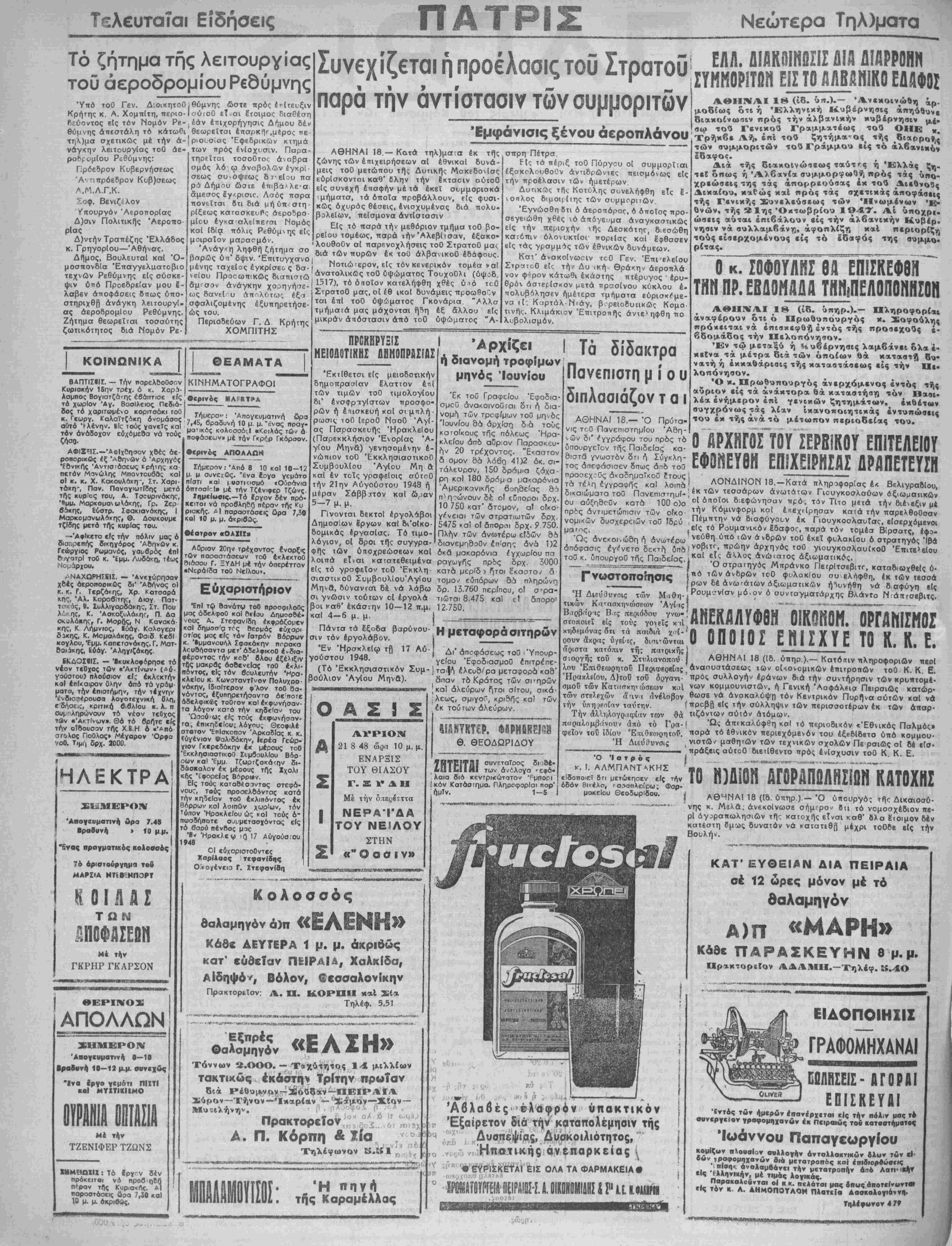 ήν 20 τρέχοντος. "Ε<αστον 5 ομον θά λόβΓ) 41)2 όκ. σι- τάλευρον, 150 δράμια ζόχα· ρη καΙ 180 δρόμ α μακαρόνια ΆμερικανικΡίς 6οη8ε'ας δίΐ πνη^ώνουν δέ οί εθποροι δρχ. 10 750 κατ' δτομον, α! οίκο- γ/νειαι των στρατιωτών δρχ. 5475 καί ο? δπορΛΐ δρχ. 9 750. Πλήν των ανωτέρω είδών 86 διανεμηθούν έπΓσης άνά 1)2 όκδ μακαρόνια εγχωρΐου πά ραγωγη*ς πρός δρχ. 3000 κατά μερ'δ ι Γ]τοι εκαστο/ δ σιαστιχοθ ΣυμβουλίουΆγΙου τομο-' εθπόρων δύ πληρώνΓΐ Μηνα, δύνανίαχ δέ νά λόβω δρ. 13.760 περίπου, οί σφα- σι γνώσιν τούτων οί έργολά βοι καθ" εκάστην 10—12 π.μ, κα( 4—6 μ. μ. Πάντα τα έξοδα βαρύνου¬ σιν τόν εργολάβον. Έν "Ηρακλείω τβ 17 Αύ- γούστου 1948. (Τό 'Εκκλησιαστικόν Συμ¬ βούλιον Άγίου Μηνά). τιώται 8.475 12.750. καί δποροΐ Ο Α Σ Ι Σ ΑΥΡΙΟΝ Α 21 8 48 ώρα 10 μ. μ. ΕΝΑΡΞΙΣ ΤΟΥ ΘΙΑΣΟΥ Σ Γ. Ξ Υ Δ Η Με την ό.ιειοέΐττα ι ΝΕΡΑΤΔΑ ι ΤΟΥ ΝΕΙΛΟΥ ΣΤΗΝ Σ «"Ο α σ ι ν» Η μεταφοράσιτηρδν Δι" αποφάσεως τού ι'Υπουρ- γείου Έφοδιασμοΰ έπιτρέπε- ^ ται|("ΐ ίλευδί'ρα μεταφορά κασ' δπα<^ τό Κράτος των σΐ'ηρών Ι καί αλεύρων γ*|τοι σΐτου, σικά- .λεως, σμιγο", κριδής κα! των έκ τούτων αλεύρων. θ. ΘΕΟΔΩΡΙΔΟΥ ΖΒΤΕΙΤΑΙ συνεταίρος δι ιθί- των ά/4λογα >·εφά·