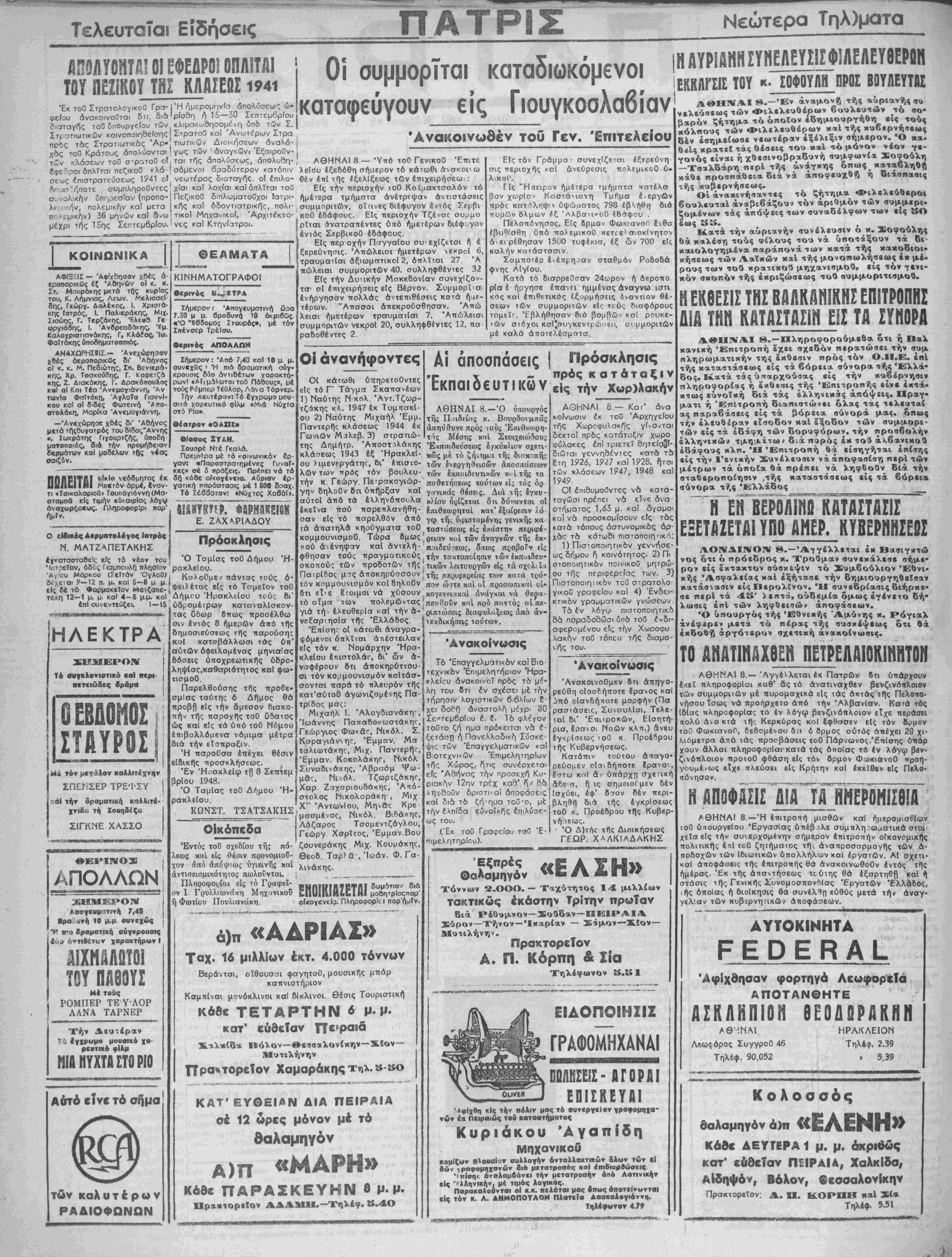 ΑΘΗΝΑΙ 8.— Αγγέλλεται έκ Πατρων