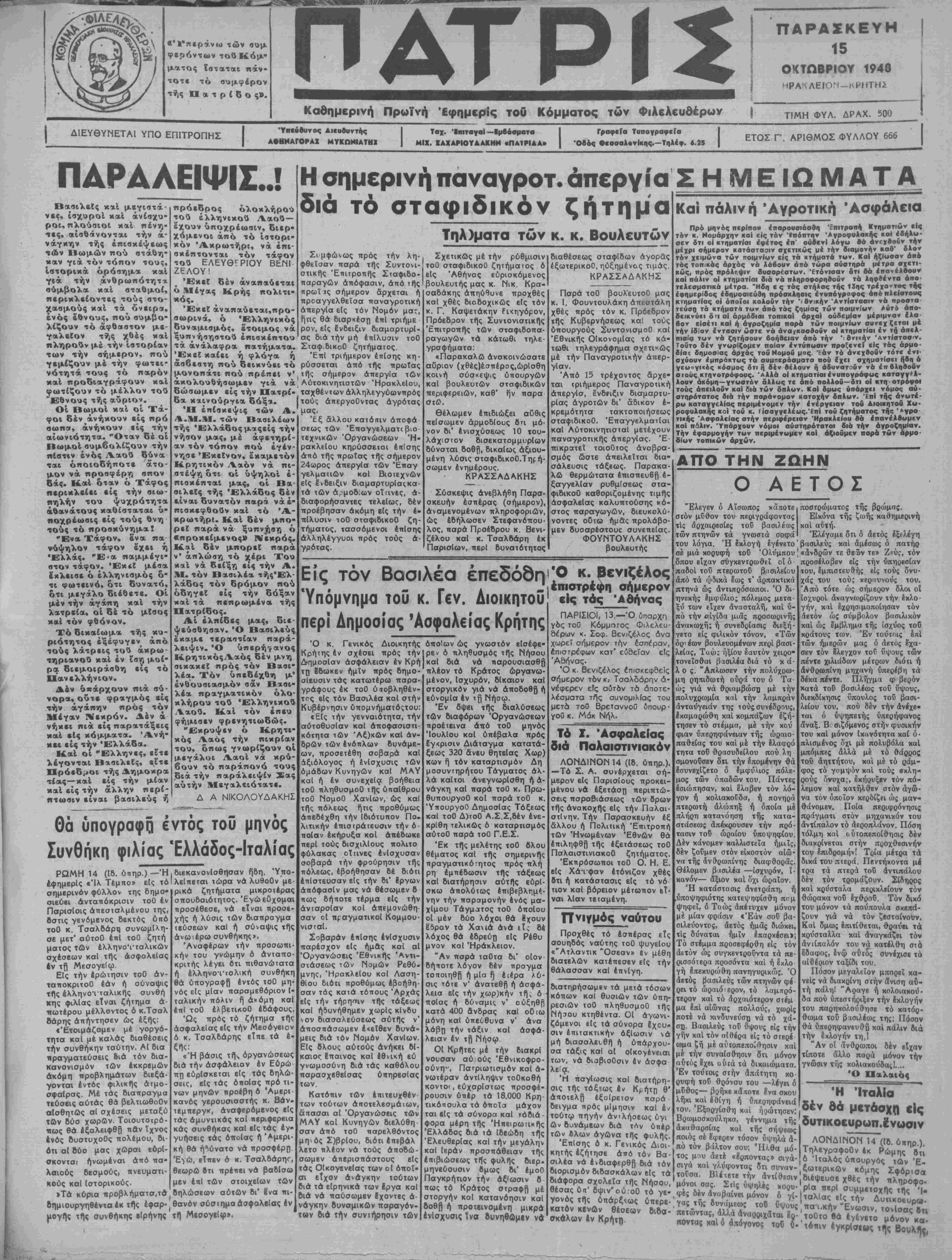 Ελλάς. ·Έ<α παμμίγι- ατον τάφον. Έκεΐ μέσα έκλεισε ό έλληνισμός ό¬ τι φωτεινό, ότι δυνατό, ότι μεγάλο διέθετε. Οί μέν την άγάπη καί την λατρεία, οί δέ τό μΐσος καί τόν φθόνον. Τό δικαίωμα τής κυ- ριότητος έξέφυγεν άπό τούς λάτρεις τού άκρω- τηριανοΰ καί έν ΐση μοί- ρα διεμοιράαθη είς τό Πανελλήνιον. Δέν ύπάρχουν πιά σύ- νορα, ούτε φραγμός είς την αγάπην πρός τόν Μέγαν Νεκρόν. Δέν ά νήκει πιά είς παρατάξεις καί είς κόμματα. Άνή- κ εί είς την Έλλάδα. Κ αί οί Έλληνες, είτε λέγονταΐ Βασιλείς, είτε Ηρόεδροι τής Δημοκρα τίας—καί είς την μίαν καί είς την άλλην περί¬ πτωσιν είναι βασιλεύς ή πρόεδρος ολοκλήρου τού έλληνικού Λαού— έχουν υποχρέωσιν, διερ- χόμενοι άπό τό Ιστορι¬ κόν Άκρωτήρι, νά έπι- σκέπτονται τόν τάφον τού ΕΛΕΥΘΕΡΙΟΥ ΒΕίΝΙ ΖΕΛΟΥ! , Έκεΐ δέν άναπαύεται ο Μέγας Κρής πολιτι¬ κάς. Έκ εί άναπαύεται,προ- σωρινά, ό Έλληνικός δυναμισμός, ετοιμος να ξυπνήοηατού έπιοκέπτου τα άνάλαφρα πατήματα. Έκ εί καίει ή φλόγα ή άαβεστη πού δεικνύει τό μονοπάτι πού πρέπεΐ ν' ακολουθήσωμεν γιά νά δώσωμεν είς την Πατρί- δα καινούργια δόξα. Ή επίσκεψις των Λ, Α.ΛΙ.ΛΙ. των Βασιλέων τής Ελλάδος μαςείς την νήσον μας, μέ αφετηρί¬ αν τόν τόπον πού έγέν νησε Εκείνον, έκαμετόν Κρητικόν Λαόν νά πι- ατέψη ότι οί ύψηλοΐ ε¬ πισκέπται, μας, οί Βα¬ σιλείς τής Ελλάδος Βέν είναι δυνατόν παρά νάέ πισκεφθούν καί τό Ά- κρωτήρΐ. Καί δέν μπο- ρεΐ παρά νά ξυπνήση ό απροκείμενος» Νεκρός. Κ αί δέν μπορεΐ παρά ν' άπλώαη τό χέρι Τού καί νά δείξη είς την Α. Μ. τόν Βασιλέα τής'Έλ λάδος τόν δρόμον πού όδηγεί είς την δόξαν καί τα πεπρωμένα τής Πατρίδος. Αί έλπίδες μας, διε ψεύαθησαν. Ό Βασιλεύς έκαμε τεραστίαν παρά¬ λειψιν. Ό ύπερήγανος ΚρητικόςΛαός δέν μνη σικακεϊ πρός τόν Βασΐ' λέα. Τόν υπεδείχθη μ ενθουσιασμόν σάν Βασι¬ λέα πραγματικόν όλο κλήρου τού Έλληνικού Λαού. Καί τόν έηευ φήμισεν φρενητιωδώς. "Εκρυψεν ό Κρητι κός Λαός την πικρίαν τού, όπως γνωρίζουν οί μεγάλοι Λαοί νά κρύ- βουν τό παράπονό τους .διά την παράλειψιν Σας αυτήν Μεγαλειότατε, Δ Α ΝΙΚΟΛΟΥΔΑΚΗ! Η σημερινή παναγροτ. άπεργία Σ Η Μ ΕΙΩΜΑΤΑ διά τό σταφιδικον ζήτημα Τηλ)ματα των κ. κ. Βουλευτών Σιμφώνως πρός την λη¬ φθείσαν παρά τής Συντονι- στικής Έπιτροπής Σταφιδο- πσραγών απόφασιν, άπό τής ττρωΐΐς σήμερον άρχεται ή προαγγελθείσα παναγροτική άπεργία είς τόν Νομόν μαί, ήτις θά διαρκέση, επί τριήμε ρον, είς Ενδειξιν διαμαρτυρί¬ ας διά την μή επίλυσιν τοθ Στσφ.ΒικοΟ ζητήματος. Επί τριήμερον έτιΐσης κη- ρύσσεται άπό τής πρωΐας (τής σήμερον άπεργία των Αύτοκινητιστών Ηρακλείου, ταχθέντων άλληλεγγύωνπρός ι τούς άπεργοθντας αγρότας μας. Έξ άλλου κατόπιν άποφά οεως των Έπαγγελματτβιο τεχνικών Όργανώσεων Η¬ ρακλείου κηρύσοεται έπΐσης άπό τής πρωΐας τής σήμερον 24ωρος άπεργία των 'Επαγ γελματιων κοί Βιοτεχνών είς ένδειξιν διαμαρτυρίαςκα- τα των αρμοδίων οΐτινες, ά- διαφορήσαντες τελείως, δέν προέβησαν άκόμη είς την ε¬ πίλυσιν τοθ σταφιδικοθ ζη¬ τήματος, τασσόμενοι έπίσης άλληλέγγυοι πρός τούς α¬ γρότας. 0ά υπογραφή εντός τού μηνός Συνθήκη φιλίας Έλλάδος-Ιταλίας ΡΩΜΗ 14 (18. ύπηρ.)--<Η εφημερίς «Ίλ Τέμπο» είς τό σημερινόν φύλλον της δημο- σιεύβι άντατιόκρισιν τοθ έν Παρισίοις άπεσταλμένου της, Οστις γενόμενος δεκτός υπό τοθ κ. Τσαλβάρτι συνωμίλη- σε μετ' αότοθ επί τοθ ζητή ματος των έλληνο'ι'ταλικών σχέσεων καί τής ασφαλείας έν τί) Μεσογείω. Είς την ερώτησιν τοθ άν- ταποκριτοθ εάν ή συναψις τής έλληνονταλικής συνθή κης φιλίας είναι ζήτημα ά- πωτέρου μέλλοντ