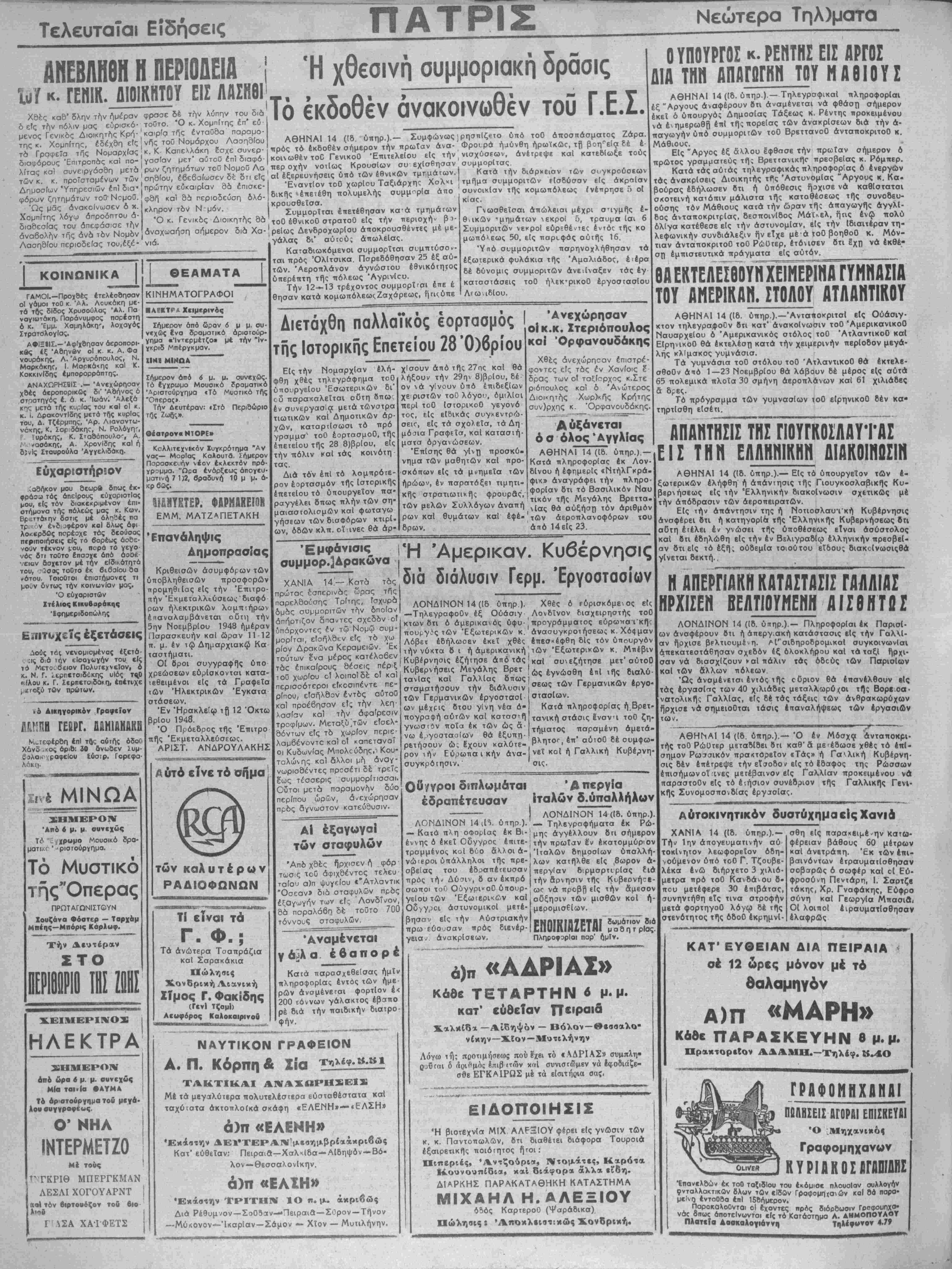 τΑγ ίπικαιοουο θέσεις πέριξ < ν..ο... μ----- μ-αϊ— -— ι ΛΟΝΔΙΝΟΝ 14 (ίδ ύπηρ). Χθές ό ευρισκόμενος είς —-Τηλεγραφοθν έξ Ούάσιγ Λονδίνον διαχειρηστής τοθ κτων βτι ό άμερικανός ύφυ-' προγρόμματος εύρω■ιτα·ι■κή■^ πουργίς των Εξωτερικών κ. ανασυγκροτήσεως κ. Χότΐμαν Λόβετ εδήλωσεν έκιΐ χθές επεσκέφθη δΐς τόν υπουργόν Ι την νύκτα δ ι ή άμερικανική |ιών "Εξωτερικών κ. Μέβ τας τού χωρίου οί λοιποί δέ οί καΐ περισσότεροι είκοσιπέντε πε- ρΐπου, είσήλσον έντδς αυτού και προέβησαν είς την λεη¬ λασίαν καΐ την άφα'ρεσιν τροφΐμων. Μεταξϋ,τών είσελ- δόντων είς τδ χωρίον περιε- λαμβένοντο καΐ οί καπεταναΐ οί ΚυδωνΙας Μπολούδης, Κου- ταλώνης καΐ δλλοι μη άναγ- νωρισθέντες προσέτι δέ τρείς ε"ως τέσσερις συμμορΐτισσαι. Ούτοι μετώ παραμονήν δύο περίπου ώρων, όν/εχώρησαν πρδς δγνωστον κατεύθυσιν. ^,, Κυβερνήσεις Μεγάλης Βρετ τανίας καί Γαλλίας 8πως σταματήσουν την διάλυσιν των Γερμανικών έργοσταοί ών μέχρις ότου γίνη νέα ά- πογρσφή αυτών καΐ κστσθ'ή γνωστόν ποία έκ των ώς ά- νω έργοστααΐων Θά έξυπη- ΑΙ έξαγωγαΙ των σταφυλών 'Απδ χδές ήρχισεν ι*| φόρ τωσις τοθ αφιχθέντος τελευ ταΐο^ α)π ψυγεΐου «'Ατλαντικ Όσεαν» δι6 σταφυλών πρδς έζθγωγήν των είς Λονδίνον, δα πσραλάβΓν δέ τουτο 700 τόννουζ σταφυλών. 'Αναμένεται γ &λ α. έ 6 α π ο ρ έ Κατά τιαροσχεθείσας ημίν πληροφορίας έντός των ημε¬ ρών άνομένεται φορτΐον έ< 200 τόννων γάλακτος έβατιο ρέ διά την παιδικήν διατρο¬ φήν. ΝΑΥΤΙΚΟΝ ΓΡΑΦΕΙΟΝ Α. Π. Κόρπη Λ Σία _^'» ΤΑΚΤΙΚΑΙ ΑΝΑ_«Ι*ΗΣΚΙ- Μί τα μβγαλότερα τιολυτελέστβοα εύστσθέστατα καΐ ταχΟΓατα άκτοηλοίκά σκάφη «ΕΛΕΝΗ»—·*ΕΛΣΗ» ά)π «ΕΛΕΝΗ» «Εκάστην ΑΕνΤΕΡΑΝ'μεσημβρίαάκριθώς Κατ' ευθείαν: ΠειραιΛ—Χαλ-,Ιδα—Αίδηψόν — Βό¬ λον— θεσσαλονίκην. ά)π «ΕΛΙΗ» Έκαστην ΤΡΙΤΗΝ 1Ο π. μ. ακριβώς Διά Ρέθυμ ,/ον—Σο093ν—*Ίειραιά—Σΰρον — Τήνον —Μύκονον—ΊκαρΙαν—Σάμον — Χΐον — Μυτιλήνην. ώς εγνώσθη επί τής Βιαλύ σεως των Γερμανικών έργο- στασΐων. Κατά πληροφορίας ή Βρετ- τανική στάσις ένσνι τοθ ζή- τήματος παραμένη άμετά» Ο ΥΠΟΥΡΓΟΣ κ. ΡΕΝΤΗΣ ΕΙΣ ΔΡΓΟΣ ΔΙΑ ΤΗΝ ΑΠΑΓΟΓΗΠ ΤΟΫ Η Α ΟΪΟΥΣ ΑΘΗΝΑΙ 14 (ίδ. ύπηρ).— Τηλεγραφικαί πληροφορίαι έξ Άργους άναφέρουν 8τι άναμένεται νά φθάση σήμερον έκεϊ ό ύπουργός Δημοσίας Τάξεως κ. Ρέντης προκειμένου νά έημερωθ{| επί τής πορεΐας των άνακρΐσεων διά την ά- παγωγήν υπό συμμοριτών τοθ ΒρεττανοΟ άντσποκριτοθ κ. Μάθιους. Είς "Αργος έξ άλ-λου έφθασε την πρωΐαν σήμερον δ πρώτος γραμματεύς τή; Βρεττανικήο πρεσβείας κ. Ρομπέρ. Κατά τάς αύτάς τηλεγραφικάς πληροφορίας ό ένεργών τάς άνακρΐσεις Διοικητής τί»ς ΆστυνομΙας "Αργους κ. Κα· βούρας εδήλωσεν βτι ή υπόθεσις ήοχισε νά καθΐσταται σκοτεινή καιόπιν μάλιστα τής κατοθέσεως τής συνοδευ- ούσης τόν Μάθιους κατά την ώραν τής άπαγωγής άγγλΐ- Βος άνταποκριτρΐας, δεσποινίδος Μάΐνελ, ήτις 6νώ πολύ ολίγα κατέθεσε είς την αστυνομίαν, είς την Ιδιαιτέραν τη- λεφωνικήν συνδιάλεξιν ήν εΐχβ μέά τοθ βοηθοθ κ. Μόν- τιαν άντατιοκριτοθ τοθ Ρώυτερ, ετόνισεν 6τι έχη νά εκθέ¬ ση έμπιστευτικά πράγματα είς αυτόν. ΘΑ ΕΚΤΕΛΕΙΘΟΥΝ ΧΕΙΜΕΡΤΝΑΓΥΜΝΑΣΪΑ ΤΟΥ ΑΜΕΡ1ΚΑΗ. ΣΤΟΛΟΥ ΑΤΛΑΝΤΙΚΟΥ ΑΘΗΝΑΙ 14 (Ιδ. ύπηρ.).—Ανταποκριταί, είς Ούάσιγ· κτον τηλεγραφοθν Οτι κατ' ανακοίνωσιν τοθ ΆμερικανικοΟ ΝαυαρχεΙου ό Άμερικανικός στόλος τοθ ΆτλαντικοΟ καί ΕΙρηνΐκοΟ θά εκτελέση κατά την χειμερινήν περίοδον μεγά¬ λης κλΓμακος γυμνάσισ. Τα γυμνάσια τοθ στόλου τοθ ΆτλαντικοΟ θά έκτελβ- σθοθν άιό 1—23 Νοεμβριού θά λάβουν δέ μέρος εΐ,ς αύτά 65 πολεμικά πλοΐα 30 σμήνη άεροπλάνων καΐ 61 χιλιόδες