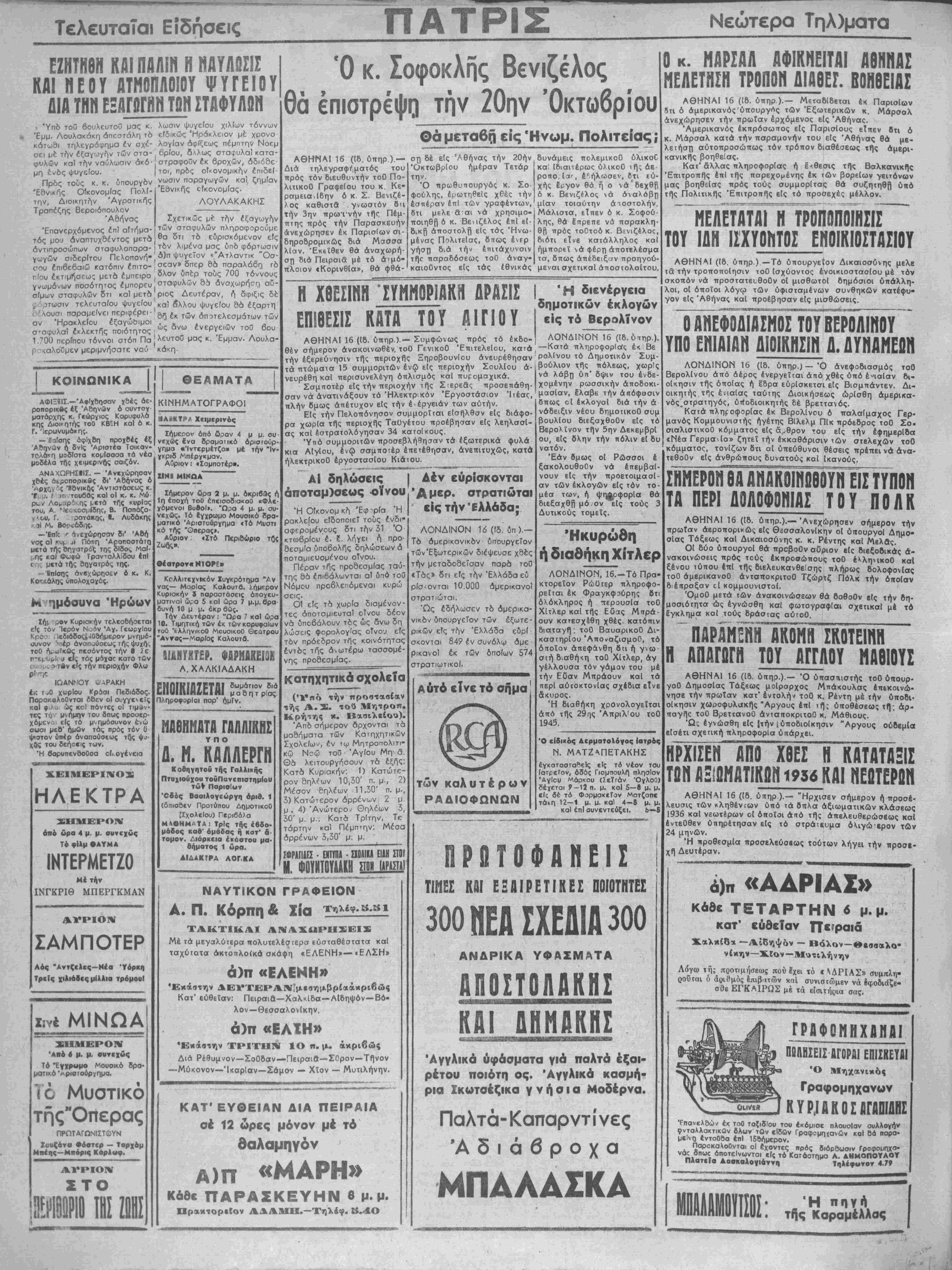 ΑΘΗΝΑΙ 16 (Ιδ. όπηρ.).— Ανεχώρησεν σήμερον την