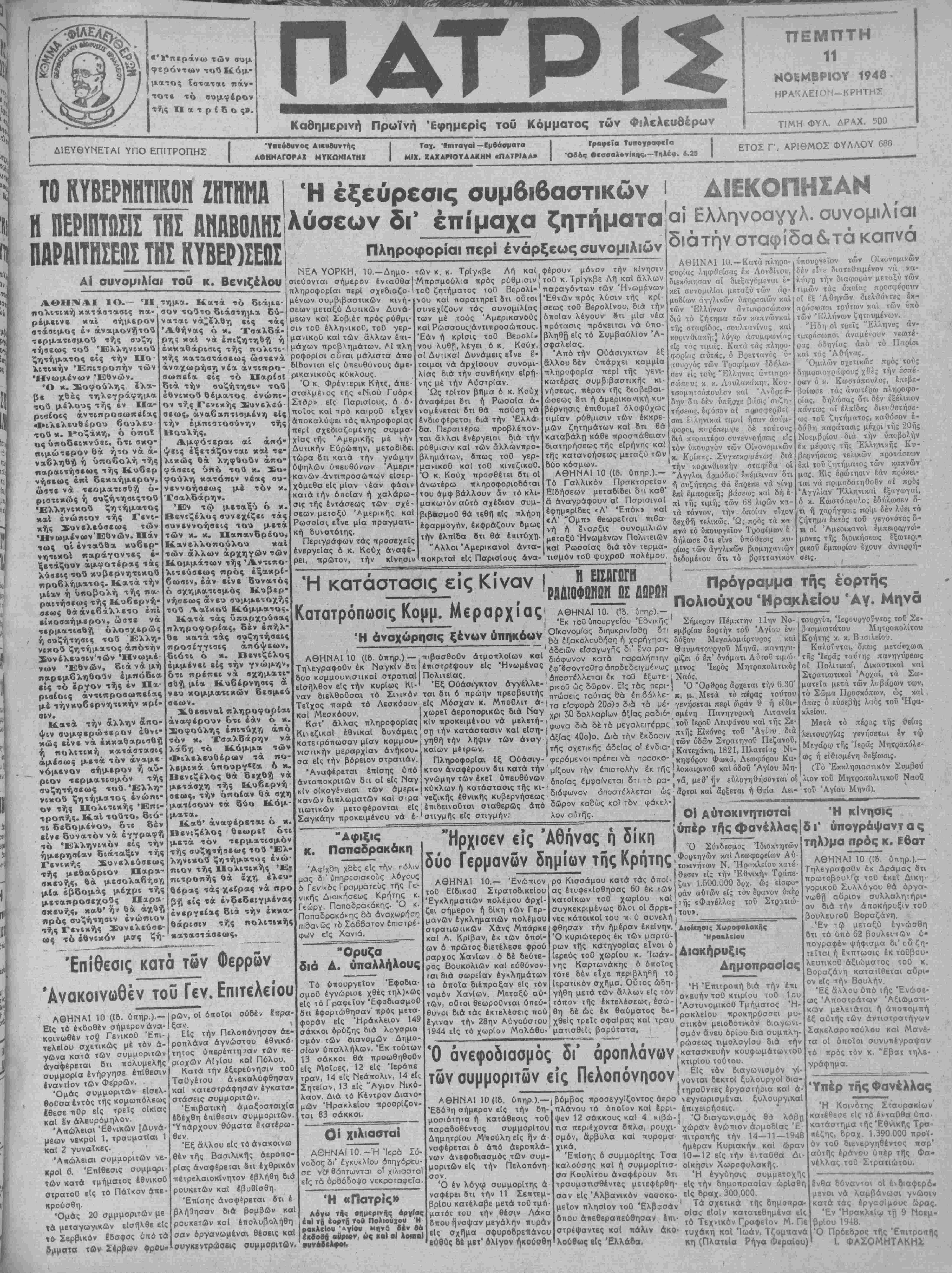 Όβος ·<σσαλ·ν(κΐ|ς.—Τηλέφ. 6.25 Ι ΕΤΟΣ Γ. ΑΡΙΘΜΟΣ ΦΥΛΛΟΥ 688 ΤΟ ΚΥΒΕΡΗΗΤΙΚΟΗ ΖΗΤΗΜΑ Η ΠΕΡΙΠΤΩΣΙΣ ΤΗΣ ΑΗΑΒΟΛΗΣ ΠηΡΑΙΤΗΣΕΟΣ ΤΗΣ ΚΥΒΕΡ)ΙΕί1Ι Αι ουνομιλίαι τού κ. Βενιζέλου ΑΘΗΝΑΙ 1Ο-— Ή, πολιτική κατάστασις πά- ρέμεινε καί σήμερον στάσιμος έν άναμονήτοΰ τερματισμού τής συζη τήσεως τού 'Έλληνικού ζητήματος είς την Πο¬ λιτικήν Επιτροπήν των Ήνωμένων Εθνών. Ό κ. Σοφούλης έλα¬ βε χθές τηλεγράφημα τού μέλους τής έν Πα¬ ρισίοις άντιπροσωπείας Φιλελευθέρου βουλευ τού κ. Ροζάκη, ό όποΐ ος ύποδεικνύβι, ότι σχο- πιμώτερον θά ήτο νά ά- ναβληθή ή ύποβολή τής παραιτήσεως τής Κυβερ νήσεως επί δεκαήμερον, ώατε νά τερματισθή ο¬ ριστικώς ή βυζήτηαιςτοΰ Έλληνικού ζητήματος καί ενώπιον τής Γενι- χής Συνελεύσεως των *Ηνωμένων'Έθνών. Πάν τως οί ενταύθα κυβερ- νητικοΐ ηαράγοντες έ- ξετάζουν αμφοτέρας τάς λύσεις τού κυβερνητικού προβλήματος. Κατά την μίαν ή υποβθλή τής πα¬ ραιτήσεως τής Κυβερνή¬ σεως θάάνεβάλλετο επί είκοσαήμερον, ώατε νά τερματισθή όλοαχερώς ή συζήτησις τού 'Ελλη· νικοΰ ζητήματος άπότήν Συνέλευοιν'τών Ήνωμέ¬ νων Εθνών, οιάνάμή παρεμβληθούν έμπόβι* είς τό έργον τής έν Πα¬ ρισίοις άντιπροαωπείας μέ τήνκυβερνητικήν κρί βιν. Κατά την άλλην απο ψιν συμφερώτερον έθνι κώς είνε νά έκκαθαρισθή ή πολιτική κατάστασις άμέοως μετά τόν άναμε νόμενον σήμερον ή αυ ριον τερματισμόν τής συζητήσεως τού.Έλλη νικοΰ ζητήματος ενώπι¬ ον τής Πολιτικάς Έπι- τροπής. Καί τούτο, διό¬ τι δεδομένου, ότι δέν είνε δυνατόν νά έγγραφή τό Ελληνικόν είς την ημερησίαν διάταξιν τής Γενικής Συνελεύσεως τής μεθαύριον Παρα- οκευής, Θά μεσολαβήση μία έβδομάς μέχρι τής μεταπροσεχούς Παρα οκευής, κα·4' ην θά αχθή πρός συζήτησιν ενώπιον τής Γενικής Συνελεύσε¬ ως τό εθνικόν μας ζή- Ή έξεύρεσις συμβιβαστικών ι ΔΙΕΚΟΠΗΣΑΝ λύσεων δΓ έττίμαχα ζητήματα-ι Ελληνοαγγλ.συνομ.λία. δΐάτήνσταφίδα&τάκαπνά Πληροφορίαι περΐ ενάρξεως συνομιλιών τημ«. Κατά τό διάμε- σον τούτο διάστημα δύ¬ ναται νά^έλθη είς τάς Αθήνας ό κ. Τσαλδά- ρης καί νά επιζητήση ή εκκαθάρισις τής πολιτι¬ κάς καταστάσεως ωστενά αναχωρήση νέα άντιπρο- οωπεία είς τό ΗαρίσΙ διά την συζήτησιν τού έθνικού θέματος ενώπι¬ ον ττ.ςΓβνικής Συνελεύ βεως, άναβαητΐσμένη είς την εμπιστοσύνην τής Βουλής. Αμφότεραι αί άπό- ψεις έξετάζονται καί τε- λικώς θά ληφθούν άπο- φάσεις υπό τού χ. Σο¬ φούλη κατόπιν νέας συ¬ νεννοήσεως μέ τόν κ. Τοαλδάρην. Έν τώ μεταξύ ό κ. Βενιζέλος συνεχίζει τάς συνεννοήσεως τού μετά των κ. κ. Παπανδρέου* Κανελλοπούλου καί των άλλων άρχηγών των Κομμάτων τής Αντιπο¬ λιτεύσεως πρός εξακρί¬ βωσιν, εάν είνε δυνατάς ό σχηματισμός Κυβερ¬ νήσεως άνευ συμμετοχής τού Ααϊ*οΰ Κόμματος. Κατά τάς υπαρχούσας πληροφορίας» δέν επήλ¬ θε κατά τάς συζητήσεις προσέγγισις άπόψεων, διότι ό κ. Βενιζέλος εμμένει είς την γνώμην, ότι πρέπει νά σχηματι¬ σθή μία Κυβέρνησις ά νευ χομματικών δεσμεύ σεων. Χθεσιναί πληροφορίαι άναφέρουν ότι εάν ό χ. Σοφούλης επιτύχη άπό τόν κ. Τσαλδάρην νά λάβη τό Κόμμα των- Φιλελεύθερον τα πο- λεμικά ύπουργ'ία ό κ. Βενιζέλος θά δεχθή νά μετάσχη τής Κυβερνή¬ σεως, την οποίαν θά σχη ματίαουν τα δύο Κόμ- ματα. Καθ' άναφέρεται ό κ. Βενιζέλος θεωρεΐ ότι μετά τόν τερματισμόν τής συζητήσεως τού Έλ- ληνικοΰ ζητήματος ενώ¬ πιον τής Πολιτικάς Έ| πιτροπής θά έχη ελευ¬ θέρας τάς χείρας νά προ βή είς τα ένδεδειγμένας ενεργείας δια την εκκα¬ θάρισιν τής πολιτικής καταστάσεως. ΝΕΑ ΥΟΡΚΗ, 10, —Δημο- σιεύονται σήμερον ένταθθαΐ πληροφορίαι περΐ σχ?Β