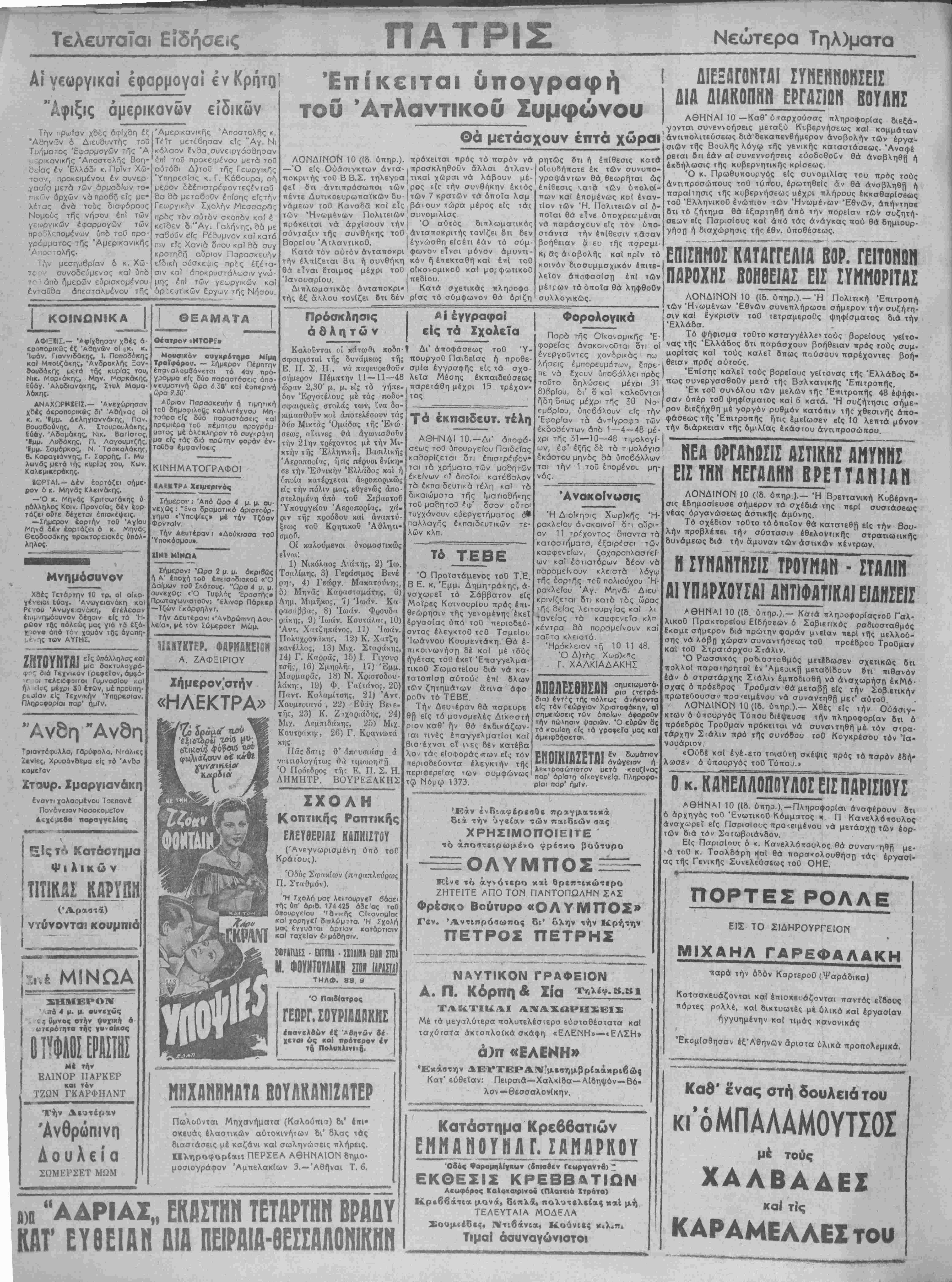 τ<- άπό Ημερών εύρισκομένου ενταύθα άπεσταλμένου της 'Αμερικανικής Αποστολάς κ Τέΐτ μετέβησαν είς "Αγ. Ν κόλαον ?ν8α συνειργάσσησαν επί τού προκειμένον μετά τού αύτόθι Δ)τοϋ της Γεωργιος "Υπηρεσίας κ. Γ Κάβουρα, σή ι,ερον δέέπιστρέφοντεςένταΰ δα δ6 μεταβοθν έπ/σης είςτι^ Γεωργίαν Σχολήν Μεσσαρ5< πρδς τδν αυτόν σκοπδν καί έ κεΐδεν δ "Αγ. Γαλήνης, δα με ταβοθν ε7ς Ρέθυμνον καΐ κατό πιν είς Χανιά δπου καϊ 8ά συγ κροτηθη αυριον Παρασκευήν είδικΓ} σύσκεψις πρϊς έξέτα· σιν καί άποκρυστάλωσιν γνώ μης έπ των γεωργικών κα άρίει/τικών Εργων τής Νήσου ΚΟΙΙΜΩΙΜΙΚΑ κ. ΑΦΙΞΙΙΣ.— Αφίχθησαν χβές ά εροπορικώς έξ Αθηνών οί ·}κ. Ιωάν. Γιοννιδόκης, Ι. Παπαδάκης κο) Μποΐιζάκης, Άνδροκλής ζαν- σουδόκης μετά τής κυρίας τού, Νικ. Μαρκάκης, Μόν. Μαρκάκης, Εύαγ. Άλοδιονάκης, Στυλ Μομα- λόκης. ΑΝΑΧΩΡΗΧΕΙΣ.— Ανεχώρησαν χόες άεροπορικβς δι* Άθήνα; ο! κ. κ. 'ϊμμ. Δεληγιαννάκης, Γαν. Βουοβούνης, Λ Σταυρουλάκης, Εύ6γ. Άδομάκης, Νικ. ΒαΓΐστος, '·μμ. Λυδάκης, Π. Λαν/ουμτζής, Ίμμ. Σαμόρκος, Ν ' ΤσακαλάκηΓ., Β. Καραγιάννης, Γ. Σαρρής, Γ. Μυ λανάς μετά τής κυρΐος τού, Κων. Καλαμικερακης. 8ΟΡΤΑΙ.— Δέν έορτάζει σήμε¬ ρον 6 κ. Μήνας Κλεινάκης. —Ό κ. Μήνας Κριτσωτάκης 6 πάλληλος Κοιν. Προνοίας δέν έορ τόζει οϋτε δέχεται έπιοκέψεις. —Σήμερον εορτήν τοθ Άγ(ου Μηνβ δέν έορτάζει ό κ. Μηνδς Θεοδοσάκης προκτορειακάς υπ6λ- ληλος. Μνημόσυνον Χβές Τετάρτην 10 τρ. οί οΐκο- γένειαι Εύαγ. Άνωγειανάκη κα) Ρί -ου Άνωγειονόκη, ετέλεσαν έηψ /ημόουνον δέηοιν είς τα Ή- ρώον τής πόλεώς μας γιά τα έξά· χρονο άπό το ι χομόν ι Οί ώγοπη- μένης των ΑΥΓΗΣ. ΘΕΑΜΑΤΑ Θέατρον «ΝΤΟΡΕ» Μουσικόν ουγκρότημα Μίμη Τραϊφόρου. — Σήμερον ΠέμπΓΠν έπανσλαμβάνετοι τό 4ον προ- γραμμα είς δΰο παραστόσεις άπο· νευματινή ώρα 6 30' κα) έοπερ,νή ώρα 9 30' Αυριον Παρασκευήν ή τιμητική τού δημοφιλοι}ς καλλιτέχνου Μη τσάρα είς δύο παραστόσεις κα πρεμιέρα τοθ ηέμπτου προν/ρόμ ματος μέ ολόκληρον τό ουγκρότη μα είς τάς διά πρώτην φοράν έν- ταθσα έμφανίαεις ΚΙΝΗΜΑΤΟΓΡΑΦΟΙ ■ΑΙΚΤΡΑ Χειικρινος Σήμερον: Άπό &ρα 4 μ. μ. ου- νεχθς : "Ηνα δροματικό σριστούρ· γημα «ΎποψΙες» μέ των Τζάαν ΦοντοΙν Την Αευτέρον: «Δούχισσα τοθ Ύποκόσμου». ΙΙΗΙ ΜΙΝΩΑ Σήμερον: "Ωρσ 2 μ μ. ακριβώς ή Α' έποχή τοθ έπεισοδιακοθ «Ό Δα/μων τοθ Σκότοιις. "Ωρα 4 μ. μ συνεχθς: «Ό Τυφλός Έροστής» Πρωταγωνιστοθν: "ίλινορ Πάρκερ —Τζών Γκάρφηλντ. Την Δευτέραν: «Άν&ρώΓτινη Δου- λε!α», ιιέ τόν Σώμεροετ Μώμ. φΓ' οιά Τεχνικόν Γραφείον, μφ ■ ( ^ι ϊεΛειίφοκοι ΓυμναοΙοιι κο) ήΛ ίΐν ς μέχρι 33 έτών, μέ προυπη- ρυΐαν είς Τεχνικόν Ύπορεσίαν. Πλορβφορίαι παρ' ημίν. Άνδη Άνδπ] τριαντόφυλλσ, Γαρύφολα, Ν'άλιες ΙενΙες, Χρυσάνοεμα είς τό ΆνΒο κομεΤον ΣτΏΐιρ. Σμαργιανάκη Εναντι χολασμένου Τοεπανε Παν&νειον Νοσοκομείον Δεχόμεθα παραγγελίας 3Ι1ΗΤΚΤΕΡ. Α. ΖΑΦΕΙΡΙΟΥ Ιήμερον'στήν «ΗΑΕΚΤΡΑ» Επίκειται υπογραφή τού Ατλαντικόν Συμφώνου Θά μετάσχουν έπτά χώραι ΛΟΝΔΙΝΟΝ 10 (ίδ. ύπηρ.). —Ό είς Ούάσιγκτων άντα- ποκριτής τοθ Β Β.Σ. τηλεγρα φεΐ ότι άντιττρόσωποι των πέντε Δυτικοευρωπαίκων δυ νάμεων τοθ Καναδά κοί εΐς των Ήνωμενων Πολιτειών πρόκειται νά άρχΐσουν την σύνταξιν τής συνθήκης τοθ ΒορεΙου ΆτλαντικοΟ. Κατά τόν αυτόν άνταποκρι την έλπΐζεται δή ή συνθήκη θά είναι ε"τοιμος μέχρι τοθ ΊανουαρΙου Διπλωματικάς άνταποκρι- τής έξ άλου τονίζει δτι δέν πρόκειται πρός τό παρόν νά ■προσκληθοθν άλλαι άτλαν- τικαΐ χ£&ραι νά λόβουν μέ- ρος £ιγ την συνθήκην έκτός (των 7 κρατών τα όποΐα λσμ βάνουν τώρα μέρος είς τάς ΙσυνομιλΙας | Ό αύτός διπλωματικώς ι άνταποκριτής τ