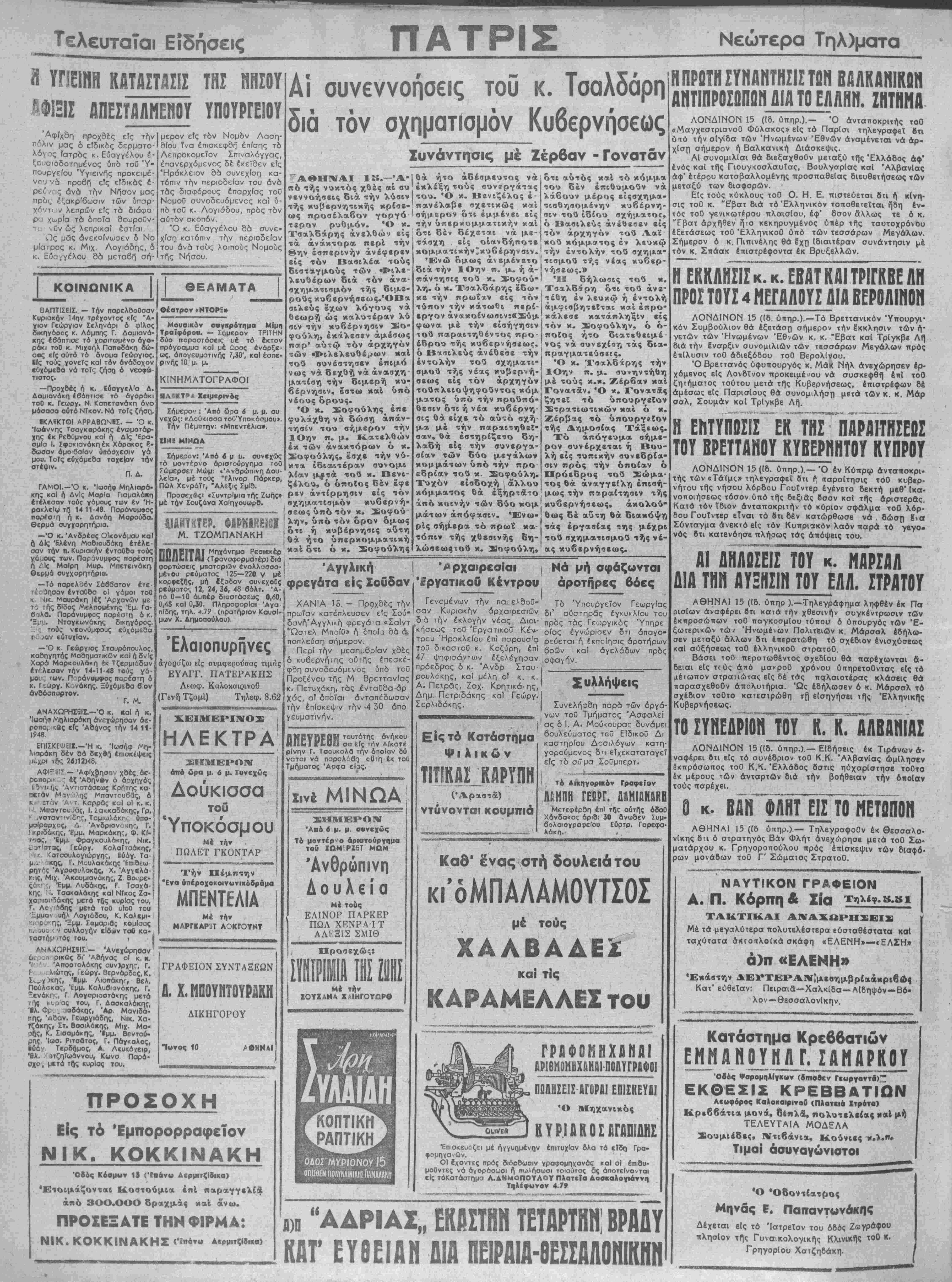 άς ό Ι. Α. Μού<ουραο δυνόμε βουλεύματος τού Είδικού Δι καστηρίου Δοσιλόγων κατη- γορούμενος δ μ εΤχεκαταταγεϊ είς τδ σιΓμα Σοϋμπερτ. τβ Αικηγορικόν Γραφείον ΛϋΜΠΗ ΓΕΏΡΓ. ΔΑΗΙΑΗΑΚΗ Μετεφέρθη ίπί τής αυτής όδοθ Χάνδακος αριθ: 30 Ανωθεν Συμ- βολαιογραφεΐου Ευστρ. Γσρεφα Αάκη. , Καθ* ενας στή δουλειά τού κΓόΜΠΑΛΑΜΟΥΤΣΟΣ μέ τούς ΧΑΛΒΑΔΕΪ καί τίς ΚΑΡΑΜΕΛΛΕΣ τού ΓΡΑΦΟΜΗΧΑΝΑΙ ΛΡ1ΒΜ0ΜΒΧ6ίυΐ1 ΠΟΛΥΓΡΑΦΟΙ ΠΟΑΗΣΕΙΧ ΑΓΟΡΑΙΕΠ1ΣΚΕΤΔΙ Ό Μηχανικός Έπσκευίζει μέ ήγγυημένην επιτυχίαν δλα τα εΤδη Γρα- ώ ηχ Ο) έχοντες πρός διόοθωσιν γραφομηχανάς καΙ οί έπιθυ- μοθντες νά άνορόοωσι ! πωληθώσι τοιούτος άς άποτεΐνονται είς τόΚατάατημα Λ.ΑΗΜΟΠΟΥΛΟΥ ΠλστεΤα Ααοκαλογιάννη Τηλέφυνον 4.7· Α)0 "ΑΔΡΙΑΣ ΤΕΤΑΡΤΗΝ! ΒΡΑΔΥ ΚΑΤ' ΕΥΘΕΙΑΝ ΔΙΑ ΠΕΙΡΑ1Α-ΘΕΣΣΑΛ0ΝΙΚΗΝ ΑΙ ΔΗΛΩΣΕΙΣ ΤΟΥ κ. ΜΑΡΣΑΛ ΔΙΑ ΤΗΝ ΑΥΞΗΣΙΝ ΤΟΥ ΕΛΛ. ΣΤΡΑΤΟΥ ΑΘΗΝΑΙ 15 (Ιδ. ύπηρ ).—Τηλεγράφημα ληφθέν έκ Πά ρισΐων άνσφέρει Οτι κατά την χθεσινήν συγκέντρωσιν των εκπροσωπών τοθ παγκοσμίου τύπου ό ύπουργός των Ε¬ ξωτερικών τώ/ Ήνωμένων Πολιτειών κ. Μαρσάλ εδήλω¬ σεν μεταξύ άλλων ότι επερατώθη τό σχέδιον ένισχύσεως καΐ αυξήσεως τοθ έλληνικοθ στρατοθ. Βάσει τοθ περατωθέντος σχεδίου θά παρέχωνται &- δειαι είς τ^ύς άπό μακροθ χρόνου ύττηρετοθντας είς τό μέτωπον στραηώτας είς δέ τάς πσ,λαιοτέρας κλάσεις θά παρασχεθοθν άπολυτήρια. Ώς εδήλωσεν 6 κ. Μαρσάλ τό σχέδιον τοθχο κατεσιρώθη τη εΐσηγήσει τής Ελληνικάς Κυβερνήσεως. ΤΟ ΣΥΝΕΔΡΙΟΝ ΤΟΥ " κΤΊΓαΙιΓαΗΙΑΣ ΛΟΝΔΙΝΟΝ 15 ((δ. ύηηρ.).— ΕΙδήσεις έκ Τιράνων ά- ναφέρει 6τι είς τό συνέδριον τοθ Κ.Κ. ΆλβανΙας ωμίλησεν έκπρόσωπος τοθ Κ.Κ. Ελλάδος βστις ηύχσρΐστησβ τοθτο έκ μέρους των άνταρτών διά την βοήθειαν την οποίαν τούς πσρέχει. Ο κ. ^ΐρΤ ΑΘΗΝΑΙ 15 (Ιδ ύττηρ.).— Τηλεγραφοθν έκ θεσσαλο¬ νίκης 6α δ στρατηγός Βάν Φλήτ ανεχώρησε μεΐά τοθ Σω- ματάρχου κ. Γρηγοροπούλου πρός επίσκεψιν των διαφό¬ ρων μονάδων τοθ Γ' Σώμαιος Στρατοθ. ΝΑΥΤΙΚΟΝ ΓΡΑΦΕΙΟΝ Α. Π. Κόρπη & Σία ΤΑΚΤΙΚΑΙ ΑΝΑΧΩΡΟΣΕΙΣ Μέ τα μεγσλύτερα πολυτελέστερα εύσταθέστατα καί ταχύτατα ακτοηλοίκά σκάφη «ΕΛΕΝΗ»—ΐ ά)π «ΕΛΕΝΗ» ρρς Κατ' ευθείαν: Πειραια—Χαλκίδα—Αίδηψόν—Βό¬ λον—θεσσαλονίκην. Κατάοτημα Κρεββατιών ΕΜΜΑΝΟΥΗΛΓ. ΣΑΜΑΡΚΟΥ Όβός ΦαρομηλΙγκυν (οπιοβεν Γευργαντβ)"* ΕΚΘΕΣΙΣ ΚΡΕΒΒΑΤΙΩΝ Αευφόρος ΚαλοκαιρινοΟ (Πλατειά Ιτρατα) Κρ·β6άτια μονά, δ(πλά, πολυτελείας καΐ μ4 ΤΕΛΕΥΤΑΙΑ ΜΟΔΕΛΑ Χουμιέδες, Ντιβάνια, Κ,ούνιες Τιμαί άσυναγώνιστοι Ό Μηνάς Ε. Παπαντωνάκη Δέχεται είς τό Ιατρείον τού όβός Ζωγράφου πλησίον της Γυναικολογικί)ς Κλινικής τοθ Κ. Γρηγορίου Χατζηβάκη.