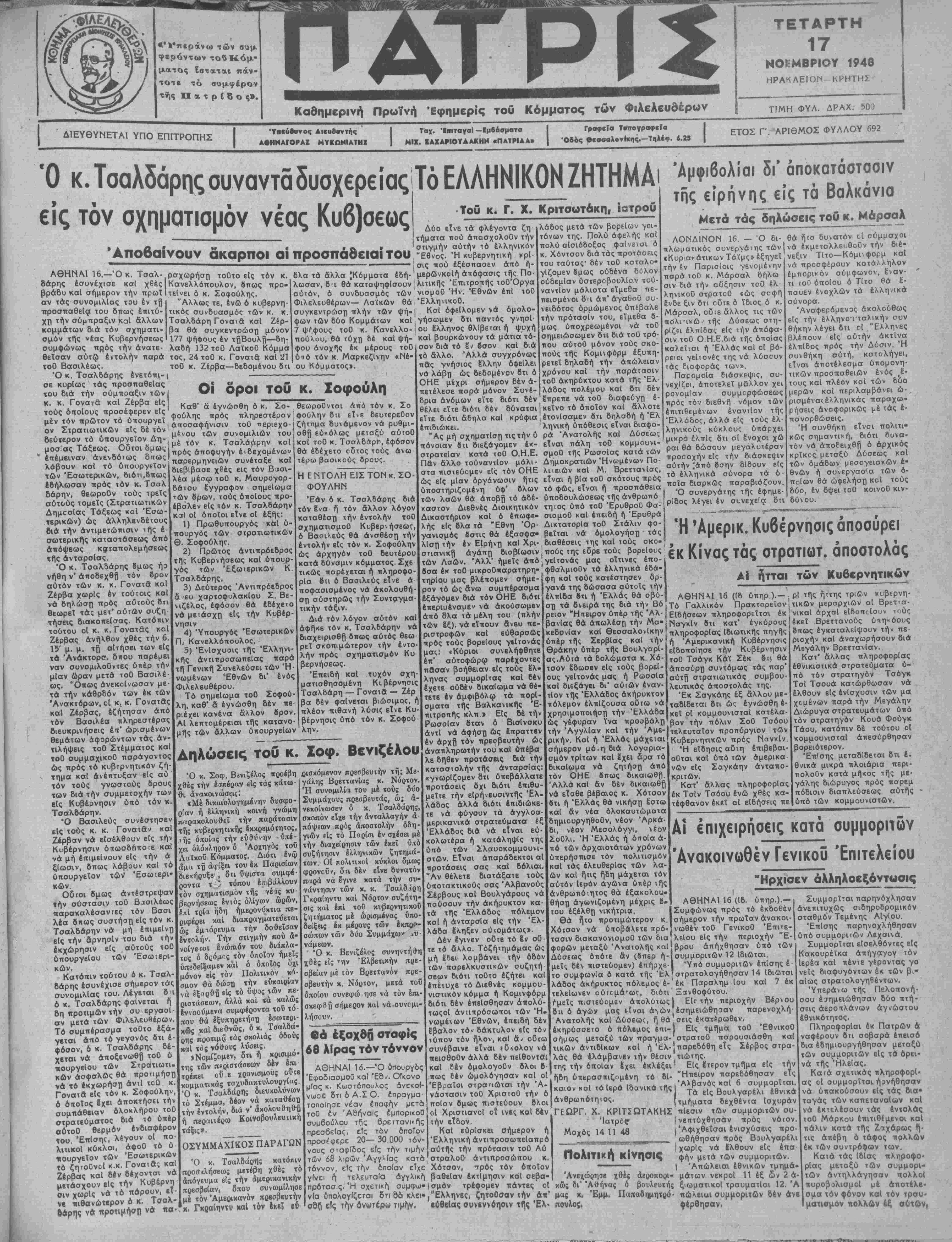 Πάντως ώς εγνώσθη ό κ. Τσαλδάρης δέν ηδυνήθη νά