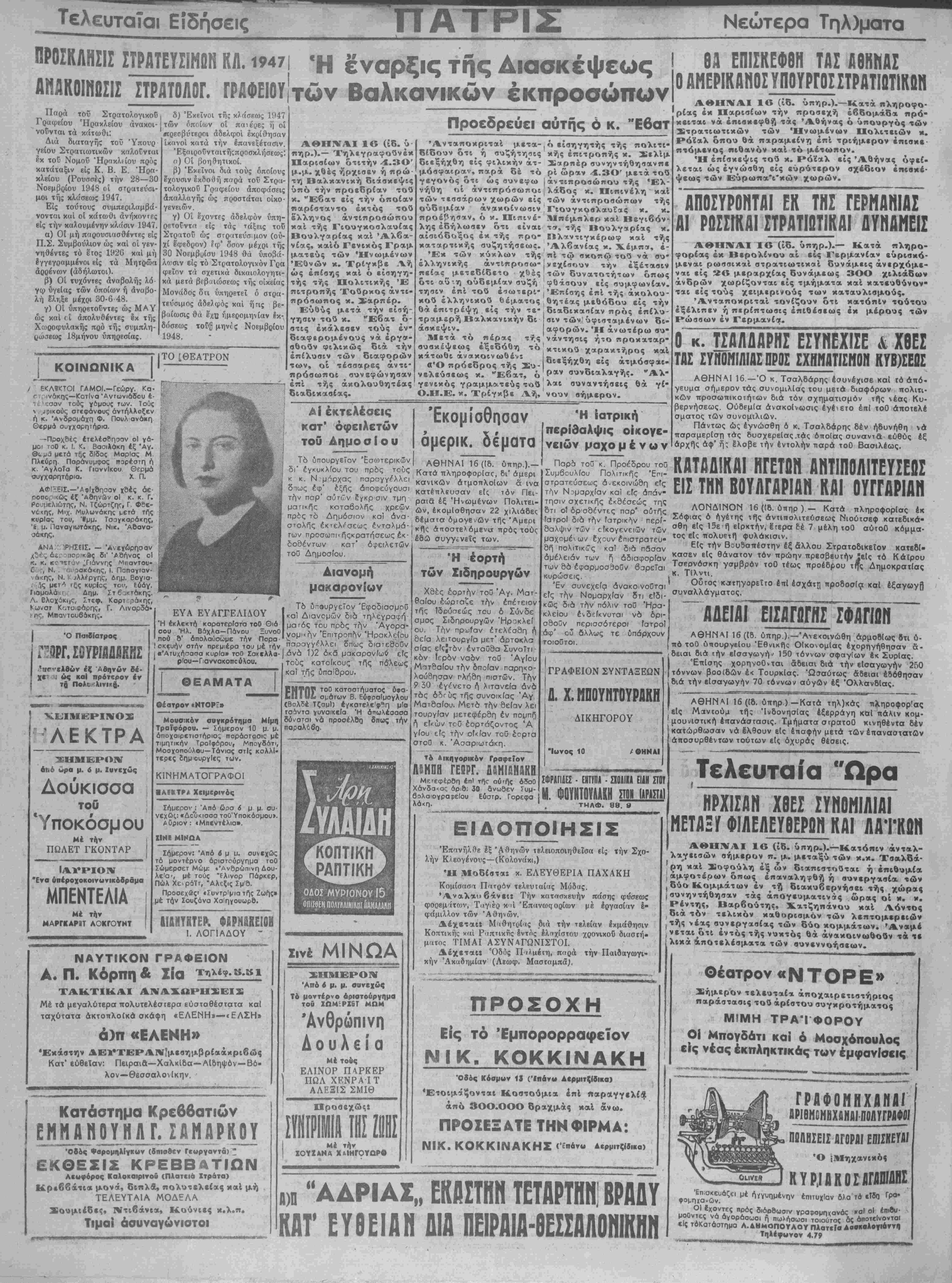 των προσωπκηςκρατήσεωςέ<-Ιέδω συγγιιν6Ϊς των. Εκομίσθησαν άμερικ. δέματα ΑΘΗΝΑΙ 16 (ίδ. ύπηρ).— Κατά πληροφορίας, δι* άμερι κανικών ατμόπλοιον ά ινα δοδέντων κατ τοϋ Δημοσίου όφειλετών Ό Παιβίατμος . ΣΟΥΡΙΑΔϋΚβΣ χε' έζ Αθηνών δέ· ώς κα! πρότερον έν τα ΠλΑή ΕΥΑ ΕΥΑΓΓΕΛΙΔΟΥ Ή έκλεκτη καροτερίΌτα τοΟ_Θιά σου "Ηλ. Βάχλα—Πάνου ΞυνοΟ λύ η πού β' την Πορα Αιανομή μακαρονίων Τ6 όπ9υργεΐον Έφοδισσμού καί Διανομών διά τηλεγραφή ματός τού πρδς την Άγορα- νομικτδ,ν "Επιτροπήν Ηρακλείου Ιοκευήν οτήν πρεμιέρα τού μέ την παραγγέλλει όπως διατεσοθν ιετ'Ατυχήσασα κυρ/α» τοθ Σακβλλο-1 ανά 1)2 οκά μακαρονίων είς ^ ΛΕΚΤΡΑ ΣΗΜΕΡΟΝ άηό υρα μ. 6 μ. Χυνεχΰς Δούκισσα τού ; Ύποκόσμου Μέ την ΠΩΛΕΤ ΓΚΟΝΤΑΡ ΙΑΥΡΙΟΝ "Ενα ύπέροχοκοινονικόδράμα ΜΠΕΝΤΕΛΙΑ Μέ την ΜΑΡΓΚΑΡ1Τ ΑΟΚΓΟΥΝΤ ρ(ου—Για ννακοπο ύ ου. ΘΕΑΜΑΤΑ Θέατρον «ΝΤΟΡΓ» Μουοΐκόν ουγκρότημα Μίμη Τραϊφόρου. — Σήμερον 10 μ μ. άποχαιρετιοτήριο; ποράοτοοις μέ τιμητικήν Τροϊφόρου, Μπογδάτι, Μοσχοπούλου—Τάνιας στΐς κολλΙ τερες δημ ουργΐες των. ΚΙΝΗΜΑΤΟΓΡΑΦΟΙ ■ΑΕΚΤΡΑ Χιιμβρινός Σήμερον^! Άπό ώρσ ο μ μ ου νεχθς: «Δο'ύκισσα τοθ'Υποκόομου». Αυριον: «Μπεντέλια·. ΧΙΝβ ΜΙΗΩΑ Σήμερον: Άπό 6 μ υ. συνεχώς τό μοντερνο άριστούργημα τοθ Σώμερσετ Μώμ: «Ανθρωπίνη Δου λε'α·, μέ τ ούς "Ελινορ Πάρκερ, Πώλ Χενράϊτ, Άλεζις Σμ'θ. Προσεχδςι «Συντρΐμια τής Ζωής» μέ την Σουζάνα Χαΐηγουυρθ. ΛΙΑΙίΥΗΤΕΡ, ΦΚΡΗϋΧΕΙΟΗ Ι. ΛΟΓΙΑΔΟΥ ' ΝΑΥΤΙΚΟΝ ΓΡΑΦΕΙΟΝ Α. Π. Κόρπη Λ Σία τηλέφ. ΤΑΚΤΙΚΑΙ ΑΝΑ_ΩΡΗ_ΈΙ_ Μέ τα μεγαλύτερα πολυτελέστερα εύσταθέστατα καί ταχύτατα άκτοπλοίκά σκάφη «ΕΛΕΝΗ»—«ΕΛΣΗ» ά)π «ΕΛΕΝΗ» Έκαστην ΔΕΥΤΕΡΑΝ'μεαημβρίαάκριβώς Κατ' ευθείαν: Πειραια—Χαλκίδα—Αΐδηψόν—Βό¬ λον— Θεσσαλον (κην. Κατάστημα Κρεββατιόν ΕΜΜΑΝΟΥΗΛΓ. ΣΑ II ΑΡΚΟΥ Όβός ΦαρομηλΙνκυν (δπιοβεν Γεωργαντά)"" ΕΚΘΕΣΙΣ ΚΡΕΒΒΑΤΙΩΝ λεαφόρος Καλοκαιριτοΰ ιπλατειά Ζτράτα) Κρ«66άτια μονά, διπλά» πολυτελείας χαί μή ΤΕΛΕΥΤΑΙΑ ΜΟΔΕΛΑ Χουμιέδες, Ντιβάνιχ, Κούνιες χ.λ.π* Τιμαί ασυναγώνιστοι τοθς κατοΐκους τής πόλεως καί τής υπαθρου. ΕΝΤΟΣ τοθ κατσστήυατος ΰψα- σμάτων Β. ΕύφοαΙμογλου (Βολδε Τζαμί) έγκατελε'φ^η μΐα τσΊντα γυναικεΐα Ή άπωλέσοαα δύναται νό προσέλ&ΐ] δπως την παραλύβο ΚΟΠΤΙΚΗ ΡΑΠΤΙΚΗ χ.νέ ΜΙΝΩΑ ΣΗΜΕΡΟΝ Άπό 4 μ. μ. οιΐΎ*χύξ Τό μοντερνο Αριοτούργημα τού ΪΠΜίΡΙδΤ Μί1Μ Ανθρωπίνη Δ ο υ λ ε ί α Μέ τούς ΕΛΙΝΟΡ ΠΑΡΚΕΡ ΠΩΛ ΧΕΝΡΑΙΤ ΑΛΕ21Σ ΣΜΙΘ Προσεχώς* Μέ την ΧΟΥΖΑΝΑ Χ&ΙΗΓΟΥΟΡΟ Ή έορτή των Σιδηρουργόν Χδές εορτήν τοΰ "Αγ. Ματ¬ θαίου έώρταζε την επέτειον της ιδρύσεως τού ό Σύνδε σμος Σιδηρουργών Ήρτκλεί ου Την πρωίαν έτελέσδη ή δεία λειτουργία μετ" άρτοκλσ οίας είςϊτόν ένταϋδα ΣυνοΤτι κδν ίερδν ναδν τοΰ Άγίου Ματθαίου την δποίαν παρη<ο- λούθησαν πλήση πιστών. Την 9 30 εγένετο ι"ι λιτανεία άνά τάς όδί-υς τής συνοικίας "Αγ Ματθαίου. Μετδ την δείαν λει τουργίσν μετεφέρθη έν πομπή" ι1) είκών τού έορτάζοντος Ά γίου είς την οίκίαν τοθ έορτα στοθ κ Άσαριωτάκη τό Αικηγορικόν Γραφείον ΛΒΜΠΗ ΓΕΩΡΓ. ΔϋΜΙΑΝ&ΚΗ Μττεφέρβη επ) τήο αύ'ής όδοθ Χάνδα<ος αριθ, 30 άνωθεν Τυμ- βολαιογραρεΐου Ευστρ. Γορεψα λάκη. Ή ίατρική περΐθαλφις οίκογε- νειών μαχομένων Παρα τοΰ Συμβουλίου κ Προέδρου τού Πολιτικης Έγί- στρατεύσεως ά-εκοινώδη είς την Νομαρχίαν καί είς άπαν τησιν σχετικης εκθέσεως της δτι οΐόρσδέντες παρ* αυτίής ΘΑ ΕΠΙΣΚΕΦΘΗ ΤΑΣ ΑΘΗΝΑΣ Ο ΑΜΕΡΙΚΑΗΟΣΥΠΟΥΡΓΟΣ ΣΤΡΑΤΙΩΤΙΚΩΝ ΑΘΗΝΑΙ 1β (ίδ. υπηρ.).—Κατά πληροφο- 'ρίας έκ Παρισίων την προσέχη έβδομάδα πρό- ' κείται να επισκεφθή τας Αθήνας ό ύπουργός των Στρατιωτικών των Ήνωμένων Ηολιτειών κ. Ρόϊ