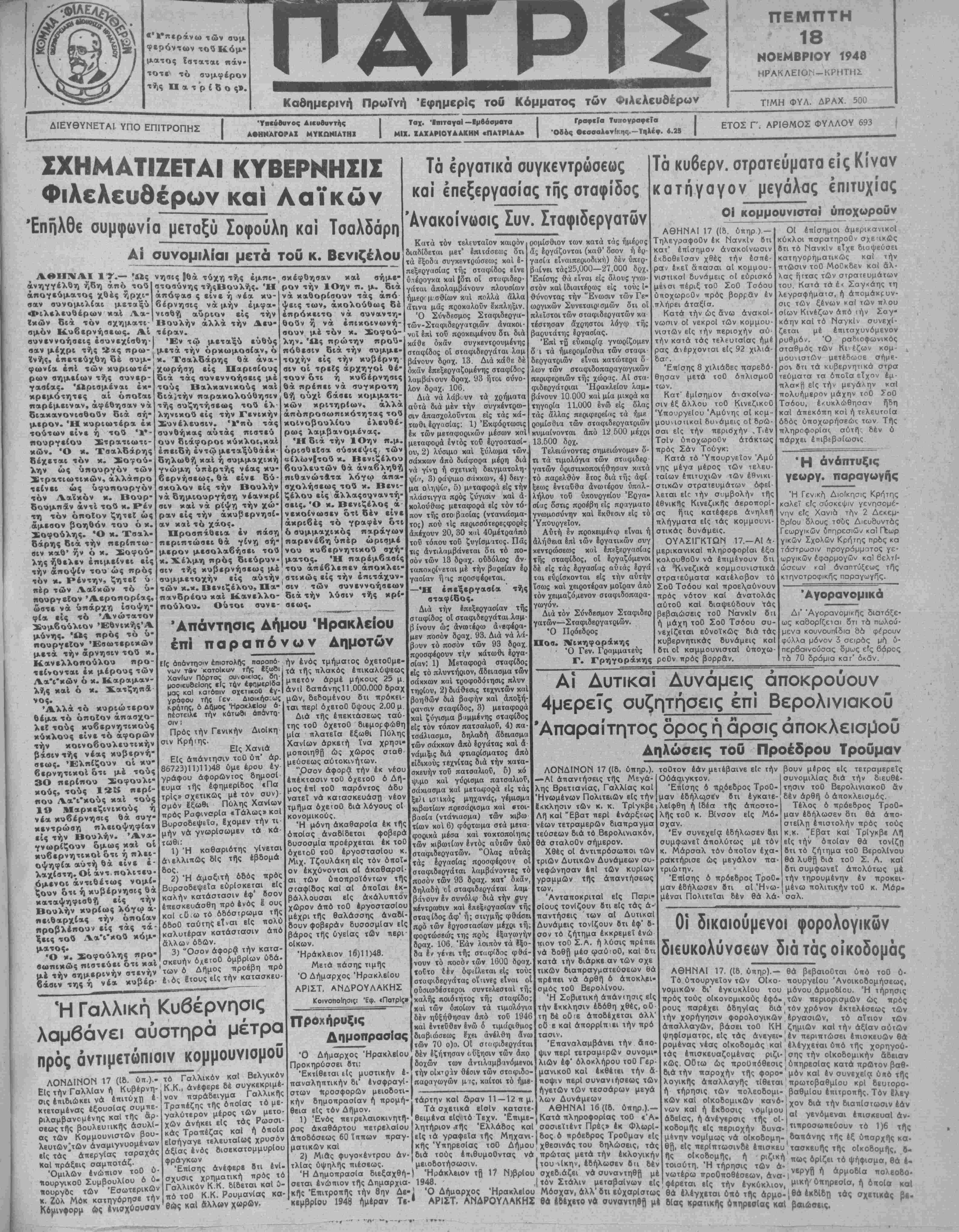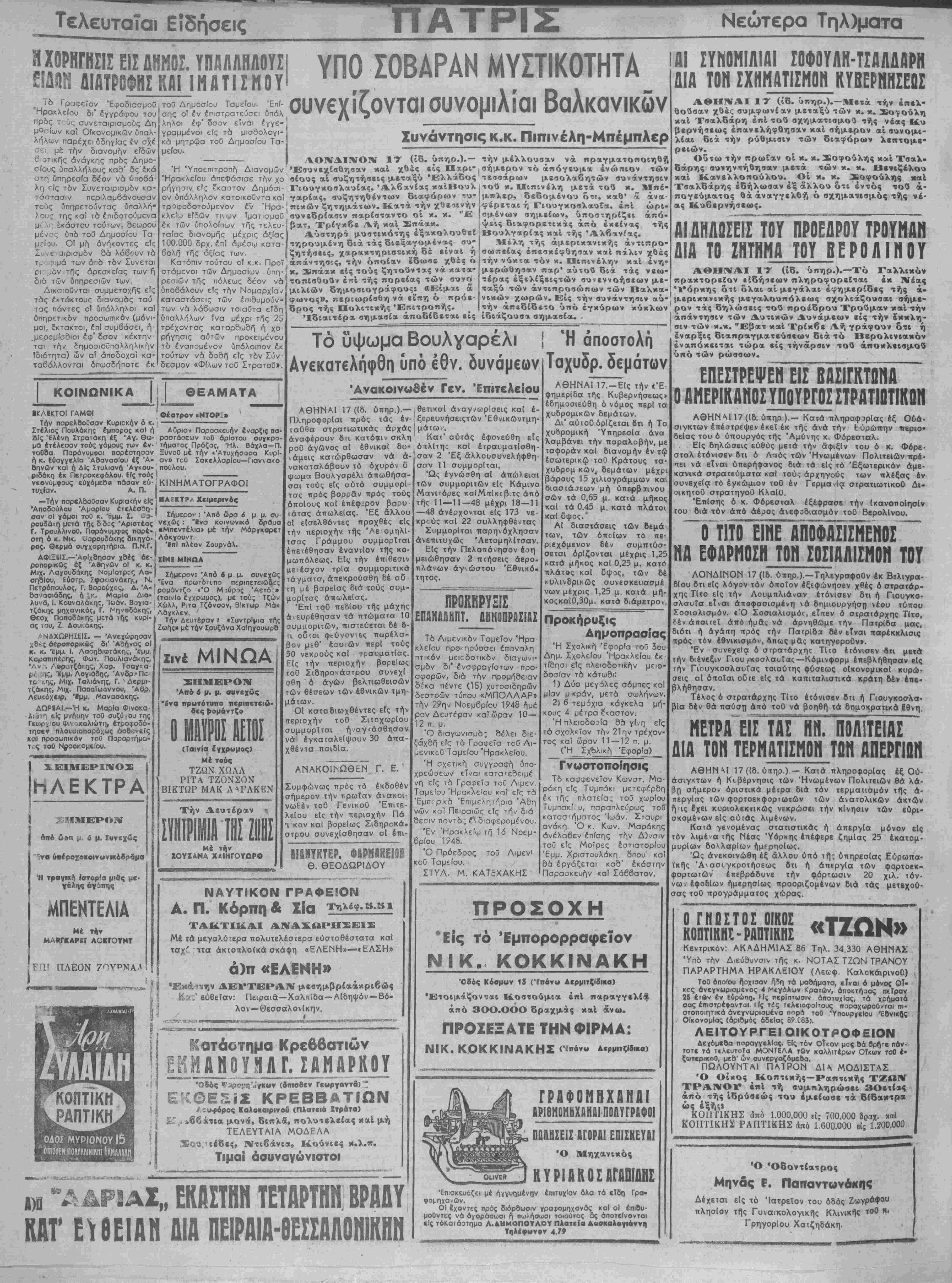 τι.< _"ΐ,μά των όπδ τδν Συνεται ρι ,ιδν της άρεσκείας των (η διά των δπηρεσιών των. ΔικσΌθνται συμμετοχης είς τάς έκτάκτους διανομάς ταύ τας πάντες οί όπάλληλοι κα] δπηρί·τικδν προσωπικόν (μόνι- μοι, ϋκτακτοι, επί συμβάσει, ή .μεοομίσοιοι έφ' δσον κέκτην ται την" δημοσιθϋπαλληλικην Υδιότητα) ών αί άποδοχαι κα¬ ταβάλλονται όπωσδήποτε έκ τού Δημοσίου ΤαμεΓου. Έπί- σης οΤ έν έπστρατεύσει ύπάλ ληλοι έφ' δσον είναι εγγε¬ γραμμένοι είς τα μισθολογι- κά μητρώα τού Δημοσίου Τα¬ μείου. Ή 'Υποεπιτροπή Διανομων Ηρακλείου απεφάσισε την χο ρήγηαιν είς έκαστον Δημόσι¬ ον ύπάλληλον κατοικοϋντα και τροφοδοτούμενον έν "Ηρα¬ κλείω είδών τίνων Τματισμοΰ έκ των ύπολοίπων τής τελευ¬ ταίας διανομης μέχρις άξίας 100.000 δρχ. επ) άμέσω κατα- βολΡί τής άξίας των. Κατόπιν τούτου οί κ.κ. ΠροΤ στάμενοι των Δημοσιων ΐπη ρεσιών τής πόλεως δέον νό ύποβάλουν είς την Νομαρχία καταστάσεις των έπιθυμούν των νά λάβωσιν τοιαύτα εΤδη ΰπαλλήλων Τνα μέχρι τής 2 τρέχοντος κατορθωθή ή χο ρήγησις αυτών προκειμένο τδ εναπομένον υπόλοιπον έ τούτων νά δοθή είς τδν Συν δεσμον «Φίλων τού Στρατοΰ» συνεχίζονται συνομιλίαι Βαλκανικών Συνάντησις κ.κ. ΠιπινέΑη-ΜπέμπΛερ ΛΟΝΔΙΝΟΝ 17 (ίδ. ύπηρ.).— την μέλλουσαν νά πραγματοποιηθή Έσυνεχίαθησαν καΐ χθές είς Παρι-, σήμερον τό άπόγευμα ενώπιον των σίους αί αυζητήσεις μεταξύ Ελλάδος τεσσάρων μεσολαβητών συνάντησιν Γιουγκοσλαυίας, Άλβανίας καίΒουλ τού κ. Πιπινέλη μετά τού κ. ΑΙ π έ μπλερ, δεοομένου ότι, καθ* 5. άνα- ώρθ άπό- τής γαρίας, συζητηθέντων διαφόρων τυ· ' πικών ζητημάτων. Κατά την χθεσινήν Συνεδρίασιν παρίσταντο οί κ. κ. "Έ βατ, Τρίγκβε Λή καί Σπά«»,. Αύστηρίι μυστικότης έξακολουθεί τηρουμένη διά τάς διεξαγομένη συ- ζητήσεις, χαρακτηριστική δέ είναι η Τ απάντησις, την οποίαν έδωσε χθές ο 'κ. Σπάακ είς τούς ζητούντας νά κατα- τοπΐσθούν έ«1 τής πορείας των συνο μιλΐών δημοσιογράφους: «Είμαι ά φωνος», περιωρίσθη νά είπη ό πρόε- δρος τής Πολιτικάς Έπιτροπής ΚΟΙΝΩΝΙΚΑ ΘΕΑΜΑΤΑ θέατρον «ΝΤΟΡΕ» ■ΚΛΙΚΤΟΙ ΓΑΜβΙ Την παρελθούσαν Κυριακήν ό κ. Στέλιος Πουλάκης εμπορος καΐ ή £1ς Έλένπ Στροτάκη έξ Αγ. Θω¬ μά ετέλεσαν τούς γσμοιις των έν- τοθ&α Παράνιιμφοι παρέστησαν ή κ. Εύογν/ελΙα Άθανασΐου έξ Α¬ θηνών κοΙ ή ΔΙς Στυλιανή Άγκου- ριδάκη έκ Πετροκεφάλου Είς τούς Ι νεονυμφους εύχόμεβ* παοαν εύ . ΚΙΝΗΜΑΤΟΓΡΑΦΟΙ τυχΐαν. Α. Π. ι —Την πσρβλδοθσαν Κυριακήν είς —Την παρελθούσαν κυριακην εις ι 'Αποδούλου ΆμαρΙου έτελέσοη· Ι οαν οί γάμοι τοθ κ. Έμμ. Σ. Ψσ-' ρουδάκη μετά τής δ δος Άριοτέας Γ. ΤρουλλινοΟ. Παράνυμφος παρέ¬ στη ό κ. Νικ. Φαρουδάκης δικηγό- ρος. ©ερμό ουγχσρητήρια. Π.Ν.Γ. ΑΦΙΞ6ΙΣ.—Αφίχθησαν χδές όε- ροπορικως έζ Αθηνών οί κ. κ. Μιχ. Λαγουδάκης ΝομΙατρος Λα¬ σηθίου, Ευστρ. Σφακιανάκης, Ν. Πετρόπουλος, Γ. Βαρούχας, Δ. Ά-' οα 'οσιάδης, ή ^,κ. Μαρία Δια- λυ> δ, Ι. Κουναλάκης, Ιωάν. Βογια- ■