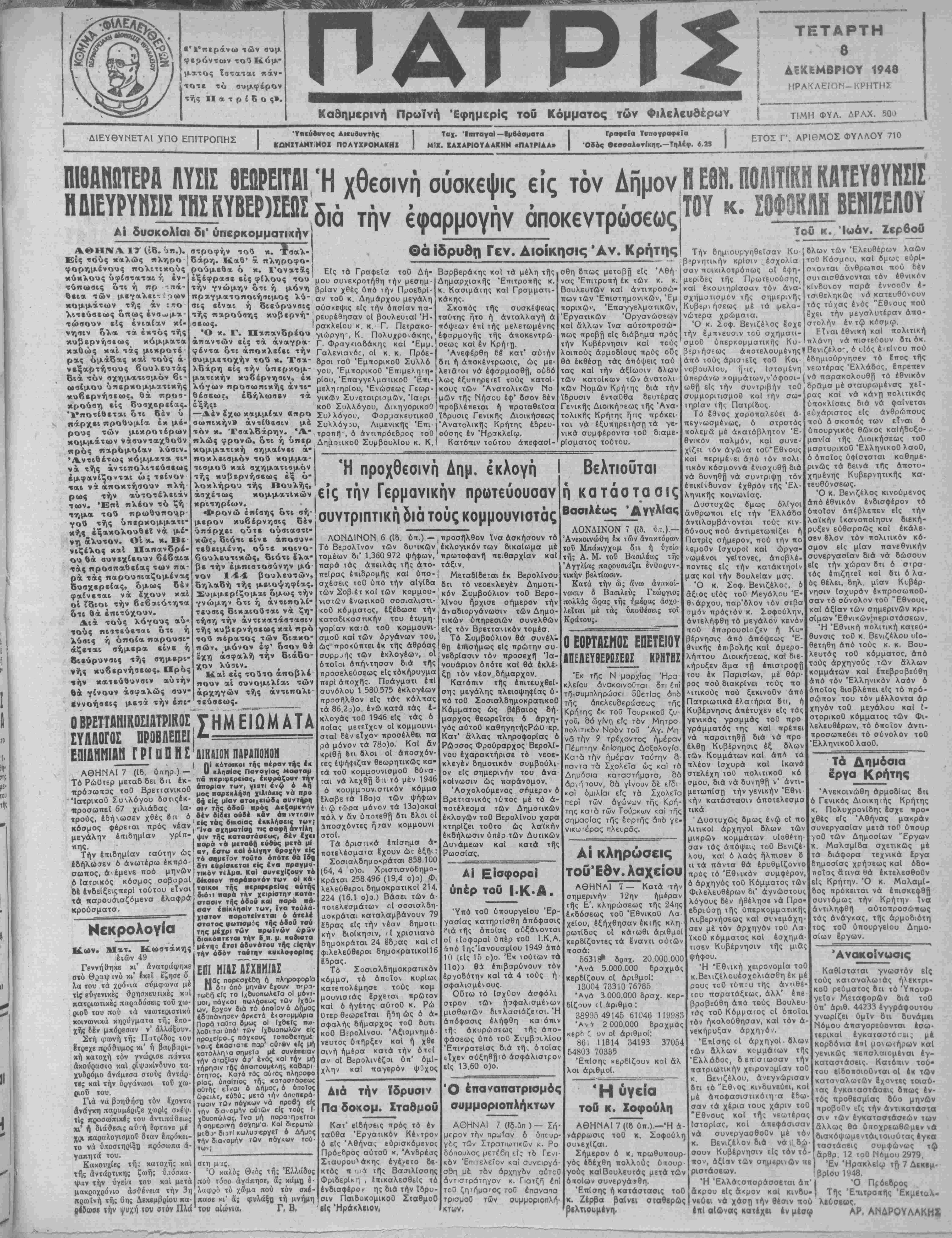 Γενικάς Άντιιτρόσωπος Κρήιης: ΖΑΧΑΡΙΑΣ Δ. ΤΣΙΚΡΙΤΣΗΣ—Άνωττόλβως 6 Ηράκλειον