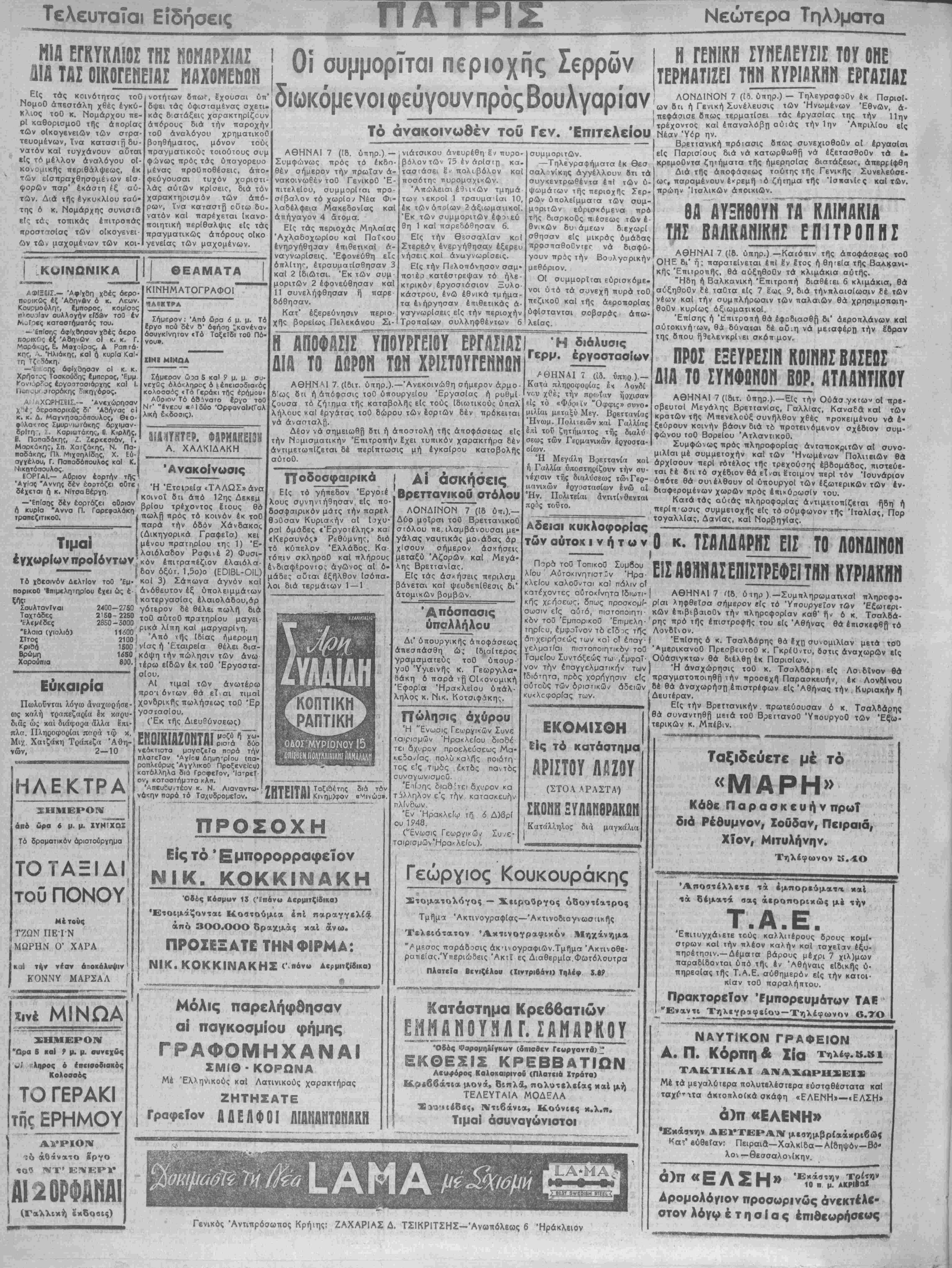 ΔΙΑ ΤΟ Δ0ΡΟΗ ΤΩΝ ΧΡΙΣΤΟΥΓΕΝΗΩΝ' ρμ< έργΟΟΤΟΟΐων ΑΘΗΝΜ 7. (ίδιτ. ύπηρ.)·—Ανεκοινώθη σήμερον άρμο- δ'ως 8π ή απόφασις τοθ ύπουργείου "Εργασίας ή ρυθμί ζουσα τό ζήΐημα τής κσταβολής είς τούς ίδιωτικούς ύπαλ λήλους καί εργάτας τοθ δώρου των έορτών δέν πρόκειται νά άναοταλή. Δέον νά σημειωθ(| ότι ή αποστόλη τής αποφάσεως είς την Ν")μισματικήν Επιτροπήν 6χει τυττικόν χαρακτήρα Βέν άντιμετωπίζεται δέ περίπτωσις μή έγκαίρου κατοβολής αύτοθ. ΤΤοδοσφαιρικά Είς τό γήπεδον Έργοτέ λους συνηντήθησαν είς πο· δοσφαιρικόν μάτς την πσρελ θοθσαν Κυριακήν αί ισχυ¬ ραί όμάδες «Έργοχέλης» και ΐΚερσυνός» Ρεθύμνης, διά τό κύπελον Ελλάδος. Κα τόπΐν σκληροθ καί πλήρους ένδιαφΐροντος αγώνος αί ό¬ μάδες αυται εξήλθον Ισόπα. λοι διά τερμάτων 1—1 ΚΟΠΤΙΚΗ ΑΠΤΙΚΗ ΖΗΤΕΙΤΑ1 Κινημ)φον διά τόν «Μινώα». ΠΡΟΣΟΧΗ Είς τό Εμπορορραφειον ΝΙΚ. ΚΟΚΚΙΝΑΚΗ Όδός Κόσμον 13 (Επάνω Αερμιτζίδικα) Έτοιμάζονται Κοατούμια επί παραγγελίά άπό 3ΟΟ.ΟΟΟ δραχμάς καΐ άνω. ΠΡΟΣΕΞΑΤΕ ΤΗΝΦίΡΜΑ: ΝΙΚ. ΚΟΚΚΙΝΑΚΗΣ (πάν» Δερμπζίοικα) <♦.'*!-Λ---- Μόλις παρελήφθησαν α! παγκοσμίου φήμης ΓΡΑΦΟΜΗΧΑΝΑΙ ΣΜΙΘ- ΚΟΡΩΝΑ Μέ Έλληνικούς καί Λατινικούς χσρακτήρας ΖΗΤΗΣΑΤΕ | Γραφείον ΑΔΕΛΦΟΙ ΑΙΑΗΑΝΤΟΝΙΙΚΗ Αί άσκήσεις Βρεττανοκοΰ οτόλου ΛΟΝΔΙΝΟΝ 7 (ίδ ύττ.).— Δύο μοΐραι τοθ ΒρεττανικοΟ στόλου τιεΛιλαμβάνουσαι με¬ γάλας ναυτικάς μο.άδας άρ χΐσουν σήμερον άσκήσεις μεταξύ Άζορών καί Μέγα· λης Βρεττανίας. Είς τάς άσκήσεις περιλσμ βάνεται καί ψευδεπΐθεσις δι' άτομικών βομβόδν. Άπόσπασις όπολλήλου Δι' ΰιτουργικής αποφάσεως άίιεσττάσθη ώ; ίβ^αΐτερος γραμσμαΐεύς τοθ υπουρ- γοθ Ύγιεινής κ. Γεωργιλα- οάκη Ο πσρά τή ΟΙχονομική Έφορία Ηρακλείου ύιτάλ· ληλος κ. Νικ. Κοτσιφάκης. άχύρου Ή "Ενωσις Γεωργικών Συνε ταιρισμων "Ηρακλείου διοδέ τει δχι,'ρον προελεύσεως Μα· κεδο/Ιας πολϋ καής έκτ6ς ποιότη παντός τος είς Τιμάς ουνσγωνισμοΰ. Έ διασ'ιει δχι,'ρον κα τ^λληλον ε'ς τΓ)ν κατασκευήν πλίνδων Έν Ηρακλείω τό 6 Α}βρ( ου 1948. ("Ενωσις Γεωργικω/ Συ/ε- τσιρισμών'Ηραΐ'λείοι.). ΑΘΗΝΑΙ 7 (ίδ. Κατά πληροφορίας έ< Λονδί νού χίέ; την πρωίαν ήοχισαν είς τό «Φόρεΐν "Οφφις» συνο· μιλίαι μεταξύ Μεγ. Βρεττανίας Ήνωμ. Πολιτειών καί Γαλλίας επί τοϋ ζητήματος τής διαλύ σεως των Γερμανικών Ιργοστα- σίων. Ή Μεγάλη Β,οεττανία καΐ ή Γαλλία ύποστηρίζουν την συ¬ νέχισιν τής διαλύσεως τώνΓεο- αανικών έργοστασίων ένώ αί Ήν. Πολιτειαι άντιτίνθενται πρός τουτο. Λδειαι κυκλοφορΐας Η ΓΕΝΙΚΗ ΣΥΝΕΛΕΥΣΙΣ ΤΟΥ ΟΗΕ ΤΕΡΜΑΤΙΖΕΙ ΤΗΝ ΚΥΡΙΑΚΗΝ ΕΡΓΑΣΙΑΣ ΛΟΝΔΙΝΟΝ 7 (ίδ. ύπηρ.) — Τηλεγραφοθν έκ Παρισί¬ ων δπ ή Γενική Συνέλευσις των Ήνωμένων Εθνών, α¬ πεφάσισε δτΐως τερματίσει τάς εργασίας της την 11—ν τρέχοντος καί επαναλάβη αύιάς την Ιην Απριλίου είς Νέαν 'Υόρ ην. Βρετιανική πρόΐασις όπως συνεχιοθοθν α[ εργασίαι είς Παρισίους διά νά κατωρθώθη νά έξετασθοϋν τώ έ. κρεμοθντα ζητήματα τής ημερησίας διατάξεως απερρίφθη Διά τής αποφάσεως ταύτης τής Γενικής Συνελεύσε¬ ως παρσμένουν έκρεμή ιό ζήΐημα τής Ίστιανίος καΐ τΛν. πρώην Ίταλικών άποικιών. ΘΑ ΑΥΞΗΘΟΥΐΓΤΑ" ΚΛΙΜΑΚΪΑ ΒΑΛΚΑΝΙΚΗΣ ΕΠΙΤΡΟΠΗΙ Πορ6 τού Τοπικοΰ Συμβου λίου ΑύτοκινητιστΧν Ηρα¬ κλείου καλοΰνται κα) πόλιν οί κατέχοντες αΰτο<ίνητα ίδιωτι- κΠζ Χρήσεως, δπως προσκομ/- σωσιν είς αύτό, πιστοποιητι κδν τού Έμπορικοθ Έπιμελη· τηρίου, έμφοΐνον τό εϊδχ τη"ς άπιχειρήσεώς των κα] ο? έααγ- γελματίαι πιστοποιητικ6ν τοθ Τσμείου Συντάξεως τω ,έμφαΐ- νόν την έπαγγελματικΓ)ν των ίδιότητα, πρδς χορήγησιν είς αύτοϋς των οριστικώς άδειών κυ<λοφορίας των. ΕΚΟΜ
