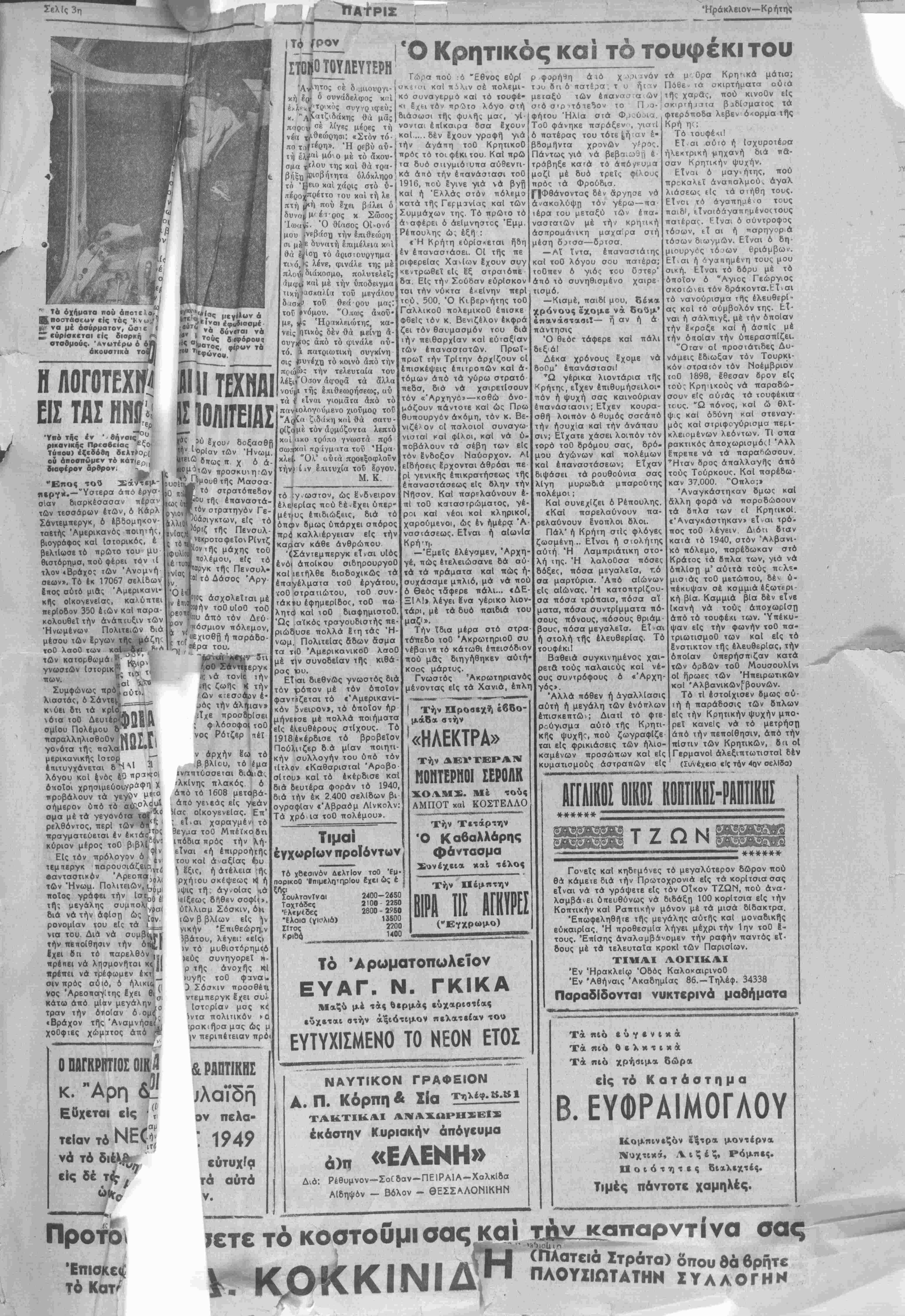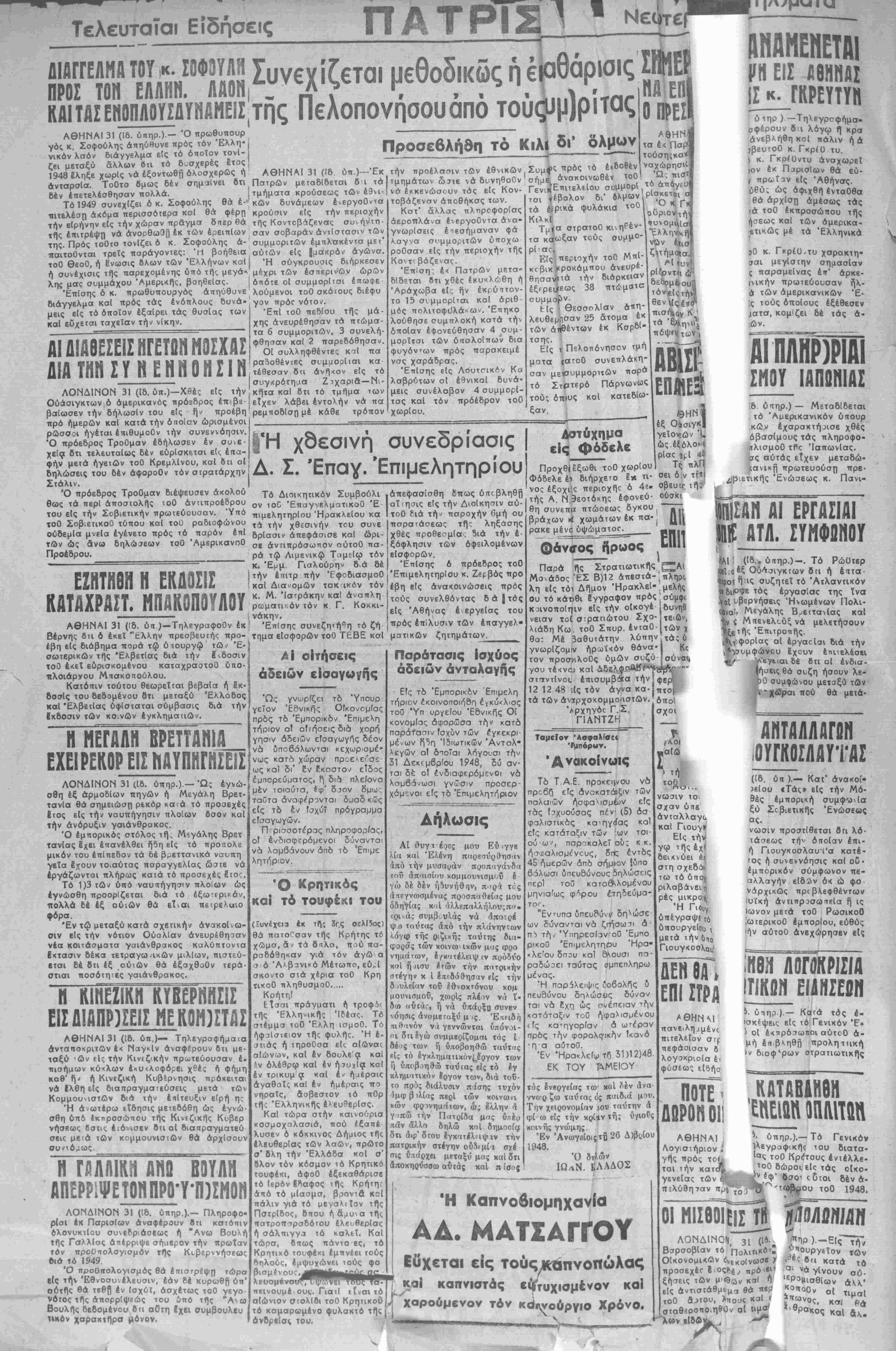 χεία δτι τελευταίως δέν ευρίσκεται ε(<, επα¬ φήν μετά ήγβτών τοθ ΚρεμλΙνου, καί δΐι οί δηλώσεις τού δέν άφοροθν τόν στρατάρχην Στάλιν. Ό πρόεδρος Τροθμαν διέψευσεν άκολού θως τα ττερΐ αποστολάς τοθ άντιπροέδρου τού είς την Σοβιετικήν πρωτεύουσαν. Υπό τοθ ΣοβιετικοΟ τύπου καΐ τοθ ραδιοφώνου ούδεμΐα μνεία εγένετο πρός τό παρόν επί των ώς άνω δηλώσεων τοθ ΆμερικανοΟ Προέδρου. 'ΕττΙ τοθ ττεδΐου τής μά- χης ανευρέθησαν τα πτώμα- τα 6 συμμοριτων, 3 συνελή¬ φθησαν καί 2 παρεδόθησαν. ΟΙ συλληφθέντες καΐ πά ραδοθένΐες συμμοοίται κα τέθεσαν ότι άνή«ον είς τό συγκρότηαα Ζτχαριά—Νι- κήτα καί ότι τό τμήμα των είχεν λάβει εντολήν νά πά κάθε τρόπον την προέλασιν των έθνικών τμημάτων ω?τε νά δυνηθούν νά έκκενώσουν τάς είς Κον- τοβάζεναν αποθήκας των. Κατ' άλλας πληροφορίας άεροΐτλάνα ένεργοθντα άνα· γνωρΐσεις έιεσήμαναν φά λαγγα συμμοριτων ύποχω ροθσαν είς την περιοχήν τής Κον^βάζενας. 'ΕπΙση, έ< Πατρών μετα» δίδεται ότι χθές έκυχλώθη ή Άράχωβα εί; ήν έκτύττον- το 15 σι μμορίται καί αριθ μός πολιτοφϋλά»ων. Έττηκο λούθησε συμπλοκή κατά την οποίαν εφονεύθησαν 4 συμ- μορΐται των ύπαλοίπων δια φυγόν,ων τιρός παρακειμέ νσς χαράδρας. ΈπΙσης είς Λουτπκ^ν Κα λαβρύτων αί έθνικαΐ δυνά¬ μεις συνέλαβον 4 συμμορΐ- τας καί τόν πρόεδρον τοθ χωρίου. ΗΑΕΠ Ο ΦΕΪ —υμφς πρός τό εκδοθέν σήμβ ανακοινωθέν ^οθ Γενι^ΕπιτελεΙου < τσι τέβαλον δι" τα έΦικά φυλάκισ Τ0° Κιλκί Τμία ( τα καΐωξαν τούς συμμ°- τα έ< Πσρ τούσηςκα* ναχώρησιί Ώ; τι ι Ό κ, Γ αύριον τή Εί, περιοχήν τοθ | κΓβικ'ί<ροκάμπου άνευρ&' 'υν θησανΑιά την διάρκειαν Ρι*ντη ώ %3 38 ^ λευθεμίΐσαν 25 άτομα των άιίθέντων έκ τσης. , , Είς ι Πελοπόνησον τμη | ματα ζσ.τοΟ συνεπλάκη-| σαν μεισυμμοριτών ττσρά τό Στρτερό Πάρνωνως Ι τού; δπιυς κοί κατεβίω- ξαν. ΑΗΑγΙΕΗΕΤΑΙ μ» ΕΙΣ ΑΘΗΝΑΣ ΙΣ κ. ΓΚΡΕΪΤΥΗ Ι ύ τηρ ) —Τηλεγρσφήμα» ^φέρουν 8ιι λόγω ή κρα ανεβλήθη κοί τιάλιν ή ά ,βευτοθ κ. Γκρίϋ τυ. ) κ. Γκρίϋντυ αναχωρεί )θν έκ Παρισίων θά εϋ- ι πρωΐαν είς Άθήνσς. ύθύ; ώς αφιχθη ενταύθα θά αρχίση, άμέσως τάς ΐά τοθ έκπροσώπου τής ήσεως καί των άμερικα- ;ετικώς μέ τα 'Ελληνικά οθ κ. Γκρέϋ.τυ χαρακτη- οαι μεγίστην σημασίαν ς παραμείνας έκ" άρκε- ινΐκήν πρωτεύουσαν ήλ- ά των άμερικανικών Ε¬ ίς τούς όποΐους έξέθεσεν χαχά, κομΐζει δέ τάς ά- ών. |Ή χθεσινή συνεδρίασις Δ. Σ. Έπαγ. Έπιμελητηρίου ΕΖΗΤΗΘΗ Η ΕΚΔΟΣΙΣ ΚΑΤΑΧΡΑΣΤ, ΜΠΑΚΟΠΟΥΛΟΥ ΑΘΗΝΑΙ 31 (!δ. ύπ )-ΤηλεγραφοΟν έκ Βέρνης Οτι ό έκεΐ "Έλλην πρεσβευτάς προ¬ έβη είς διάβημα πορά τφ ύιουργώ τώ^ 'Ε- σωτβρικών τής Ελβετίας διά την έκδοσιν τοθ έκε,Χ εύρισκομένου καταχραοτοΰ υπο- πλοιάρνου Μπακοπούλου. Κατόπιν τούτου θεωρεΐται βεβαία ή Ικ- δοσίς τού Βεδομένου ότι μεταξύ Ελλάδος καί Ελβετίας υφίσταται σύμβασις διά την Εκδοσιν των κο.νών έγκληματιών. "ΤΜΕΓΔΛΗ ΒΡΕΤΤΑΝΙΑ_ ΕΧΕ1 ΡΕΚΟΡ ΕΙΣ ΝΑΪΠΗΓΗΣΕΙΣ ΛΟΝΔΙΝΟΝ 31 (16. ύπηρ.).— Ώ; έγνώ σθη έξ αρμοδίων πηγών ή Μεγάλη Βρετ- τανία θά σημειώση ρεκόρ κα ά τό προσεχές Ιτος είς την ναυπήγησιν πλοίων όσον καί την άνόρυξιν γαιάνθρακος. Ό εμπορικάς στόλος τή, Μΐγάλης Βρετ τανΐας 2χει έπανέλθει η*5η είς τό προτχολε μικόν τού επίπεδον τα 6έ β^εττανικά ναυπη γεΐα έχουν τοιαύτας -παραγγελίας ώσιε νά έργάζωνται πλήρως καΐά τό προσεχές εισ Τό 1)3 των υπό ναυπήγησιν πλοίων ώς εγνώσθη προορΐζεται διά τό έξω'ερικόν, πολλά δέ έξ οϋιών θά εΐόαι πειρελαιο φόρα. Έν τφ μεταξύ κατά σχετικήν ανακοίνω¬ σιν είς την νότιον Ούαλίαν ανευρέθησαν νέα κοιτάσματα γαιάνθρακος καλύπτοντα Εκτασιν δέκα τετραγω/ΐκών μιλίων, πιστεύ- εται δέ δτι 