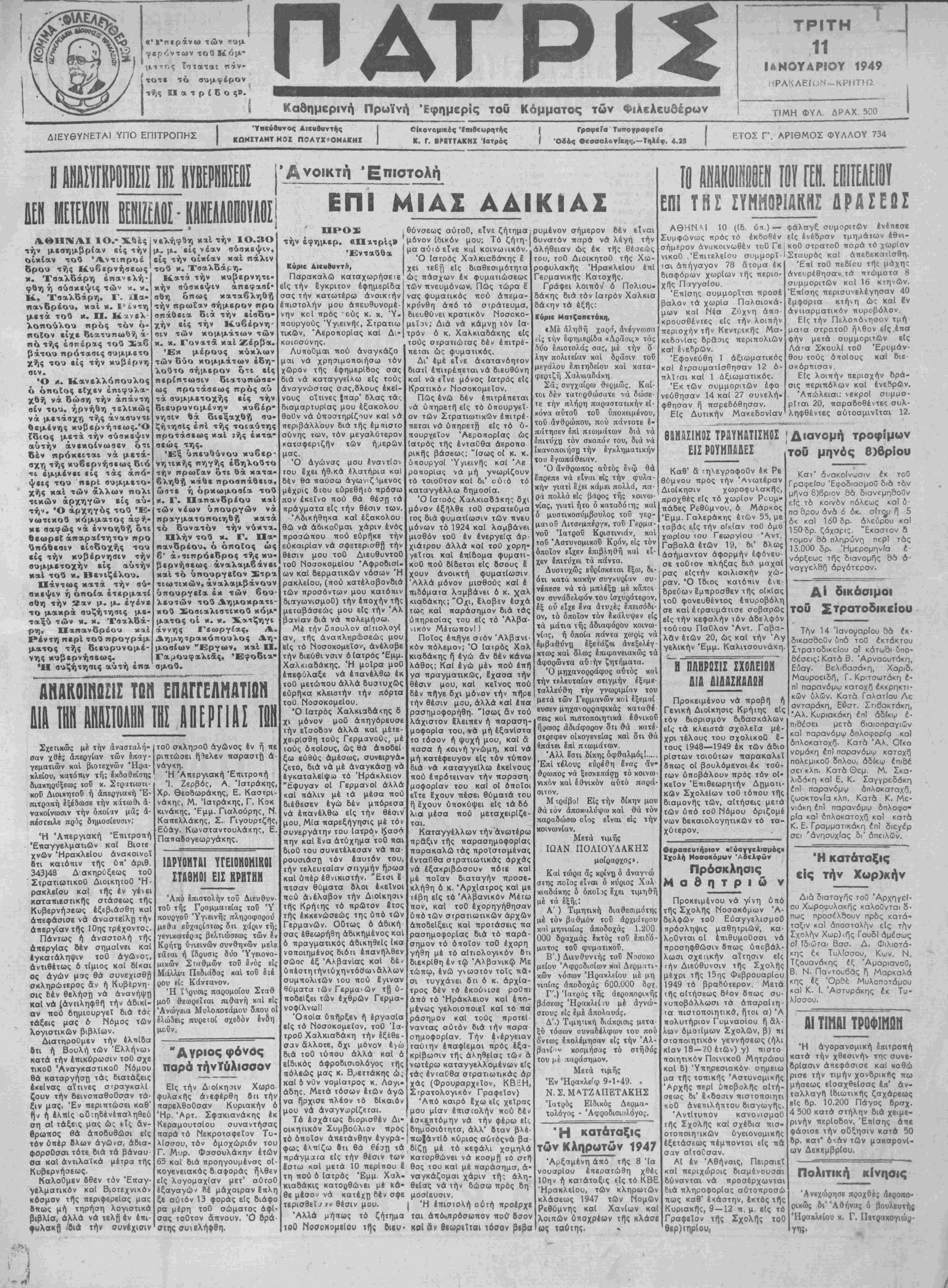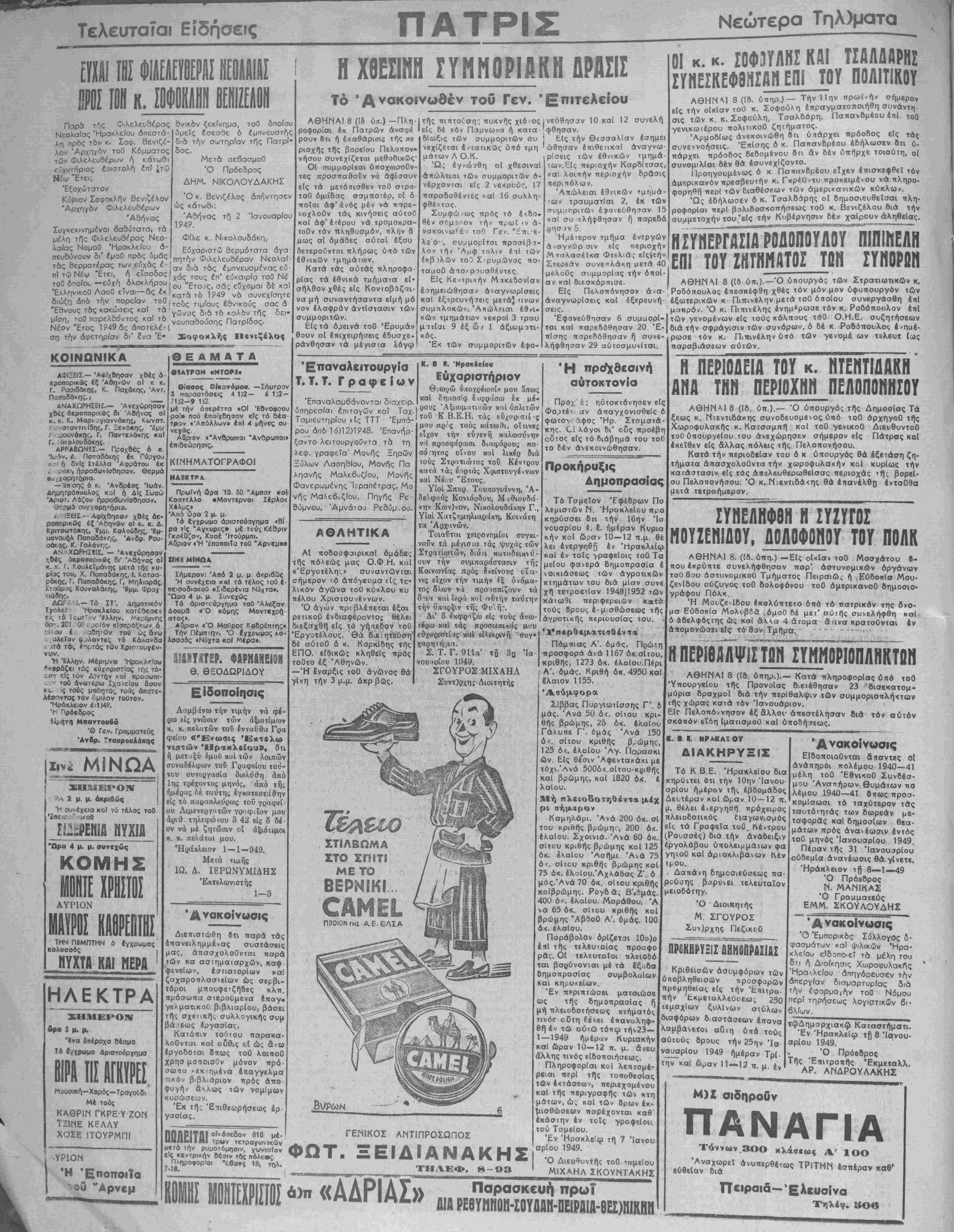Κατ<* την κυβερνητι¬ κήν σύσκεψιν απεφασί¬ σθη όπως καταβληθή την πρωΐαν σήμερον προ σπάθεια διά την είσδο- χήν είς την Κυβέρνη¬ σιν των κομμάτων των κ. κ. Γονατά καί Ζερβά. Έκ μέρους κύκλων των δύο κομμάτων έδη- λούτο σήμερον ότι είς περίπτωσιν διατυπώαε- ως προτάσεως πρός αύ τα αυμμετοχής είς την διευρυνομένην κυβέρ¬ νησιν Θά διεξαχθή συ- ζήτηαίς επί τής τοιαύτης προτάσεως καΐ «ής έκτα' σεώς της. Έξ ύπευθύνου κυβερ¬ νητικάς πηγής έδηλούτο την πρωΐαν ότι θά κατα- βληθή κάθε προσπαθεία, ωατε ή όρκωμοσία τού κ. Γ. Παπανδρέου καί των νέων ύπουργών νά πραγματοποιηθή κατά τό δυνατόν την νύκτα, Πλήν τού κ. Γ. Πα· πανδρέου, ό οποίος ώς β' ά»τιπροεδρος τής κυ βερνήαεως άναλαμβάνει καί τό υπουργείον Στρα τιωτιχών» άναλαμβάνουν υπουργείω έκ των 6ου- λευτών τού Δημοκρατι- χθύ Σοσιαλιστικοΰ κόμ¬ ματος οί κ. κ. Χ,ατζηγι άννης Γεωργίας, Α. Δημητρακόπουλος Δη- μοσίων "Έργων, καΐ Π. Γαμουφαλιάς, Έφοδι»" ομού. ΑΝΑΚΟ1ΝΩΙΙΣ ΤΩΝ ΕΠΑΓΓΕΛΜΑΤΙΩΝ ΤΗ! ΑΟΕΡΓΙΑΙΙ Σχετικώς μέ την άνασταλή- σαν χθέ; απεργίαν των Ιπαγ- γεματιών καί βιοΐεχνών Ηρα¬ κλείου, κατόπιν τή; έκδοθείσης διακηρύξβως τού κ. Στρατιωτι¬ κόν Διοικηΐου ή άπεργιαχή Έ- πιτροτιή εξέδωσβ την κάτωθι α¬ νακοίνωσιν την οποίαν μα; ά- πέσιειλβ πρός δημοσίευσιν: Ή Άπεργιακή Έπιτροπή 'Επαγγελματιών καί Βιοτε χνών Ηρακλείου ανακοινοί ότι κατόπιν τής ύπ' αριθ. 343)48 Δακηρύξεως τοϋ Στρατιωτικοθ ΔιοικητοΟ Η¬ ρακλείου καί τής έν γένει καταπιβστικής στάσεως τής Κυβερνήσεως έξεβιάσθη καί απεφάσισε νά αναστείλη την απεργίαν τής 10ης τρέχοντο;. Πάντως ή άναστολή τής άπεργΐας δέν σημσΐνει καΐ έγκαΐάληψιν τοθ αγώνος, αντιθέτως ό τίμιος καΐ δίκαι ος αγών μος θά συνεχισθή οχληρώτερος αν ή Κυβέρνη¬ σις δέν θελήση νά άνανήψη Καΐ νά [αντιληφθή την αδικί¬ αν πού δημιουργεΐ διά ίάο τάξεις μας ό Νόμος των λογιστικήν βιβλΐων. Διατηροθμεν την έλπΐδα δτι ή Βουλή των Έλλήνων κατά την έπικύρωσιν τοθ σχε τικοθ Άναγκαστικοθ Νόμου θά καταργήση τάς διατάξεις έκεΐνας οΐτινες στραγκαλί ζουν την δεινοπαθοθσαν τά¬ ξιν μας. Έν περιπτώσει καθ' ην ή ελπίς οΟ;ηδένέπσληθεύ οη αί τάξβις μας ώς είς άν- βρωπος θά άποδυθώσι είς Τόν υπέρ δλων άγώνσ, άδια- φθρθθσαι τότε διά τα βάναυ θα καΐ άντιλαϊκά μέτρα τής Κυββρνήσεως. Καλοθμβν δθεν τόν Έπαγ- γβλματικόν καΐ Βιοτεχνικόν κόσμον τής περιφερείας μας βτΐως μή τηρήση λογιστικά βφλίσ, άλλά νά τέλη έν επι θυλακθ /διά την συνέχισιν τοθ σκληροθ αγώνος έν ή πε ριπτώσει ήθελεν παραστη ά νάγκη. Ή Άτιεργιακή Έπιτροπή Ί. Ζερβός, Α. Ίατράκης, Χρ. Θεοδωράκης, Ε. Καστρι¬ νάκη;;, Μ. Ίατράκης, Γ. Κοκ κινάκης, Έμμ. Γιαλούρης, Ν. Καπελλάκης, Σ. Γιγουρτζής, Εύαγ. Κωνσταντουλάκης, Ε. Παηαδογεωργάκης. ΙΔΡΥΟΗΤ&1 ΥΓΕΙ0Η0Η1Κ01 ΙΤΑΘΜΟ1 ΕΙΣ ΚΡΗΤΗΝ 9Ακ6 επιστολήν τοΰ Διευθυν¬ τού τής Γραμματείας τοθ 'Υ πουργοΰ Ύγιεινής πληροφοοού μεθα ευχαρίστως δα χάριν τής γενικωτέρας βελτιώσβως των έν Κρήττ] ύγιεινών συνθηχόόν μελε ϊάται ή ίδρυσις δύο Ύγβιονο- μικών Σταθμών τοθ Ινός είς Μάλλια Πεδιάδος καί τοΰ έ (έ ρου είς Κάντανον. 'Η Ίδρυσις παρομοίου Σταθ μού θεωρεΪΓαι πιθανή καί είς 'Ανώγεια Μυλοποτάμου δπου οί έλάώεις πυρεΐοί σχεδόν ένοη μοΰν. "ΑΥΡΐος φόνος παρά τήνΤύλισσον Είς την Διοίκησιν ρ φυλακής άνεφέρθη δα την παρελθούσαν Κυριακήν ό Ήρ. Αρτ. Σφακιανάκης έκ ΚεραμουτσΙου συναντήσας παρά τό Νεκροταφείον Τυ¬ λίσσου, τόν ομοχώριον τού Γ. Μυρ. Φασουλάκην έτών 65 καί διά προηγουμένας οΐ- κογενειακάς διαφοράς ή.θεν είς λογομαχΐαν μβτ' αύτοθ έξαγαγών 8έ μάχαιραν Ι