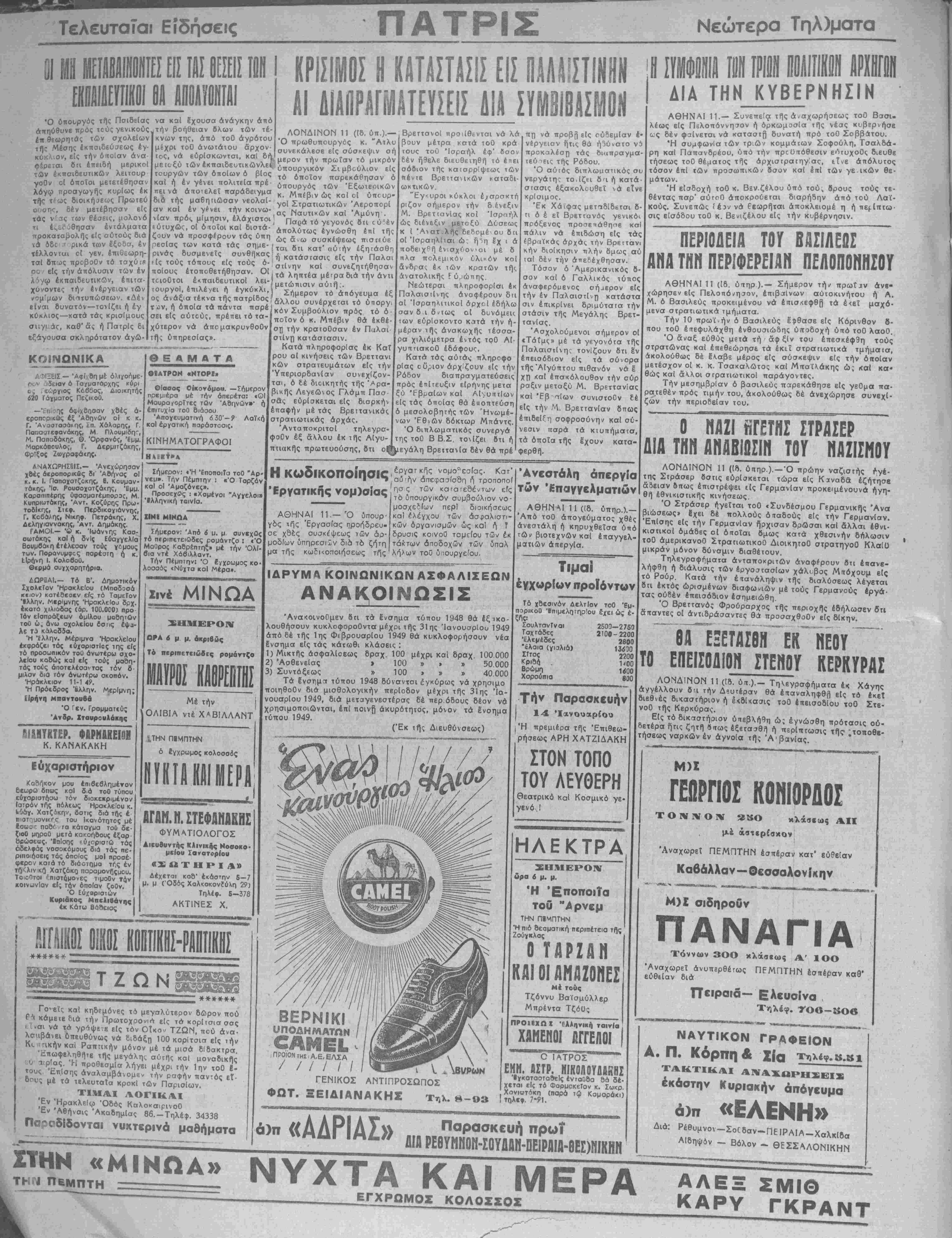 των '£π<αγγελματιών ΑΘΗΝΛΙ 11 ((δ. ύπηρ.).— Άπό τοθ άπογεύματο; χθές ανεστάλη ή κηρυχθείσα υπό των βιοτεχνών καί έπαγγβλ- ματιών άπεργία. *—" ■ - Τιμαί εγχωρίων προϊόντων Τό χθεσινόν Δελτίον τοθ Έμ· πορικοθ Ίπιμελητηρ'ου δχει ώς ε¬ ξής: Σουλτανίναι Ταχτάδες Ελεμέδες "ελαια (γισλιά) ΙΤτος Κριθή Βρώμη Χορούπια 2500-2750 2100-2200 2800 136*00 2200 1Ό0 16*00 800 ΗΙΥΜΙΙΤΡΙ1101ΑΡΙΟΝ ΔΙΑ ΤΗΝ ΚΥΒΕΡΝΗΣΙΝ ΑΘΗΝΑΙ 11.— Συνεπεία τής αναχωρήσεως τοθ Βασι¬ λέως είς Πίλοπόννησον ή όρκωμοσία τής νέας κυβερνήσε άς δέν φαίνεται νά καταστή δυνατή πρό τοθ Σοββάτου. *Η συμφωνΐα των τρώ^ κομμάτων Σοφούλη, Τσαλδά- ρη καί Παπανδρέου, υπό την προϋπόθεσιν εΛΐυχοΟς διευθβ τήσεως τοΟ θέματος τής άρχισΐρατηγ άς, ιΐνε άπόλυτος τόσον επί των προσωπικών όσον καί επί των γε ικών θε- μάτων. Ή είσθοχή τοθ κ. Βεν ζίλου υπό τού, βρους τούς τε- θέντας παρ' αύτοθ άποκρούεται διαρήδην άπό τού Λα(- κούς. Συνεπώς ίέσν νά θεωρήται άποκλειομέ η ή τΐε^ίπτω σις είσόδου τοθ κ. Βενιζέλου είς την κυβέρνησιν. ΠΕΡΙΟΔΕΙΑ ΤΟΥ ΒΑΣΙΛΕΩΣ ΑΝΑ ΤΗΝ ΠΕΡΙΦΕΡΕΙΑΝ ΠΕΛΟΠΟΗΗΣΟΥ ΑΘΗΝΑΙ 11 (Ιδ ύπηρ).— Σήμερον τή./ πρωΐαν ανε¬ χώρησεν είς Πελοπόνηαον, έπιβοτΐνων αύτοκινήτου ή Α. Μ. ό Βασιλεύς προκειμένου νά έπισΛεφθ{) τα έ<εΐ μαχό· μενά στρατιωτικά τμήματα. Τήν 10 πρωϊνήν ό Βασιλεύς έφθασε είς Κόρινθον 8- που τοθ επεφυλάχθη ένθουσιώδης ύητοβοχή υπό τοΟ λαοθ. Ό άναξ ευθύς μετά τή άφ ξίν τού επεσκέφθη τούς στρατώνας καί έπεθεώρησε τα έκεΐ στραηωτικά τμήμαΐσ, ακολούθως δέ έλαβε μέρος είς σύσκεψιν είς την όποιαν μετέσχον οί κ. κ Τσακαλώτος καί ΜπαίΛάκης ώ; καί κα· θώς καί άλ,λοι στραπωτικοί παράγοντες. Τήν μεσημβρίαν ό βασιλεύς παρεκάθησε είς γεθμα πα¬ ρατεθέν πρός τιμήν τού, ακολούθως δέ ανεχώρησε συνεχί- "ων τήν περιοδείαν τού. Ο ΝΑΖΙ ΚΓΕΤΗΣ ΣΤΡΑΣΕΡ ΔΙΑ ΤΗΝ ΑΗΑΒΙΩΣΙΗ ΤΟΥ ΝΑΖΙΣΜΟΥ ΛΟΝΔΙΝΟΝ 11 (18. ΰπηρ).—Ό πρώην ναζιστής ίγέ- της Στράσβρ βστις ευρίσκεται τώρα είς Καναδα εζήτησε άδειαν δπως έπιστρέψει ίΐς Γερμανίαν προκειμένουνά ήγη- 9γ) έθνικιστικής κινήσεως Ό Στράσερ ήγεΐται τοθ «Συνδέσμου Γερμανικής Άνα βιώσεως» 8χει δέ πολλούς άιταδούς είς τήν Γερμανίαν. Έτιίσης είς την Γερμανίαν ήρχισαν δρώσαι καί άλλαι έθνι- κιστικαί όμάθες οί οποίαι 6μως κατά χθεσινήν δήλωσιν τοθ άμερικανοθ ΣτραπωτικοΟ ΔιοικηΐοΟ στρατηγοθ Κλαΐϋ μικράν μόνον δύναμιν βιαθέτουν. Τηλβγραφήματα άνταποκριτών άναφίρουν βτι επανε¬ λήφθη ή διάλυσις των έργοστασίων χάλυβος Μπόχουμ είς τό Ρούρ Κατά την επανάληψιν της διαλύσεως λέγβται ότι έκτός ωρισμένων διαφωνΐών μέ τούς Γερμανούς εργά¬ τας ούβέν επεισόδιον εσημειώθη Ό Βρεττανός Φρούραρχος τής περιοχάς εδήλωσεν δτι άπαντες οί άντιδράσαντες θά προσαχθοθν είς δίκην. Παρασκευήν 14 Ίανουαρίου Ή πρεμιέρα τής "Επιθεω¬ ρήσεως ΑΡΗ ΧΑΤΖΙΔΑΚΗ ΣΤΟΝ ΤΟΠΟ ΤΟΥ ΛΕΥΘΕΡΗ Θεατρικό καί Κοσμικό γε· γενό Ι ΓΕΝΙΚΟΣ ΑΝΤΙΠΡΟΣΩΠΟΣ ΦΩΤ. ΞΕΙΔΙΑΝΑΚΗΣ Τηλ. β-©3 ΗΛΕΚΤΡΑ 32ΗΜΕΡΟΝ δρα β μ. μ. Ή 'Εποποιΐα τού "Δρνεμ ΤΗΜ ΠΙΜΠΤΗΜ Ή πιό θεοματική περιπέτεια τής Ζοϋγκλος Ο ΤΑΡΖΑΝ ΚΑΙ ΟΙ ΑΜΑΖΟΝΕΣ Μέ τούς Τζόννυ Βαίσμύλλβρ Μπρέντα Τζόϋς ΠΡΟ1ΕΧΩ Ι "6ΑΑηνική ταινία Χ3ΜΕΠ0Ι ΑΓΓΕΟΟΙ Ο ΙΑΤΡΟΣ ΕΜΜ. ΑΣΤΡ. ΝΙΚΟΛΟΥΔΑΚΗΣ Ίγκαταοτοδεΐς ίνταθβα θά δ*· χβται είς τό ΦορμοκεΤον κ. Ιωκρ Χανιβτάκη (παρά τώ Κουαράκι) τολεο. 7*Ρ1. ά)π " "·»—■........Μΐειι^ΙΙΙΙΙΙΙε—■ ιιι —|-~~—ε|-, «ΑΑΡΙΑΣ» ΘΑ ΕΞΕΤΑΣΘΗ ΕΚ ΝΕΟΥ ΤΟ ΕΠΕΙΣΟΔΙΟΝ ΣΤΕΗΟΥ ΚΕΡΚΥΡΑΣ ΛΟΝΔΙΝΟΝ 11 (·δ.ύπ).-ΤηνεγΡσφήμΟτα έκ Χάγης άγγέλλουν Οτι την Δευτέραν θά έτταναληφθ^ ε[ς τό έκεΧ διεθνές δικαστήριον ή έκδΐκασις τοθ βπεισοδίου τοθ Στβ- νοθ τής 