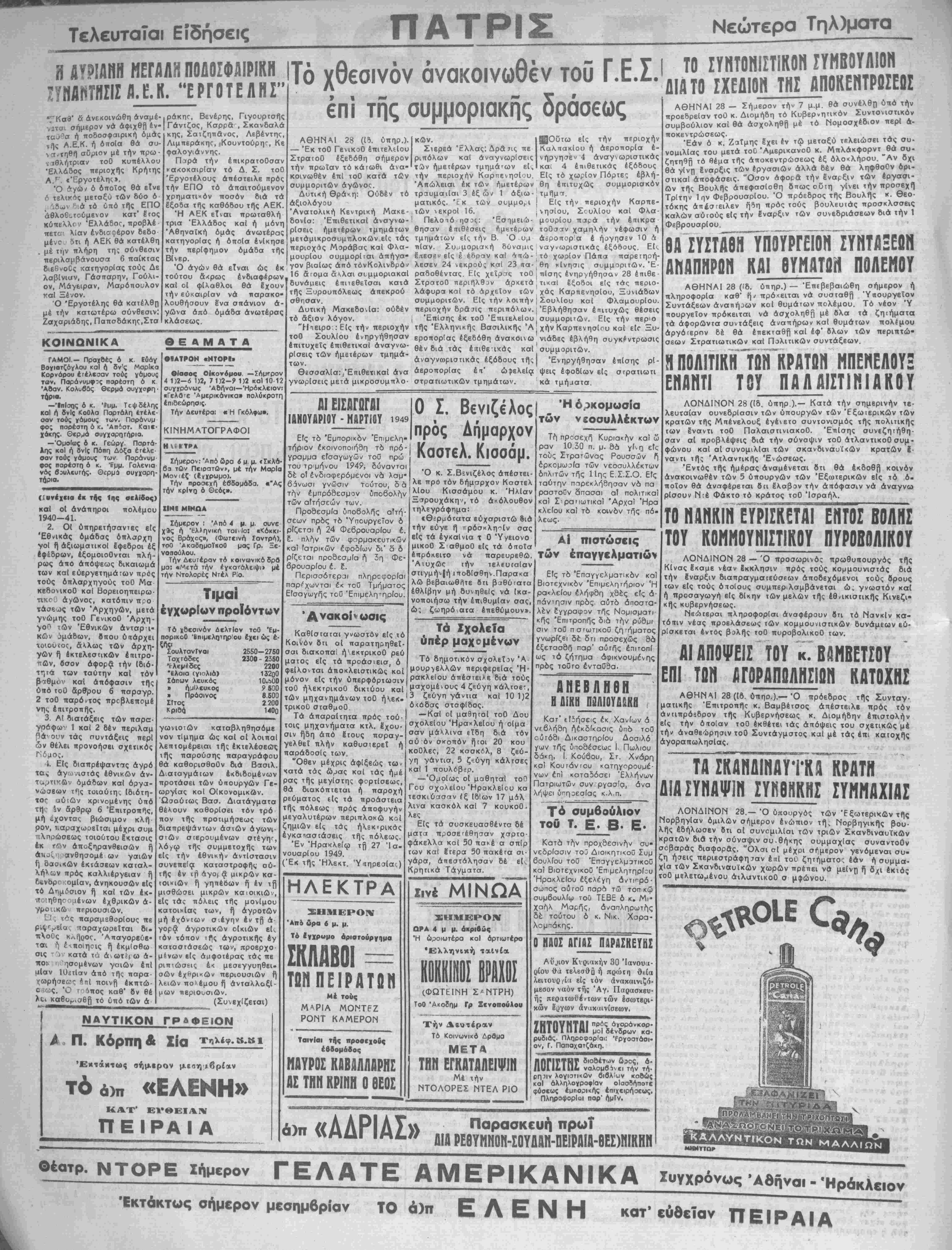 πληροφορΐα καθ" ή^ πρό<ειται νά συσταθή "Υπουργείον Συντάξεων άναπήοων κοΙ θυμάτων πολέμου. Τό νέον "Υ πουργεΐον πρόκειται νά άσχοληθή μέ δλα τά ζηιήματα τά αφορώντα συντάξεις άναπήρων καΐ θυμάτων πολέμου αργότερον 8έ θά έπεκταθή καΐ έφ' δλων των περιπτώ- σεων Στρατιωτικών καΐ Πολιτικών συντάξεων. Η ΠΟΛΙΤΙΚΗΤθΝ'ΚΡΑΤΩΝ ΜΠΕΝΕΛΟΥΞ ΕΝΑΝΤΙ ΤΟΥ ΠΑΑΑΙΣΤΙΗΙΑΚΟΥ ΛΟΝΔΙΝΟΝ 28 (16. ύπηρ ).— Κατά την σημερινήν τε¬ λευταίαν συνεδρίασιν των ύπουργών των Έξωιερικών των κρατών τής Μπένελουξ εγένετο συντονισμός τής πολιτικάς των Ιναντι τοθ ΠαλαισΐινιακοΟ. 'Επίσης συνεζητήθη- σαν αί προβλέψεις διά την σύναψιν τοθ άτλαντικοΟ συμ- φώνου καΐ αί συνομιλίαι των σκανδιναυίκών κρατών έ¬ ναντι τής Άτλαντικής Ενώσεως. "Εντός τής ημέρας άναμένεται δτι θά έκδοθ{| κοινόν ανακοινωθέν των 5 ϋπουργών των "Εξωτερικών είς τό ο¬ ποίον θά άναφέρεται 8α δλαβσν την απόφασιν νά άναγνω ρΐσουν Ντέ Φάκτο τό κράτος τοθ Ίσραήλ. ΤΟ ΝΑΝΚΙΝ ΕΥΡΙΣΚΕΤΑΙ ΕΝΤΟΣ ΒΟΛΗΣ ΤΟΥ ΚΟΜΜΟΥΗΙΣΤΙΚΟΥ ΠΥΡΟΒΟΛΙΚΟΥ ΛΟΝΔΙΝΟΝ 28 — Ό προσωρινάς πρωθυπουργός τής ΚΙνας έκαμε νέαν Εκκλησιν πρός τούς κομμουνιστάς διά την έναρξιν διαπραγμαΐεύσεων άποδεχόμενοι τούς ορους των είς τούς όΐτοΐους συμπεριλσμβάνεται ώ, γνωστόν κα[ ή προσαγωγή είς δίκην των μελών τής έθνΐκισΐικής Κινεζι· κης κυβερνήσεως. Νεώτεραι πληροφορίαι άναφέρουν δτι τό Νανκΐν κα¬ τόπιν νέας προελάσεως των κομμουνιστικών δυνάμεων ευ¬ ρίσκεται έντός βολής τοθ πυροβολικοθ των. 5, ΑΙΑΠΟΨΕΙΣ ΤΟΥ κ.Βί1ΜΒΕΤΣ0Υ': ΤΩΝ ΑΓΟΡΑΠΟΛΗΣΙΟΗ ΚΑΤΟΧΗΣ ΑΘΗΝΑΙ 28(16. ύπηο.).— Ό πρόεδρος τηςΣυνταγ- ματικής "Επιτροπής κ. Βαμβέτσος απέστειλε πρός τόν άνιιπρόϊβρον τής Κυβερνήσεως κ. Διομήδην επιστολήν είς την όιτοίαν τοθ έκθέτβι τάς άπόψεις τού σχετικώς μέ την αναθεώρησιν τοθ Συντάγμστος καΐ μέ τάς επι καιοχής άγοραπωλησΐας. ΤΑ ΣΚΑΝΔΙΝΑΥΪΚΑ ΚΡΑΤΗ ΔΙΑ ΣΥΝΑΨΙΝ ΣΥΗΟΗΚΗΣ ΣΥΜΜΑΧΙΑΣ ΛΟΝΔΙΝΟΝ 28.—Ό ύπουργός των "Εξωτερικών τής ΝορβηγΙαν ομιλών σήμερον ενώπιον τή, Νορβηγικής βου- λ.ής εδήλωσεν ότι αί συνομιλΐαι των τριών Σκανοιναυΐκών κρατών διά την σύναψιν ου.θήκης συμμαχίας συναντοθν σοβαράς διαφοράς. "Ολαι οί μέχρι σήμερον γενόμεναι συ- ζη ήσεις περιεστράφη ΐαν επί τοΐ) ζητήματος εάν ή συμμα- [Ια των Σκανδιναυίκών χωρών πρέπει νά μείνη ή δχι έκτός οθ μελετωμένου άιλαντικοθ σ μφώνου. ΝΤΟΡΕ Σήμερον ΓΕΛΑΤΕ ΑΜΕΡΙΚΑΝΙΚΑ Χ»ΥΧρ6νως Άβην Έκτάκτως σήμερον μεσημβρίαν ΤΟ ά)π ΕΛΕΝΗ κατ' ευθείαν Π ΕΙΡ ΑΙΑ αι - Ηράκλειον