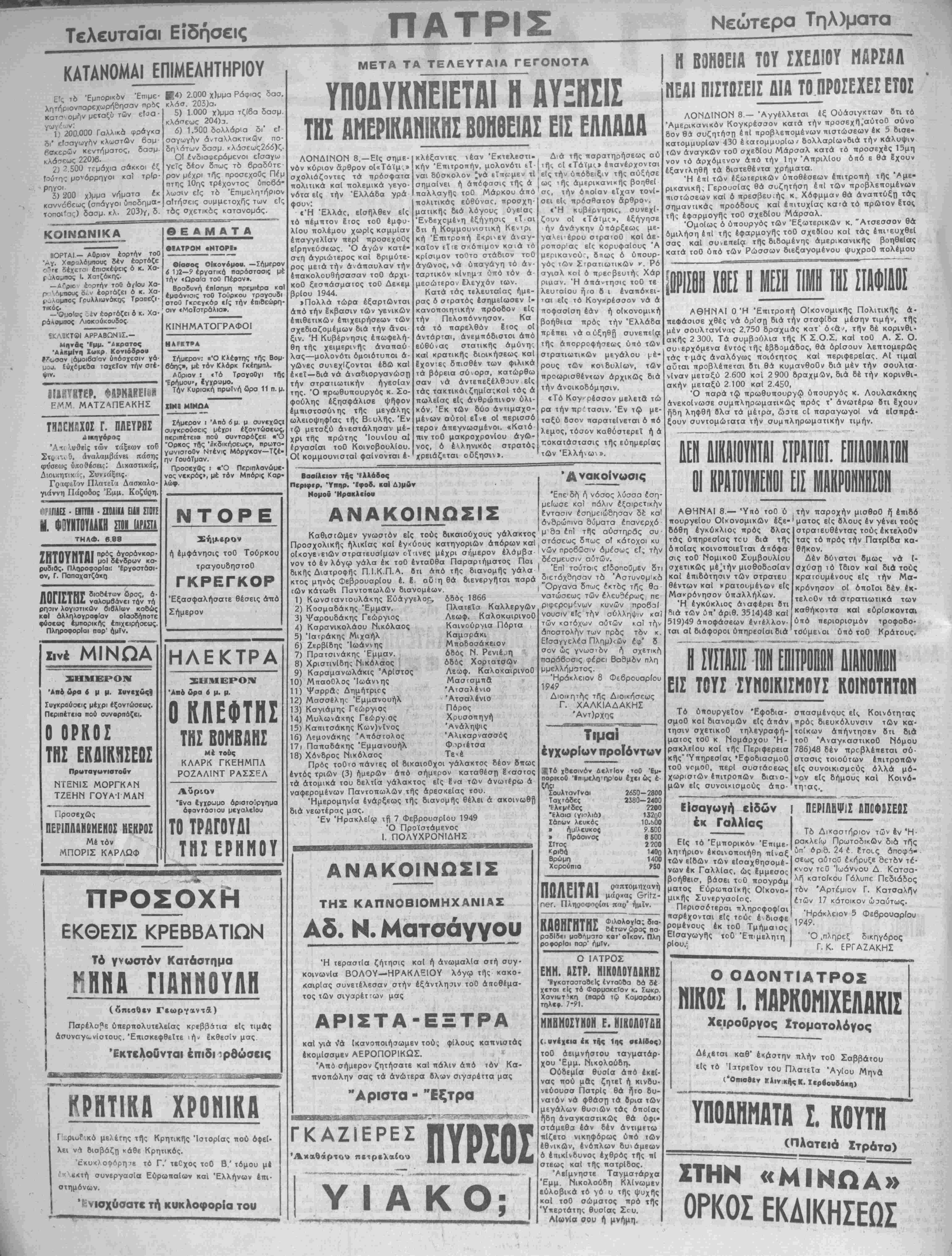 κατομμυρΐων 430 έ<αιομμυρΙωι' δολλαρΐωνδιά την κάλυψιν των άναγκων τοθ σχεΒίου Μαρσάλ κατά τό προσεχές 15μη νόν τό αρχόμενον άπό την Ιην Απριλίου δπό β θά Ιχουν έξαντληθή τα βιατεθέντα χρήματα. Ή επ! των εξωτερικών ΰποθέσεων έπιτροπή τής 'Λμε- ρικανική, Γερουσίας θά συζητήση επί των προβλεπομένων πιστώσεων καί ό ττρεσβευ.ής κ Χόφμμαν θά αναπτύξη τάς σημαντικάς προόδους καί επιτυχίας κατά τό πρώτον Ιτος τής έφσρμογής τοθ σχεδίου Μαρσάλ. "Ομοίως ό ύπουργός των Εξωτερικών κ. Άτσεσσον θά: ομιλήση έιί τής έφαρμογής τοθ σχεδίου καί τάς επιτεθχθεί σας καί συνεπεία τής διδομένης άμερικανικής βοηθείας κατά τοθ υπό των Ρώσσων διεξαγομένου ψυχροθ πολέμου »1 ΧΟΕΣ ΗΙΙΗ II ΑΘΗΝΑΙ 0 Ή Έπιτροπή Οίκονομικής Πολιτικής α¬ πεφάσισε χθές νά όρ'ση διά την σταφίδα μέσην τιμήν, τής μέν σουλτανίνης 2.750 δραχαάς κατ ό<δ^, την 8έ κορινθι· ακής 2 300. Τα συμβουλια τής Κ Σ Ο Σ. καί τοθ Α. Σ. Ο. συιερχόμενα έντός τής εβδομάδος, θά δρίσουν λεπτομερώς τάς τ μάς αναλόγως ποιότητος καί περιφερείας. Αί τιμαί αυται προβλέπεται ότι θά κυμανθοθν διά μέν την σουλτα¬ νίναν μεταξύ 2 600 κσί 2 900 δραχμων, διά δέ την κορινθι- ακήν μεταξύ 2 100 καί 2 450, Ό παρά τώ πρωθυπουργώ ύπουργός κ. Λουλακάκης ανεκοίνωσε συμπληρωματικών πρός τ* ανωτέρω Οτι Ιχουν ήδη ληφθή Βλα τα μέιρα, ώοτε οί παραγωγοί νά είσπρά- ξουν συντομώΐατα την συμπληρωματικήν τιμήν. Βασίλειον τής Ίλλάβος Πΐριφερ. Ύπηρ. 'ίφοδ. καί Λ)μύν - » ' < ι ' » Νομοΰ Ήρακλ«ϊου . ; 4 ·* ? - ' '. , ΑΝΑΚΟΙΝΩΣΙΣ Καθιστώμεν γνωστόν είς τούς οικαιούχους γάλακτος Προσχολικής ήλικΐας καί έγ^ύους κατηγοριών άπόρων καί οίκογενειών στρατευσίμων οΐτινες μέχρι σήμερον έλάμβα νόν τό έν λόγω γάλα έκ τοθ ενταύθα Παραρτήματος Παι δικής Διατροφής ΠΙΚΠ.Α. ότι άπό τής διανομής γάλα κτος μηνός φεβρουαρίου έ. Ε ου η θά διενεργήται παρά των κάτωθι Παντοπωλων διανομέων 1) Κωνσταντουλάκης Ευάγγελος δδός 1866 2) Κοσμαδάκης Έμμαν. 3) Ψαρουδάκης Γεώργιος 4) Καρανικολάου Νικόλαος 5) Ίατράκης Μιχαήλ 6) Ζερβίδης "Ιωάννης 7) Πρατσινάκης Έμμαν. 8) ΧριστινΙδης Νικόλαος 9) Καραμανωλάκις ΆρΙστος 10) Μπαοθλος Ιωάννης 11) ΨαρρΛ; Δημήτριος 12) Μασσελης Εμμανουήλ 13) Καγιάμης Γεώργιος 14) Μυλωνάκης Γεώργ ος 15) Καπιτσάκης Κων)νΐνος 16) Λεμονάκης Απόστολος 17ι Παπαδάκης Εμμανουήλ Πλατεΐα Καλλεργών Λεωφ. ΚαλοκαιρινοΟ Καινούργια Πόρτα Καμσράκι ΜποΒοσάκειον όδός Ν Ρενιέ^η όδός Χορτατσών Λεωφ. ΚαλοκαιρινοΟ Μασταμπά Άτσαλένιο Άτσαλένιο Πόρος Χρυσοπηγή Άνάληψις Άλικαρνασσός φιρΐέτσα 18) Χόνδρος Νικόλαος Πρός τοθτο πάντες οί βικαιοθχοι γάλακτος δέον δηως έντός τριών (3) ημερών άπό σήμερον καταθέση έκαστος τα άτομικά τού δελτία γάλακτος είς Ενα των ανωτέρω ά ναφερομένων Παντοπωλων τής άρεσκεΐας τού. ΉμερομηνΙα ενάρξεως τής διανομήν θέλει ά ακοινωθή διά νεωτέρας μας. Έν Ηρακλείω τ.β 7 Φεβρουσρίου 1949 Ό Προίστάμενος ?'■< ", Ι. ΠΟΛΥΧΡΟΝΙΔΗΣ " ΑΝΑΚΟΙΝΩΣΙΣ ΤΗΖ ΚΑΠΝΟΒΙΟΜΗΧΑΝΙΑΣ Αδ. Ν. Ματοάγγου Ή τβραστΐα ζήτησις καί ή άνωμαλΐα στή σογ- κοινωνία ΒΟΛΟΥ—«ΗΡΑΚΛΕΙΟΥ λόγω τής κακο- καιρΐας συνετέλεσαν στήν εξάντλησιν τοθ άποθέμα· τος των σιγαρέτ-ων μας Ανακοίνωσις Έπε δή ή νόσος λύσσα εση¬ μείωσε κοΐ πάλιν εξαιρετικήν Εντασιν έσημειώδησαν δέ κα όνδρώπινα σόματα ίπανερχό μ 9α επ! τής αυστηράς συ στάσεως δπως οί κάτοχοι κυ νών προβώσιν όμέσως εί, τ?ι δέσμευσιν αυτών. Ι Επ) τούτοις είδοποθμεν 8τ διετάχθησαν τα Άστυνθμ'κα | "Οργανα δπως εκτδς τΠς θα νατώσεως των έλευ9έρως πε ριφερομ^νων κυνών προβαΐ νουσιν είς τ^ν σύλληψιν κα των κατόχων αυτ