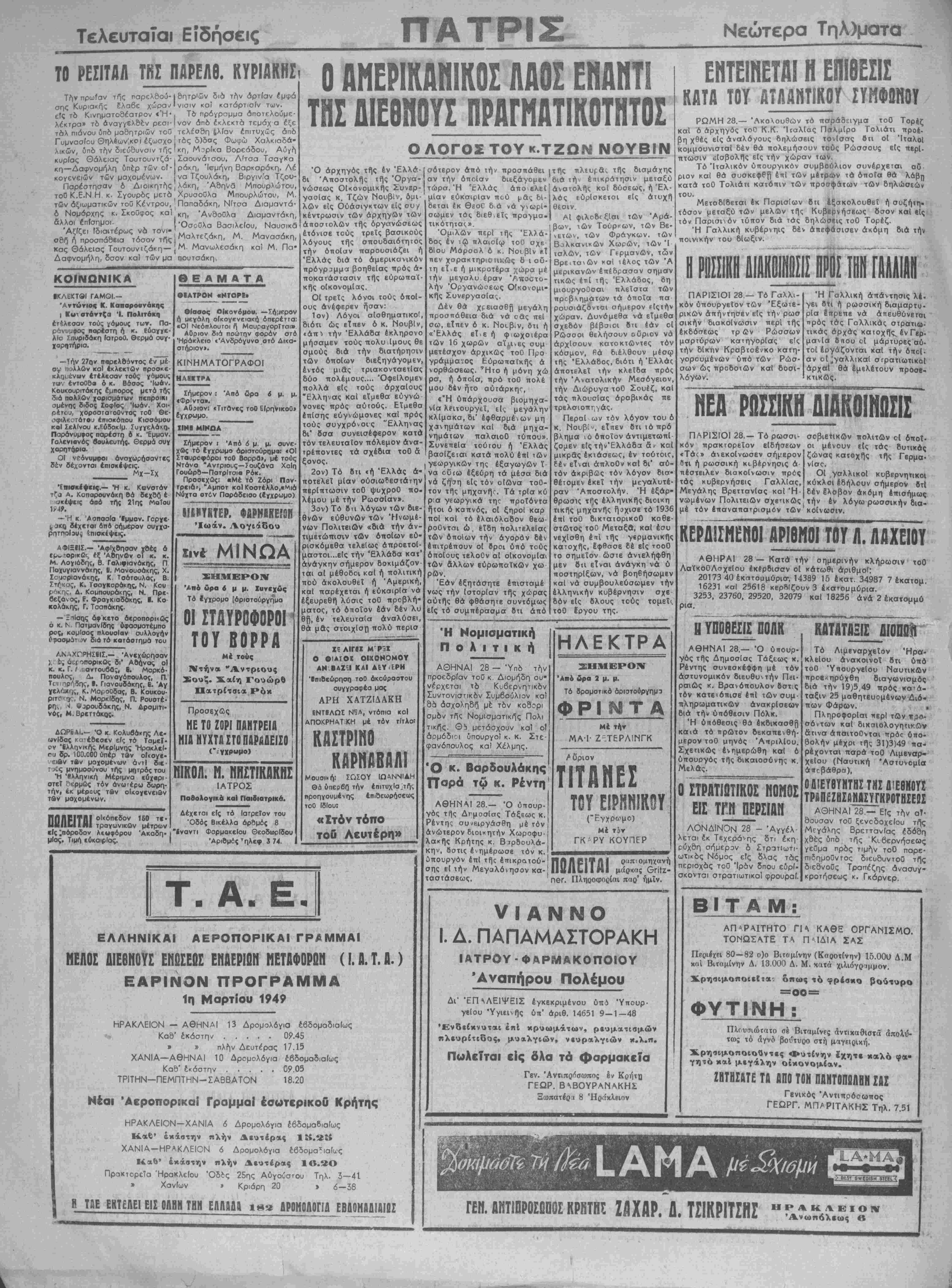 €Τά<;» ανεκοίνωσεν σήμερον βτι ή ρωσσική κιβέρνησις ά πέστειλεν διακοίνωσιν πρός τάς κυβερνήσει ΓαλλΙας, Μεγάλης Βρεττανίας κοΙ'Η-ί νωμένων Πολιτειών σχεηκώς μέ τόν έπαναπατρισμύν των σοβιεηκών πολιτών ο[ δποΐ· οί μένουν είς τάς Βυτικάς ζώνας κατοχής τής Γερμα· νίσο. ΟΙ γσλλικοΐ κυβερνητικοι κύκλοΐ έθήλουν σήμερον 8x1 6έν ίλοβον άκόμη επισήμως την έν λόγω ρωσσικήν δια¬ κοίνωσιν. ΚΕΡΔΙΣΜΕΝΟΙΑΡ18Η01 ΤΟΥ Λ. ΛΑΧΕΙΟΥ ΑΘΙ1ΡΑΙ 28 — Κατά την σημερινήν κλήρωσιν τοθ ΛαΐκοΟΛσχεΙου εκέρδισαν οί κάτωθι άριθμοί: 20173 40 έκατομμύρισ, 143Θ9 15 έκατ. 34987 7 έκ,ατομ. 16231 καΐ 25618 κερΒΙζουν 3 ίκατομμύρια. 3253, 23760, 29520, 32079 καΐ 18256 άνά 2 έκατομμό ρια. Η ΥΠΟΘΕΣΙΣ ΠΟΑΚ , ΚΑΤΑΤΑΞΙΣ ΑΙΟΠΟϋ ΑΘΗΝΑΙ 28.— Ό ύπουρ- γός τής Δημοσίας Τάξεως κ. Ρέντης συνεσκέφφη μέ τόν αστυνομικόν διευθυντήν Πει¬ ραιώς κ. Βρανόπουλον όστις τόν κατειόπισε επί των συμ¬ πληρωματικών άνσκρίσεων διά την υπόθεσιν Πόλκ. Ή υπόθεσις θά έκδικασθβ καιά τό πρώτον δεκατιενθή- μερον τοθ μηνός Απριλίου. Σχεηκώς ένημερώθη καί δ ύηουργός τής δικαιοσύνης κ. Μελας. Ο ΣΤΡΑΤΙΩΤΙΚΟΣ ΝΟΗΟΣ ΕΙΣ ΤΓΝ ΠΕΡΣΙΑ» ΛΟΝΔΙΝΟΝ 28 - "Αγγέλ¬ λεται έκ Τεχεράνης δτι έκη ρύχθη σήμερον ό Στρ^τΐωτι- ωτιχδς Νόμος είς δλας τάς περιοχάς τοθ Ίρδν δπου εύρί· σκοντσι στρατιωτικαι φρουραί. Τό Λιμεναρχείον Ηρα¬ κλείου ανακοινοί δτι υπό τοθ 'ΥπουργεΙου Ναυτικων προεκηρύχθη διαγωνισμός διά την 19^5,49 πρός κατά¬ ταξιν 25 μαθητευομένων Διό- τιων Φάρων. · Πληροφορίαι τΐερΙ των «ρο- σόντων καΐ δικαιολογηακων άτινα άπαιτοθνται πρός υπο· βολήν μέχρι τής 31)3)49 πά- ρέχονται παρά τοθ Λιμβναρ- χεΐου (Ναυτική Άστυνομία άτΐοβάθρσ) ΟΔΙΕΥΘΥΝΤΗΣΤΝΙΔ1Ε8ΝΟΥΣ ΤΡΑΠ£ΖΗΣΟ|ΟΣΥΓΚΡΟΤΗΣΕ&£ ΑΘΗΝΑΙ 28 — Είς την αΤ· δουσαν τού ξενοδοχεΐου τγΤ<; Μεγάλης Βρεττανίας εδόθη χθές ύπδ τής Κίβερνήσεως γεΰμα πρός τιμίων τοθ παρε· πιδημοθντος διευδυντοθ τ^ς διεθνοθς Τραπέζης ανασυγ¬ κροτήσεως κ. Γκάρνερ. ΒΙΤΑΜ; ΑΠ^ΡΑΙΤΗΤΟ Π λ ΚΑθΕ ΟΡΓΑΝΙΣΜΟ ΤΟΝΩΣΑΤΕ ΤΑ ΠΜΔΙΑ ΣΑΣ Περιέχει 80 — 82 ο)ο Βιτομίντιν (Καοοτίνην) 15.000 Δ.Μ χοί Βιΐαμίνην Δ. 13.000 Δ. Μ. χατά χιλιόγραμμον. ΧρησιμοποιεΙ.α. όπως τό φρέσκο βούτυρο ΦΥΤΙΝΗ:°°~ Πλουσιώτατο σέ Βιταμίνες άνπχαθιστά απολύ¬ τως το άγνό βούτυρο στή μαγειρική. Χ.ρησιμοποιοθντες Φυτίνην έχητε κ*λό «*· γητό καΐ μεγάλην οίκονομίαν. ΖΗΤΗΣΑΤΕ ΤΑ ΑΠΟ ΤΟΝ ΠΑΝΤΟΠΟΛΗΝ ΣΑΣ Γενικάς Άντιπρόσωπος ΓΕΩΡΓ. ΜΠΑΡΙΤΑΚΗΣ Τηλ. 7.51 ΓΕΝ. ΒΗΤΙΠΡΟΣΜΟΣ ΚΡΗΤΗΣ ΖΑΧΑΡ. Δ. ΤΣΙΚΡΙΤΖΗΣ ΗΡΑΚΛΕΙΟΝ Άνωπόλεως β