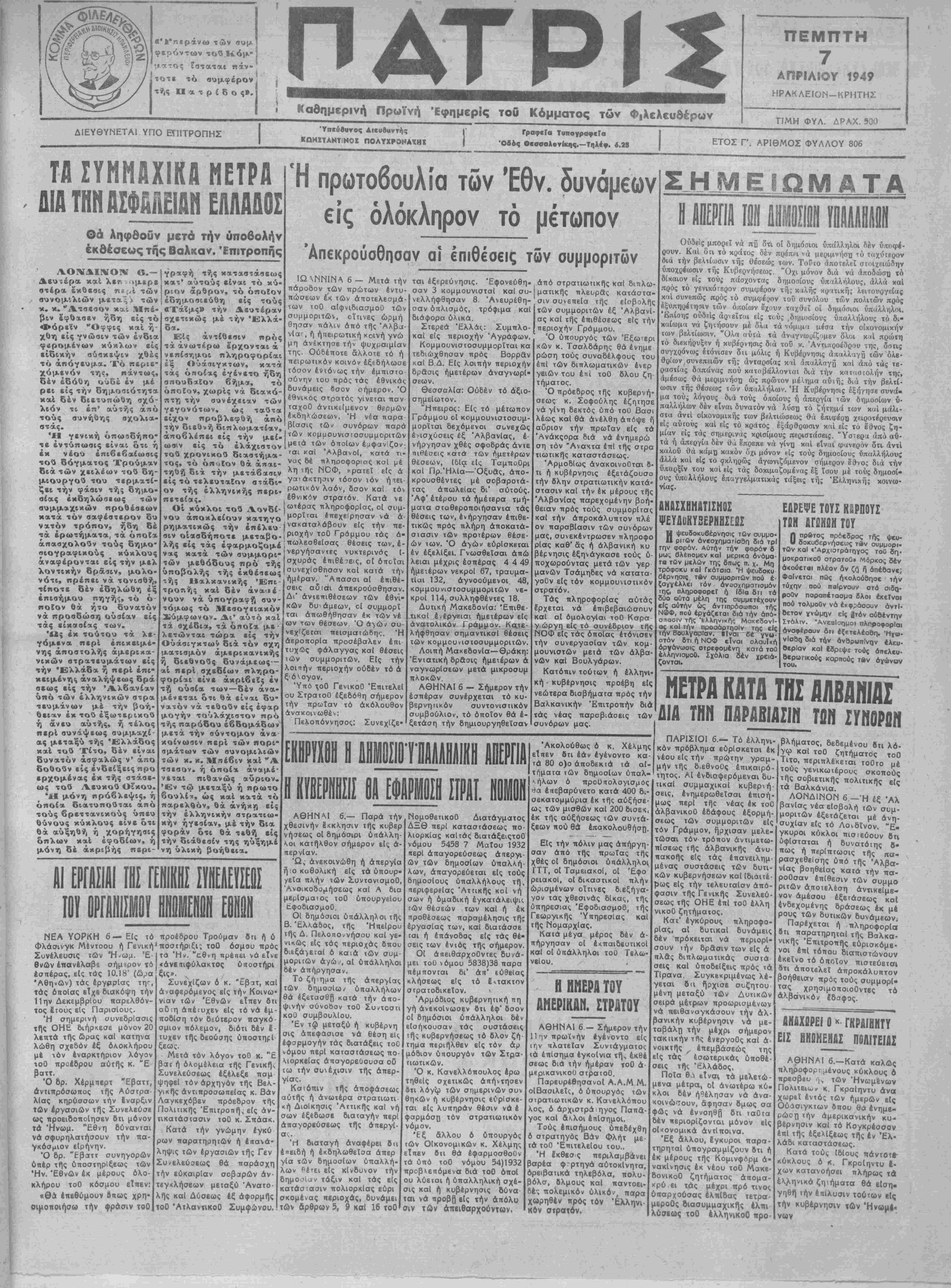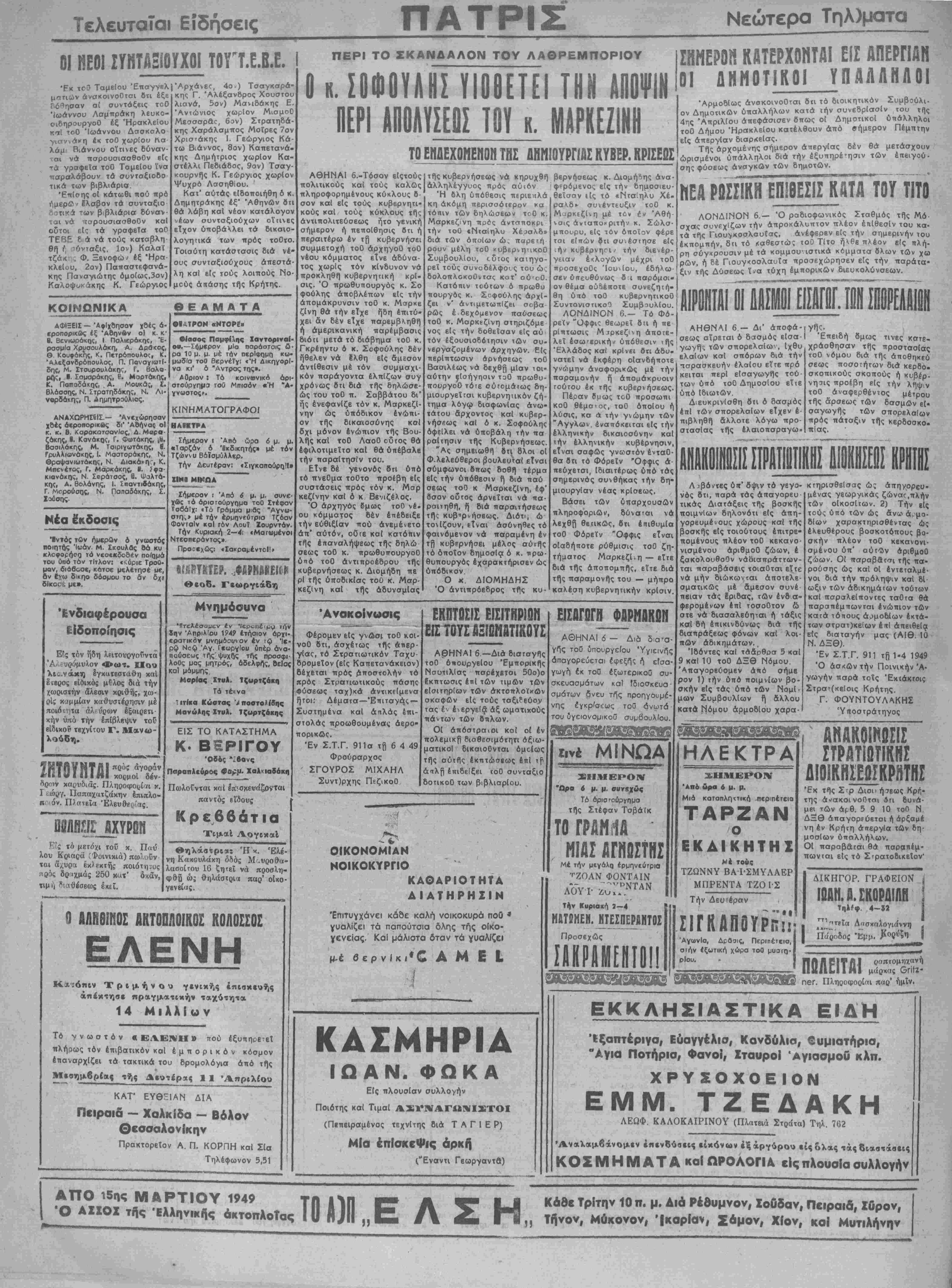 Ό άσ<ών την Ποινικήν Ά- γωγήν τταρά τοίς Έκτάκτοις Στρατ(κεΙοις Κρήτης. Γ. ΦΟΥΝΤΟΥΛΑΚΗΣ 'Υποστράτηγος ΗΛΕΚΤΡΑ ΣΗΜΕΡΟΝ Άπό Δρα 4 μ. μ. Μιά καταπληχτική περιπέτοα ΤΑΡΖΑΝ ο ΕΚΑΙΚΗΤΗΙ Μέ τούς ΤΖΩΝΝΥ ΒΑΙ-ΣΜΥΛΑΕΡ ΜΠΡΕΝΤΑ ΤΖΟ1-Σ Την Δευτέραν ΣΙΓΚΑΠΟΥΡΗΣ ΆγωνΙα, Δρααις, Περιπέτεια, στήν έξυτική χώρα τοθ ρΐου. ΑΝΑΚΟΙΝΩΣΙΣ ΣΤΡΑΤΙΩΤΙΚΑΣ Έκ τ^ς Στρ Διου ήτεως Κρή¬ της ά^ακοι νοθται ότι δυνά¬ μει των αρθ. 5 9 10 τοθ Ν ΔΞΘ άπαγορεύεται ή άρξαμέ νη έν Κρήτη άπεργΐα των δη· μοσΐων ύπαλλήλων. ΟΙ παρσβαται θά παραπέμ¬ πωνται είς τό Στρατοδικείον ΔΙΚΗΓΟΡ. ΓΡΑΦΕΙΟΝ ΙΟΑΝ.Α.ΣΚΟΡΔΙΑΗ 4-32 Ι ίΐάροδος Έμμ. ,Κ0*"5 ΠίΛΕΙΤΑΙ Π6Γ. Πληροφοοίαι «αρ' ήμΐν. ΕΚΚΛΗΣ1ΑΣΤΙΚΑ ΕΙΔΗ Ίξαπτέριγσ, Εύαγγέλισ, Κανδύλισ, €υμιατήρια, "Αγια Ποτήρισ, Φανοί, ΙταυροΙ Άγιασμοϋ κλπ. ΧΡΥΣΟΧΟΕΙΟΝ ΕΜΜ. ΤΖΕΔΑΚΗ ΛΕΩΦ ΚΑΛΟΚΑΙΡΙΝΟΥ (Πλατειά Στράτα) Τηλ. 762 Άναλαμβάνομεν έπενδύαεις είκόνων έξάργύρου είς όλας τάς διαστάσεις ΚΟΣΜΗΜΑΤΑ καί ΩΡΟΛΟΓΙΑ είςπλουσΐασυλλογήν ΑΠΟ 15ης ΜΑΡΤΙΟΥ 1949 ΤΠ Ι ιΠ Ρ» Α «■ υ ■Ο ΑΣΣΟΣ τής ΕΑΑην,κίίς ακτοπλοίας ||| λ)\ ΗΕ Λ Σ Π Κάθε Τρίτην 10 π. μ. Διά Ρέθυμνον, Σοΰδαν, Πειραια, ΣΟρον, Τιίνον, Μύκονον, ΊκαρΙαν, Σάμον, ΧΙον, καί Μυτιλήνην