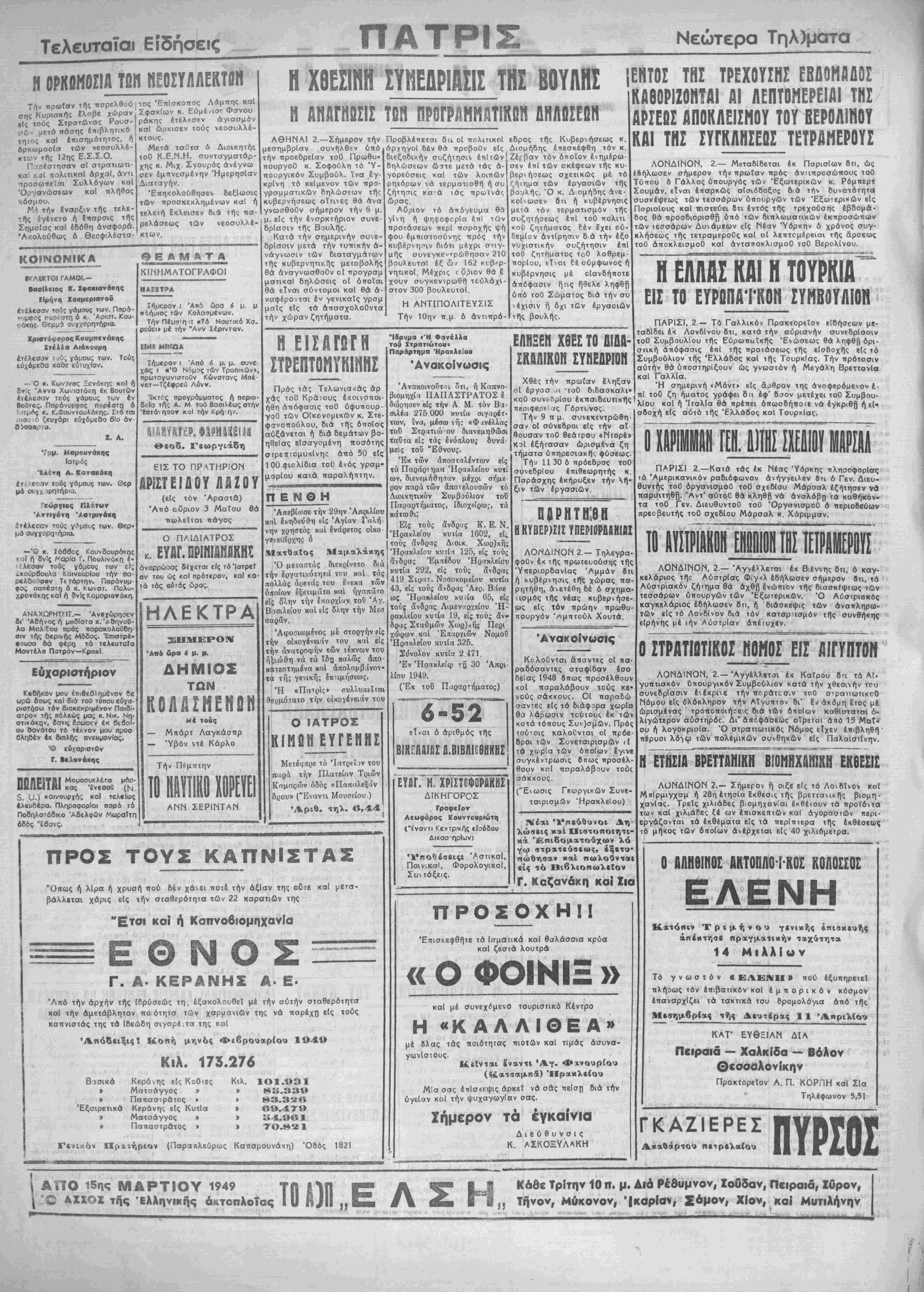 ΠΑΡΙΣΙ 2—Κατά τάς έκ Νέας "Υόρκης πληροφορίας ·■< ό Αμερικανικόν ραδιόφωνον ανήγγειλεν δτι ό Γεν. Διευ— '" θυντής τοθ όργανισμοθ τοθ σχεδίου Μαρσάλ εζήτησεν νά παραιτηθή. Άντ" αύτοθ θά κληθή νά αναλάβη τα καθήκον*1 τα τοθ Γεν. Διευθυντού τοθ Όργανισμοθ ό δ πρεοβευτής τοθ σχεδίου Μαρσάλ κ. Χώρψμσν. Νέαι Ύπεύθυνοι Δή λώσεις καί Πιστοποιητι- κά Έπιδοματούχων λό γω ατρατεύσεως, έξετυ' πώθησαν καί πωλοΰνται είς τό Βιβλιοπωλείον Γ. Καζανάκη καί Ζιά ΠΡΟΣΟΧΗ!! Επισκεφθήτε τα (σματικά καί θαλάσσια κρύα καί ζεστά λουτρά « Ο ΦΟΙΝΙΞ » καί μέ συνεχόμενθ τουριστικό Κέντρο Η «ΚΑΛΛΙΘΕΑ» μέ όλας τάς ποιότητος τιιοτΔν καί τιμάς ασυνα¬ γωνίστους. Κίϊνται έναντι Αγ. Φινουρίου (Κατσαμπά) Ηρακλείου Μΐα σας έπ(σ<Εψις άρκεΐ νά σάς πεΙσΓ) διά την υγείαν καί την ψυχαγωγΐπν σας. Σήμερον τα έγκαίνια Διεύθυνσις Κ. ΑΪΚΟΞΥΛΛΚΗ Ι ΛΟΝΔΙΝΟΝ, 2.— Αγγέλλεται έκ Β.έννης ότι, δ καγ-«« κελάριος τής Αυστρίας Φιγ<λ εδήλωσεν σήμερον βτι, τόί·· Αύστριακόν ζήτημα θά άχθί) ενώπιον τής διασκέψεως τώνι!>