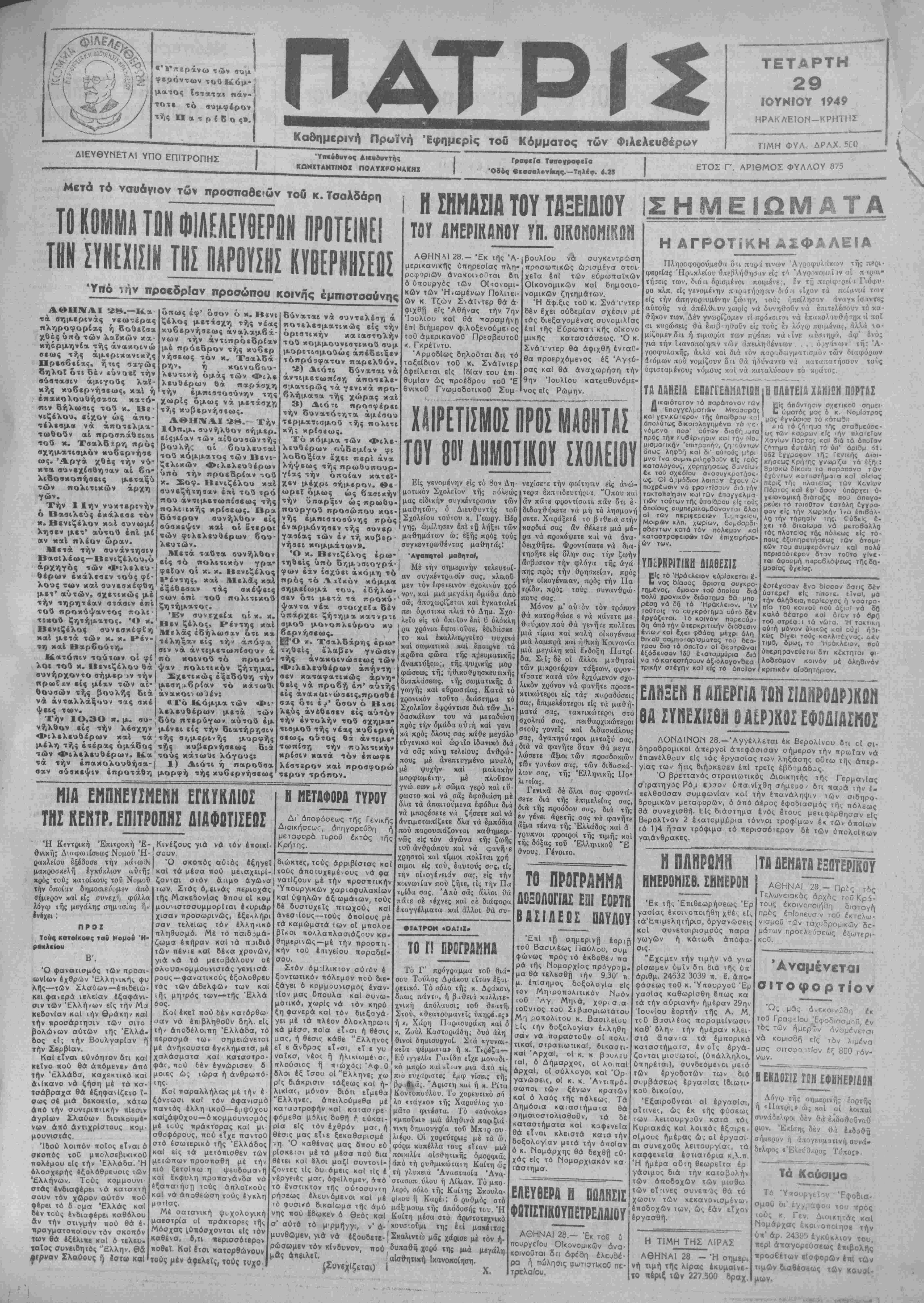 μ<α·«ος Ισταται πάν- τοτε τδ συμφέρον τής Π α τ ρ ί 6 ο ς». ΠΑΤ ΔΙΕΥΘΥΝΕΤΑ1 ΥΠΟ ΕΠ1ΤΡΟΠΗΣ 'Υικύβυνος Αιευουντής ΚΟΝΙΤΑΜΤΙΝΟΧ ΠΟΛΥΧ·Ο ΝΑΚΗΧ Καθημερινή Πρωΐνή Εφημερίς τοθ Κόμματος των Φιλελεύθερον ΤΕΤΑΡΤΗ ΙΟΥΗΙΟΥ 1949 ΗΡΑΚΛΕΙΟΝ-ΚΡΗΤΗΣ ΓΤΜΗ ΦΥΛ. ΔΡΑΧ. 5[0 Ι 4 Γραφκία Τυπονραφκϊα 'ΟΒος Θεσσαλονίκης.—Τηλέφ. 6.23 ΕΤΟΣ Γ. ΑΡΙΘΜΟΣ ΦΥΛΛΟΥ 875 Μετά τό ναυάγιον των προσπσβε·ών τού κ. Τσαλδάρη ΤΟ ΚΟΜΜΑ ΤΩΝ ΦΙΑΕΑΕΥΟΕΡΟΝ ΠΡΟΤΕΙΝΕΙ ΤΗΝ ΣΥΝΕΧΙΣΙΝ ΤΗΣ ΠΑΡΟΥΣΗΣ ΚΥΒΕΡΝΗΣΕΩΣ Υπό ? ήν προεδρΐαν προσώπου κοινής έμπιστοσύνης ΑΘΗΝΑΙ 28.—Κα τα σημερινάς νεωτέρας πληροφορίας ή δοθεΐσα χθές υπό των λαΐκών χα- κήέρμηνία τής άνακοινώ βεως τής άμ<ριχανιχής Πρεσβείας, ήτις βχγώς δηλοί ότι δέ* εύνοεί την σύστασιν άμιγούς λαϊ- κής κυβερνήσεως, καί ή έπακολουθήσασα κατό¬ πιν δήλωσις τού κ. Βε¬ νιζέλου, είχον ώς άπο- τέλεσμν νά άηοτελμα- τωθούν αί προσπάθειαι τού κ. Τσαλδίρη πρός σχηματισμόν κυβερνήσε ως. Άργά χθές την νύ¬ κτα βυνεχίαθηααν αί 6α- λιδοσκοηήσεις μεταξύ των πολιτικών άρχη γών. Την 1 Ιην νυκτερινήν ό Βασιλεύς εκάλεσε τόν κ. Βενιζέλον χά! συνωμί λησεν μετ* αυτού επί μί αν καί πλέον ώραν. Μετά την συνάντησιν Βασιλέως—Βενιζέλου,ό άρχηγός των Φιλελευ- Θέρων εκάλεσεν τούς φί- λθυς των καί συνεσκέφθη μετ' αυτών, σχετικώς μέ την τηρητέαν στάσιν επί τού προκύψαντος πολι· τικού ζητήματος. Ό μ. Βενιςέλος συνεσχέφ£η χαί μετά των χ. χ. Ρέν- τη χαί Βαρβούτη. Κατόπιν τούτων οί φί όπως έφ' όσον ό χ. Βενι ζέλος μετάσχη τής νέας κυβερνήσεως άναλαμβά- νων την άντιπρόεδρίαν μέ πρόεδρον τής κυβερ νήσεως τόν κ. ΤσαλΒά- ρην» ή χοινοβου- λευτική ομάς των Φιλε λευθέρων θά παράσχη 'τήν εμπιστοσύνην της χωρίς ομως νά μετάσχη τής κυβερνήσεως. ΑΘΗΝΑΙ 28.— Την ΙΟπ.μ. συνήλθον αήμερ. είςμίαν των αίθουαώντής βουλής οί βουλευταί τού κόμματος των Βενι- ζελικών Φιλελευθέρας υπό την προεδρίαν τοΰ χ. Σοφ. Βενιζέλου χαί συνεζήτησαν επί τού τρό που άντιμετωηίσεως τής πολΐ'Ίχής κρίσεως. Βρα δύτερον συνήλθον είς σύσκεψιν χαί οί ετέροι των φιλελευθέρας βου- λευτών. Λΐετά ταύτα συνήλθον είς τό πολιτικόν γρα¬ φείον οί χ. κ. Βενιζέλος Ρέντης, καί Μελάς χαί έξέθεααν τάς σχέψεις των επί τού πολιτικοΰ ζητήματο?. Έν συνεχεία οί κ* χ. Βεν ζέλος» Ρέντης χαί Μελάς εδήλωσαν ότι κα τέληξαν είς τή» άπόφβι σιν νά άντιμετωηίσουν ά πό ψαν κοινού τό πολιτικόν Σχετικώς εξεδόθη την λοι τού κ. Βενιζέλου θά αυνήρχοντο σήμεραν την „ . πρωΐχ,ν είς μίαν των αί- μεσημβρίαν τό θουαών τής βουλής διά ανακοινωθέν: νά άνταλλάξου* τας σκέ ψεις των προχύ' ζήτημα. κάτωθι Την 10,30 π. μ. συ- « Γό Κομμάτων Φι λελευθέρων μετά των δύο πτερύγω»^ αυτού έμ νήλθον είς την λέσχην μένει είς την διατήρησιν Φιλελεύθερον καί τα' τής σι,μερινής μορφής μέλη τής ετέρας ομάδος ' τής κυβερνήσεως διά των Φιλελευθέρας. Κα'τοΰς κάτωθι λόγους: τ ά «ήν έπακολουθήαα-| 1) Διότι ή παρούσα σύσκεψιν έπροτάθη μορφή τής κυβερνήσεως τα οαν δύναταινά συντελέση ά ποιελεσματικώς είς την οριστικήν κα:αστολήν τού κομμουνιστιχού συμ μοριτιημοΰώς απέδειξεν τόπρόαφατον παρελθόν. 2) Διότι δύναται νά αντιμετωπίση άποτελε- σματιρώς τα γενι*ά προ- βλήματα τής χώρας καΐ 3) Διότι προαφέρει την δυνατότητα άμέαου τερματιαμού τής πολιτι *ής κρίσεως. Ύό κόμμα των Φιλε- λευθέρων ουδεμίαν φι λοδοξίαν έχει περί άνα λήψεως τής πρωθυηουρ- γίας την οποίαν κατεί* χεν μέχρι σήμερον. Θε¬ ωρ εί όμως ώς βαοΐκήν την ύπαρξιν ώς πρωθυ* πουργού προσώπου κοι- νής έμπιστοαύνης πρός έναρμόνησεν τής συνερ γασίας των έν τή κυβερ νή