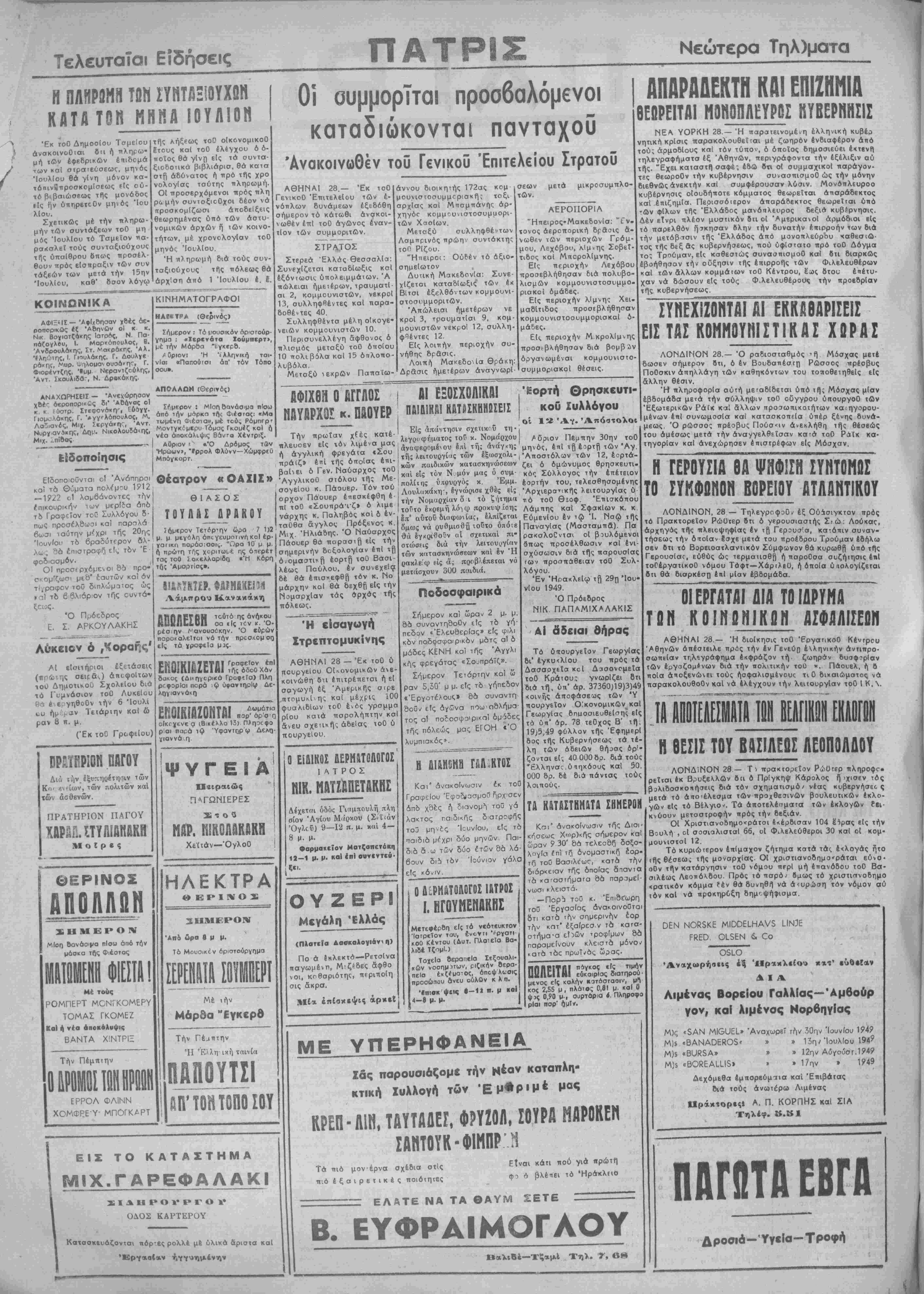 λα<τος παιδκης διατροφης το3 μη'ές ΊουνΙου, είς τδ παιδία μεχρι δύο μηνων Παι διδ δ ω των δύο έτ£ν δα λά βουν διίι τδν Ιούνιον γάλα είς κόνΐν. 01[ΡΗίΙΟΑ0[011ΛΤΡ0Σ Ι. ΒΓΟΥΗΕΝΑΚΗΣ Μετεφέρθη είς τό νεότευκτον Ιατρείον τού, ένοντι τργατι κοο Κέντου (Δυτ. Πλαιεϊα Βα- λιδε ΤζομΙ.) Τοχεία βεραηεΐα Σεξουαλι- Κ(5ν νοοημΜων, ριζικον βερα- πεΐο έκζ#μοιος, άποψλα:θΐς προσώπου Λνευ ούλθν κλπ. •ίπ.σκ φεις β-ΐι π. μ «οί 4—8 μ· Μ· Παναγίας (Μασταμπά). Πά ρακαλοθνται οί βουλόμενοι δττως προσέλθωσιν καΐ ένι- σχύσωσιν διά τής τταρουσΐας ών προοπάθειαν τοθ Συλ· ιόγου. Έν ΉρακλΕΐφ τή 29η Ίου- νΐου 1949. Ό Πρόεδρος ΝΙΚ ΠΑΠΑΜΙΧΑΛΑΚΙΣ ΑΙ αδειαι θήρας Τό υπουργείον Γεωργίας δι' έγχυ<λ(ου τού πρός τα Δασαοχεΐα κοί Δασονομεΐα τοθ Κράτου; γνωρΐζδι 8τι διά τή, ΰη' άρ. 37360)19)3)49 κοινής άττοφάσεως των Ύ τιουργεΐον Ο'.κονομικων κα Γεωργίας δηαοσιευθείοης ε(ι τό ύη" άρ. 78 τεθχος Β' τή 19)5,49 φύλλον τής 'Εφημερ δος τής Κυβερνήσεως τα τέ λη των άδειων θήοας όρ' ζονται εί-, 40 000 δρ. διά τού "έλληνας ύιηχόους καΐ 50 000 δρ. δέ διά πάντας τού( λοιτιούς. ΣΥΗΕΧΙΖΟΗΤΑΙ ΑΙ ΕΚΚΑΘΑΡΙΣΕΙΣ ΕΙΣ ΤΑΣ ΚΟΜΜΟΥΝΙΣΤΙΚΑΣ ΧΩΡΑΣ ΛΟΝΔΙΝΟΝ 28.— Ό ραδιοσταθμός *ή Μόσχας μετέ δωσεν σήμερον δτι, ό έν Βουδαπέσίτι Ρώσσος ττρέοβυς Ποθσκιν άπηλλάγη των καθηκόντων τού το-οθετηθείς είς άλλην θέσιν. Ή τιληροφορΐα αυτή μεταΒΙδεται υπό τή; Μόσχας μίαν έβδομάδα μετά την σύλληψιν τοθ ουγγρου ύπουργοθ των "Εξωτερικών Ρά(κ καΐ άλλων προατωπικοτήτων καιηγορου- μένων επί συνωμοσΐα καΐ κατασκοπεΐα υπέρ ξένης δυνά¬ μεως Ό ρώσσος πρέοβυς Πούσχιν άνεκλήθη τής θέσεώς :ου άμέσως μετά την άναγγελθεΐσαν κα'ά τοθ Ράίκ κα- ηγορΐαν καΐ ανεχώρησεν έττιστρέφων είς Μόσχαν. Η ΓΕΡΟΥΣΙΑ ΘΑ ΨΗΦ1ΙΗ ΣΥΝΤΟΜΩΣ ΤΟ ΣΥΚΦΟΗΟΗ ΒΟΡΕ1ΟΥ ΑΤΛΑΝΤΙΚΟΥ ΛΟΝΔΙΝΟΝ, 28 — Τηλεγροφοθν έξ Ούίισιγκτον πρός τό Πρακτορείον Ρώυτερ δτι ό γερουσιαστής Σκί), Λούκας, άρχηγός τής πλειοψηφΐας έν τή Γερουσ'α, κατόηιν συναν¬ τήσεως την οποίαν έσχε μετά τού προέδρου Τρούμαν έδήλω σεν Οτι τό Βορειοατλανΐικόν Σύμφωνον θά κυρωθή υπό τής Γερουσίαν, ευθύς ώς τερματισθή ή τΐσροθσα συζήτησις έηΐ τοθέργστικοθ νόμου Τάφτ—Χάρΐλίϋ, ή όποΐα ύιΐολογΐζβται 6τι θά διαρκέση έηΐ μίαν έβδομάδα. ΟΤεΡΓΑΤΑΙ ΔΙΑ ΤΟ ΙΔΡΎΗΑ ΤΩΝ ΚΟΙΝΩΝΙΚΩΣ ΑΣΦΜΙΙΕΟΗ ΑΘΗΝΑΙ 28 — Ή διοίκησις τοθ ΤργατικοΟ Κέντρου Αθηνών απέστειλε πρός την έν Γενεύπ ελληνικήν άντιττρο- σωπείαν ττ,λϊγράφημα έκφράζον τή ζωηράν 6υσφ^ρΙαν των εργαζομένων διά την πολιτικήν τού «. Πάουελ, ή ο ποία άιτοξενώνΕΐ τούς ήσφαλισμένους τιθ οιχαιωματος νά παρακολουθοθν καί νά έλέγχουν την λειτουργίαν τοθ ΙΚ.. ΤΑ ΤΑ ΚΑΤΑΣΤΗΜΑΤΙ. ΣΗΜΕΡΟΝ Και' ανακοίνωσιν τής Διοι¬ κήσεως Χωρ)<Γίς σήμερον καί ώραν 9 30' θά τελεσθή δσξο- λογΐςη ίπί τό όνομαστική έορ- τή τοθ Βασιλέωσ, κατά την διάρκειαν της οποίας άπαν ι α ή δ6 Ι νωσι κλειστά. — Πορ^ τού κ. Έπισίωρη τού "Εργασίας άνακοινοθται δτι κατά την σημεριντδ,ν έορ τ^ν κατ' έξαΐρεσ ν τ6 κατσ- στήμα·α εί)ών τροφΐμων δα παραμείνουν κλειστά κατά τάς πρωϊνάς ώρας. Η ΘΕΣΙΣ ΤΟΥ ΒΑΣΙΛΕΩΣ ΛΕΟΠΟΑΔΟΥ ΛΟΝΔΊΝΟΝ 28 — Τ > πρακτορείον Ρώυτερ τιληροφο·