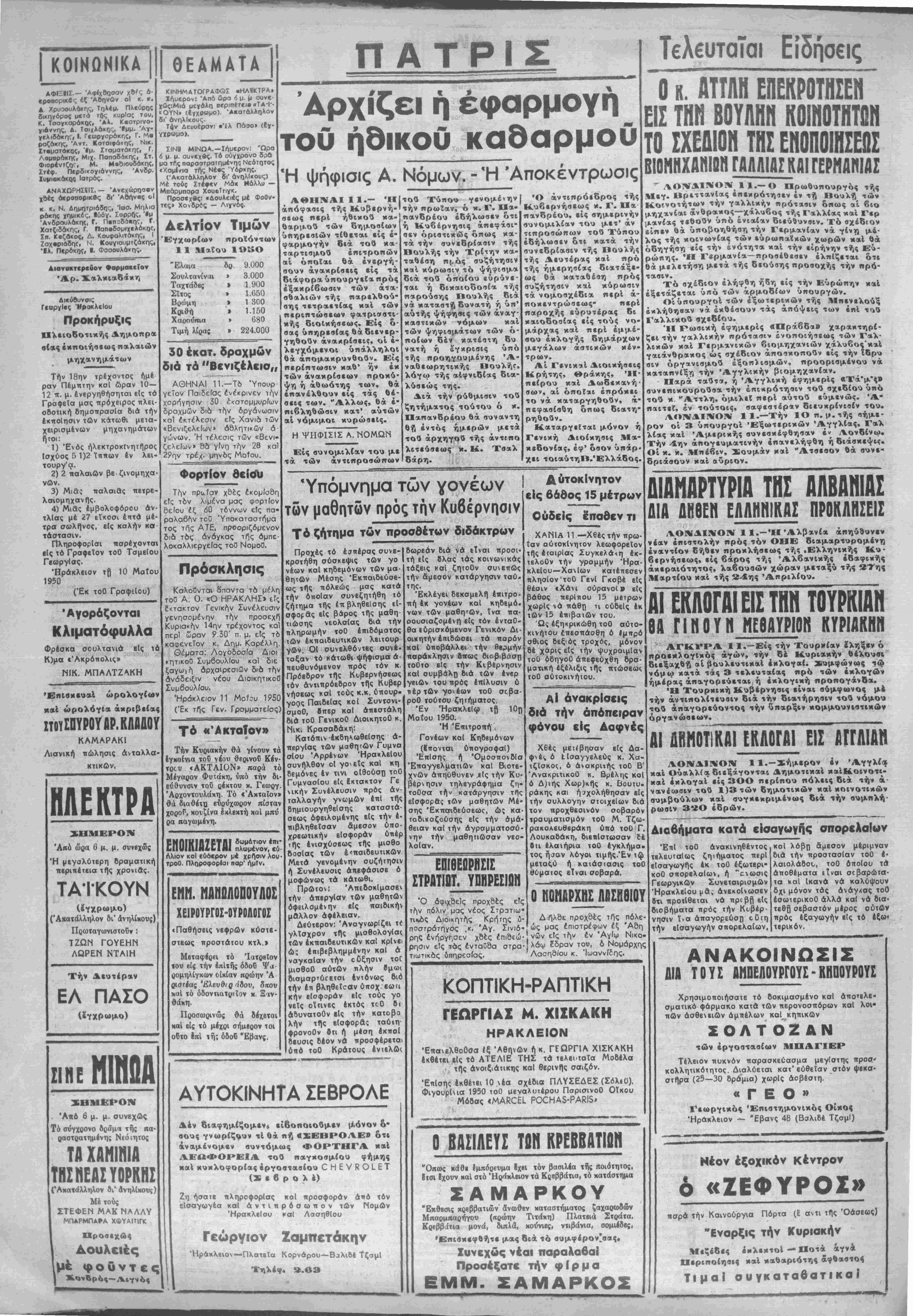 την άμεσον κατάργησιν ταύ< της. Έκλέγει δβκσμελτ) έτιιτρο- πή έκ γονέων καί κηδεμό. νων των μαθητων, ίνα πα· οουσισζομένη είς τόν ένταθ- θα ευρισκόμενον Γενικόν Δι¬ οικητήν έπιδώσει τα τισρόν κοΐ ύτιοβάλλει την θερμήν παράκλησιν δπως διοβιβάση τοθτο είς την Κιβερνησιν καί συμβάλη διά των ένερ γειων τού τιρός επίλυσιν ύ κέρτων γονέων τοθ σεβα- ροθ τούτου ζητήματος. Έν ΉρακλεΙφ τ« 10η Μαΐου 1950. Ή Έτητροτϊή , Γονέων καί Κηββμόνων (Ιπονται ύτΐογρσφαΐ) ΈηΙοης ή Όμοσπονδΐα Έτΐαγγελματιών καί Βιοτε- χνών απηύθυνεν ίΐς την Κυ¬ βέρνησιν τηλβγράφημα ζη- τοθσα την κατάργησιν τής εΐσφορβς των μαθητων Μέ¬ σης Έκπαιβεύσεως, ώ; κα· Γαδικοζούσης είς την άμά- θείαν καί την άγρσμματοσο- μαθητιωσαν νεο- νην την λαΐαν. ΕΠΙΟΕ1ΡΙΊΣΙΣ ΣΤΡΑΤ10Τ. ΥΡ8ΡΕΣΙ0Ν Ό αφιχθείς προχθές ε?ς τ^ν πόλιν μας νέος Στρατιω· Διοικητής Κρήτης ύ- 'Α Σ Αυτοκίνητον είς 66θος 15 μέτρον Ουδείς έιταθεν τι ΧΑΝΙΑ 11 —Χθές την πρω¬ ΐαν αυτοκίνητον λεωφορείον της έταιρΐας Συγκελάιη έκ- τελοθν την γραμμήν Ηρα¬ κλείου—Χανίων κατέπεσεν πλησίον'τοθ Γενί Γκοβέ είς θέσιν ΐΧάνι οϋρανοί» είς βάθος ιιερΐτιου 15 μετρων χωρΐς νά πάθη η ουδείς έκ των 15 έτιιβατών τού. Ώς έξηκρικώθη τοθ αΰτο- κινήτου έτιεσπάοθη ό ίμπρό σθιος δεξιός τροχός, μόνον δέ χάρις είς την ψυχραιμίαν τοθ όδηγοθ άπεφεύχθη δρα· ματική εξέλιξις της πτώσεως τοθ αύτοκινήιου. ΑΙ άνακρίσεις διά την απόπειραν φόνου είς Δαφνές Χθές μετέβησαν είς Δα- φνέι, ό Ιίσαγγελεύς κ. Χα- τζΐσκος, ό άνσκριτής τοθ Β' ΆνακριτικοΟ κ. Βρέλης καί 6 Δ)ιής Χωρ)κής κ. Βουτυ. ράκης και ησχολήθησαν είς την συλλογήν στοιχεΐων διά τον προχθεσινόν σοβαρόν τραυματισμόν τοθ Μ. Τζω- ρακολευθεράκη υπό τοθ Γ. Λουκαδάκη, διεπΐστωσαν δέ δα έλαχήρια τοθ έγκλήμα τος ήι^αν λόγοι τιμής.'Εν τή μεταί,ύ ή κατάστασις τοθ θύματος είναι σοβαρά. ηϋϋϊογ Δ ήλοε προχδες τής πόλε¬ ώς μας έπιστρέφων έξ 'Αδη ρης ενήργησεν χσές έπι8εώ·|νών είς την έν 'ΑγΙψ Νικο· ρήσιν είς τάς ενταύθα στρα·|λόψ ίδραν τού, δ Νομάρχης * * » Ι Α <^ί_. · Ι .. . # Τ _ _ ηής ρήης ποστρατηγος ,κ. 'Αγ. Σινιό- τιωτικας υπηρεσίας. Λασηθίου κ. "Ιωαννίδης. ΚΟΠΤΙΚΗ-ΡΑΠΤΙΚΗ ΓΕΩΡΓΙΑΣ Μ. ΧΙΣΚΛΚΗ Λ- ΗΡΑΚΛΕΙΟΝ Έηανελθοθσα ίξ Αθηνών ή κ. ΓΕΩΡΠΑ ΧΙΣΚΑΚΗ έκθίτει είς ΐό ΑΤΕΛΙΕ ΤΗΣ τα τελει-ταΐα Μοδέλα ,·, τής άνοτξιάτικης καί θερινης σαιζόν. ΈηΙσης έκθέιει 10 νέα σχέΒια ΠΛΥΣΕΔΕΣ (Σόλϊϋ). Φιγουρινια 1950 τοθ μεγαλυτέρου ΠσρισινοΟ Οϊκου Μόδας «ΜΑβΟΕί ΡΟΟΗΑ5-ΡΑΚΙ5* Ο ΒΑΣΙΛΕΥΣ ΤΟΗ ΚΡΕΒΒΛΤΙΟΗ "Οπως χάθε Ιμπόρευμα ϊχεΐ τόν βασιλέα τής ποιότητος. 8τσι ίχουν χαί στό Ηράκλειον τα Κοεββάτια, τό κατάστημα ΣΑΜΑΡΚΟΥ "Εκθεσις κοεββατιών' άνωθεν καταστήματος ζαχαρωσων Μπαςμπαρήγου (ηρώην Τιτάκη) Πλατειά Στοάτα. Κρεββάτια μονά, διπλά*, κούνιες, ντιβάνια, οομιέδβς, Επισκεφθήτε μας διά τό συμφέροντας» Συνεχώς νέαι παραλαβαί Προσέξατε την φΐρμα ΕΜΜ. ΣΑΜΑΡΚΟΣ ΤβλευταΤαι Είδήσ€ΐς Ο κ. ΑΤΤΛΗ ΕΠΕΚΡΟΤΗΣΕΗ ΕΙΣ ΤΗΝ ΒΟΥΛΗΝ ΚΟΙΝΟΤΙΚΟΝ ΤΟ ΣΧΕΔΙΟΝ ΤΗΣ ΕΝΟΠΟΙΗΣΕΟΣ ΒΙΟΜΗΧΑΝΙΟΗ ΓΑΑΛΙΑΣΚΑΙΓΕΡΜΑΝΙΑΣ "" ΛΟΝΔΙΝΟΝ^ 11.— ο Πρωθυπουργός τής Μεγ. Βρεττανίας επεκρότηαεν έν τή Βουλή των * Κουνοτήτων την γαλλικήν πρότασιν όπως αί βιο ' μηχανίαι άνθρακος—χάλυβος τής Γαλλίας καί Γερ μανίας τεθοΰν υπό ενιαίαν διεύθυνσιν. Τό σχέδιον είπεν θά υποβοηθήση την Γερμανίαν νά γίνη μ»- λος τής κοινωνίας των εύρωηα'ίκών χωρών καί θά οδηγήση είς την ένότητα καί την ειρήνην τής Έύ- ρώηης. Ή Γερμανία— προσέθεσεν έλπίζεται δ« θά μελετήση μετά τής δεούσης προσοχής την πρό¬ τασιν. Τδ σχέδιον ελήφθη ήδη είς την Ευρώπην κ αί έξ
