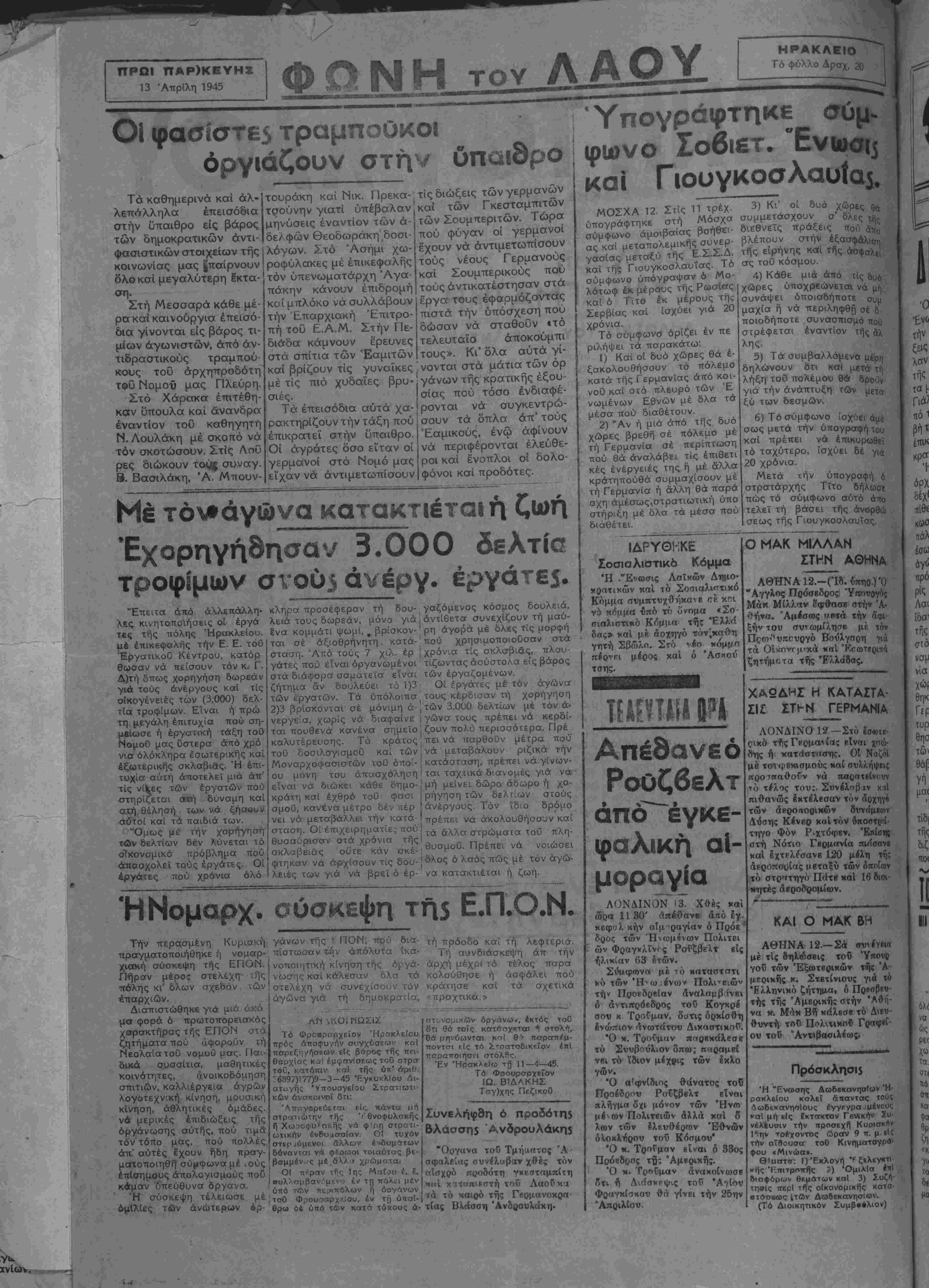 <,πραχτικά.» Τό Φροβραρχειον Ήρπκλείου ό αή θ ΐ πρός ρχ ρ αποφυγήν σΐ)γχθσε&)ν κοΐ ή είς βά-ρος ττ)ς ί θ ηή βρ )ς 0α'»χίας καί εμφανίσεως τοθ στρσ τοθ, κατόπιν καί τής 6π' άριΡ "6897)177)9-3-45 Έγκυκλΐου Λι- ατιιγής 'νπουογεΓου Στρατιωτι¬ κών ανακοινοί 8π: τίς τϊάντα ιιή Τθνοφυλακής όργάνωσης αυτής, πού τιμά|Ί Χ^οψι»ακης νά φ-ρτ, στρατι- Γ , ' ' . -.-.Γ Ιωτικήν ίν&υαοοΐσν ΟΙ τυχόν τάντόπο μας, που πολλές σΤίρ^ύμενοι αλλων - άπ' αύτές έ'χουν ήδη πραγ- *" ματοποιηθή σύμφωνα μέ ,ούς 'Λτταγβρεύεται στρατιώτην τής δύνανται νΑ φέρωοι τοιαύτας βε· βσμμέν ·ς μέ αλλ ι χμώματα. οτι,νομικων όργάνω», έκτος τού 6 τι θά τοίς κατΛσχβται +, στολτ), θα μην'ύοιντσι κηΐ θ1* πσραττίμ- ποντσι τίς τΊ) ^.τοατοδικρΐον ίττϊ τταροτττοιήσΕΐ στολίϊς. Έν ΉρακλβΓο τ{| 11—4—45. Τό Φοοορσρχεϊον ΙΩ. ΒΙΔΑΚΗΣ ΠεζικοΟ ΟΙ ττίραν τΡς 1ης Ματου έ. Ι. έν τη ττολι ι μέν έπίσημους άπολογισμούς που κάμαν ύπεύθυνα δργανα. Ή σύοκεψη τέλειωσε μέ όμίλΐες τδν ανωτέρων όρ- θρω 64 ύττό τ&ν κατΛ τόΐτους β- Συνελήφδη 6 προδότη$ Άνδρουλάκη3 "Οργανα τοϋ Τμήαατος Ά σφαλδίας συνίλυβαν χθές τόν οΐσχρό ποοδότη γκεστπμπίτη ί«ΐί κ'ϊί'ϊΛΐΡστή τοΰ ΛαουΉ'ΐ ίά τό χαιοό τής Γεομανοκρα- τίας Βλάσση Άνδρουλάκη. Υπογράφτηκε συμ- φωνο Σοβιετ. °Ενΐοσΐ5 καί Γιουγκοσλαυία^ ΜΟΣΧΑ 12. Στίς 11 τρέχ. υπογράφτηκε στή Μόσχα σύμφωνο άμοιβαιας βοηθεί¬ ας καί μεταπολεμικής συνερ- γασίας μεταξύ τής Ε.Σ.ΣΆ. καί τής Γιουγκοσλαυΐας. Το σύμφωνο ΰπόγραψαν ό Μο- λότωφ έκ μέρους της Ρωσίας καί ό Τιτο έκ μέρους τής Σερβίας καί ίσχύει γιά 20 χρόνια. Τό σύμφωνο όρίζει έν πε ριλήψει τα παρακάτω: 1) Και οί δυό χώρες θά έ- ξακολουθήσουν τό πόλεμο κατά τής Γερμανίας άπό κρι- νοθ καΐ στό πλευρό των Έ νωμένων Εθνών μέ δλα τα μέσα πού διαθέτουν. 2) Άν ή μιά άπό της δυό χώρες βρεθή σέ πόλεμο μέ τή Γερμανία σέ περίπτωση πού θά άναλάβει τίς έπιθετι κές ένέργειές της ή μέ άλλα κράτηπούθά συμμαχίσουν μέ τή Γερμανία ή άλλη θά παρά σχη άμέσως,στρατιωτικη υπο στήριξη μέ δλα τα μέσα πού διαθέτει. ΙΔΡΥΘΚΚΕ Σοσισλιστικό Κόμμα Ή ."Ένωσις Λαΐκών Δημο· χθ«τι»<ων χαΐ τό Σοσιαλκ'πχό Κόμμα «υμπτυχθήκανε πρ κ^ι ν5 Μόμμα υπό τί} ύ'νομα «Σο· Γτιαλισπιιό Κόμμα τής *Ελλ<ί δας» καί μ β δοχηγό τόν*Μ(χθτ) γητή Σβάίλο. Σγο ιέο χύμμπ πέοΐ'Ρΐ μέρος καί ό Άσχού τσης. ιη Απέδανεό άπό έγκε- φαλικη αΐ- μοραγία ΛΟΝΔΙΝΟΝ 13. Χθές χαί ώοα 1130' απέθανε άηό Ιγ χεφαλ κήν αίμ>ραγίαν ό Πςόε