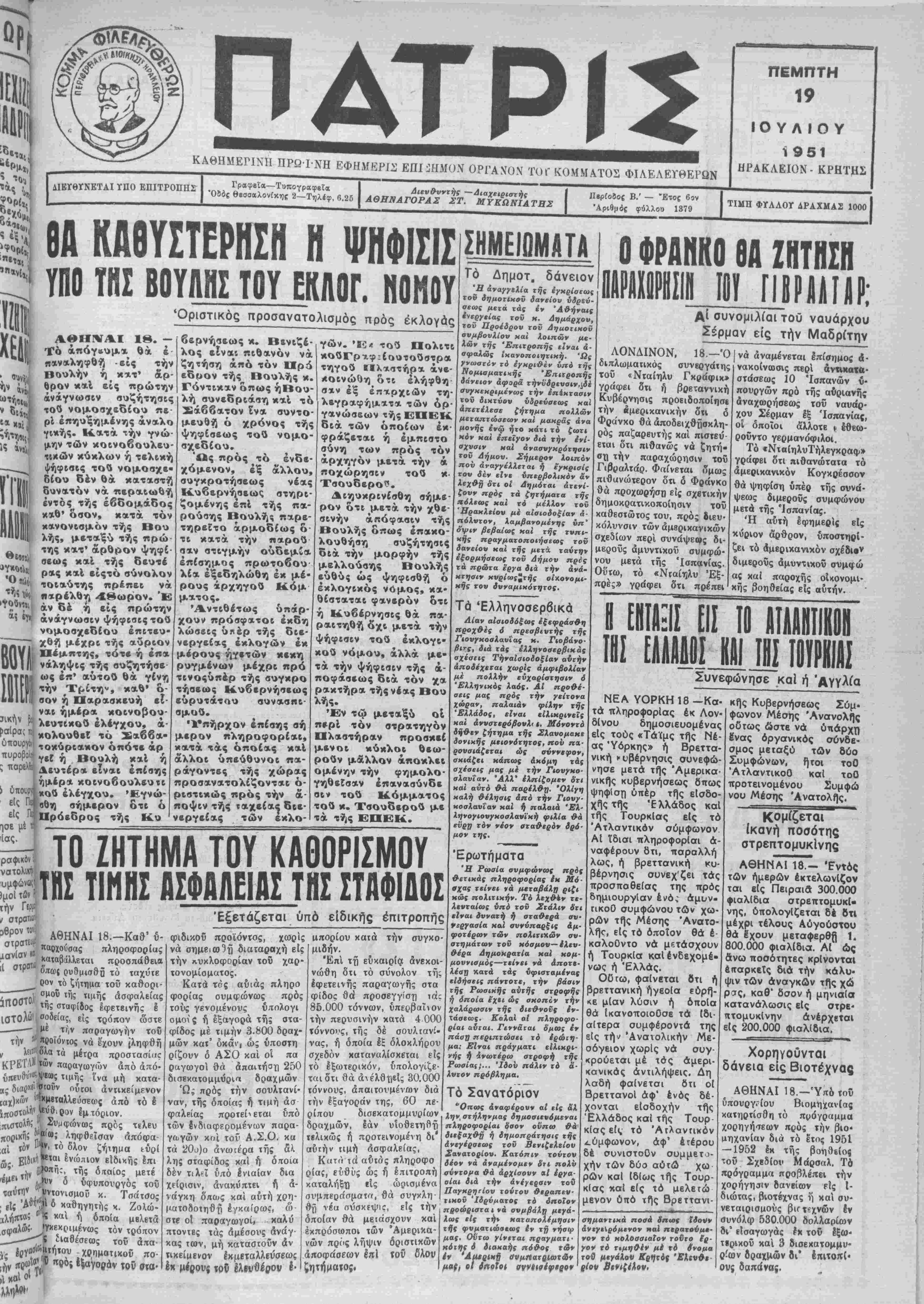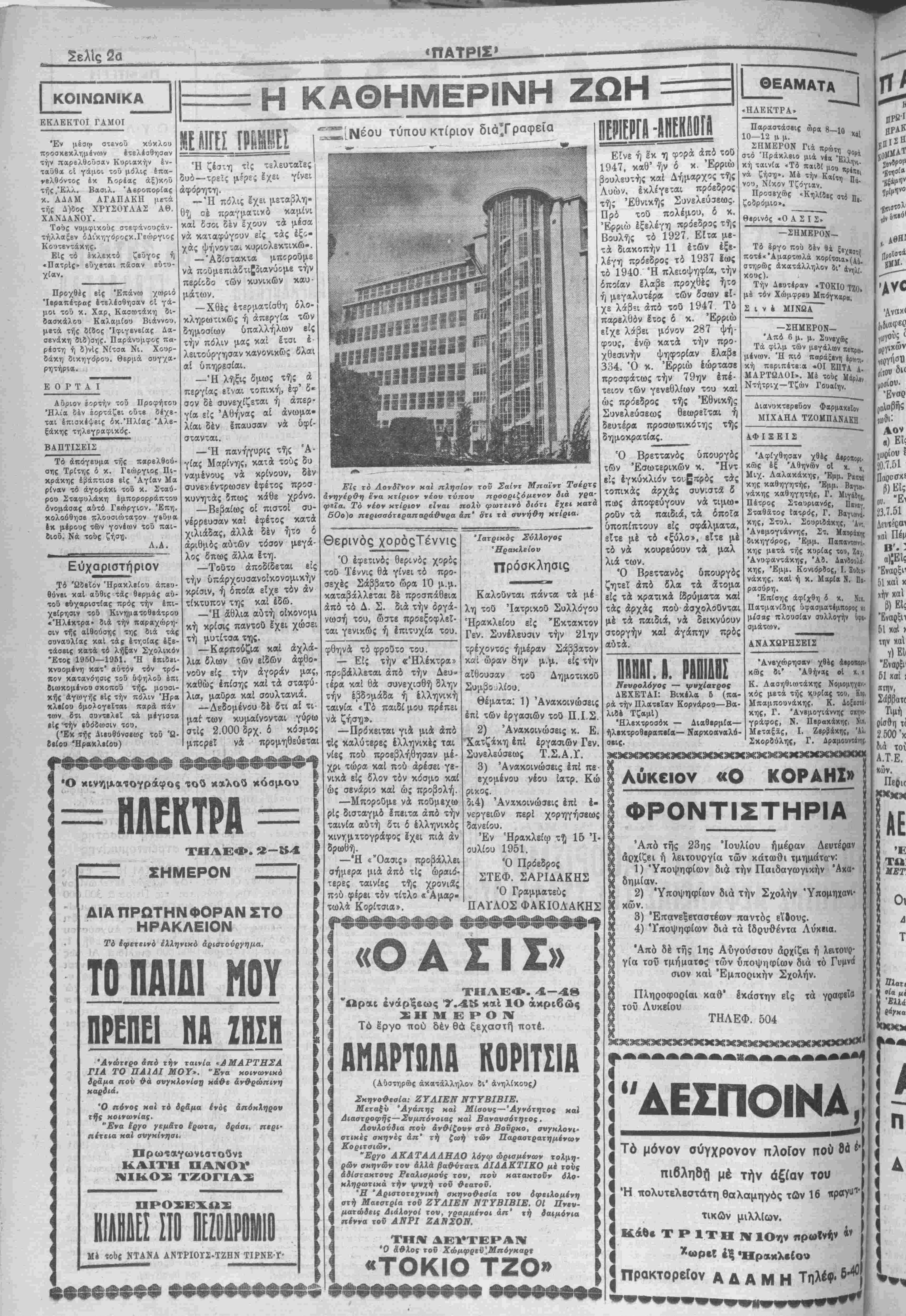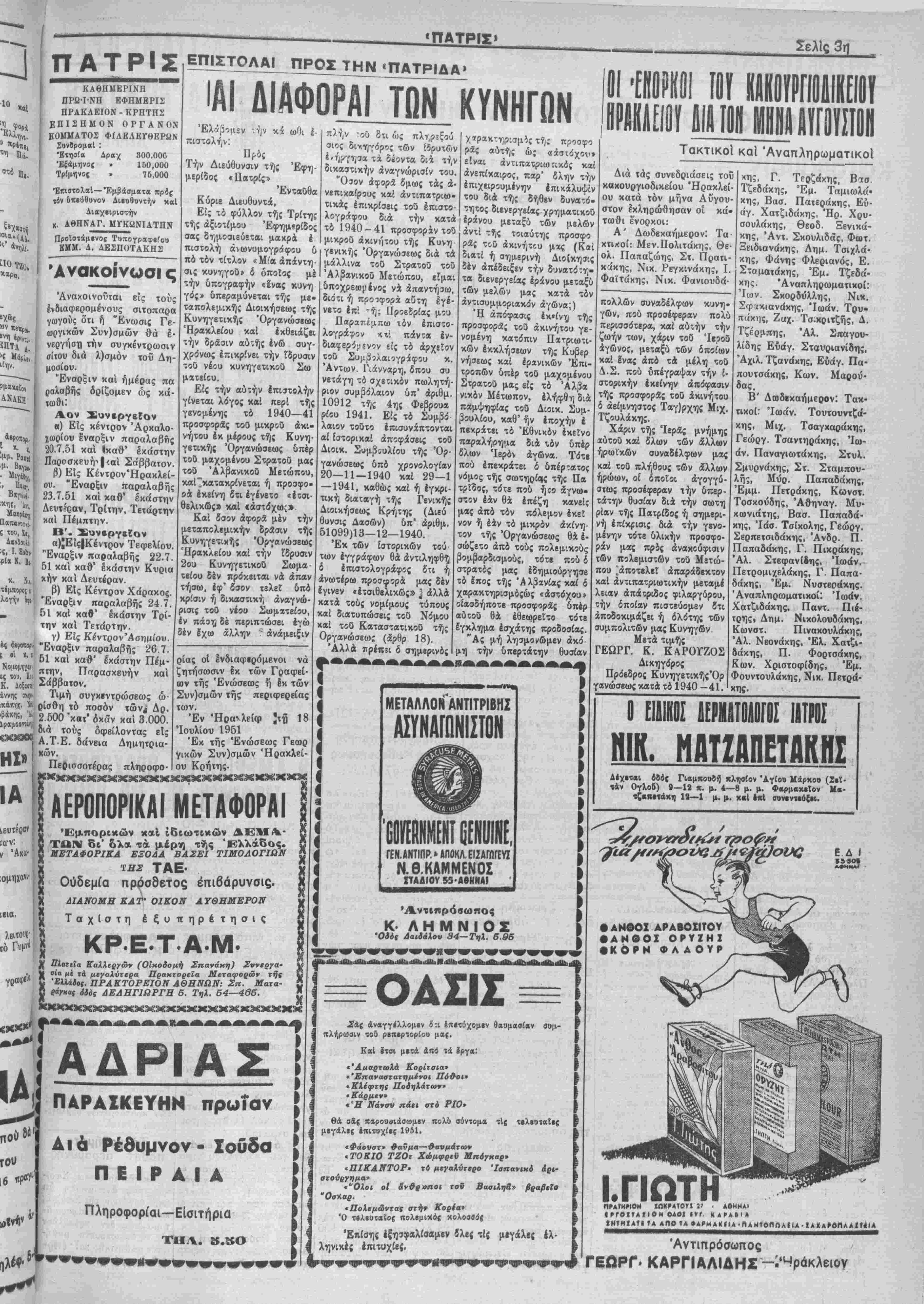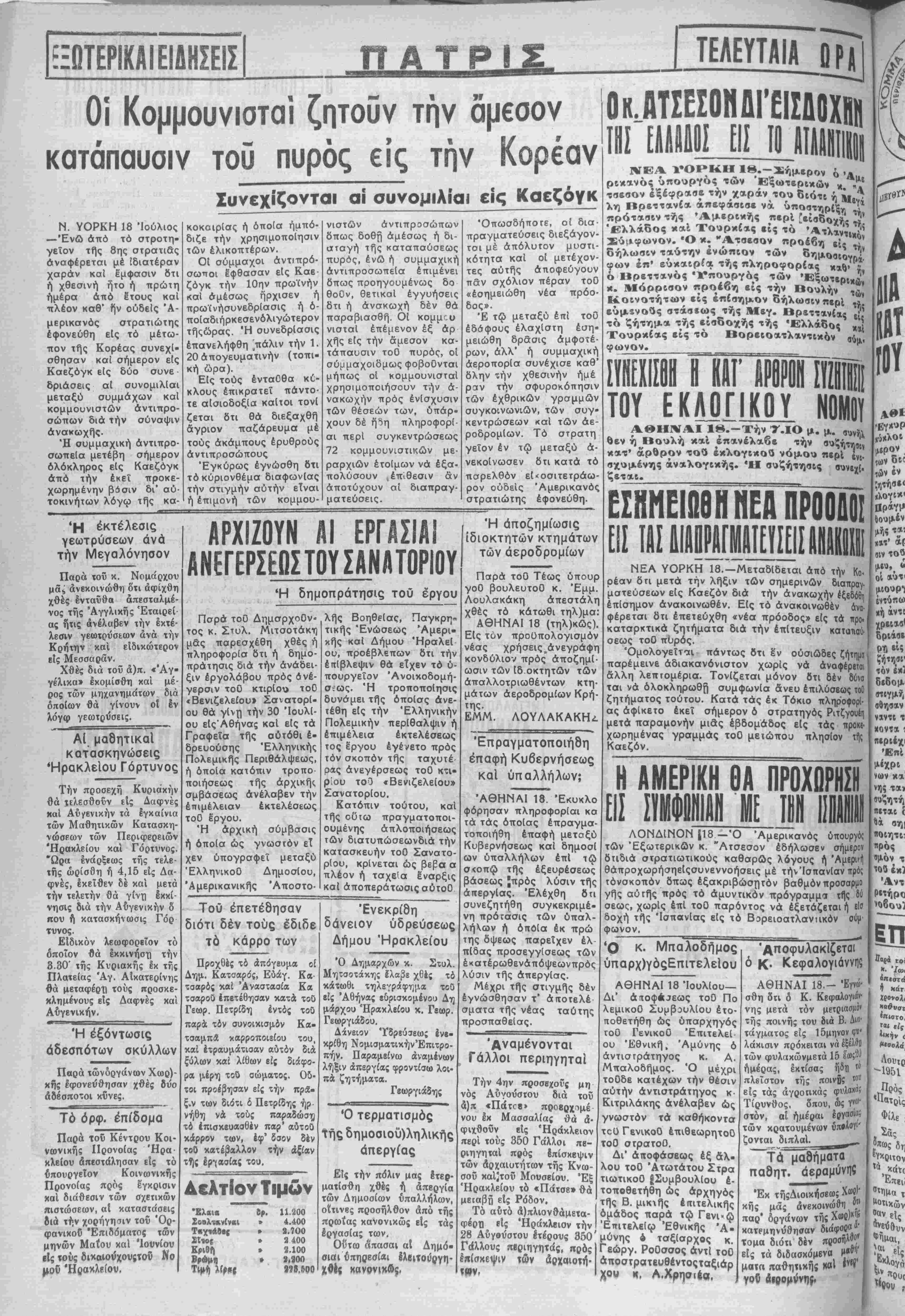 παρελθόν εί<οσιτετράω ρον ουδείς Άμερικανό στρατιώτης εφονεύθη. Ή εκτέλεσις γεωτρύσεων άνά την Μεγαλόνησον Παρά χοϋ κ. Νομάρχου μάί ανεκοινώθη ότι αφιχθη χθές ενταύθα άπεσταλμέ- νος τής Αγγλικης Έταιρεί άς ήτις άνέλαβεν την εκτέ¬ λεσιν γεωτρύσεων άνά την Κρήτην καί ειδικώτερον είς Μεσσαράν. Χθές διά τοϋ ά)π. «Άγ« γέλικα» εκομίσθη καί μέ ρος των μηχανημάτων διά οποίων θά γίνουν οί Ιν λόγω γεωτρύσεις. ΑΙ μαθητικαΐ κατασκηνώσεις Ηρακλείου Γόρτυνος Την προσέχη Κυριακήν θά ΐελεσθοΰν είς Δαφνές χαί Αύγενικήν τα Ιγκαίνια των Μαθητικών Κατασκη- νώστων των Περιφερειών "Ηρακλείου καί Γόρτυνος. "Ωρα ενάρξεως τής τελε¬ τάς ωρίσθη ή 4,15 είς Δα¬ φνές, εκείθεν δέ καί μετά την τελετήν θά γίνη Ικκί- νησΐς διά την Αύγενικήν δ «τού ή κατασκήνωσις Γόρ τυνος. Είδικόν λεωφορείον τό οποίον ΰά εκκινήσχι την 8·30' τής Κυριακής έκ τής Πλατείας Αγ. Αίκατερίνης θά μεταφέρΐ) τούς προσκε- κλημένους είς Δαφνές καί Αυγενικήν. Ή εξόντωσις άδεσπότων σκύλλων Παρά τώνόργάνων Χάλ¬ κης εφονεύθησαν χθές δύο άδέσποτοι κΰνες. Τό όρφ. έπίδομα Παρά τού Κέντρου Κοι- νωνικής Προνοίας Ηρα¬ κλείου απεστάλησαν είς τό υπουργείον Κοινωνικάς Προνοίας πρός έγκρισιν χαΐ διάθεσιν των σχετικών πιστώσεων, αί καταστάσεις διά την χορήγησιν τοΰ Όρ- φανικου Έπιδόματος των μηνών Μαΐου καί Ίουνίου είς τούς δικαΐούχουςτον Νο Ήοακλείον, ΑΡΧΙΖΟΥΝ ΑΙ ΕΡΓΑΣΙΑΙ ΑΝΕΓΕΡΣΕΩΣΤΟΥΣΑΝΛΤΟΡΙΟΥ Ή δημοπράτησις τού έργου Πσρά τοθ Δημσρχοθν· τος κ. Στυλ. Μασοτάκη μας παρεσχέθη χθές ή πληροφορΐσ 8τι ή δημο- πράτησις διά την άνάδει- ξιν Ιργολάβου πρός ανέ¬ γερσιν τοθ κτιρΐου τοθ «Βενιζελείου» Σανατορί- ου θά γίνη την 30 Ιουλί¬ ου εΙςΆθήνας καί είς τα Γραφεΐα τής αύτόθι έ» δρευούσης Έλληνικής Πολεμικής Περιθάλψεως, ή όποΐα κατόπιν τροπο ποιήσεως τής άρχικής σμβάσεως άνέλαβεν την έπιμέλειαν εκτελέσεως τοθ έργου. 'Η άρχική σύμβασις ή όποία ώς γνωστόν εί χεν ύπογραφεΐ μεταξύ ΈλληνικοΟ Δημοσίου, Άμερικανικής Άποστο· λής Βοηθείας, Παγκρη- τικής Ενώσεως Άμερι- κής καί Δήμου Ήραλεί ου, προέβλεπων δτι την επίβλεψιν θά είχεν τό υ¬ πουργείον Ανοικοδομή¬ σεως. 'Η τροποποίησις δυνάμει τής οποίας ανε¬ τέθη είς την Ελληνικήν Πολεμικήν περίθαλψιν ή έπιμέλεια εκτελέσεως τος Εργου εγένετο πρός τόν σκοπόν τής ταχυτέ ρας ανεγέρσεως τοθ κτι- ρίου τοθ «Βενιζελείου» Σανατορίου. Κατόπιν τούτου, καί τής οθτω πραγματοποι- ουμένης άπλοποιήσεως των διατυπώσεωνδιά την κατασκευήν τοθ Σανατο- ρ(ου, κρΐνεται ώς βεβα α πλέον ή ταχβΐα έναρξις καί αποπεράτωσις αύτοϋ Τού επετεθησαν διότι δέν τούς έδιδε τό κάρρο των Προχθές τό άπόγευμα οί Δημ. Κατσαρός, Εύαγ. Κα· τσαρός καί Άναστ,ασία Κα τσαροΰ επετεθησαν κατά τοθ Γεωρ. Πετρίδη έντός τοθ παρά τόν συνοικισμόν Κα¬ τσαμπά καρροποιείου τού, καί έτραυμάτιααν αυτόν διά ξύλων καί λίθων είς διάφο- ρα μέρη τοθ σώματος. Ού¬ τοι προέβησαν είς την πρά¬ ξιν των διότι ό Πετρίδης ήρ νήθη νά τούς παραδώση τό έπισκευασθέν παρ' αυτοθ κάρρον των, έφ' δσον δέν τοθ κατέβαλλον την αξίαν τϊ)ς εργασίας τού. Δελτίον Τιμώ ν 'Ελαι* Χοολτ*νίΎαι Τπν,ιάΒες Χ1 { Κριθή Βώ 11.200 4.400 8.7ΟΟ 2 400 2.100 2,300 396,500 "Ενεκρίθη δάνειον υδρεύσεως Δήμου Ηρακλείου Ό Δημαρχών κ. Στυλ. Μητσοτάκης ϊλαβε χθές τό κάτωθι τηλεγράφημ,α χοθ βίς Αθήνας βδρισκομένου Δή ιάρχοο Ηρακλείου κ. Γβωρ. Γεωργιάδου. Δάνειον Υδρεύσεως ενε¬ κρίθη Νομισματικήν'Επιτρο- πήν. Παραμείνω αναμένων λήξιν άπεργίας φροντίσω λοι¬ πά ζητ,ήματα. Γβωργιάδης Ό τερματισμός τής δημοσιού)ληλικής ά