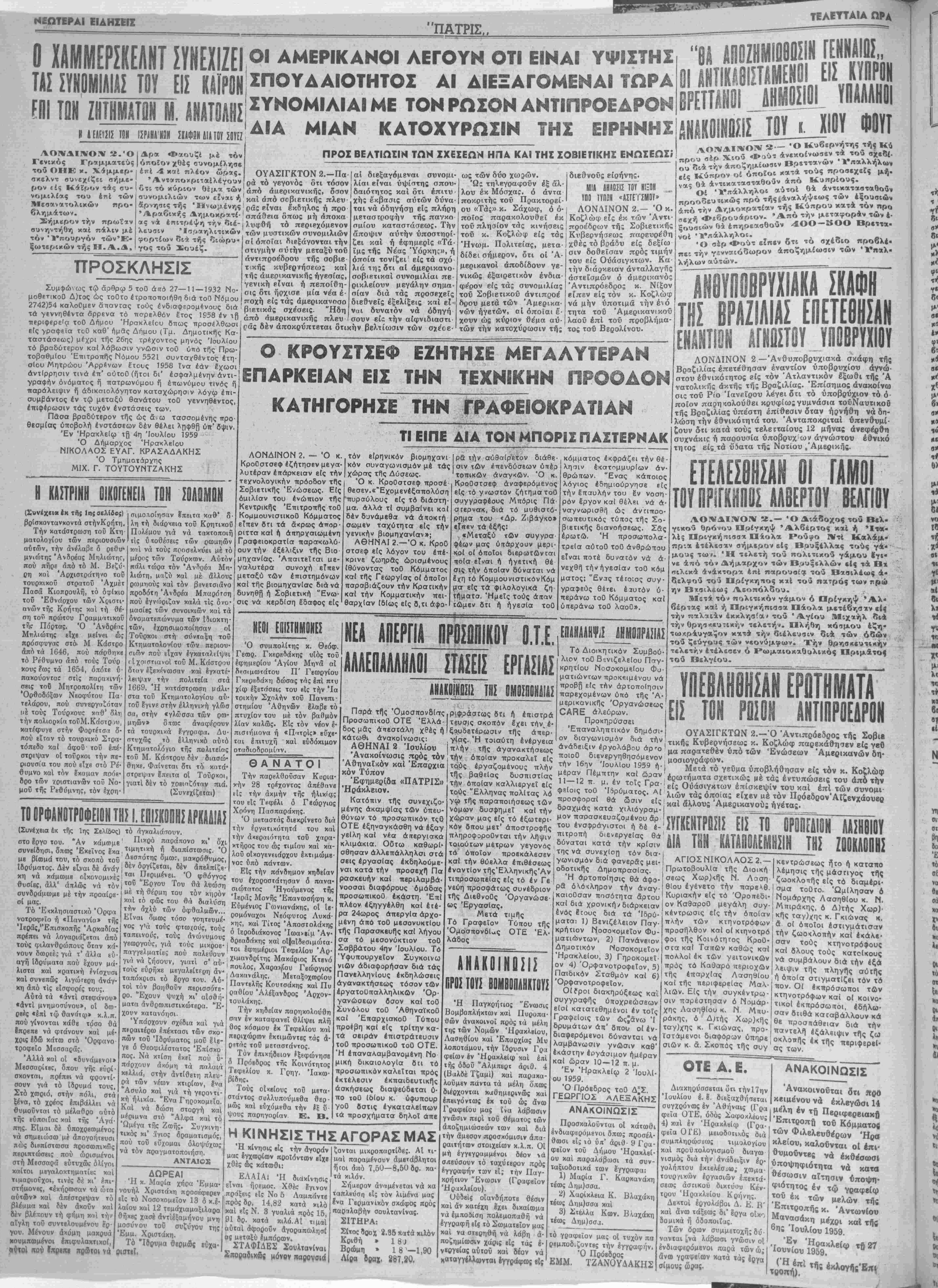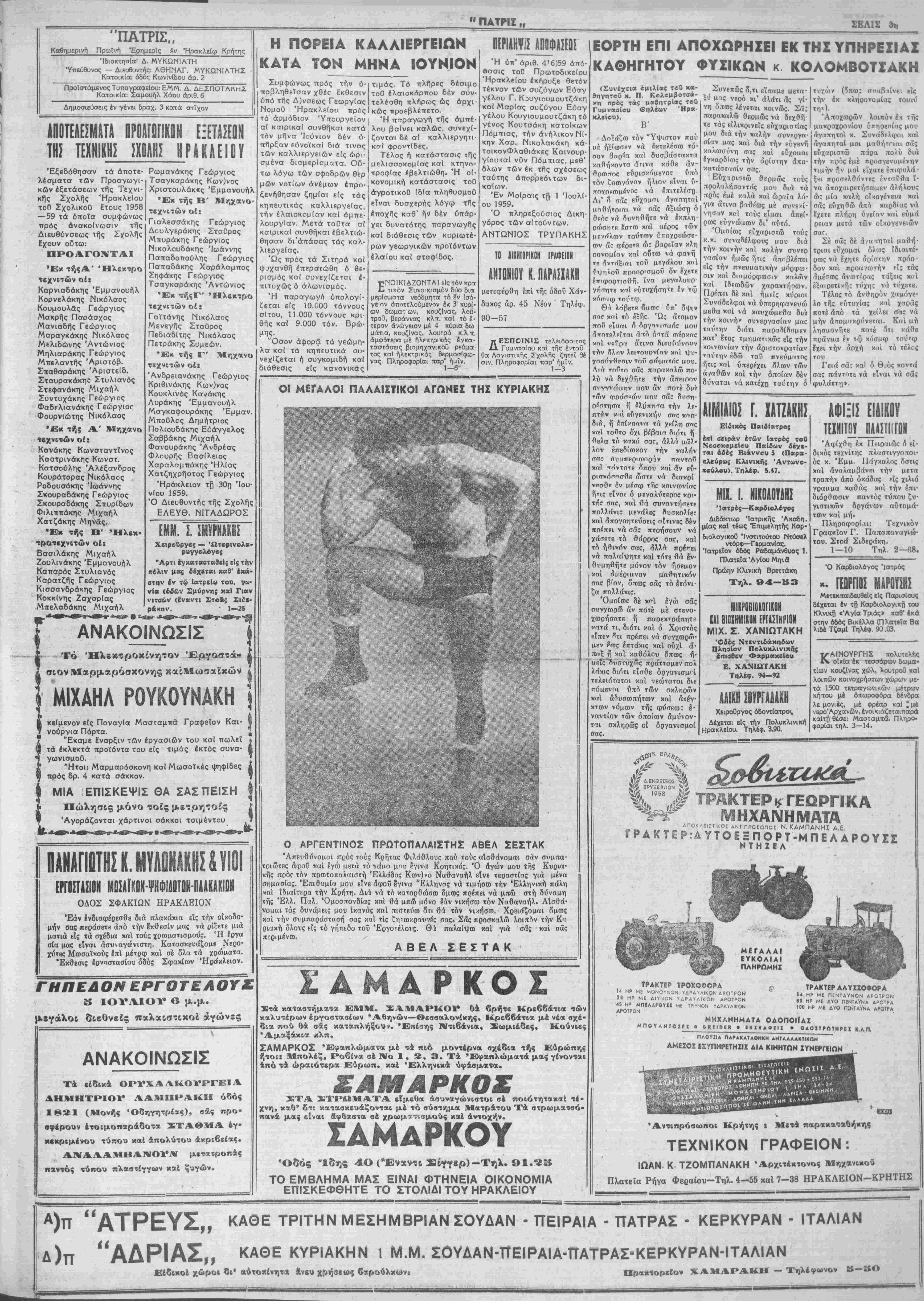 σεως Χωρ)<ής Ν. Λαση κβντρώσβως ή*το ή καταπο λέμησις τής μάσπγος τής ζωοκλοττής είς τό διαμίρι ό γραφείον μβς οί τυχόν πά ρβμποδιζοντβς την έγγραφήν. Ό Πρόβδρος ΕΜΜ. ΤΖΑΝΟΥΔΑΚΗΣ Θΐου εγένετο την παρελθ. Ι σμα τουτο. "Ωμίλησαν 6 Κυριακήν είς τό Όροιτέδι·! Νομάρχης Λασηθίου κ Ν. όν ΚαθαροΟ μεγάλη συγ-1 Μπιράκης, ό Δ)τής Χωρ)· κέντρωσις είς την οποίαν | κης ταγ)/ης κ. Γκιώνας κ. πλήν των κτηνοτρόφων α οί όποΐοι έστιγμάτισαν την ζωοκλοπήν καί εκάλε¬ σεν τούς κτηνοτρόφους καΐ δλους τούς κατοίκους νά συμβάλουν διά την έξα λειψιν τής πληγής αυτής ή όποία στιγματίζει τόν τό πον. ΟΙ ίκπρόσωποι των κτηνοτρόφων καΐ οί κοινο- τικοί έκπρόσωηοι, εδήλω¬ σαν οΐιθά καεαβάλλουν κά θε προσπάθειαν διά την παντελή έξάλειψιν τής ζω οκλο-ής έκ τής πβριφερεί· προσήλθον καί οί κΐηνοτρό φοι τής Κοινότητος ΚροΟ- σία καΐ Ταπων καθώς καί πολλοί έκ των γειτονικών πρός τό Καθαρό περιοχών τής επαρχίας Λασηθίου καί τής περιφερείας Μαλ.· λιών. Είς την συγκέντρω¬ σιν παρέστησαν ό Νομάρ¬ χης Λασηθίου κ. Ν Μτιυ· ράκης, ό Δ)τής Χωρ)<ής τσγ)χης κ. Γκιώνας, προ- ϊστάμενοι διαφόρων ύπηρε σιών κ· ά. Σκοπός τής συγ ' άς των.1 Διακηρύσσβται ίίτι τήνΠην Ιουλίου έ. §. δΐΒξαχθήσβται συγχρόνως έν Άθή φκα ΟΤΕ, όδός ΑΝΑΚΟΙΝΩΣΙΣ Άνακοινοΰται δ« «οβ κειμένου νά έκλβγώσι 14 4) καί Ιν Ηρακλείω (Γρα· φΒΪα ΟΓΕ) μειοδοτικόν διά συμπληρώσΒως τιμολογίου καί προϋ/τολογισμοϋ διαγω νισμός διά την άνάδβιξιν έρ- γολήπτου Ικιελέσοω; χοομα- τουργικών εργασιών επβκτά- σεως άστικού όικτύου Κεν· τρου Ήρακλΐΐίου Κρήνη;. Δεκταί έργολάβοι Δ. Ε. Β' καΐ άνω τάξεως δι' εργα οΐκο δομικά ή δδσποιΐας. Των δρων συμμβτοχής δύ ■ νανται ^νά λάβωσι γνώσιν οί ένδιαφϊρόμενοι παρά των ώς άνοο γραφβίων κατά τάς έργα σίμον; "ϋ τοΰ Κόμματοί των Φιλελβυθέρων Ήρβ «λβίου, καλοΰνται οί έπΐ' θυμοΰντβς νά έκθβσωσΐ ύποψηφιότητα νά κα*α θέσωσιν αίτησιν ΰποψη· "■■*"ίητος έν τφ γραφβίφ έκ των μβλών τής *-πιτροπήςκ. Άντωνίου Μανασάκη μίχοι κα^ 6ΐ)ς Ιουλίου 1959. , Έν Ήραπλβίω τΰ 27 Ιουνίου 1959.