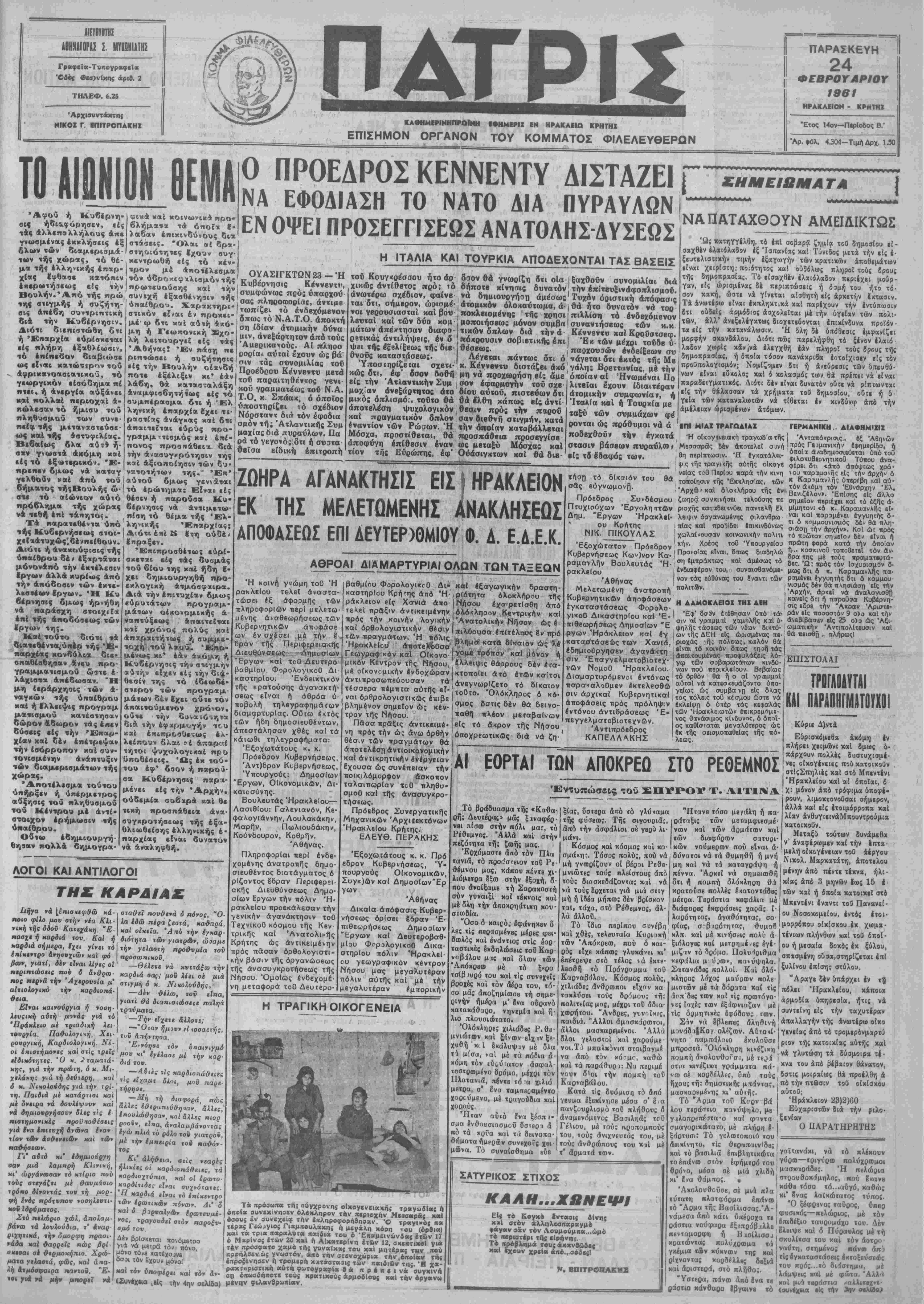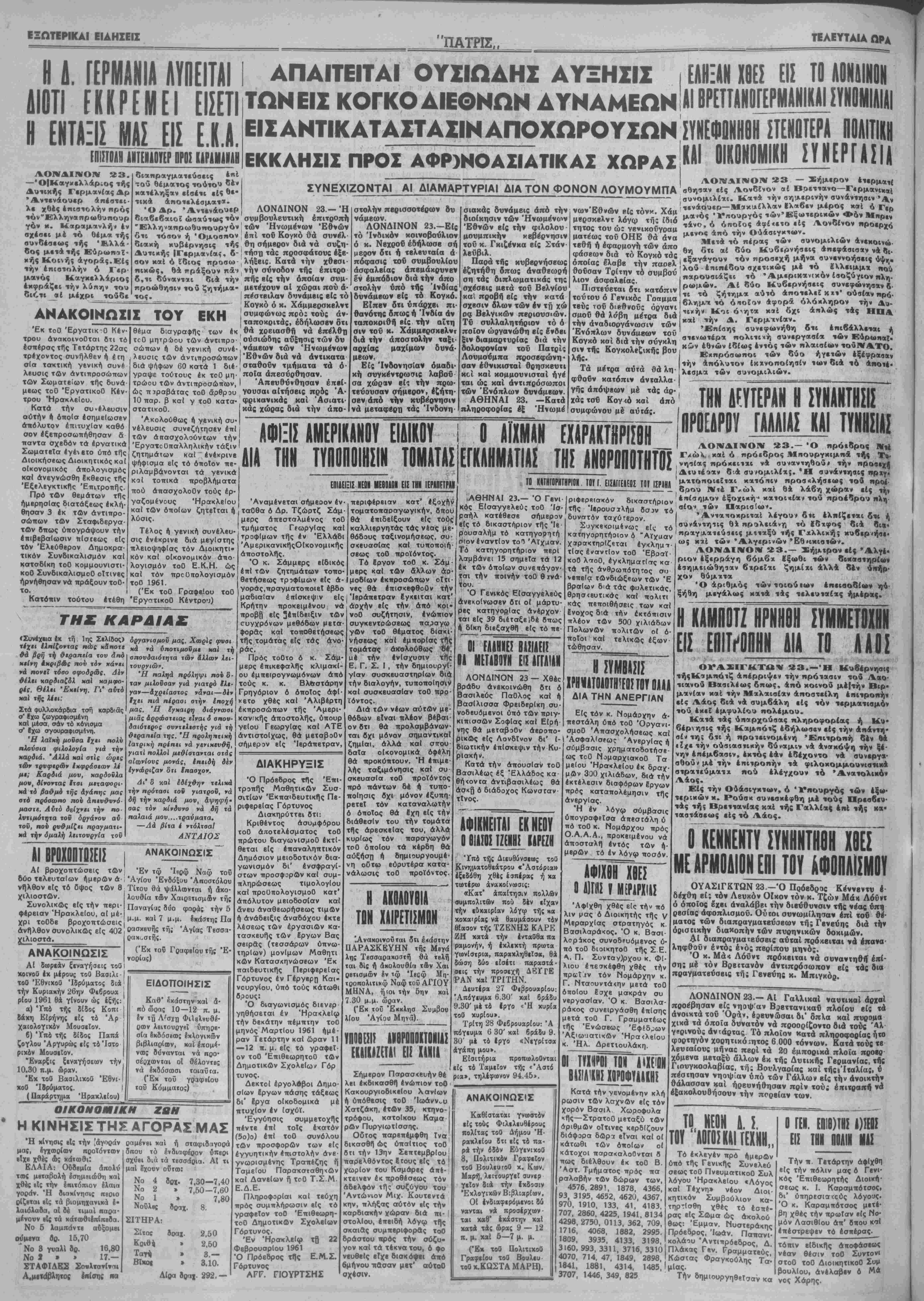 Γόρτυνος εν Γέργερρ Και< νουργίου, υπό τούς κάτωθι δρους: Ό διαγωνισμός διενβρ γηθήσεται έν Ήρακλείφ την δεκάτην πέμπτην τοθ μηνός ΜαρτΙου 1961 ημέ¬ ραν Τετάρτην καί ώραν 11 —12 π. μ. είς τό γραφεί¬ ον τοθ ΈπιθεωρητοΟ των Δημοτικών Σχολείων Γόρ τυνος. Δεκτοί έργολββοι Δημο- σίων έργων πάσης τάξεως δι' Εργα οίκοδομικά μέ πτυχίον έν Ισχύϊ. Εγγύησις συμμετοχήν πέντβ (5ο)ο) επί επί τοίς εκατόν τοθ συνόλου των προσφορών των είς έγγυητικήν επιστολήν ανε¬ γνωρισμένης Τραπέζης ή ΤσμεΙου Παρσκσταθη^ών καί Δανείον ή τοθ Τ.Σ.Μ. Ε.Δ.Ε. Πληροφορίαι καί τεύχη πρός συμπλήρωσιν είς τό γραφείον τοθ Έπιθεωρη¬ τοΟ Δημοτικόν Σχολείων Γόρτυνος. Έν Ήρακλείφ τβ 22 Φεβρουαρίου 1961 Ό Πρόεδρος της Ε.Μ.Σ. Γόρτυνος ΑΓΓ. ΓΙΟΥΡΤΣΗΣ άοχήν είς την άπό κοι· νοθ συζήτησιν, ενώπιον συγκεντρώσεως παραγω γων τοθ θέματος διακι- νήσεως καί έμπορίας τομάτας ακολούθως υ έ την ενίσχυσιν τής Ε. Γ. Σ. Ι , Την δημιουργί γίαν συσκευαστηρίων διά την διαλογήν, τυποποίησιν καί συσκευασίαν τοθ πρρ ΐόντος. Διά των νέων αυτόν μέ¬ θοδον είναι πλέον βέβαι όν 5τι θά προλαμβάνων ται βχι μόνον σημαντικαί ζημίαι, άλλά καί σπου δαΤα οίκονομικά όφέλη θά προκύπτουν. Ή έπιμε- λής ταξιμόνησις καί συ σκευασία τοθ προϊόντος πρό πάντων δέ ή τυπο- ποίησις βχι μόνον έξυπη ρετεί τόν καταναλωτήν ό όποΤας θά έχη είς την διάθεσίν τού την τομάτα τής άρεσκείας τού, άλλά κυρίος τόν παραγογόν τοθ όποίου τα κέρδη θά αυξήση ή δημιουργουμβ· νη ούτω εϋρυτέρα κατα¬ νάλωσις τοθ προϊόντος. Ι ΑΧΟλΟΥΙΙΑ ΤΟΝ ΧΑΙΡΕΤΙΣΜΟΝ ',Αναχοινούται δτι εκάστην ΠΑΡΑΣΚΕΥΗΝ τής Μβγά λης Τβσσαρακοστή θά τβλη ται δίς ή άκολουθία τδν Χαι οβτισμων έν ιφ 'Ιβςφ Μη- ροπολιτιχψ Ναώ τοΰ ΑΓΙΟΥ ΜΗΝ Α, ήιοι την 5ην καί 7.30 μ.μ. ώραν. (Έμ τοϋ Έκκλησ Συμβον λίου Άγίου Μηνά). ΥΠ0ΘΕ5Π ΔΝΒΡΩΠΟΚΤΟΝΙΑ! ΕΚλΙΚΙΖίΤΑΙ ΕΙ{ ΧΑΝΙΑ ΑΘΗΝΑΙ 23.— Ό Γενι κός Εισαγγελεύς τοθ Ίσ· ραήλ κατέθεσε σήμερον είς τό δικαστήριον τής Ίε ρουσαλήμ τό κατηγορηΐή 0ΐρν εναντίον τοθ Άϊχμαν. Τό κατηγορητήριον περΐ λαμβάνει 15 σημβΤα τα 12 εκ των οποίων συνειάγον- ται την ποινήν τοθ θινά· Τού. Ό Γενικός Εισαγγελεύς ανεκοίνωσεν Οτι οί μάρτυ- ρες κατηγο^ίας άνέρχον τσι είς 39 διέταξείβέ όπως ή δίκη διεξαχθή είς τό πε· μ ρή; ρο4 1^Π1 δρου Ντέ Γ-ώλ καί θλ λάβη χώραν είς ι*,, ί έξή ί ύ έβ λ Πολωνων ποΤοι καί τώθησαν. πολιτων οί ό· τελικως έξων· ΟΙ ίΑΑΝΧΗ ΒΛ2ΙΛΕΙ! ΙΑ ΜΕΤΑΒίϊΝ ΕΙΣ ΑΓΓΛΙΑΝ ΛΟΝΔΙΝΟΝ 23— Χθέο βράδυ ανεκοινώθη δτι ό Βασιλεύς Παθλος καί ή Βασίλισσα ΦρειδερΙκη συ- νοδευόμενοι υπό των πριγ- κιπισσων Σοφίας καί Είρή- νης θά μεταβσθν άεροπο- σμοθ 'Απασχολήσεως' κάί ρικως είς Λονδίνον δι' Ι-1 Άσφαλ'σϊως Άνεργΐας ή 1 ΣΥΜΒΑΣΙΣ ΧΡΗ«ΔΤ0ΑΟΤΗ!Ε0ΣΤΟΥΟΑΑΔ ΔΙΑ ΤΗΝ ΑΝΕΡΠΑΝ Είς τόν κ. Νομάρχην α¬ πεστάλη υπό τοθ Όργανι. ριφερβ.ακόν δικαστήριον επίσημον έξοχιπή- κατοι«ί«» τού πρόεδρον πλτ,· τής Ίβρουσχλήμ βσ» τό'"<Λ" '"ί"' "*"""'"" δυνατόν ταχύΓερόν. Συγκεκριμένως είς τό κατηγορητήοΐον ό "Άϊχααν χατρακτηρΐζβται έγκληυτ τίσς εναντίον τοθ Έβραϊ- κοθ λατοθ, έγ«λημα:(α·ς κα Τα τής ανθρωπότητος συ νεπεΐα τώνδιώξβων των Έ βραίων διά τάς φυλετικάς, θρησ<ευτικάς καί πολιτι κάς πεποιθήσει των καί Ενοχος διά την έκτόπισιν πλέον των 500 χιλιάδων Ανταποκριταί λέγουν δ τι έληίζεναι ότι ή ηρολειάνη τό ϊδχφος δια δι», •.τταξύ τής ΓαλλΐΜή; χυβερ«ήβε· *Αλγερινών Έθ'ΐκιστών. ΛΟΝΔΙΝΟΝ 23.— Σήμτρον είς 'Αλγέ· ριον έξΐρράγη βόμβχ Ιξωθι των δικαιαιηρίων εσημειώθησαν βχρεΐαι ζημίαι άλλΐ δέν υπήρ¬ χον θυμχτα Ό άρτθμός τώντοιούιων επεισοδίον ηύ· ξήθη μεγάλως χατά τας τε