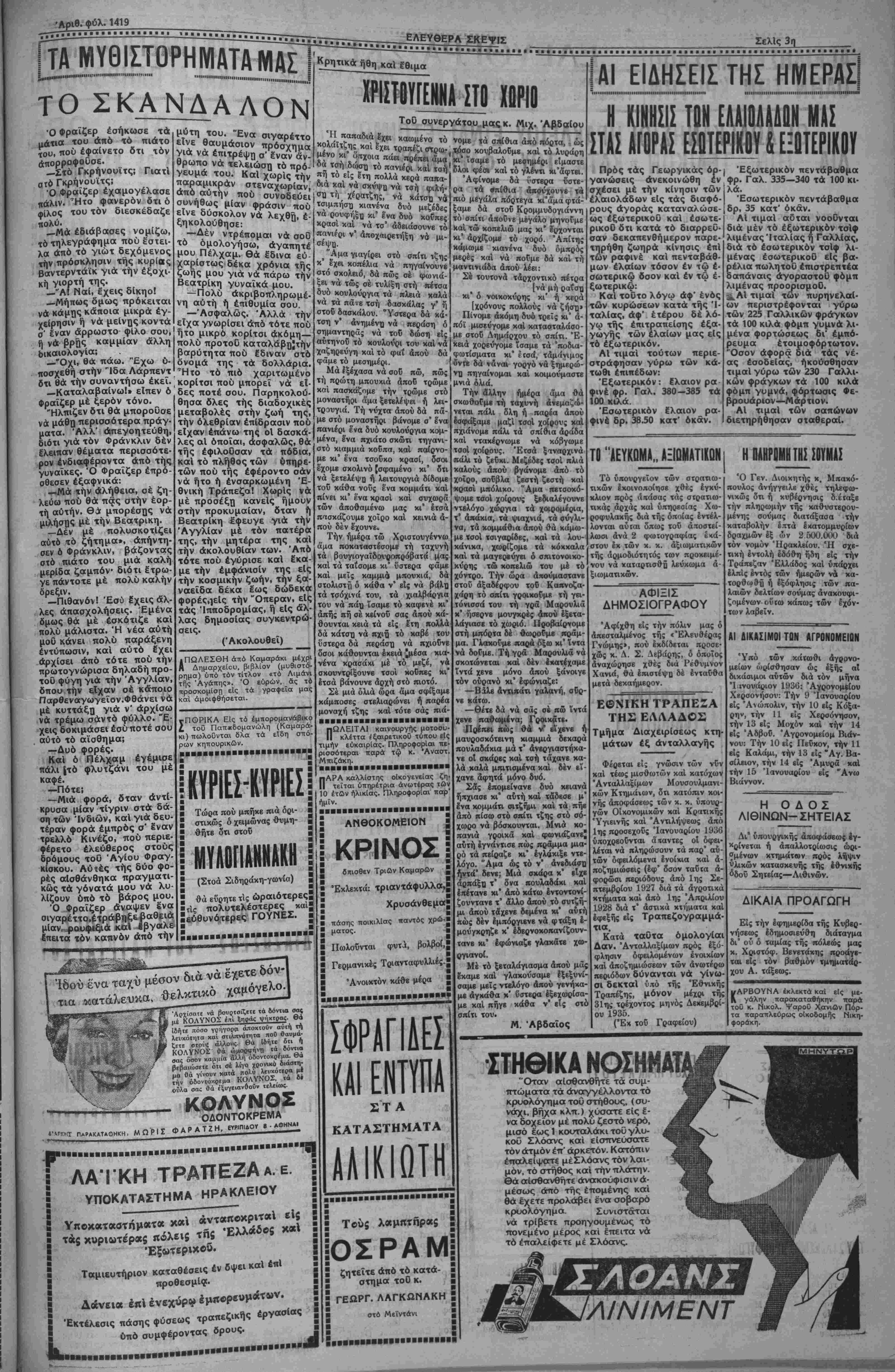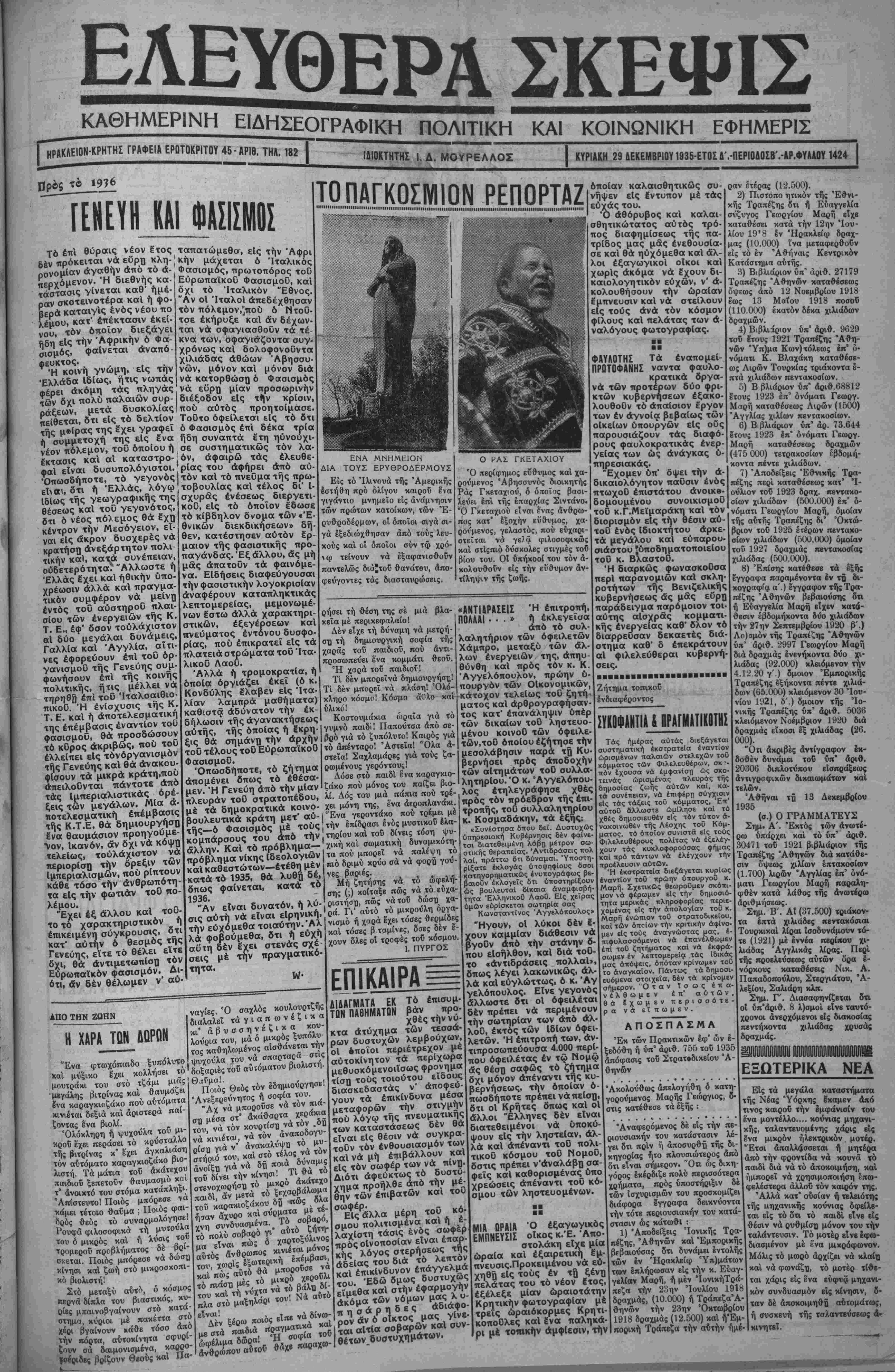 ΗΡΑΚΛΕΙΟΝ-ΚΡΗΤΗΣ ΓΡΑΦΕΙΑ ΕΡΟΤΟΚΡΙΤΟΥ 45-ΑΡΙΒ. ΤΗΛ. 182 | ΙΑΙΡΚΤΗΤΗΣ Ι. Δ. ΜΟΥΡΕΛΛΟΣ | ΚΥΡΙΑΙ 29 ΔΕΚΕΜΒΡΙΟΥ 1935-ΕΤΟΙ Α.-ΠΕΡΙΟίΟΣΒ'.-ΑΡ.ΦΥΑΑΟΥ 1424