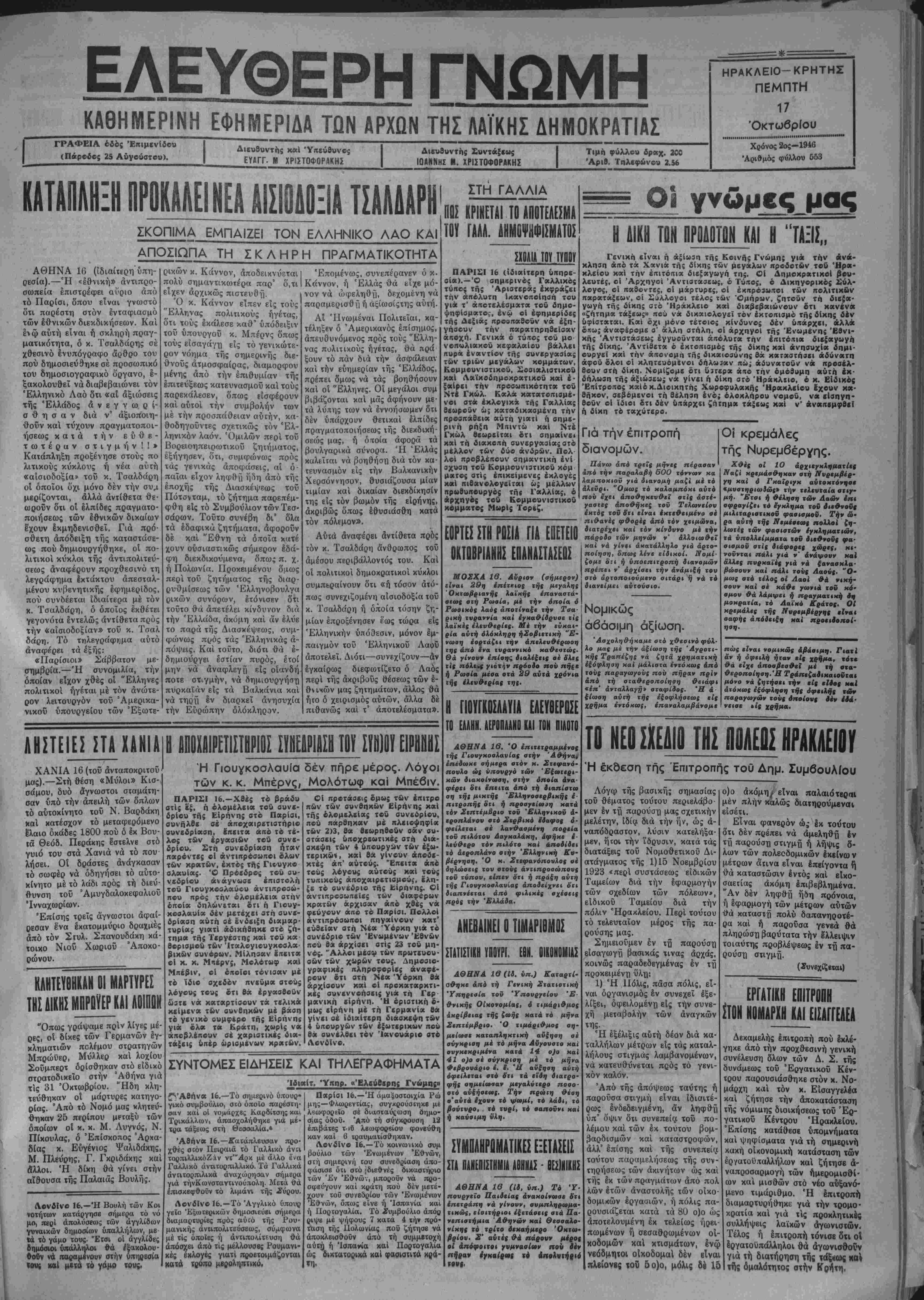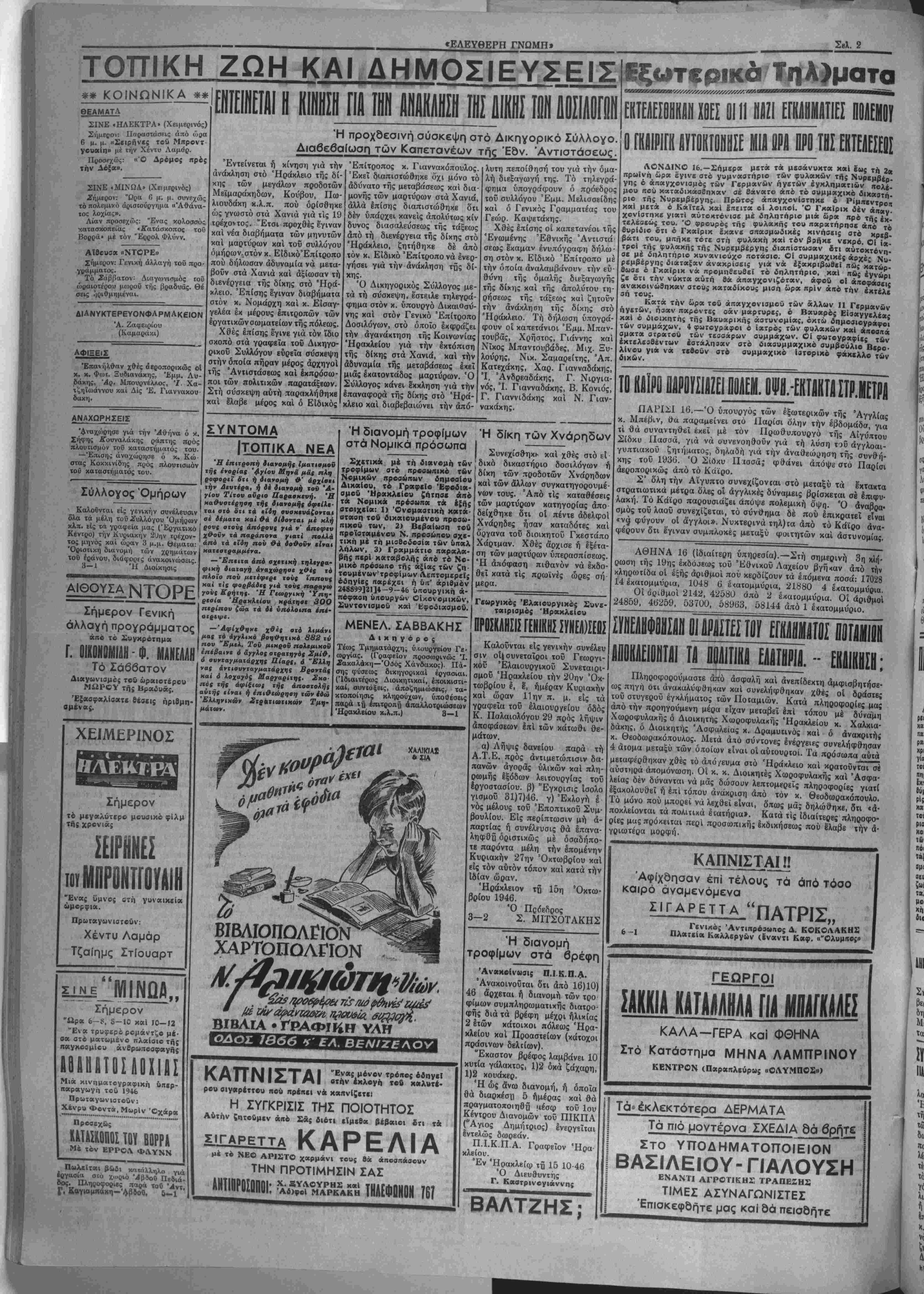 χθοϋν τα παράπονα γ<αΐϊ ποΛλα άπό τα ειδή πον θά δο^οΰν είναι κατεστραμμένα. — "Επιιτα άπό βχετική ιηλεγρα- φιχή διαΐαγή άναχώρησε χθές τό πλοϊο πού μετέφερε τούς ΐ'ππους καϊ τίς φορβά&ις γιά τσϋς «αραγώ γοΰς Κρήτης. Ή Γεωργική Ύπη· ρεοία 'Ηρακλιίον κράτησε 300 περίπου ζώα τα δέ ΰπόλοιπα έπέ- ΧΕΙΜΕΡΙΝΟΣ Σήμερον τό μεγαλύτερο μβοσικβ φίλμ Τής χρονίας ΣΗΕΣ ΤΟΥ "Ενκς ΰμνος οτή γυναικβία Πρωταγωνιστοϋν: Χέντυ Λαμάρ Τζαίημς Στίουαρτ Σήμερον ϋρα 6-?, δ—10 καί 10-12 "Εν α τρυφερί ρομάντζο μέ· σα στο ματωμένο πλαίοΐο της «αγκβομίου άν6ρωιτοσφαγήί Α 3 Α II β Τ Ο Ζ Λ Ο ϊ ΙΑ ί Μιά κινηματογραφΐκή ύπερ- παραγωγή τοϋ 1946 Πρωταγωνιοτοθν: Χ4νρ« Φοντά,ΜωρΙν Όχ«ρ« Προσεχώς ΚλΐΑΙΗ ΤΟΥ ΒΟΡΡΑ Μ4 τον ΕΡΡΟΛ ΦΛΥΝΝ Πυλΐϊται βϊιίι κατόλληλο γιά έργαοία σΐό χ.υριό Άβδοϋ Πεδιά¬ δος. Πληροφοριες παρά τοθ Άντ. Γ, Καγιαμπάκη—'ΑβδοΟ. &—ι — Άφίχθηκε χθές σΐό λιμανι μας τό άγγλικό βοηθητικό 882 χύ που "Εμΐλ. Τοΰ μικροΰ πολεμικον έπέβαινε ό άγγλοι οτραΐηγός Σμίθ, ό συνταγμαΐάρχης Πίαρς, ό "Ελλη νας άντισυνταγματάρχης Βροντάς χαί ά λοχαγός Μαργαριΐης. Σκο- πας τής άφίξιωι τής άποοτολής αΰΐής είναι ή ίηι&ιώρηοη την έοώ Ελληνικήν Σΐ0ατι«τικ«ν Γμη- μάΐων. Ή διανομή τροφίμων στά Νομικά πρόσωπα Σχετικά μέ τή διανομή των τροφίμων στό προβΜπικό των Νομικών προσώπων δημοβίβν ΔικαΙβυ, τό Γραφΐΐο 'Εφοίια- σμοΰ 'Ηρακλείου ζήτπσΐ άπό τα Νομικά πρόσωπα τα ίξής οτοιχεΐα: 1) Όνομαβτική κατά- αταση τοΰ δικαιούμενοι) προσω¬ πικού των, 2) ΒεβαΙωση τοΰ προϊδταμβνου Ν. προσώπου αχκ- τική μέ τή μιαβοδοσία των ΰΐταλ λήλων, 3) Γραμμάτιο παραλα- βης περΐ καταβολής άπό τό Νο- μικό πρόοωπο της άξίας των ζη· το^μίνων τροςρίμων Λεπτομερείς όδηγίες πκρέχΕΐ ή ύιΐ' αριθμόν 248899121]4-9~46 ύποοργική Λ- πόφαοη ύπουργών ΟίΛθνομικών, Συντονισμοΰ καί Έφθύιασμοΰ. Ή δίκη των Χνάρηδων Ι Συνεχίσθηχε καί χθές στό εί | δικό δικαστήριο δοσιλόγων ή | δίκη των προδοτών Χνάρηδων καί των άλλων συγκατηγορουμέ- νων τους. Άπό τίς καταθέσεις των μαρτύρων κατηγορίας άπο δείχθηκε δτι οί πέντε άδελφοί Χνάρηδες ήσαν καταδότες καί δργανα τοΰ διοικητοΰ Γκεστάπο Χάρτμαν. Χθές άρχισε τ) εξετά¬ ση των μαρτύρων ύπερασπίσεως. Ή άπόφαση πιθανόν νά έκδο- θεϊ κατά τίς πρωϊνές ώρες σή μερά. ΜΕΝΕΛ. ΣΑΒΒΑΚΗΣ Δικηγόρο; Τέως Τμηματάρχη, ύ.ιουργείου Γβ· ωργίας. (Γραφείον προσωρινώς Ί. Σακαλάκη—Όθός Χάνδακος). Πά¬ σης φύσεως δικηγορικαί εργασιαι. (Ιδιαιτέρως Διοικητικαί, έποικιατι- καί, ουντόξεις, άποζημιώοβις, τα- κτοποίησις κληρούχων, ύποόέσεις παρά τ|) έπιτροπϋ απαλλοτριώσεως Ηρακλείου κ.λ.π.) 3-1 ΧΑΛΙΚΙΑΪ *ί!Α ΒΙΒΛΙΟΠΟΛίΙΟΝ ΧΑΡΤΟΠΩΛΠΟΝ ΟΔΟΙ. Ιθόό V £Λ. ΒΕΝΙΖΕΛΟΥ "Ενας μόνβν τροπβς βδηγεΐ οτή ν έχλβγή τβΰ καλοτέ- ρβ» βιν«ρ*ττβυ πού ηρέκει ν* χαχνίζΐτει Η ΣΥΓΚΡΙΣΙΣ ΤΗΣ ΠΟΙΟΤΗΤΟΣ Αυτήν ζητούμεν άπό £«ς διότι είμεθα βεβαιοί «τ» τ« -ΊΑΡΕΤΤΑ ΚΑΡΕΛΙΑ μέ τ· ΝΕΟ ΑΡΙ2ΤΟ χαρμάνι τους 6ά άποσπάσονν ΤΗΝ ΠΡΟΤΙΜΗΣΙΝ ΣΑΣ ΑΝΤΙΠΡΟΣΩΠΟΙ: ^ΰ^ΒΆΆ ΤΗΛΕΦΩΝΟΝ Τ6? Γβωργικός 'Ελαιουργικός Συνε- ταιρισμός Ήρακλβίου ΠΡΟΣΚΛΗΣΙΣ ΓΕΝΙΚΗΣ -ΪΝΕΛ)Ι£ύ_ Καλοΰνται είς γενικήν συνέλευ σιν οί|συνεταΐροι τοϋ Γεωργι- κον Έλαιουργικοΰ Συνεταιρι- σμοΰ Ηρακλείου την 20ην Όκ- τωβρίου ε, ε, ημέραν Κυριακήν καί ώραν 11 ην π. μ. είς τα γραφεϊα τοΰ έλαιουργείου δδός Κ. Παλαιολόγου 29 πρός λήψιν άποφάσεων επί των κάτωθι θε- μάτων, α) Λήψις δανείου παρά τή Α.Τ.Ε. πρός αντιμετώπισιν δα- πανών άγορας υλικών καί πλη- ρωμής έξόδων λειτουργίας τοΰ Ιργοστασίου. β) "Εγκρισις Ισολο γισμοΰ 31)7)46. γ) Έχλογή έ νός μέλους τοΰ Έποπτικοϋ Συμ- βουλίο