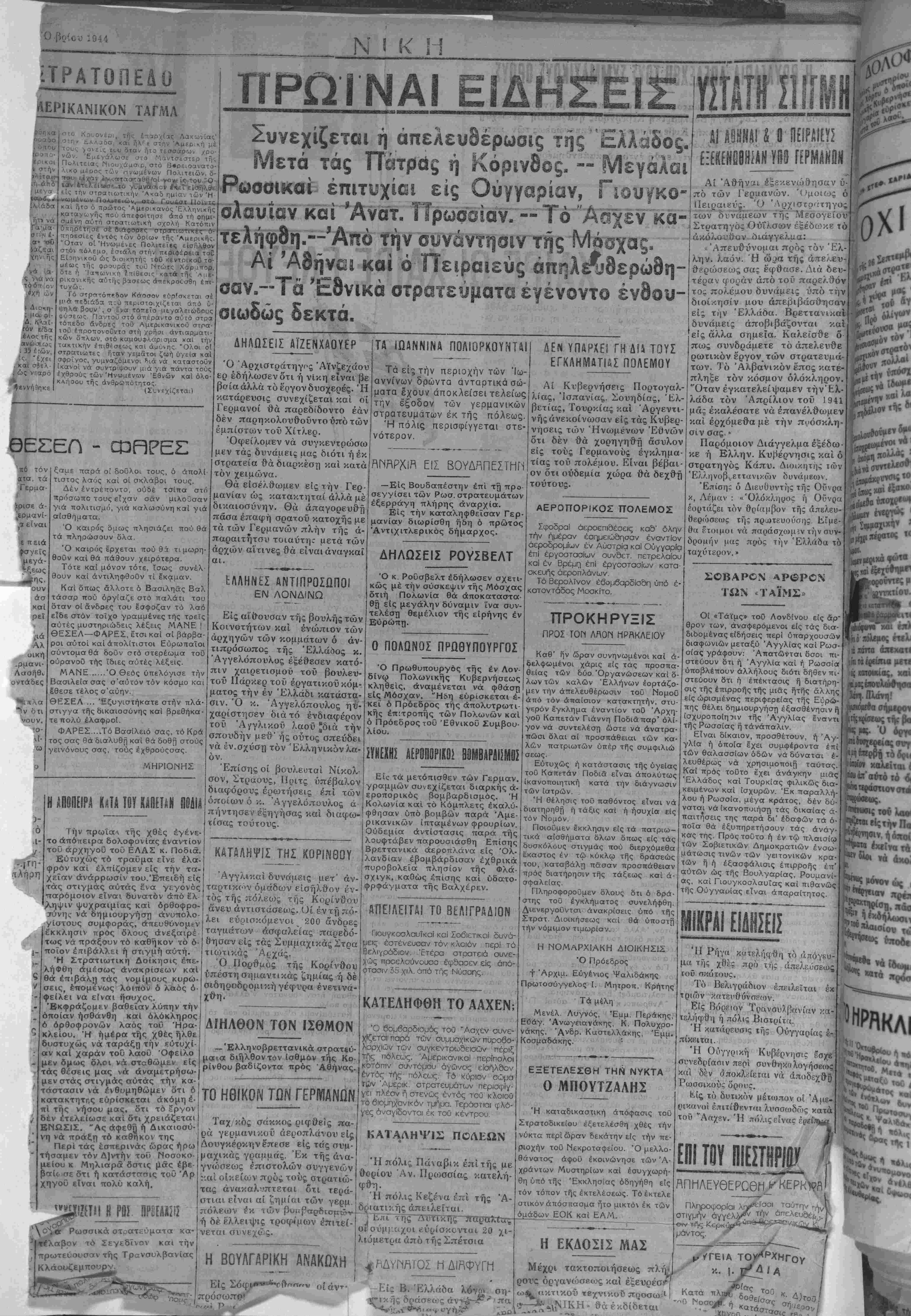 κ.α9ή<ον παντός έ'Λληνος. Έναρμονισις των προσιταθειών τοΰ έθνους πρός την κατεύθυνσιν τής άνασυ νκροτήσεως τού Κράτους. Άττοκατασταοις ιών θεομών καί των νόμων καί Άπονομη Δικαιοσύνης πρός Κ3σας τάς πλευράς Αύτό αποτελεί τό πρώτον βήμα τό οποίον ηνωμένοι οφείλομεν ολοι ό- νεξαιρέτως οί έλληνες να κάμωμεν έν όμονοία καί έν συμπνοΐα. Ό καθείς μας όφείλει να τεθή είς την διάθεσιν τής πατρίδος ώς στρα- τιώτης πειθαρχικός μέ την συναίοθη σιν δ τι εκεΐνο το όποΐο θά πράξη, θά είναι συντελεστικο είς την αναδη¬ μιουργίαν των Έθνικών δυνάμεων υλικών καί ήθικών. Κάθε δράσις άνεύθυνος καί χωρι- στική εξε,ρχομένη τοΰ πλαισΐου τής ήρμονισμένης προσπαθείας θά άπε- τέλη προδοσίαν πρός την επιθυμίαν καί την θέλησιν τού λαοΰ. Τό πρώτο βήαα πρέπει νά γίνη, άπό δλους τούς Έλλην·ας. Νά παραμερϊσουν αί παρά- καιροι φιλοόοξια. αί εγωϊστικαί ϊά- σεις ό άριβισμός των μικροπολιτικον, ή ϊδιοτέλεια καί ύπολογισμος των αι· κρονόων εκείνην οί όποΐοι είναι δυ¬ νατόν νά ύπολονΐζουν δτι ή τταροΰσα κατάστασις θά έπέτρεπε είς αύτούς βιαίας ενεργείας, αναρχικάς έκδηλώ- σεις καί δράσιν ή όποία θά επέφερε τό τελειωακόν κτύτίημα είς την αί- μαααουσα άπό την μακράν εχθρικήν κατοχήν καί δουΛείαν πστρίδα μας. 'Υπάρχει όητή δήλωσις καί οπόσχε- σις τής Πανελλαδικής Έθνικής Κυ βερνήσεως δτι την τύχην τού θά κα¬ νονίση, αύτάς οΰτος ό λαός. Συντό¬ μως θά κληθή νά έκλέξρ, αλλα καί θά αρνηθή μέ όλην τού την δύναμιν να υποστή άκόμη μίαν φοράν την επιβολήν καταστάσεως ξένης πρός την συνείδησιν τού. Είς τον εγκέφαλον καί την καρ¬ δίαν παντός Έλληνος έχουν πλέον ώριμάσει δλα έκεΐνα τα όπσΐα άπαι- τεϊ διά νά ζήση, ώς άνθρωπος πολι· τισμένος. Καί τό πολίτευμα καί ή Κυβέρνησις τα όποΐα θά έκλέξη θά άποτελέσουν δΓ αυτόν εγγύησιν τής πραγματο¬ ποιήσεως τής θελήσεως τού. Ουδείς λαός έξ έκείνων οί όποΐοι ήδη άπά πενταετίας αίματοκυλίεται θά αφήση, νά επανέλθη είς τα συστή- ματα έκεΐνα ποΰ τόν έ'φεραν δύο φορές είς διάστημα 25 έτών είς την Φοβερωτέραν κρίσιν άπό δσας άνα· φέρει ή ίστορία. Καί επί τοθ σημείου τούτου καί ό Ελληνικάς λαός εχει πλήρη έπίγνω- σιν των υποχρεώσεων τού άλλά καί των δικαιωμάτων τού, προκειμένου νά παραμείνη ώς ζωτικόν στοιχείον είς την χορεΐαν των πεπολιτισμένον Εθνών. Ασφαλώς θά ήδικεΐτο τα μέγιστα δταν ΰστερα άπο μίαν σκο- τεινήν τετραετίαν δικτατορίας καΐ έν συνεχεία άπό μίαν άλλην τετραετίαν πρωτοφανοΰο δουλείας ύπέκυπτε είς μίαν βιαίαν πολιτικήν, κοινωνικήν καί οικονομικήν δικτατορίαν οίασδή- ποτε μορφής, έφ' δσον τό τοιούτον δέν θά ήτο τό άποτέλεσμα τής σα· φοϋς καί Ιδίας αύτοθ θελήσεως. Ή Κυβέρνησις υπεσχέθη. "Ημείς θά κρίνωμεν έν καιρώ. Πρός τό παρόν, καί είς την μετα¬ βατικήν αυτήν περίοδον κατά την ό¬ ποιαν έξακολουθεΐ νά διαμορφοθται ή κατάστασις τόσον ή Κοινωνικη δσον καί ή Πολιτική καί ή Οίκονομική θά άπετέλη παραδοξολογίαν καίθά έδη- "ργη άνυπολογίστους καταστασ¬ ίς κσΛε παράκαιρος καί πρόωρος ΜΙΧ. ΑΚΟΥΜ/Α" Ή ττοθητή ήμέρα τής ελευθερίας ήλθε. Δεν είναι όμ·*), τώρα άκόμη καιρος νά γ- νη ό άπολογισμος. Γο τί μάς έκόστισε ολοι το γνωρίζομε Είναι νωπά άκόιιη τα γεγονότα. Τα δακουα δέν στερεφαν άπό τα μάτια των όρφανών καΐ των χηοών. Ή πληγές δέν στεγνωσαν άκόμη άπό τό αίμα ό καπνός των καμμένων σπιτιών μας δέν διελύθη άκομη. Ό τρόμος συδέ- μελα άκόμη τραντάζει τής καοδιές μας. Θάρθη ή μερά νά μετρηθοϋμε Οάρδη ή με¬ ρά των γαριααμών. Τώρα πρέπει νά εύφρανδοΰμε πρέπει ν