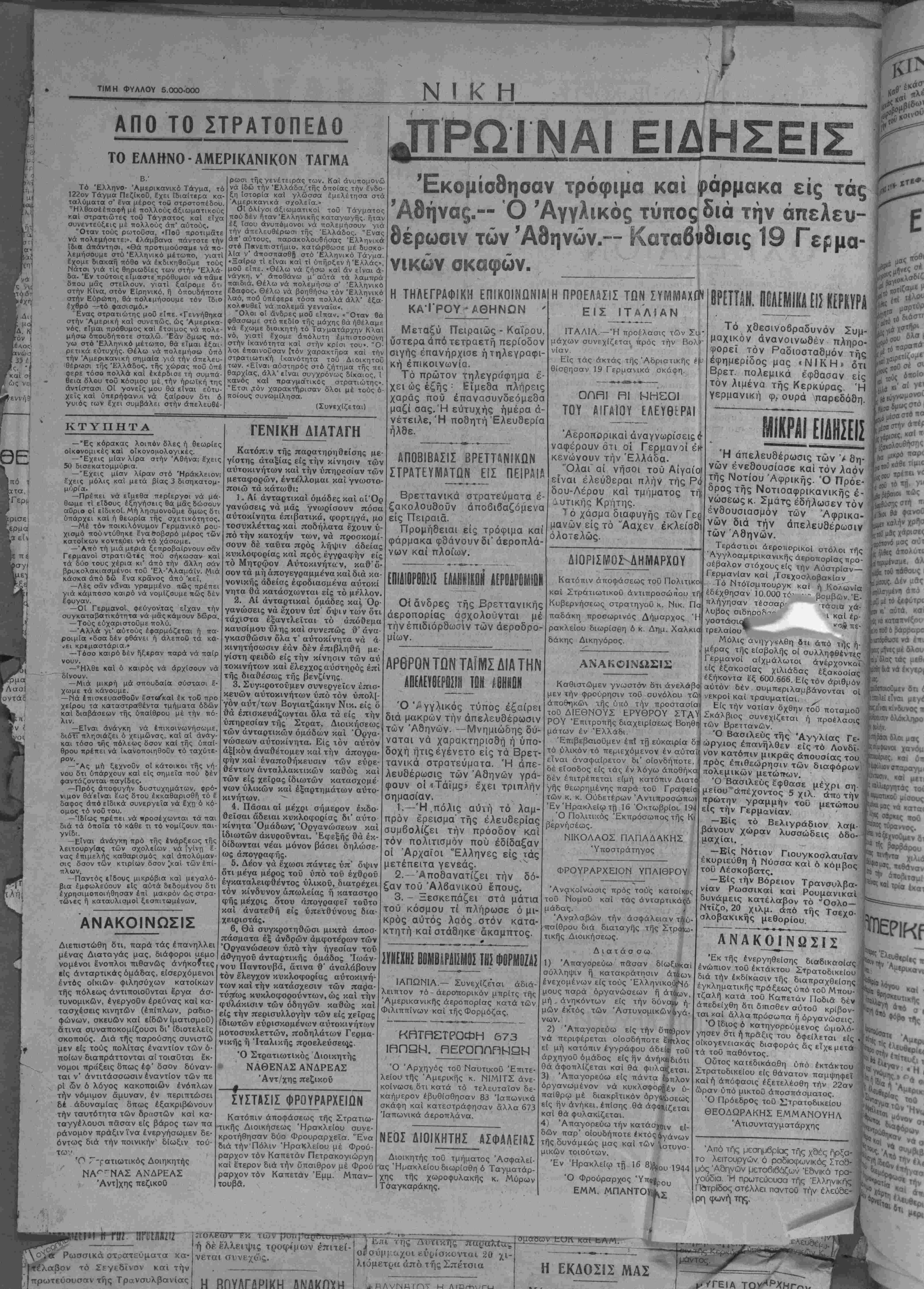 καί Στρΰτιωτικοΰ άντιπροσώιτου τη< Κυβερνήσεως στρατηγοΰ κ. Νικ Πά παδάκη προσωρινάς ΔήμαΡΧ°ς Ή ρακλείου διωρίσθη ό κ Δημ. Χαλκια5 δάκης Δικηγόρος. Τό χθεσινοδραδυνόν Συμ¬ μαχικόν άνανοινωθέν πληρο- φορεϊ τόν Ραδιοσταθμόν τής εφημερίδος μας «ΝΙΚΗ» ότι Βρετ. πολεμικά έφθασαν είς τόν λιμένα τής Κερκύρας Ή γερμανική φ,. ουρά παρεδόθη. ΙγμΓεμησεισ Ή άπελευσέρωσις των '/ θη- νών ένεθουσίασε καί τόν λαόν τής Νοτίου Άφρικής. Ό Πρόε- δρος τής Νοτιοαφρικανικής ε¬ νώσεως κ· Σμάτς εδήλωσεν τόν ενθουσιασμόν των Άφρικα- νών διά την απελευθέρωσιν των Αθηνών. Τεράστιαι άεροτιορικοί στόλοι τής Αγγλοαμερικανικής άεροπορίας προ- σέβαλον στόχουςείς την ΑύστρΙαν — Γερμανίαν καί ,7 σεχοσλοβακίοτν Τό Ντόίσμπουργκ καί ή ΚοΛωνΙσ έδέχθησαν 10 000 το¬ ί 1* " μιο ιφέ«ει ν«ι &νόμαςσύι ■. α,Ης ά»θλυΤ( ^κρψίναιΐ ί. ττλήγησαν υβος τέσσαρ- " βομβών.Έ- τάσια χά- ι καί έρ- ΛΝΑΚΟΙΝΩΣΙΣ Καθιστώμεν γνωστόν δτι άνελάβο μέν την φρούρησιν τοΰ συνόλου τώ άποθηκων 'ιής υπό την προστασίαν τοΰ ΔΙΕΘΝΟΥΣ ΕΡΥΘΡΟΥ ΣΤΑΥ ΡΟΥ Έπιτροπής διαχειρίσεως Βοηθη· μάτων έν Ελλάδι Έπιβεβαιοθμεν επί τή εύκαιρία τό υλικόν τό περιεχόμενον έν αύτα είναι άναφαίρετον δι' οιονδήποτε δέ εϊσοδος είς τάς έν λόγω άποθήκ δέν έπιτρέπεται ειμή κατόπιν Διατ γής θεωρημένης παρά τοϋ Γραφεί των κ. κ. Ούδετέρων Άντιπροσώπω Έν Ηρακλείω τη 16 Όκτωβρίοι, 19 Ό Πολιτικάς Έκπρόσωπος τής Κ βερνήσέως. ΝΙΚΟΛΑΟΣ ΠΑΠΑΔΑΚΗΣ 'Υποστράτηγος ρελαίου Μόλις ανηγγέλθη δτι άπό τής ή , μέρας τής είσβολής οί συλληφθέντες ι Γερμανοί αίχμάλωτοι άνέρχονκαΓ1^ ^«σκαταΐΓνίζΉ ΒΚΐοβόβάρρο-ρο Ιπόρθωοι να έ~ ρμ αίχμάλωτοι άνέρχονκαΓν» « ί6 είς έξακοσΐας χιλιάδας έξακοοίας 1Λ**ν*έιηβρ, έξηκοντα έξ 600 666. Είς τόν αριθμόν *" αυτόν δέν ουμπερλβά νεκροΐ καί τραυματίαι. ^, Είς την νοτίαν όχθην τοθ ποταμοθ ΓΛβ.~~ συνεχίζεται ή προέλασις Δ£ν αύτά. αυτόν δέν ουμπεριλαμβάνονται οί Ι#««οΟμ« «τι ( '"■---------'----- ■ ΛίΐΒλεϊ είναι [κηκίνδυνοςΐ όλόκληρο Σκάλβιος των ΒρεττανΛν. ΣΥΣΤΑΣΙΣ ΦΡΟΥΡΑΡΧΕΙΩΝ Κατόπιν αποφάσεως τής Στρατιω- Ι-τικής Διοικήσεως "Ηρακλείου συνε¬ κροτήθησαν δύο Φρουραρχεΐα. "Ενα διά τήν'Πόλιν Ηρακλείου μέ Φροΰ- ραρχον τόν Καπετάν Πετρακογιώργη καί έτερον διά την ύπαιθρον μέ Φρού ραρχον τόν Καπετάν Έμμ. Μπαν¬ τουβά. ΣΥΝΕΧΗΣ ΒΟΜΒ|ΡΔΙΣΜΟΣ ΤΗΣ ΦΟΡΜΟΖΑΣ ΙΑΠΩΝΙΑ.— Συνεχίζεται άδιά- λειπτον τό - άεροττορικόν μπρίτς τής Άμερικανική"ς άεροπορΐας κατά των Φιλιππίνων καί τής Φορμόζας. ΙΠΠΩΝ. Ό Άρχηγός τοθ Ναυτικοΰ Έπιτε- λείου τής Άμερικής κ. ΝΙΜΙΤΣ ανε¬ κοίνωσε δτι κατά τό τελευταίον δε¬ τό τελευταίον δε καήμερον έβυθίσθησαν 83 Ίαπωνικά σκάφη καί κατεστράφησαν άλλα 673 Ίαπωνικά άεροπλάνα. ΝΕΟΣ ΔΙΟΙΚΗΤΗΣ ΑΣΦΑΛΕΙΑΣ Διοικητής τού τμήματος Ασφαλεί¬ ας Ηρακλείου διωρίσθη ό Ταγματάρ- χης τής χωροφυλακής κ. Μύρων Τσαγκαράκης. ΦΡΟΥΡΑΡΧΕΙΟΝ ΥΠΑΙΘΡΟΥ Ανακοίνωσις πρός τούς κατοΐκος τοϋ Νομοΰ καϊ τάς άνταρτικάςό μάδας. 4 Αναλαβών την ασφάλειαν τήίύ- παίθρου διά διαταγής τής Στροΐω- τικης Διοικήσεως. Διατάσσω 1) Άπαγορεύω πασάν δίωξι«<αι σύλληψιν ή κατακράτησιν άτ4ων ένεχομένων είς τοΰς Έλληνικοΰ^ό μους παρά όργανώσεων ή άτό(ων, μή , ανηκόντων είς την δύναμίν ή μών έκτός των Άσΐυνομικών^γά- νων. 2) Άπαγορεύω είς την 0πσ9ρον νά περιφέρεται οίοσδήποτε ένπλσς εί μή κατόπιν έγγράφου άδείβΐ τοΰ άρχηγου ομάδος είς ήν άνήκκδιότι θά άφοπλΐζεται καί θά φΐ'λακζεται. 3) Άπαγορεύω είς πάντα Ιοπλον όργανωμένον νά κυκλοφορίαν 6- παίθρω μέ διακρΊτικόν όργο^σεως είς ήν άνήκει, έπίσης θά άφθϊ[ίζεται 