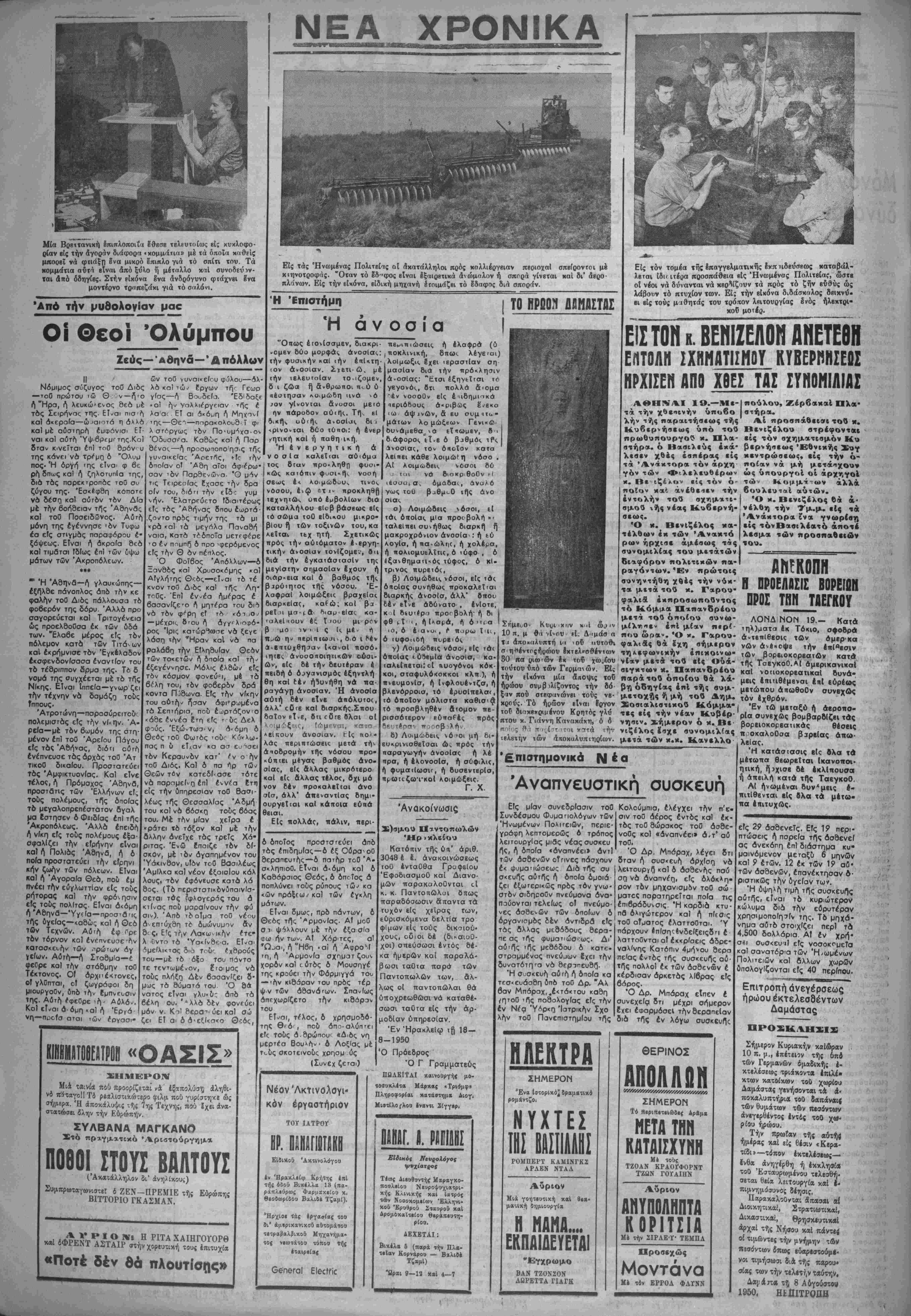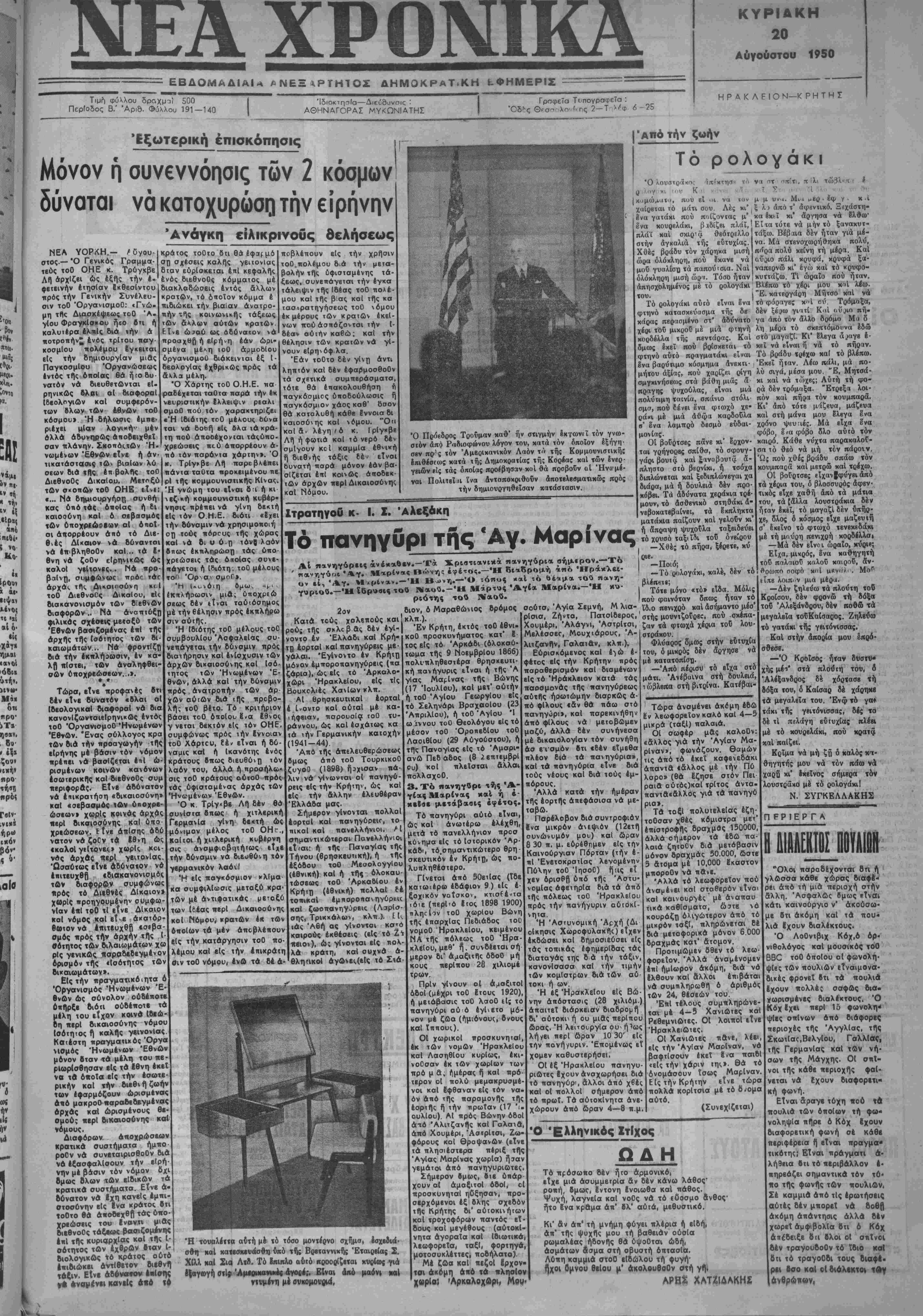 μών παρακαλοθνται <.{ κ. κ Παντοπώλυΐ ΰπως παραδόσωσιν άπαντα τα τυχόν είς χείρας των, ευρισκόμενα δελτΐα τρο φΐμων είς τούς δικοιού· χους, οδιοι δέ (δι»αιοΟ- χοι) σπεύσωσι έντός δέ- κα ημερών καΐ παραλά¬ βωσι ταυτα πσρά των Παντοπωλών των, άλ¬ λως οί παντοπώλαι θά ύποχρεωθώσι νά καταθέ¬ σωσι ταυτα είς την άρ- μοδΐαν υπηρεσίαν. Έν Ηρακλείω τή 18— 8-1950 Ό Πρόεδρος Ό Γ Γραμματεύς ΠΟΛΕΙΤαΙ καινουργής μθ- τθοιικλΐχα Μα·κας «Τρισμφ» Πληροφορίαι καταβτημα Αιογ. Ιναντι 2ίγγ«ρ, ΠίΠΑΓ. Ι. ΡΒΙΤΙΑΒΣ ΕΙίικύς Νινρολόγος ψνχίατροί Τέως Διευθυντήν Μαραγκο- ποαλεΐοα Νευροψοχιατρι- κτ)ς Κλΐνική{ και Ιατρος τ&ν Νοοοκομείων 'Ελληνι- κοδ ΈρυΚροϋ ϋιαυροδ και Αρομοκβϊτείοο θεραπευττ)- ρίου. ΑΕΧΕΤΑΙ: Βικέλα 6 (ηαρά ιήν Πλ«- χεΐβν Κορνάρου — ΒχλιΒε Τζαμί) "βραι 9—12 ΧαΙ 4—7 Είς τόν τομέα τής έηαγγελματικής Ικπ ηδβύσβως καταβάλ¬ λεται ίδκ ιτέρα προσπαθεία είς Ηνωμένας Πολιτείας, ώστβ οί νέοι νά δύνανται νά κβο^ίζουν τα πρός τό ζήν ευθύς ώς λάβουν τό πτυχίον των. Εί; την είκόνα διδάσκαλος δεικνύ¬ ει είς τούς μαθητάς τού τρόπον λκιτουργίας ενός ήλεκτρι- κου μοτέρ. ΕΙΣ ΤΟΗ β. ΒΕΝΙΖΕΛΟΝ ΑΗΕΤΕΟΗ ΕίΙΤΟΛΠ 2ΧΗΜΑΤΙΙΜ0Υ ΚΥΒΕΡϋΗΣΕΟΖ ΗΡΧΙΣΕΝ ΑΠΟ Χ8ΕΣ ΤΑΣ ΣΥΠΟΜΙΛΙΑΓ ΑΘΗΝΑΙ 19.—Με-Ιπούλου, ΖέρβακαΙ Πλ*· τα την χβειινήν ύποβο Ι στήρα. λήν τής παραιτήσεως τής Αί προσπάθειαι τοθ μ. Κυβερνήσεως υπό τού Βενιζέλου στρέφονται πρωθυπουργόν κ. Πλα- είς τόν σχηματισμόν Κυ στήρα. ό Βασιλεύς έκά* βερνήαεως Έθνιχής Συγ είς κεντρώσεως, είς την λεαεν χθές εσπέρας τα Άνάκτορα τόν άρχη ηοίαν νά μή μετάιχουν γόν των 4>(λελευΘέρων ώς ύπουργοί οί άρχηγοΐ