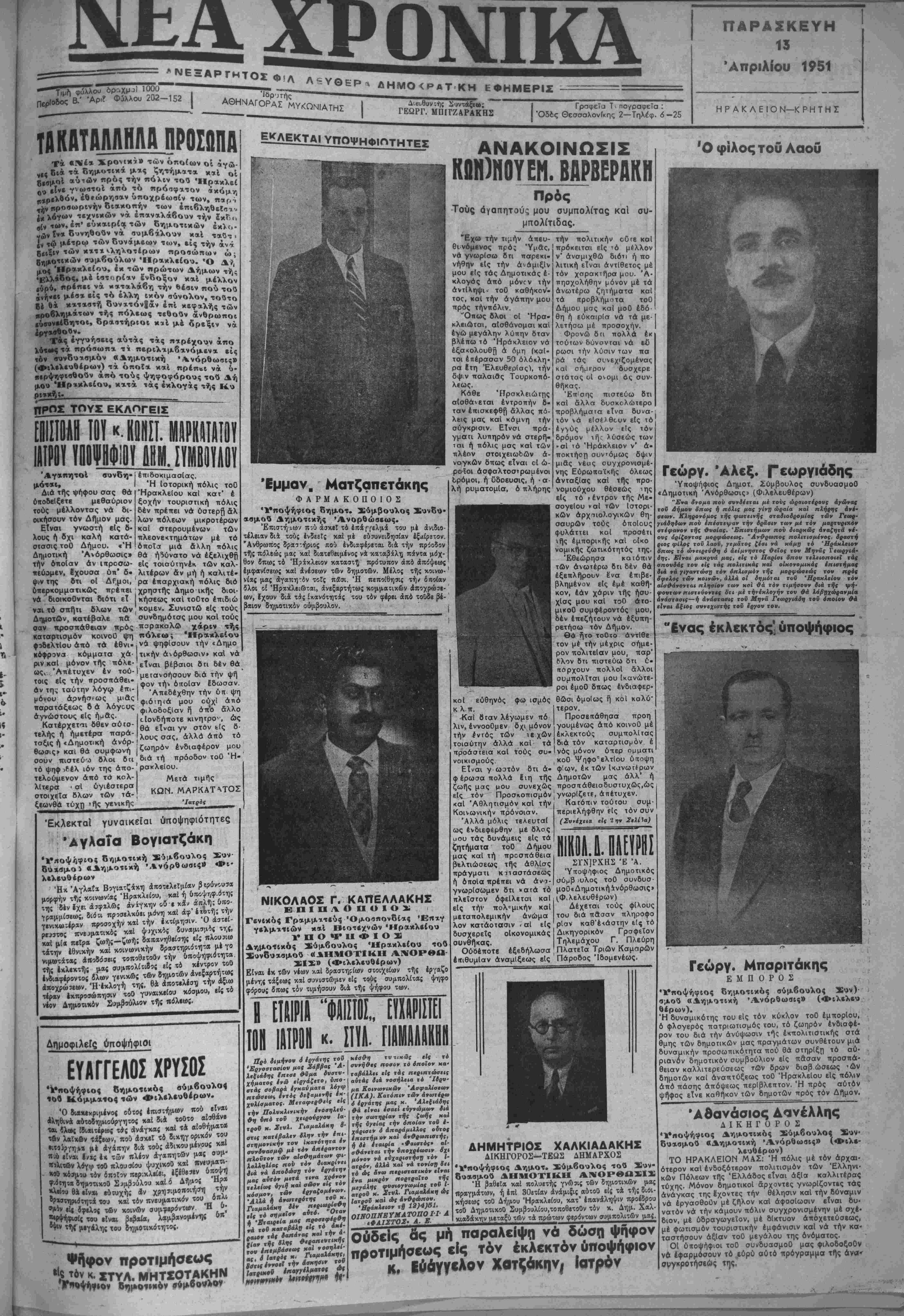 <^-Λ ΛΟΥΘΕΡ» ΔΗΜΟ<ΡΑΤΚΗ ΕΦΗΜΕΡΙΣ ·υρ·ηής -------- ΑΘΗΝΑΓΟΡΑΣ ΜΥΚΩΝΙΑΤΗΣ Διευθυν:ής 2ι'.»ντ4ςίΜ; ΓΕΩΡΓ. ΜΠΙΤΖΑΡΑΚΗΣ ΤΛΚΑΤΑΛΛΗΛη ΠΡΟΓΩΠΑ Τ* «Νέα Χρονικα» των οποίων οί <ίγώ- νΐ; διά τα δημοτικά μας ζητήματα κ*1 οί δεβμοί αυτών πρός την πόλιν τού Ήρακλεί οο είνε γνωστοί απο τό πρόσφατον άκόμη η*ρελοόν, έθβώρησαν υποχρέωσιν των, παρ-, ,*ν «ροσωρινήν διακοπήν των επιβληθείσα·, β* λόγων τεχνικών να έπαναλάβουν την έκΐΐι, Ί των, επ» ευκαιρίαν των δημοτικών εκλο- ,ν ?ν* δυνηθούν νά αυμβάλουν καί τ*θτ , ,φ μέτρω των δυνάμεων των, είς την άνά .¥·.« -<Λν κττι ·ιλ«η«£ηΐΑΜ «λλ.λ----- » Γροφεΐα ΤιπογραφεΤα : Όδ6ς Θεσσαλονίκης 2—Τηλέφ. 6-25 ΠΑΡΑΣΚΕΥΗ Απριλίου 1951 Η Ρ Α Κ Λ Ε Ι Ο Ν—Κ Ρ Η Τ Η Σ Ιν *Φ 1**τρω των δυνάμεων των, είς την άνά 8*ιζιν των κατα^ληλοτέρων προσώπων ώ; δτ)ΐ»,οτι»<ών συμβούλιον Ηρακλείου. Ό Δή μ,ος Ηρακλείου, έκ των πρώτων Δήμων τήι •Βλλ»δος,μέ ιστορίαν ένδοξον κβ,ι μ4χχον »6ρό, «ρέπει νά «αταλάβη την βέαιν πού τού £νή«·» μέσχ είς τό ελλη ικόν σύνολον, τούτο β» θ* καταστή δυνατόν|άν επί κεφαλής των «ροβλημάτων τής πόλεως τβθοΰν άνθρωποι ,ΰβυνείδητοι, δραοτήριοι κιί μέ όρεξιν νά ίργ»βοοΟν »βοοΟν. Τ*ς έγγυήσεις αύτάς τάς παρέχουν άπο λύτ«*ς τα πρόσωπα τ* περιλαμβανόμενα είς τόν βυνδυτσμόν «Δημοτική Ανάρθωσις» (Φιλελεύθερον) τα όποΐα καί πρέπ«ι νά ύ· ηερψηφίαθοΰν άπό τούς ψηφοφόρους τού Δή Ηρακλείου, κατα τάς εκλογάς τής Κυ ή ΠΡΟΣ ΤΟΥΣ ΕΚΛΕΓΕΙΣ ΆγαπητοΙ αυνδη· μ,όται, Διά τής ψήφου σας Θά όποδεΐξβτε μεθαύριον τούς μέλλοντας νά δι- οικήσουν τόν Δήμον μας. ΕΤναι γνωστή είς 8· λους ή δχι καλή κατά¬ στασις τοθ Δήμου. «Ή Δημοτική Ανάρθωσις» την οποίαν άν ιτιροσω- ίΐεύομεν, Εχουσα ότι* δ- ψι·ν της δτι οί Δξμοι, δπερκομματικώς πρέττει νά διοικοθνται διότι εί ναι τό σπήτι δλων των Δημοτών, κατέβαλε πά σαν προσπάθειαν πρός καταρτισμόν κοινοθ ψη ♦ο&βλτΐου άπό τα έθνι- κόφρσνα κόμματα χά¬ ριν καί μόνον τής πόλε¬ ως* Απέτυχεν έν τού¬ τοις είς την προσπάθει¬ αν τη.; ταύτην λόγω έπι- μόνου αρνήσεως μιάς παρατάξεως & ά λόγους άγνώοτους είς ημάς. Κατέρχετιι δθεν αύιο- τελής ή ημετέρα παρά- ταξις ή «Δημοτική ανάρ¬ θωσις» καί θά συμφωνή οουν ΐϊΐστεύ'ύ βλοι 8 α τό ψηφιδέλ ιόν της απο¬ τελούμενον άπό τό κολ- λΐτερα ■ αί όγιέστερα οτοιχεΐα δλων των τά- ξεωνθα τύχη 'ής γενικής έπιδοκιμασΐας. Ή Ιοτορική πόλις τοθ Ηρακλείου καί κατ' έ ξοχήν τουριστική πόλις δέν πρέπει νά ύστερή άλ λων πόλεων μικροτέρων καί στερουμένων των πλεονεκτημάτων μέ τό όποΐα μιά δλλη πόλις θά ή5ύνατο νά εξελιχθή είς τοιαύτηνέκ των καλ¬ λιτέρων άν μή ή κάλι τέ- ρα έπαρχιακή πόλις διά χρηστής Δημο ικής διοι¬ κήσεως καί τουτο έπιδιώ κομεν. Συνιστώ είς τούς συνδημότσς μου καί τούς παρακσλώ χάριν τής πόλβω; Ηρακλείου νά ψηφΐσουν την «Δημο τικήν άνόρθωσιν» καί νά είναι βεβαιοί δτι δέν θά μετανοήσουν διά την ψή φόν την οποίαν Ιδωσσν. Άπεδέχθην την ύιτ ψη φιόΐηιά μου ούχι άτιό φιλοδοξίαν ή σπ'ό άλλο ςΐονδήποτε κινητρον, ώς θά είναι γν στόν ιΛς ο¬ ί λους σας, άλλά άπό τό | ζωηρόν ενδιαφέρον μου διά τή πρόοδον τοθ Ή- ' ρακλεΐου. Μετά τιμής ΚΩΝ. ΜΑΡΚΑΤ*ιΤΟΣ ΕΚΛΕΚΤΑΙ ΥΠΟΨΗΦΙΟΤΗΤΕΣ Έμμαν. Ματζαπετάκης ΦΑΡΜΑΚΟΠΟΙΟΣ Ύποψήφιος δημοτ. Σύμβουλος Συνου· ασμού Δημοτικής Ανορθώσεως. Έπιστήαω; π-.ύ άσκεΤ τό έπά^ελμά τού μέ άνιδιο- τέλίΐαν διά τού; ΙνδεεΓς καί μέ ΐύΐυνειδησίαν εξαίρετον "Ανθρωπος δρασ:ήριος ποΰ ένδιαφέρεται δια την πρόοδον τΐ]ς πόλεώς μα; καί διατεθετμΐνος να καταβάλη πάντα μόχ- θον ίπως τό Ή,ίίκλειον καταστή πρότυπον άπό απόψεως εμφανίσεως 