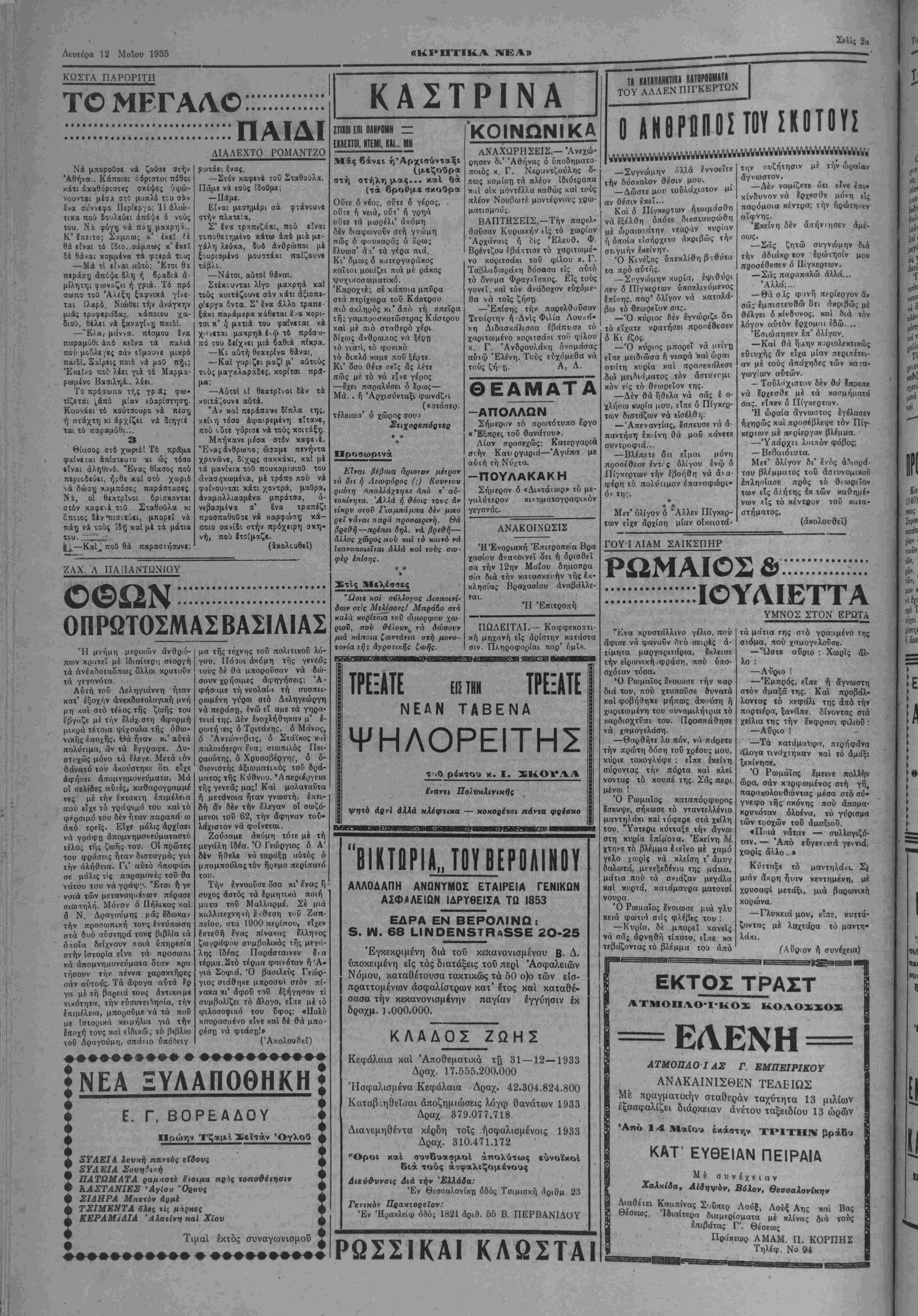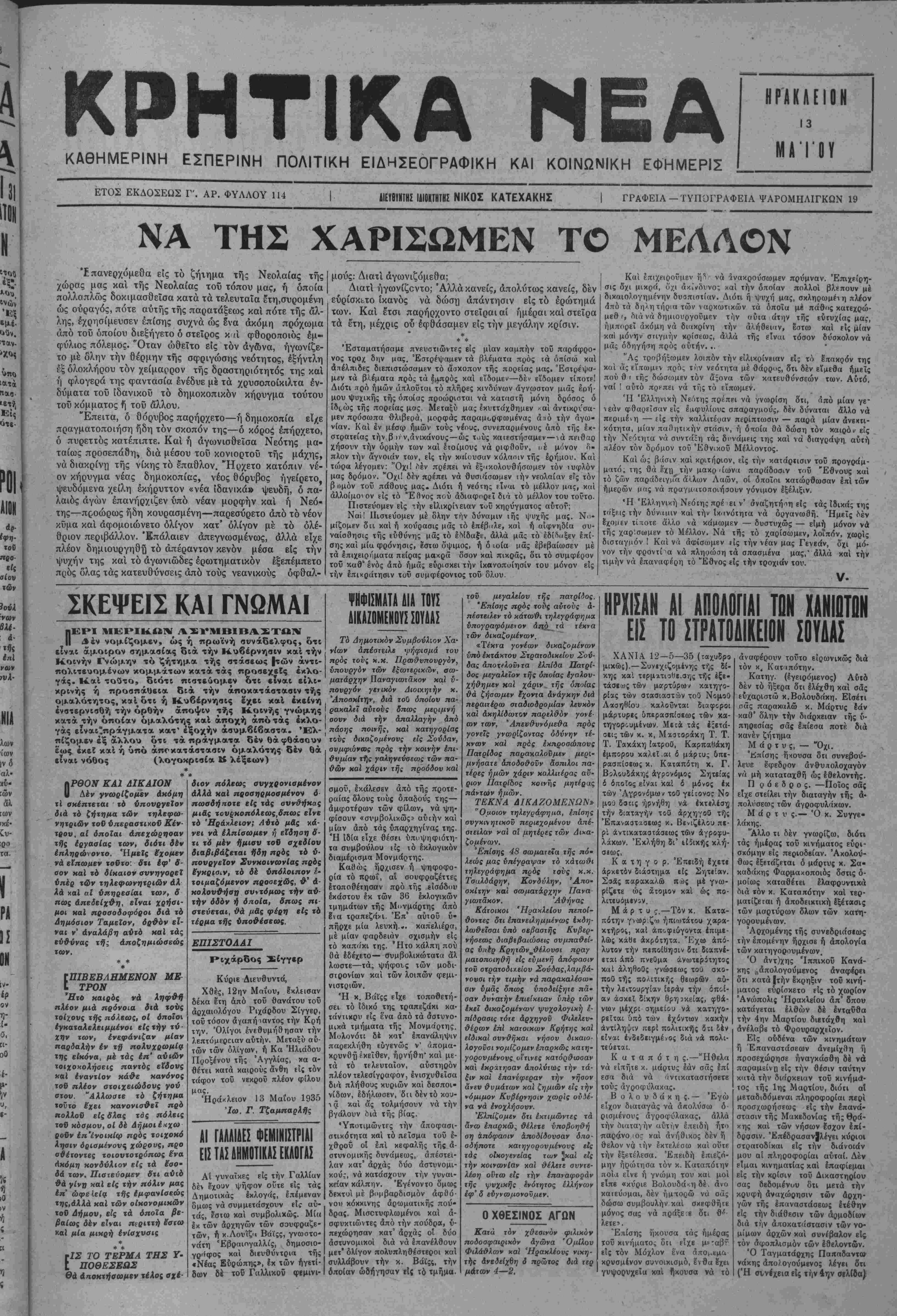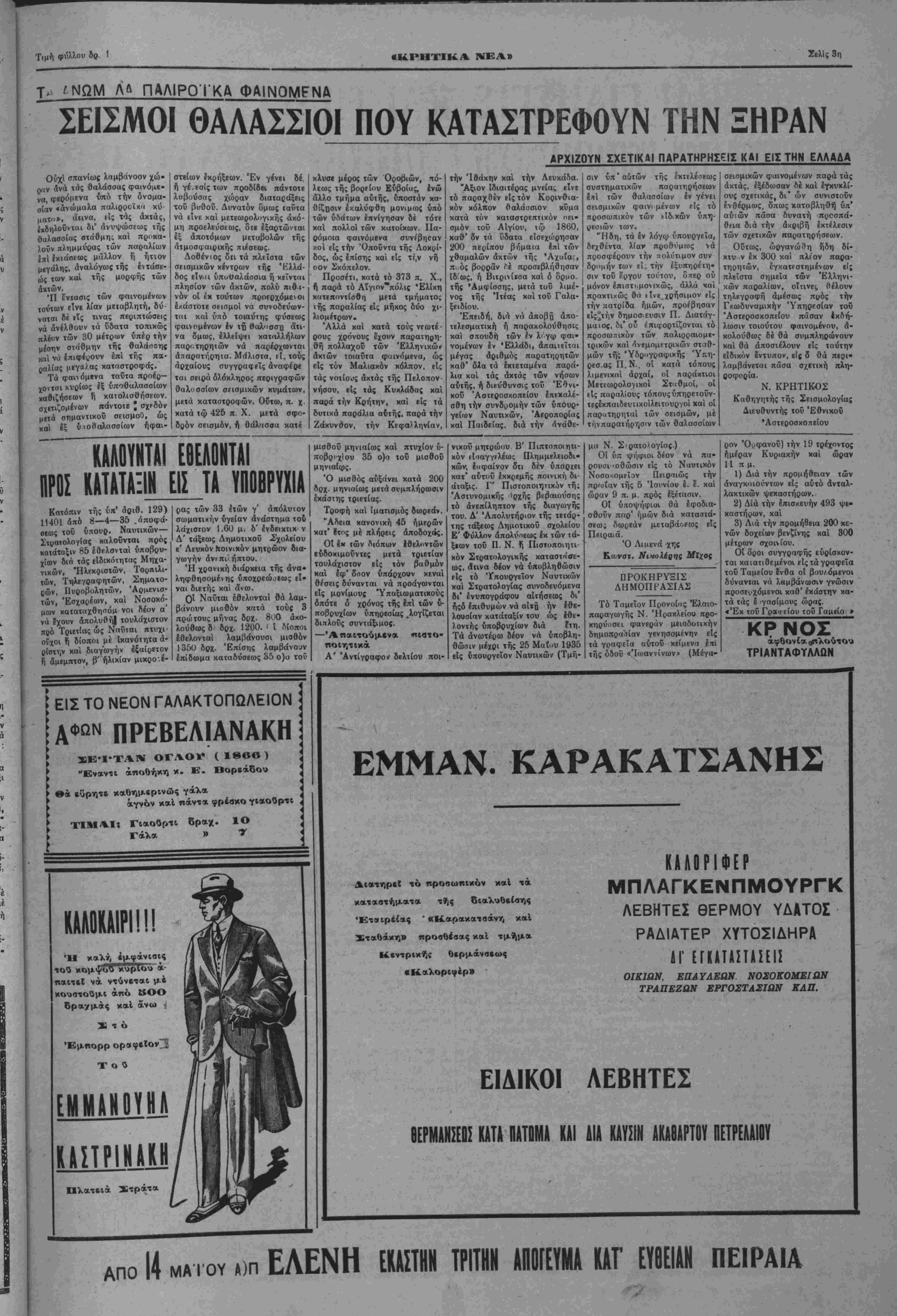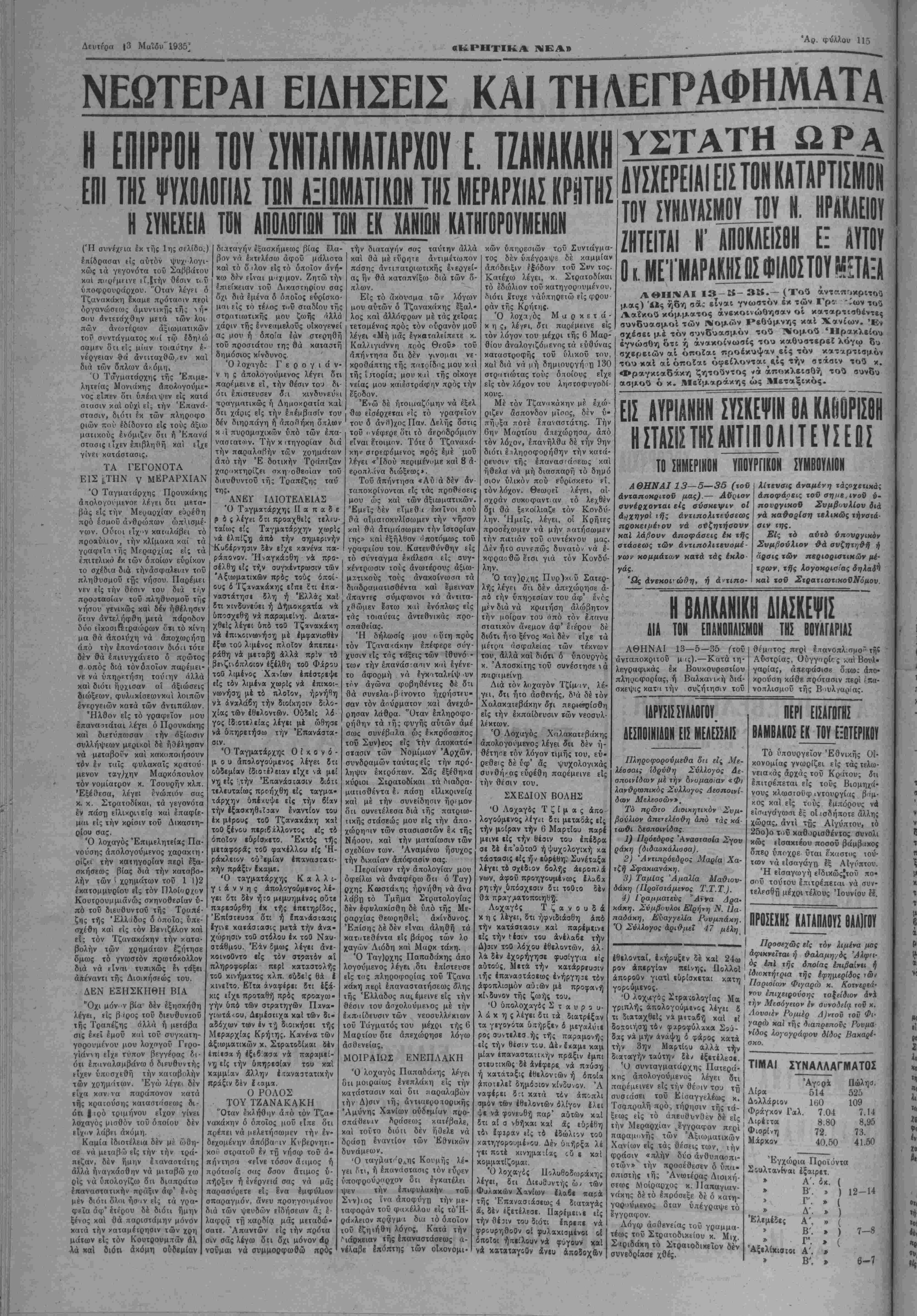 Διά τόν λοχαγόν Τζίμ<(ν, λέ¬ γη, δτι ήτο άσθενής, δ^ί δέ τόν Χαλακατεβάκην δϊι περιωρίσθη είς ιήν εκπαίδευσιν των νεοσυλ- λέκτων. Ό Λοχαγός Χαλακατεβάκης άπολογούμενος λέγει ΟΊ ι δέν ή- θέτηοε τόν λόγον τιμής τού, εύ· ρεθεις δέ υφ' άς ψυχολογικάς συνθήκας ευρέθη παρέμεινε είς την θέσιν τού. ΣΧΕΔΙΟΝ ΒΟΛΗΣ ΔΥΣΧΕΡΕΙΑΙ ΕΙΣ ΤΟΝ ΚΑΤΑΡΤΙΣΜΟΝ ΤΟΥ ΣΥΝΔΥΑΣΜΟΥ Ν. ΗΡΑΚΛΕΙΟΥ ΖΗΤΕίΤΑΙ Ν' ΑΠΟΚΛΕΙΣΘΗ ΕΙ ΑΥΤΟΥ Ο κ ΜΕΊ ΜΑΡΑΜΣΟΣΦΙΛΟΣΤΟΥ^ΠΑΞΑ ΑΘΗΝΑΙ 13-5- 35.— (Τοΰ ρ μας) Ώς ήδη σας είναι γνωστόν έκ των Γρβ· -;ων ιοΰ Λαΐκοΰ κόμματος ανεκοινώθησαν οί καταρτισθέντες συνδυασμοί των ΛΙομΛν Ρεθύμνης καί Χανίων. Έν σχέσει μέ τόν συνδύασμόν τοΰ Νομοΰ Ηρακλείου εγνώσθη ότι ή ανακοίνωσις τού καθυστερεϊ λόγω δυ σχερειών αί οποίαι προέκυψανείς τόν καταρτισμόν τού καί αί οποίαι όφείλονταιε.ίς την στάσιν τοΰ κ. Φραγκιαδάκη ζητούντος *ά αποκλεισθή τού συνδυ ασμοΰ ό κ. Λΐεΐμαράκης ώς Μεταξικός. ΕΙΣ ΑΥΡΙΑΝΗΝ ΣΥΣΚΕΨΙΝ ΟΑ ΚΑΗυΡΙΣΘΗ Η ΣΤΑΣΙΣ ΤΗΣ ΑΝΤΙΠΟΛΙΤΕΥΣΕΩΣ ΥΠΟΥΡΓΙΚΟΝ ΪΥΜΒΟΥΑΙΟΜ ΤΟ ΣΗΜΕΡΙΝΟΝ ΑΘΗΝΑΙ 13—5— 35 (τοϋ άνταποχριτοϋ μας).— Αύριον σννέοχσνται είς σύσκεψιν οί αντιπολιτεύσεως νά οϋζηχήσουν χαΐ λάβουν άποφάσεις έκ τής στάσεως των αντιπολιτευομέ¬ νων κομμάτων κατά τάςΙμΧο- γάς. 'βς άνεκοΐ'ώϋη, ή αντιπο¬ λίτευσις αναμένη τάςσχετικάς άποφάοεις τοΰ οημε, ινοΰ ύ· πονργιχοΰ Συμβουλιον διά νά χα&ορΐση τελικώς τήνστά- σιν της. Είς τό ανΐό υπουργικόν Συμβούλιον θά σνζητη&ή ή ά'ρσις των πεβιθριστικδν με¬ τ ρων, τής λονοκοισίας δηλαδ^Ι καί τού ΣιοατιωτΐχοϋΝόμον, Η ΒΑΑΚΑΝΙΚΗ ΔΙΑΣΚΕΨΙΣ 111 ΤΟΗ ΕΠΑΜ0ΠΑ1ΪΜ0Η ΤΗΣ ΒΟΥΛΓΑΡΙΑΣ ΑΘΗΝΑΙ 13—5-35 (τοΰ άνταποκριτοΰ μ<ς).—Κατά τη¬ λεγραφικάς έκ Βουκουρεστίου πληροφορίας, ή Βαλκαχιχή διά¬ σκεψις κατα την συζήτησιν τοΰ θέματος περί Ιπανοπλισμο^ τή» Αυστρίας, Οΰγγπρίο ς χαί Βουλ¬ γαρίας, απεφάσισε όπως απο¬ κρούση κάθε πρότασιν περί ίπα- νοπλισμοΰ τής Βουλγαρίας. ΙΔΡΥΣΙΣ ΣΥΛΛΟΓΟΥ ΔΕΣΠΟΙΝΙΔΩΝ ΕΙΣ ΜΕΛΕΣΣΑΙΣ Ό Λοχαγός Τ ζ ( μ α ς άπο ογούμενος λίγ=ι δτι μεταβάς είς την μοίραν την 6 Μαρτΐου παρέ μεινε είς την θέσιν τού έπέδρα σε δέ έη'αύτοθ ή ψυχολογική κα τάστασι; είς ή/ ευρέθη. Συνέταξα λέγει τό σχέδιον βολής άεροπλά νων, άφοϋ προηγουμένως έλαβα ρητήν ιϊπάοχεσιν διι τοθΐο δέν θα πραγματοποιηθή. Λ&χαγές Τζανουδά κης λέγει, δτι ήφνιδιάσθη άπό την κατάατασιν καί παρέμεινε είς την τέσιν τού ανέλαβε την Δ)3ΐν τοθ λόχου έθελοντών, άλ¬ λά δέν έχορήγησε φυσίγγια είς αύτούς. Μετα την καταρρεύση/ τής έπαναοτάοεως ενήργησε τόν αφοπλισμόν αύΐών μέ προφανή κίνδυνον τής ζωής τού. Ό ύπολοχαγός Σταυρου¬ λάκης λέγει δτι τα διατρέξαν τα γεγονότα υπήρξεν δ μεγαλύτε ρος συντελεσ ής τή; παραμονής είς την θέσιν τού. ΔένΙχαμ» καμ μίαν ίπανασταΐΐΊήν πράξιν Ιμπι οτευπκώς δέ άνέφερε νά παύση ή κατάτοξις έθελον:ών ή όποία αποτελεί δημόοιον κίνδυνον. Ά ναφέρει 5:ι κατά τόν άποπλι σμόν των ίθελοντων ολίγον έλει ψε νά φονευθή παρ' αυτών καί δτι «ί α νθήκαι καί άς εδρέθη τό Ιφίραν βίς τό εδώλιον τοθ χατη-γορουμένου Δέν ύπήρξα λέ γει ποτέ κινημα;ί«ς ςυ ε κ«1 κομματίζομαι. Ό λοχαγός Πολυθοδωράκης λέγει, διι Διευδοντής ώ/ των Φϋλακών Χανίων Ιλαβε παρα τής Έπανασΐάσεως 4 διαταγάς &', δέν εξετέλεσε. Παρέμει.ε ιίς τήνθέίΐν τού διότι ίηρεΐτε νά φρουρηθοθν οί ^λακιαμένοι οί όποΐοι ηπείλουν νά φύγουν καί νά καχαχαγοθν άνευ αΐιοδοχβν Πληροφορούμε&α δή εις Με- λέοααι; ίδρνϋη Σύλλογος Δε- αηοινΐδοαν με την ?)>υμαο:αν «Φι