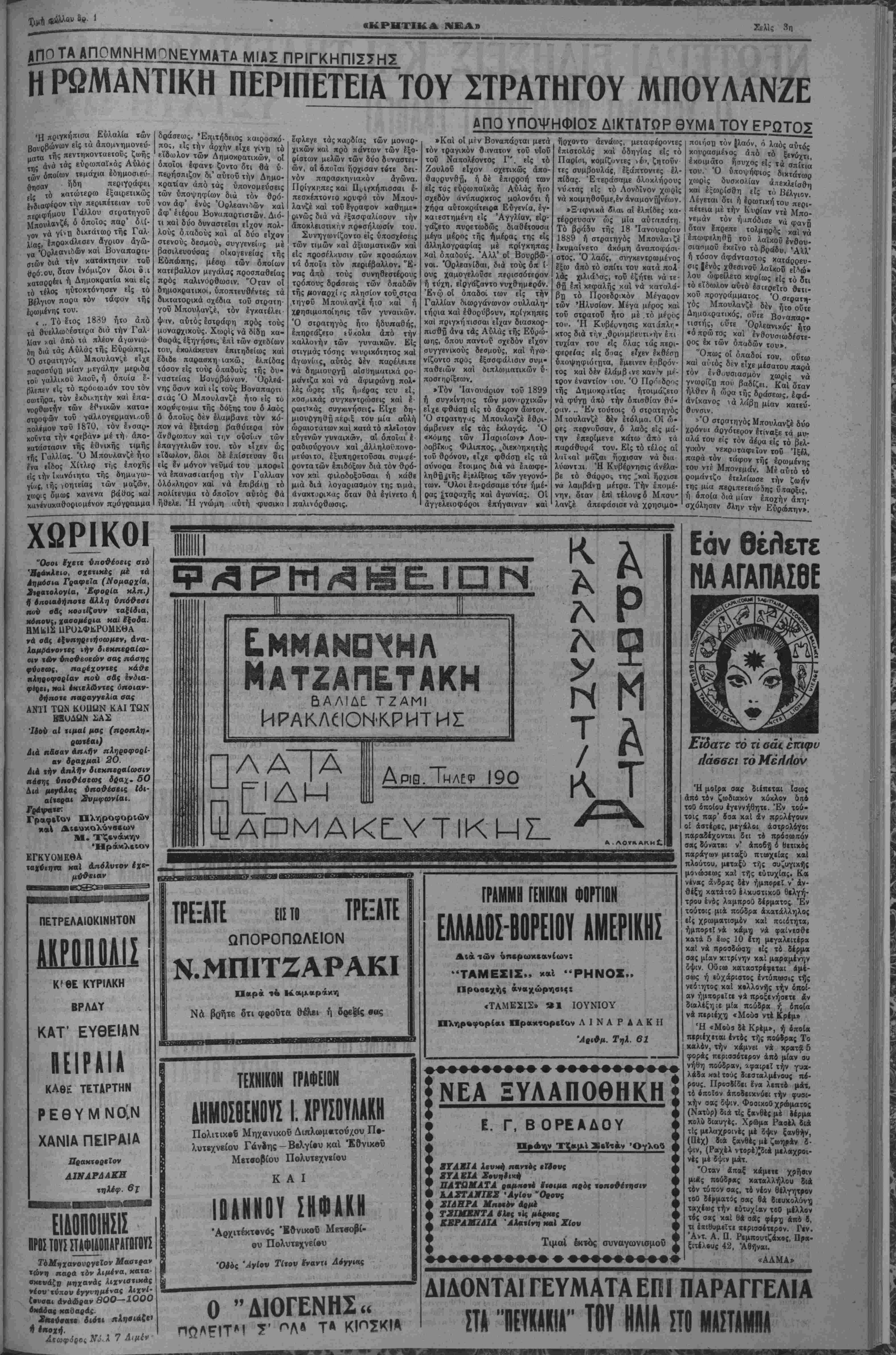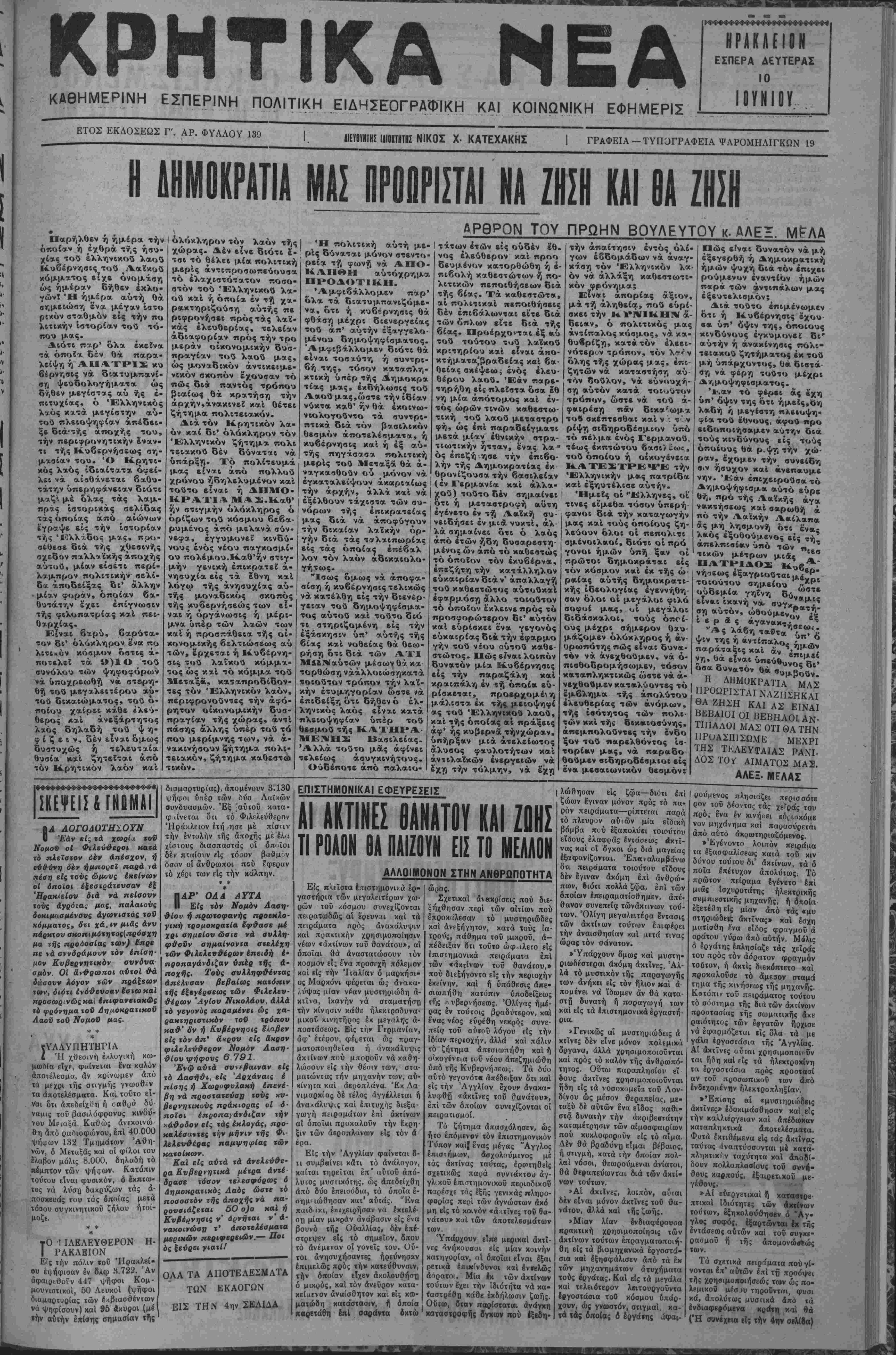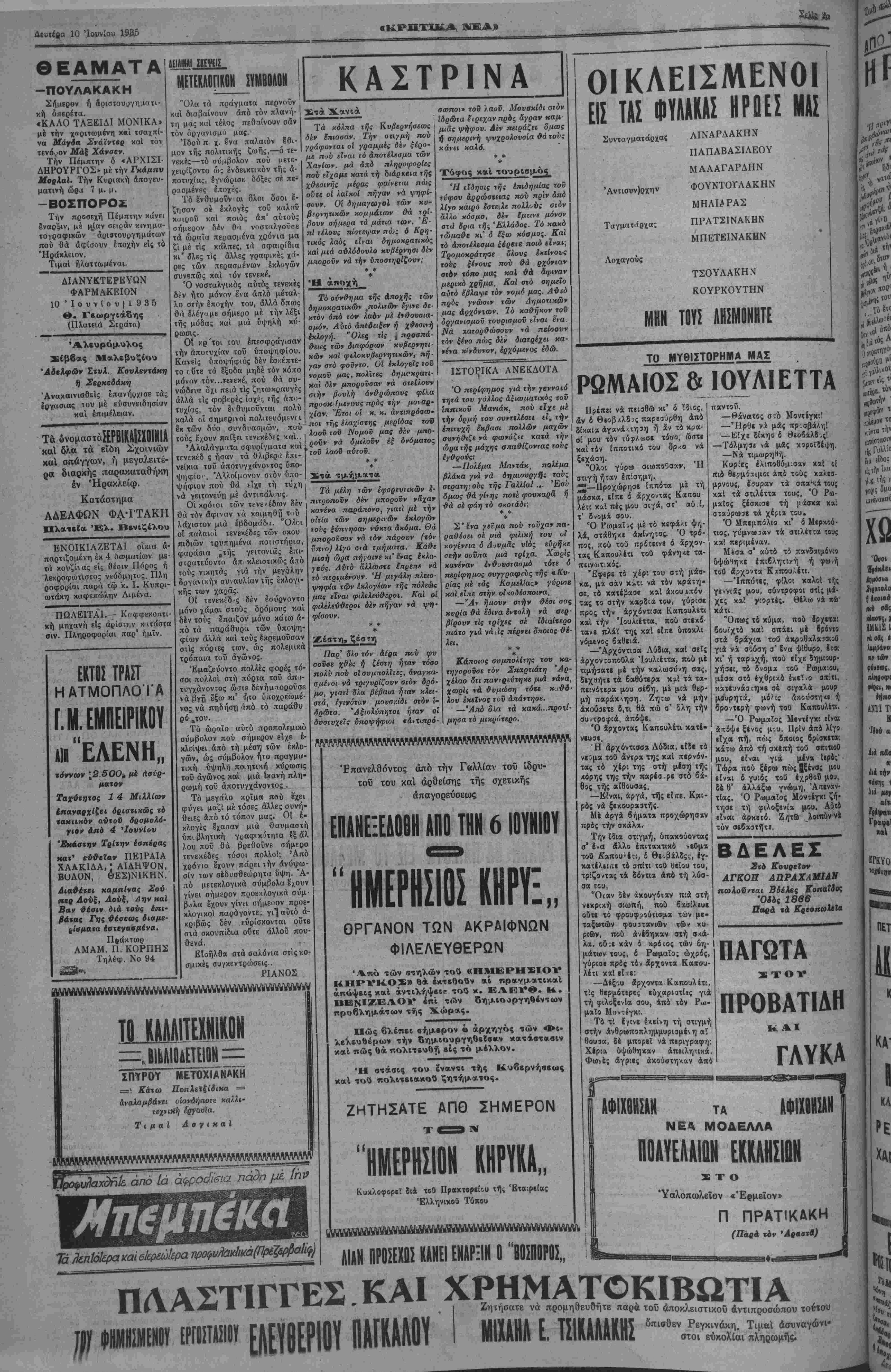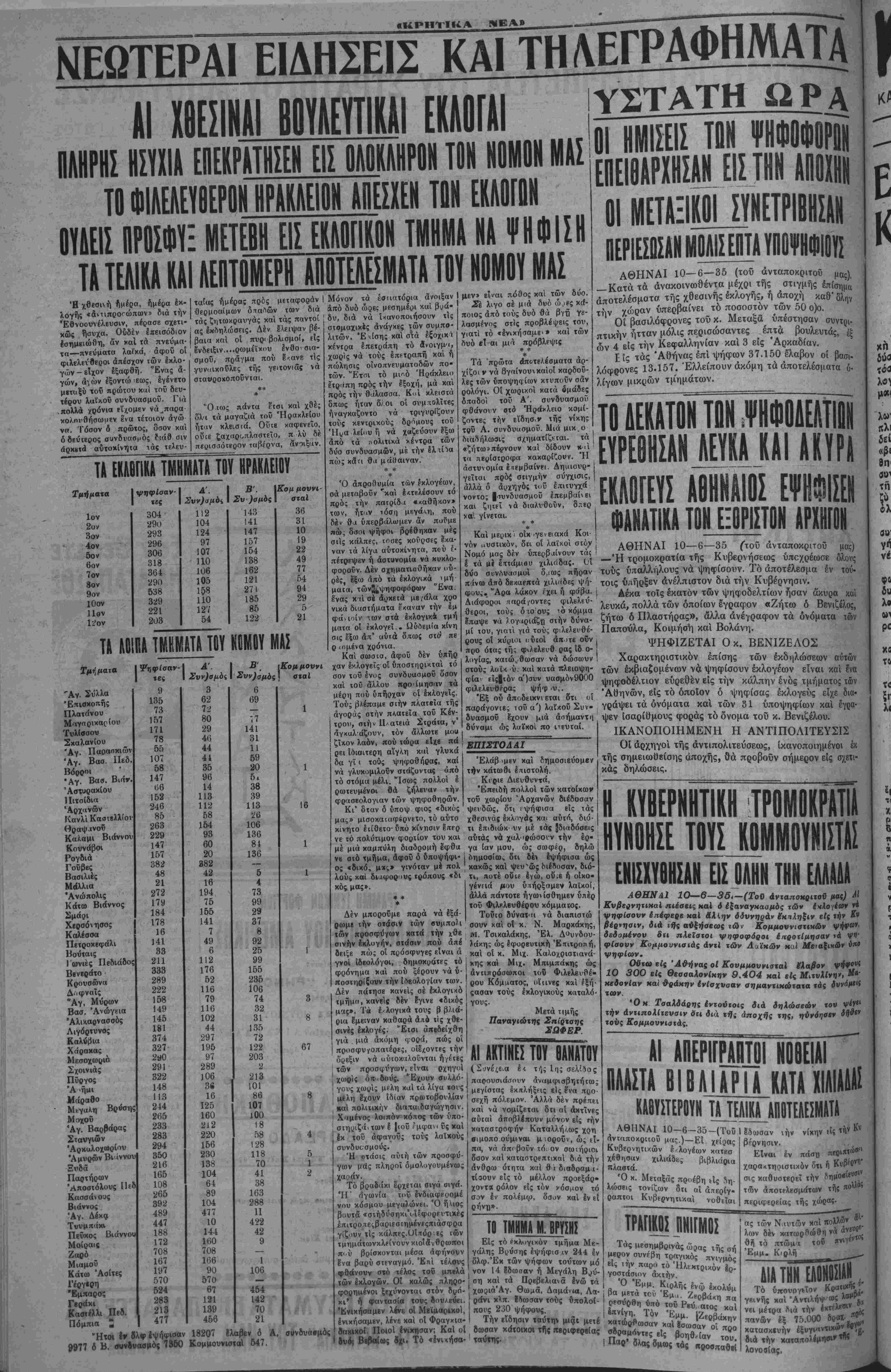 βέρνησιν, διά τής αυξήσεως ιών Κομμουνιστικήν ψήφα>*< δεδομένον δα πλβΐστσι ψηφοφάροι επροτίμησαν ·ά V"· φίαουν Κομμουνισιάς άντί των Λαϊκών καί Μεΐαξικών ύΛθ ψηφίων. Ούτω είς Αθήνας οί Κουμμουνισταί ϊλαβον ψήψοΚ 10 300 είς Θεσσαλονίκην 9.404 καί είς Μαυλίν»;·-, -β' κεδονίαν καί θράκην ένίσχυσαν σημαντικώτατα τάς δι~χ"°" των. Ό κ Τσαλδάρης εντούτοις διά δηλώσεων τού την άντιπολίτευσιν ότι διά τής άποχής της, ηύνόηθΒΥ τούς Κομμουνιστάς. ΑΙ ΑΚΤΙΝΕΣ ΤΟΥ ΟΑΝΑΤΟΥ (Σνέ^α έ< τ/)ς 1ης σελ'.Λος 1 παρουσιάσουν αναμφισβητήτως 1 μεγίστας εκπλήξεως είς ίνα προ¬ σέχη πόλεμον. Άλλά δέν πρεπει καί νά νομίζεται δτι αί άκτΐνες αυταί άττοβλέπουν μόνον είς ίήν ι καταστροφήν Καταλλή/.ως χρη σιμοπο οΰμεναι μ ιοροΰν, ώς εΐ- πη, νά άπί'βούν τό. όν σωιήριοι δσον χαί καταστρεπτικόν διά την άνθρω ότητα καί θ » διαδραμι- τίσουν είς τό μέλλον προεξάρ- χοντα ρόλον είς τόν κόσμον τό σον έν πολέμω, όσον καί Ιν εί ή ΑΠΕΡΙΓΡΑΠ10ΙΝΟ8ΕΙΑΙ ΠΛΑΣΤΑ ΒΙΒ Ι1ΑΡ_|_Α_ΚΑΤΑ ΧΙΑΙΑ&ΑΣ ΚΑΒΥΣΪΕΡΟΥΝ ΤΠΕΑΙΚΙΑΙΙΟΤΕΛΪίΜΑΪΑ ΑΘΗΝΑΙ 10-6-35-(Του Ι ?δωσαν την νίκην ιΐς την Κν Λνΐαποχρΐΐοϋ μας.)-ΕΙ χείρας βέρνησιν. ».υρερνητικων εΓ-λογέων κατεπ π.... ι _/„ -.ηιΜωβ^ χέθ»ισαν πλαστά. ^λογέων κατεσ χιλιάδ^ βιβλιάρια Ό κ. Μεταξάς προέβη είς 5η- λώσεις τονίζων δτι αί άπερΐγ· ραπτοι Κυβερνητικαί νοθεΐαι Είναι έν πάστι χαρακτηοιστικόν δτι ή Κυβρ1?ν σις καθυστερεΐ την των άποτελεσμάτων τής περιφερείας τής χώρας· ΤΩ ΤΜΗΜΑ Μ. ΒΡΥΣΗΣ Είς τό εκλνιγικόν τμήμα Με- γάλη; Βρύσης έψήφισ <ν 244 εν όλω.Έκ των ψήφων τούτων μό νόν 14 δδωσαν ή Μεγάλη Β^ύ- ση καί τα Πρεβελιανά Ι ν ώ τα χωδΐά'Αγ. θωμά, Δαμάνια, Λα- ; ράνι κλπ. ϊοωσαν τούς υπολοί¬ πους 2,30 ψήφους. Την είδησιν ταύτην μι§ι μετέ δωσαν κάτοικοι τής πβριφερβίας ' ταύτης- ΤΡΑΓ.ΙΚΟ! ΠΝΙΤΜΟΣ Τάς μεσημβρινάς ώρας τής αή μερον συνέβη τραγικός πνιγμ0 ' είς την παρα τό Ηλεκτρικόν |0- γοστασιον άκτήν. Ό Έμμ. Κ^λης ίνφ |Μθλύ βα μ«α τού Έμ,. Ζερβάκη πά υρβη υπό τού Ρεύ. ατος καί Τόν Έ |Ζβά σΙν ' δλας δμως ,άς άς των Ναυτών καί πολλων λων δέν κατωρθώθη νά ανί« θή τό πτώμα ^™ Έμμ. Κιρλή τού ΑΙΑΤΗΝΕΑΟΗΟΣΙΙΙΙ Τό υπουργείον γεινής καί Αντιλήψεως νει μέτρα διά την ελ πανών 1 75.000 κατασκευήν έξυγι«ντιχα>*